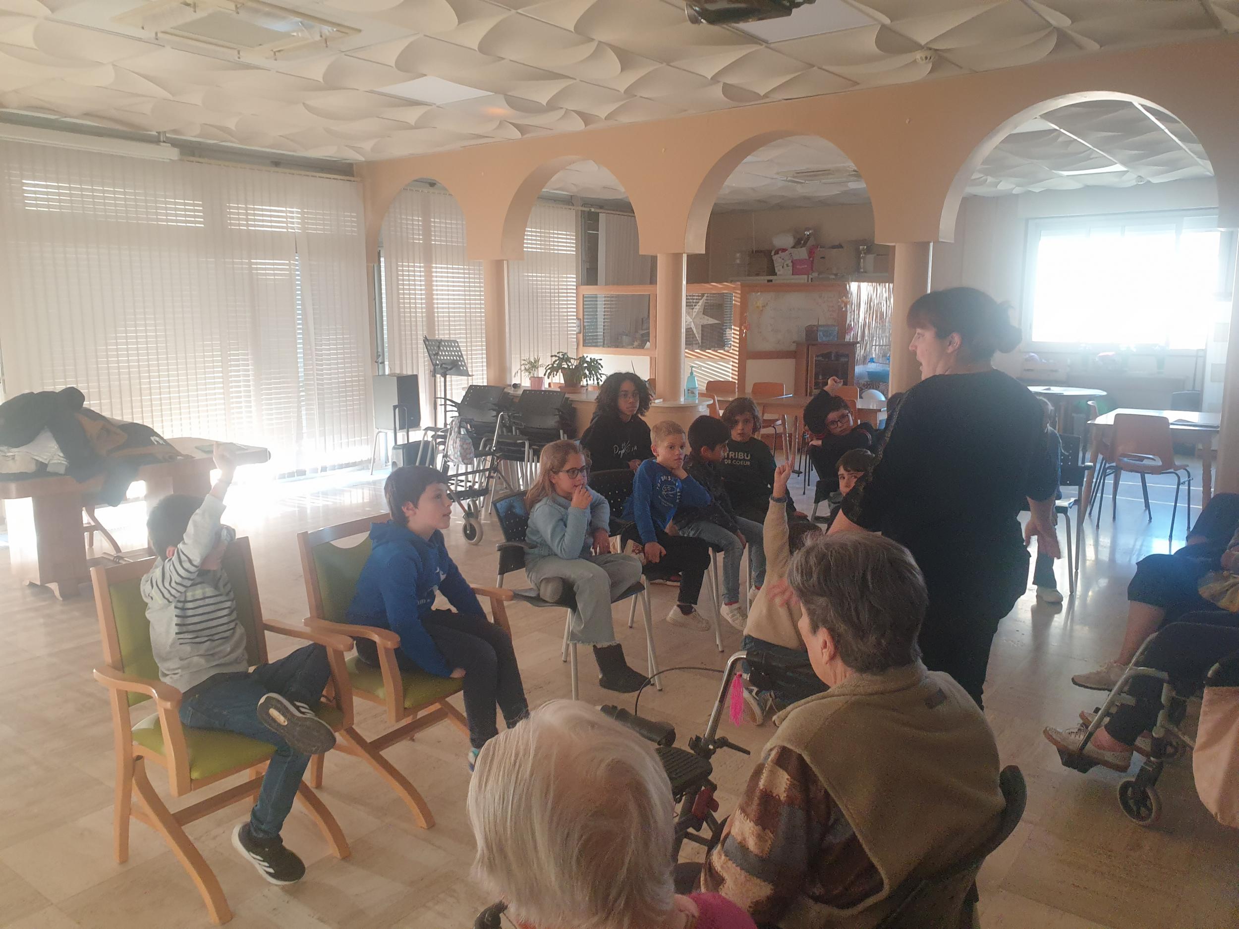Dans le courant du mois de janvier, les élèves de CE1 qui n'avaient pas été rendre visite aux résidents du Refuge protestant lors de la période précédente ont pu y aller et cette fois-ci j'ai pensé à prendre quelques photos. Comme la première fois, les enfants étaient un peu impressionnés au début, et puis avec l'aide de l'animatrice, Cindy, chacun a pu poser des questions aux résidents et petit à petit un bel échange s'est créé. Evidemment il fallait parler fort et ça n'était pas toujours facile. Les enfants posaient des questions aux résidents, sur l'école et la vie autrefois lorsqu'ils avaient leur âge et les résidents posaient également des questions. Ce fût un beau moment de partage, hors du temps qui a donné le sourire aux résidents mais aussi aux enfants. Nous avons déjà hâte d'y retourner pour voir comment vont Yves, Odette, Gillette, Bernadette, Paule et toutes les autres résidentes.