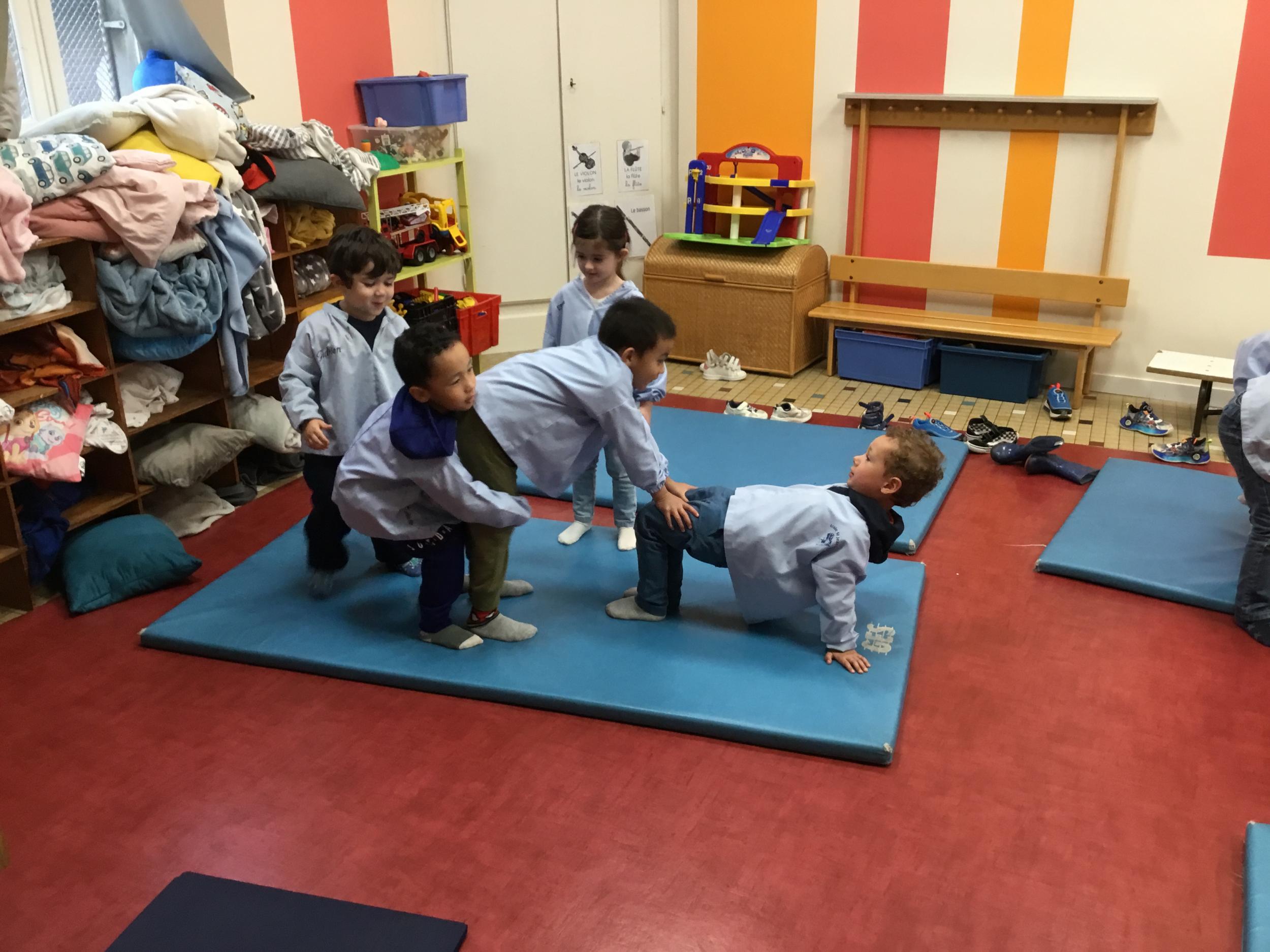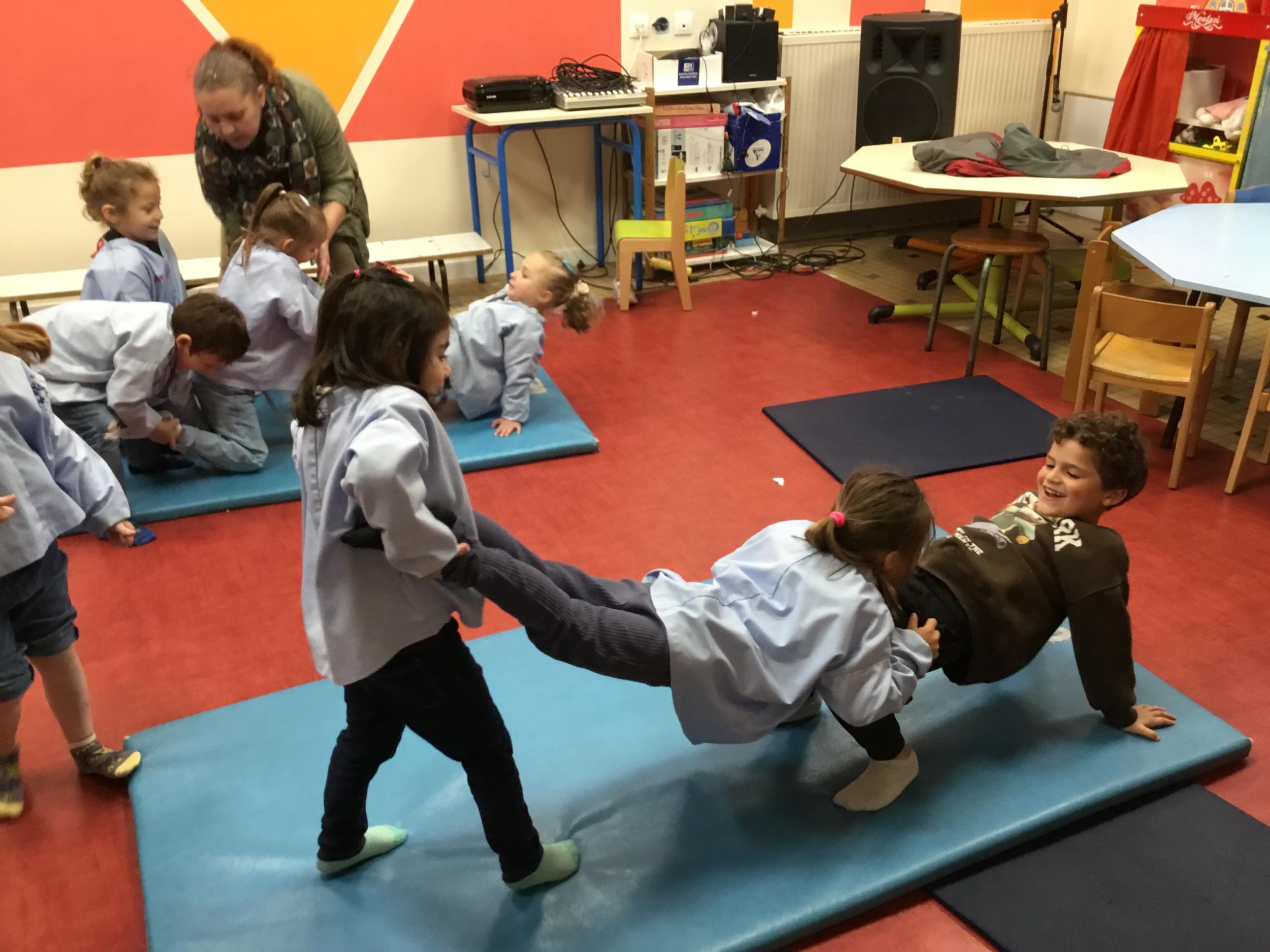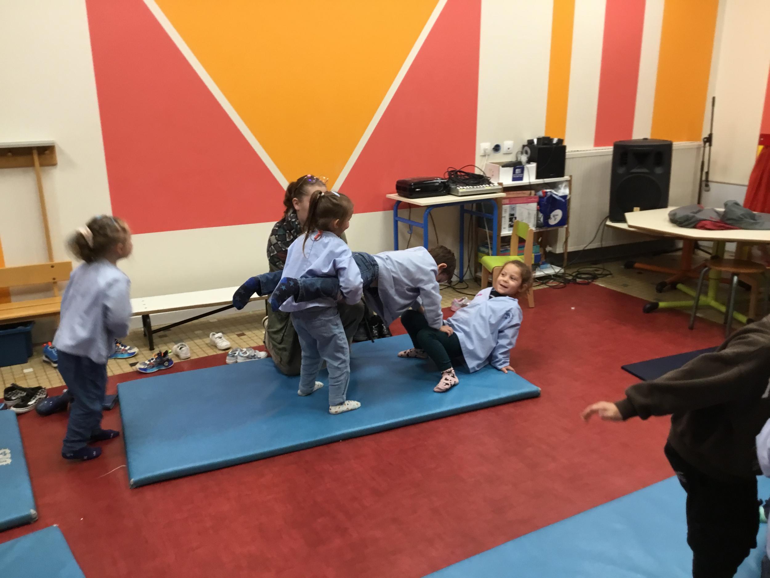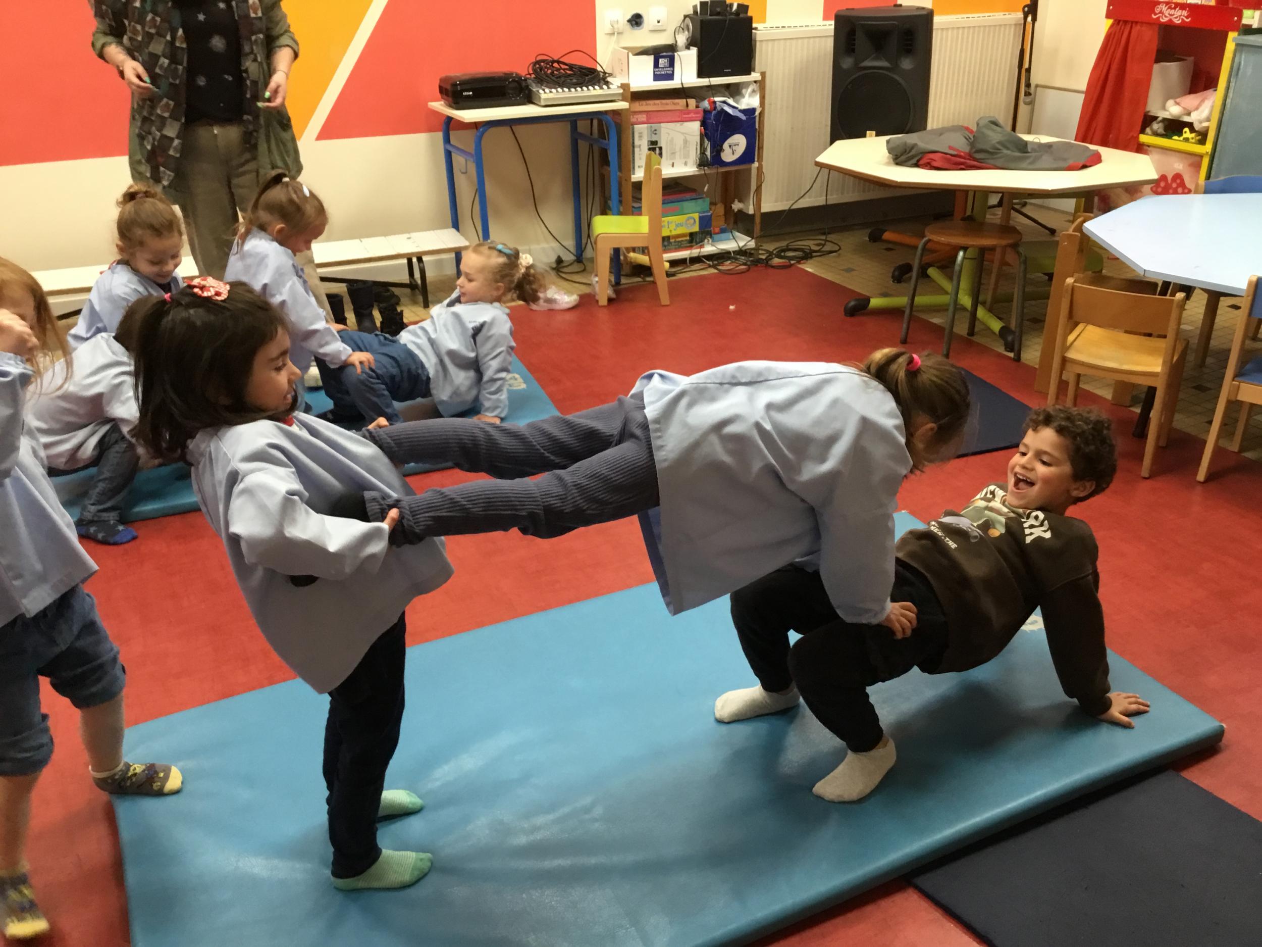 Nous commençons un cycle d’acrosport . Il s’agit de s’organiser par groupe de 3 ou 4 élèves pour faire des figures d’équilibriste . Les élèves se répartissent de manière autonome les différents rôles : équilibriste, porteurs et arbitre aide.