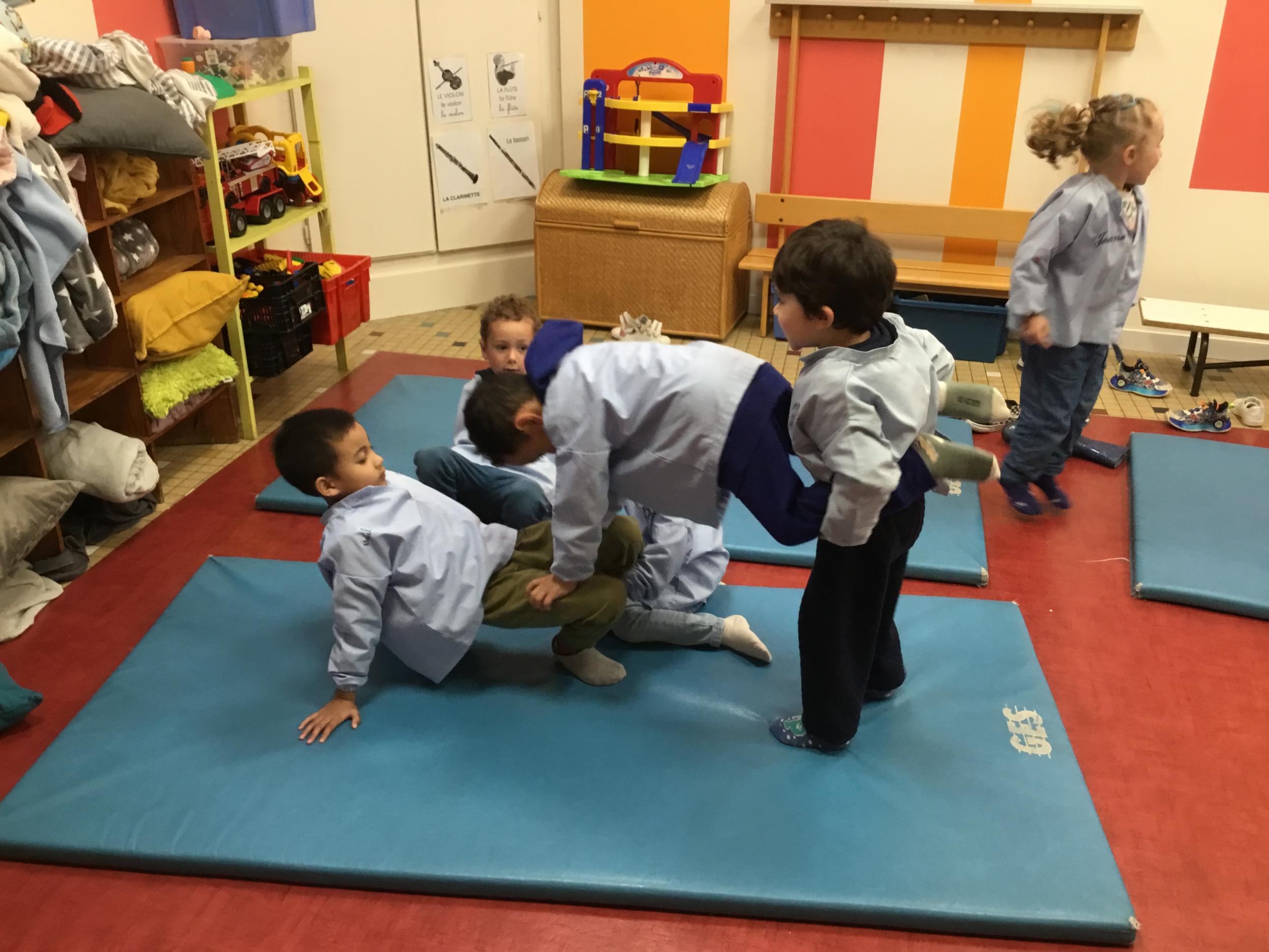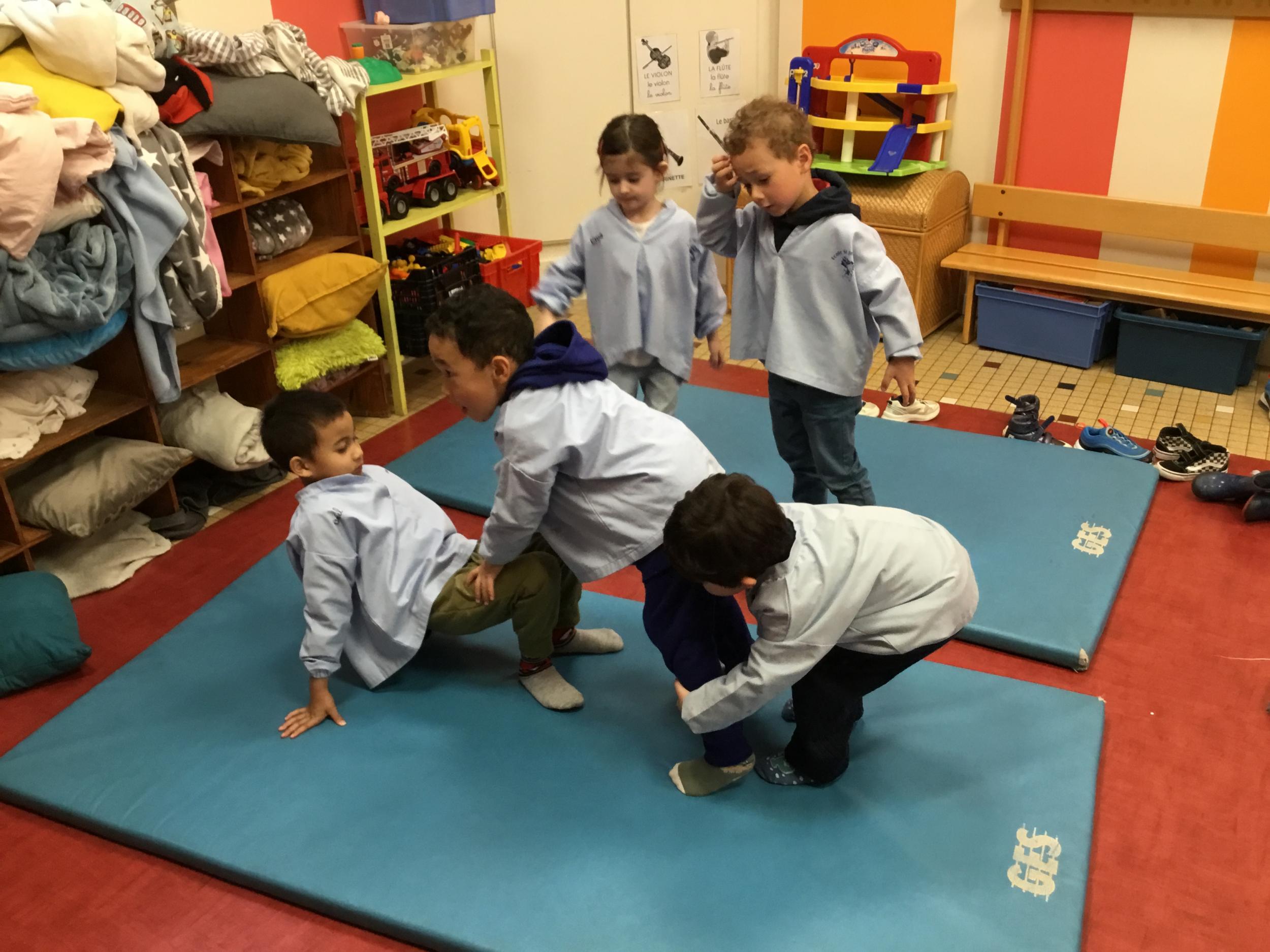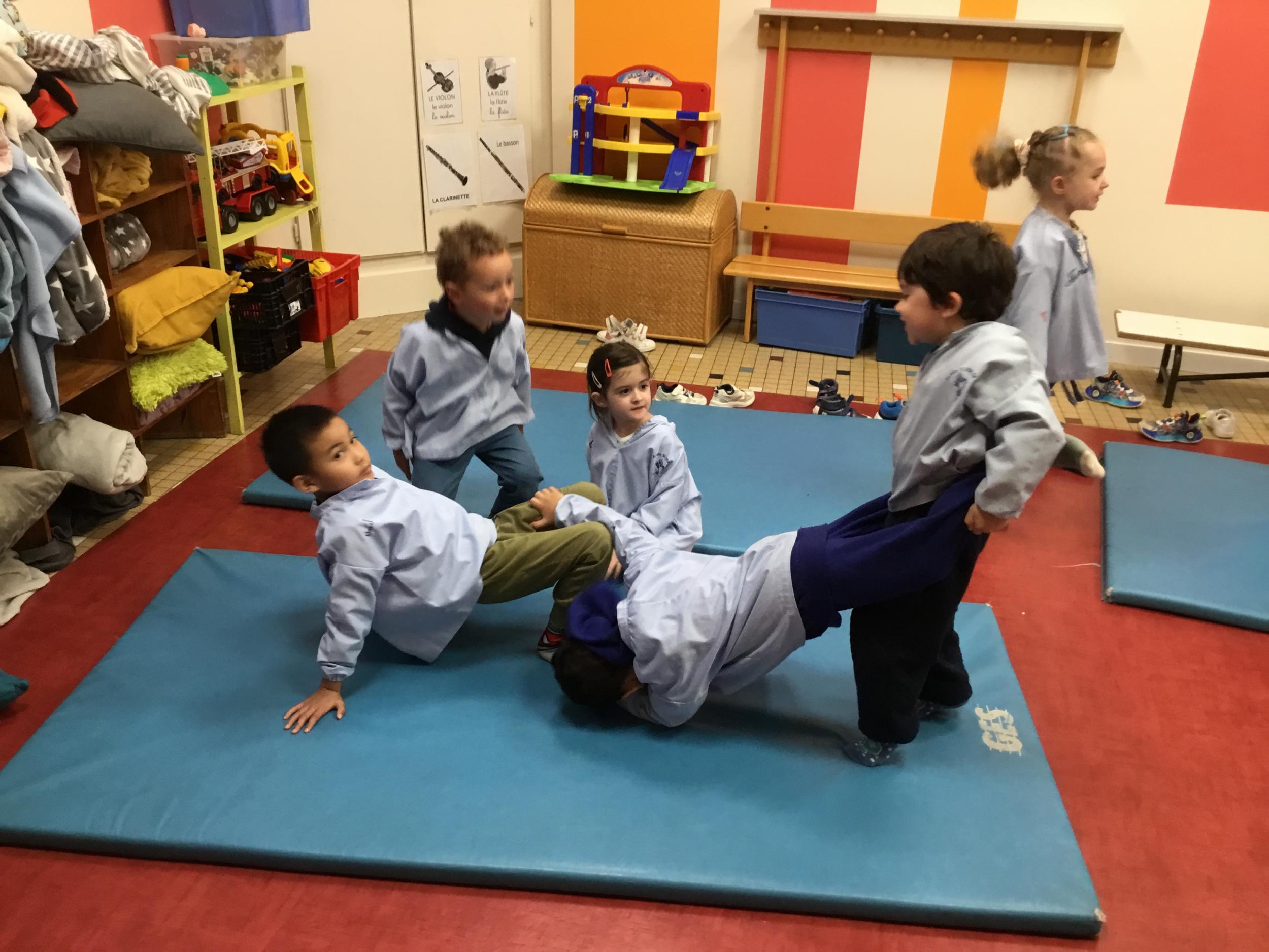Nous commençons un cycle d’acrosport . Il s’agit de s’organiser par groupe de 3 ou 4 élèves pour faire des figures d’équilibriste . Les élèves se répartissent de manière autonome les différents rôles : équilibriste, porteurs et arbitre aide.