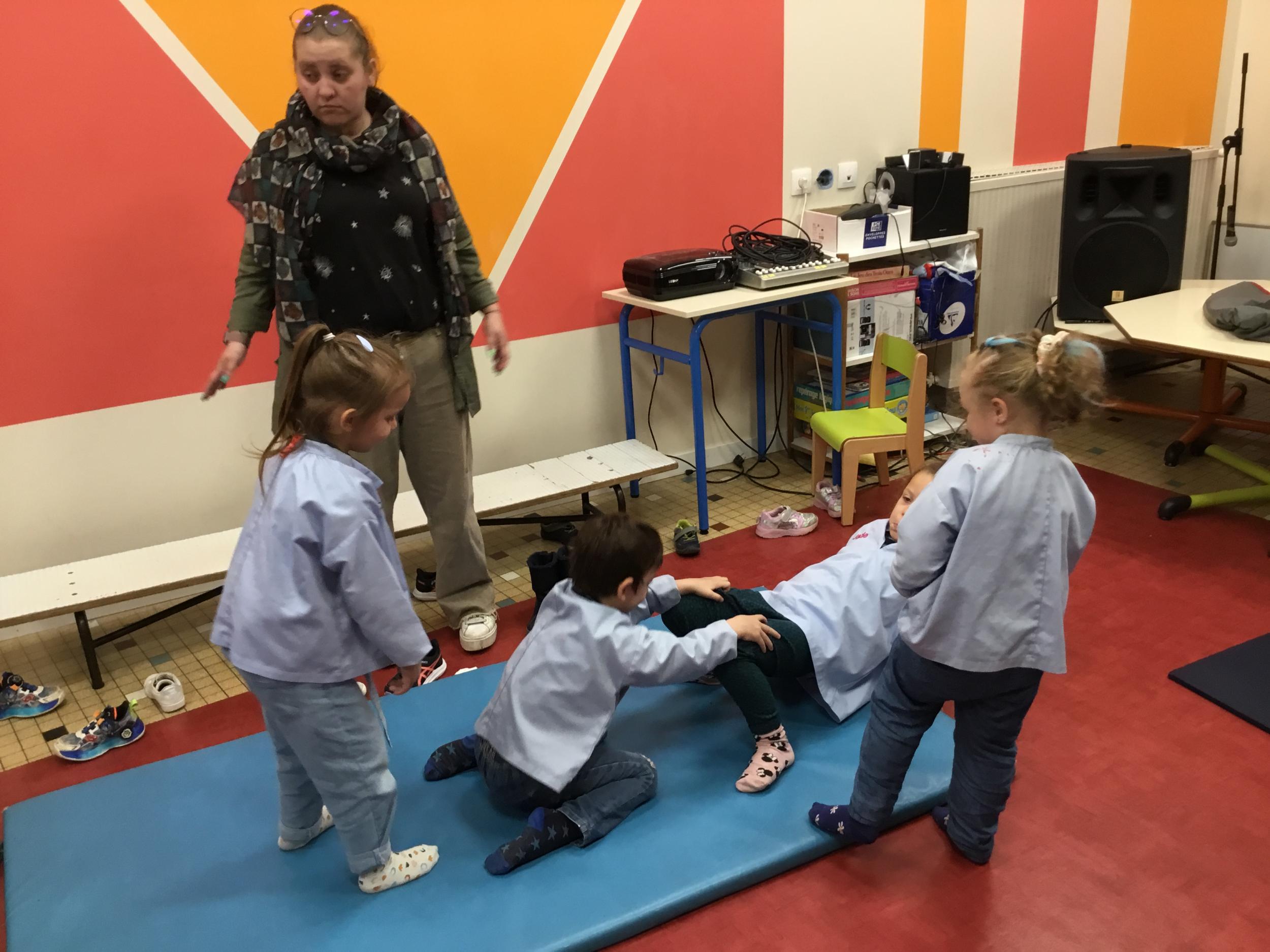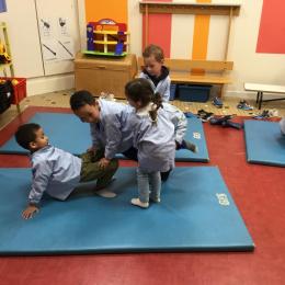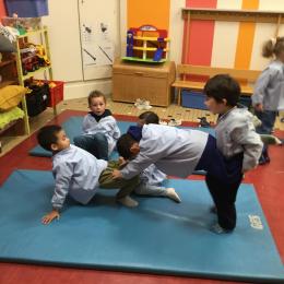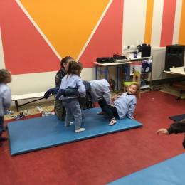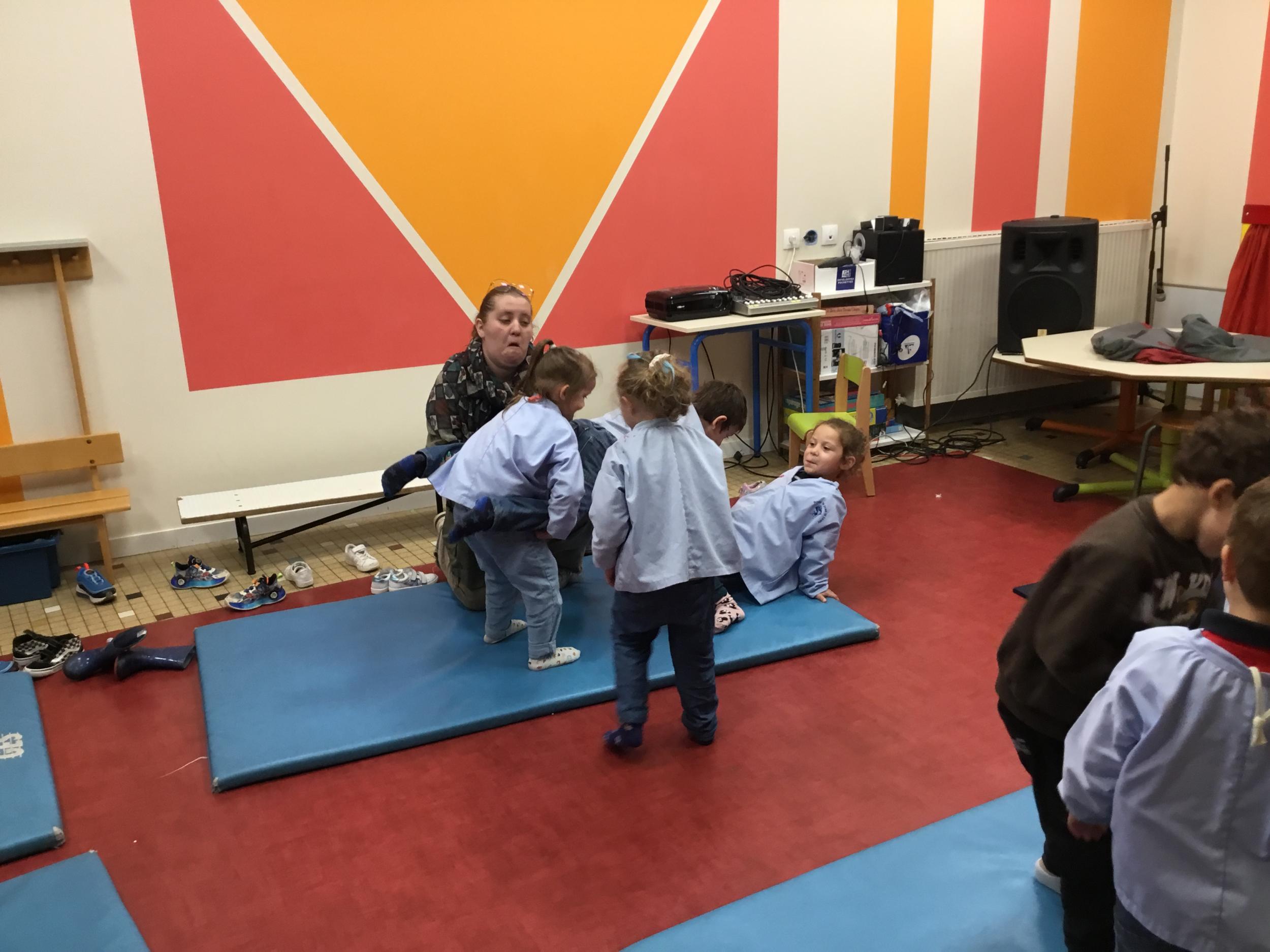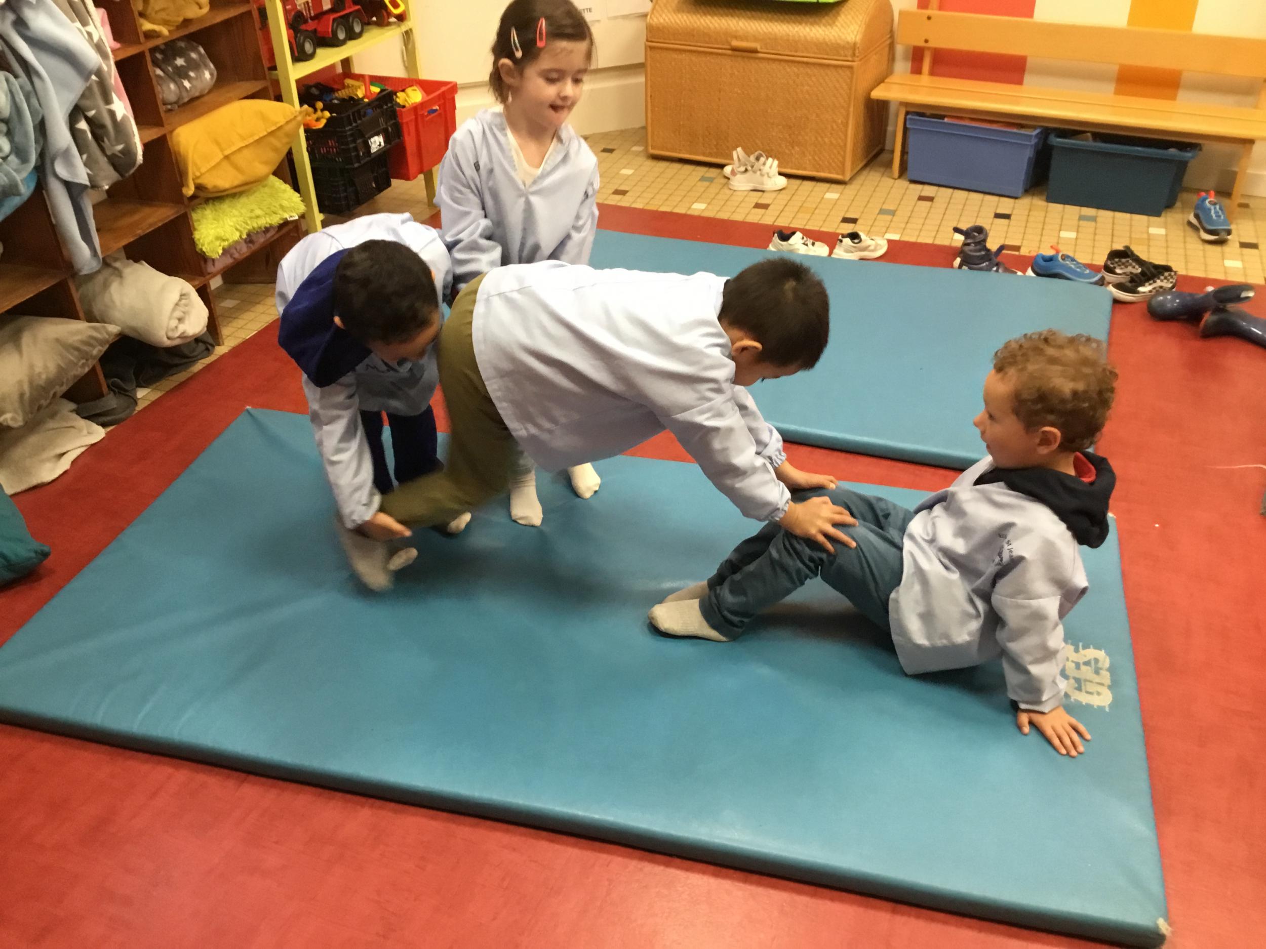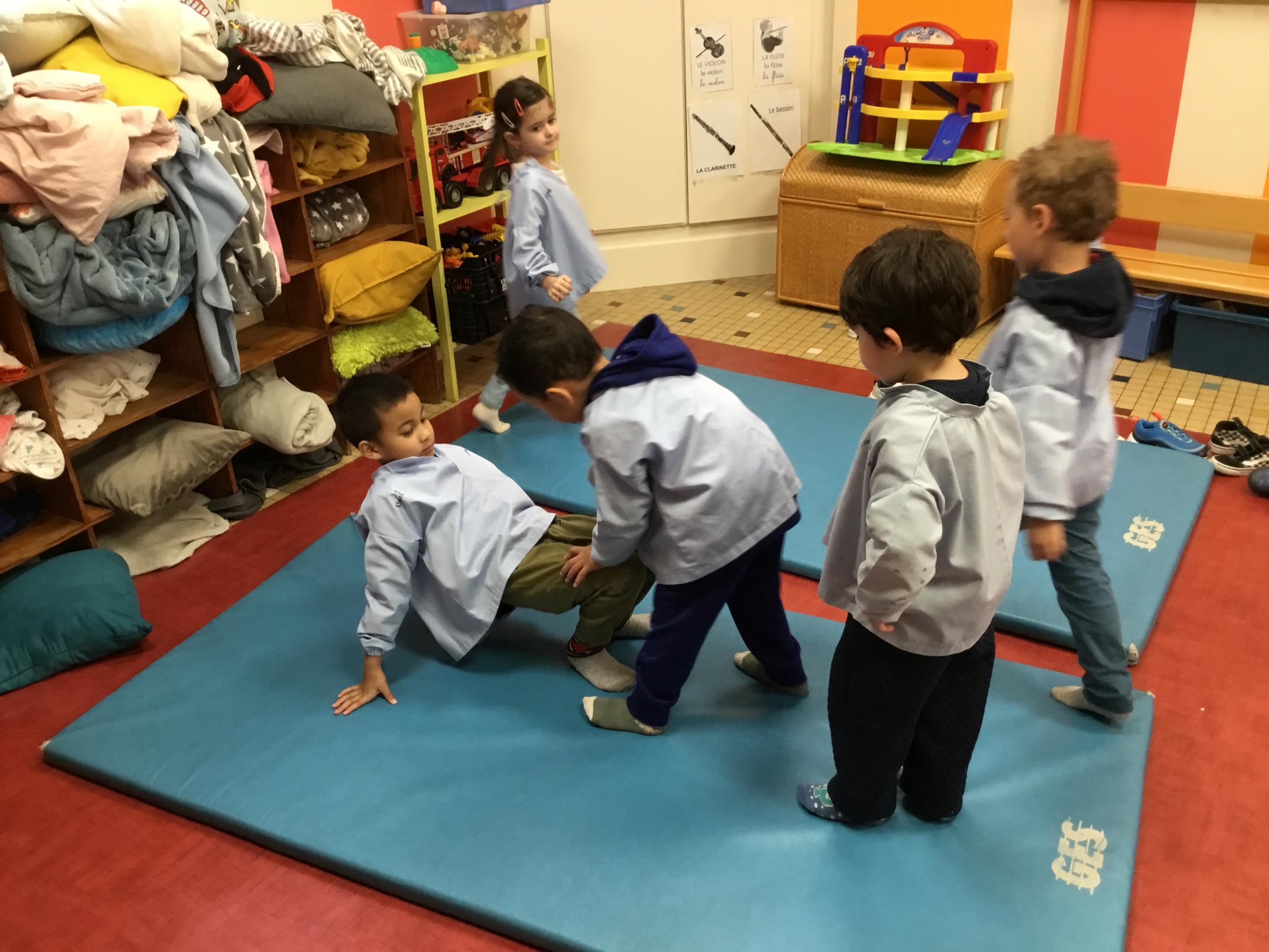 Nous commençons un cycle d’acrosport . Il s’agit de s’organiser par groupe de 3 ou 4 élèves pour faire des figures d’équilibriste . Les élèves se répartissent de manière autonome les différents rôles : équilibriste, porteurs et arbitre aide.