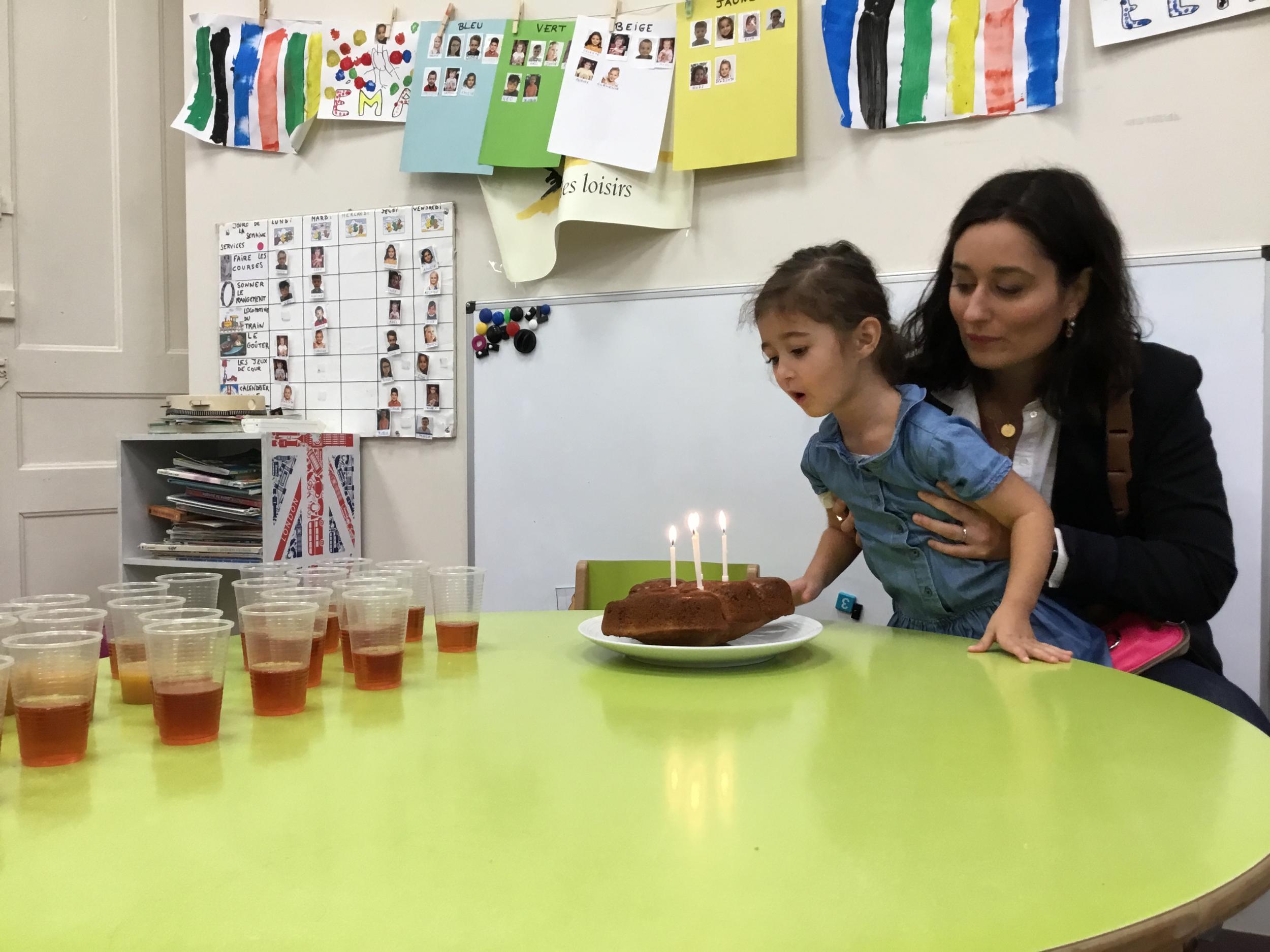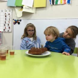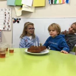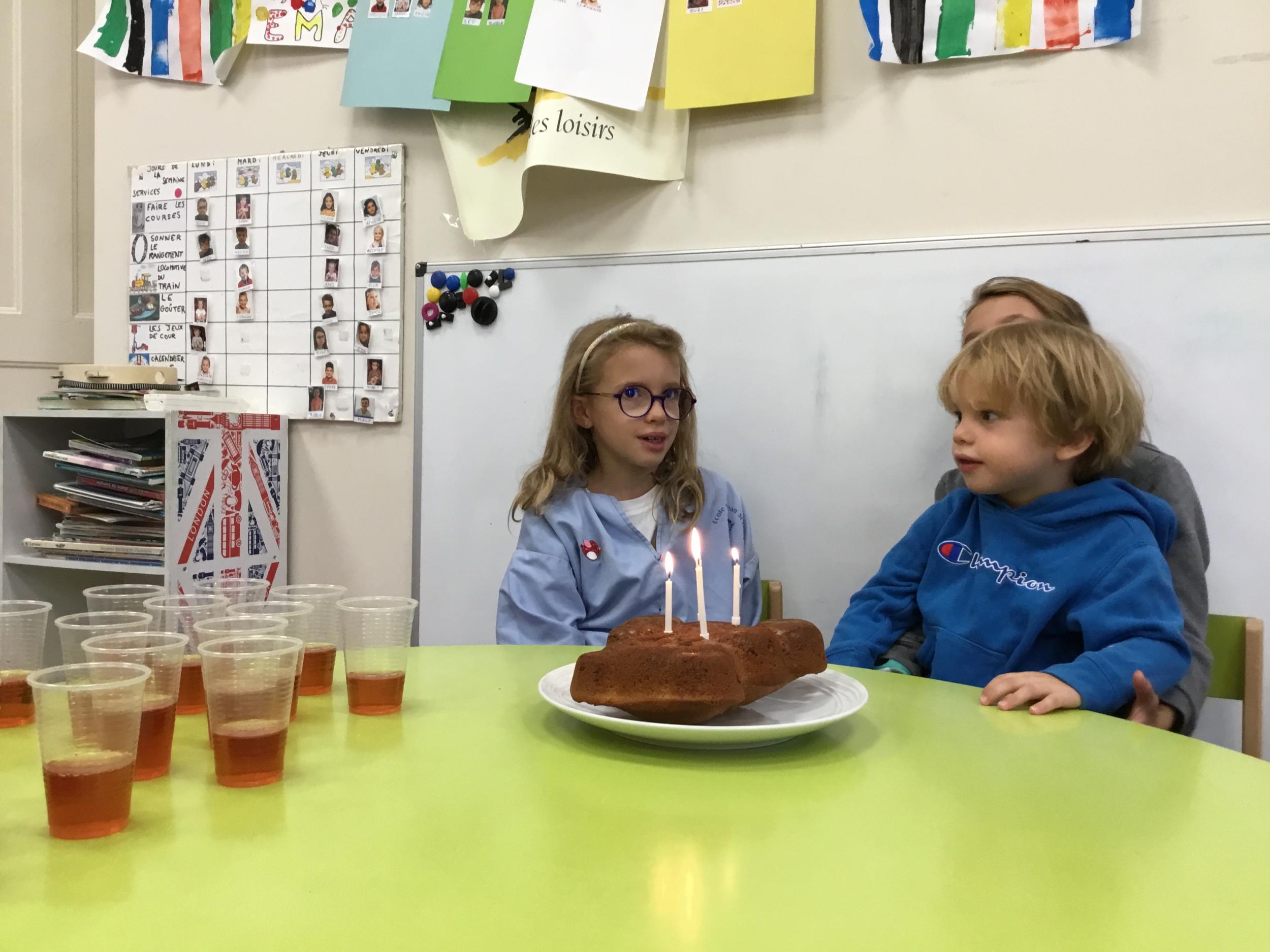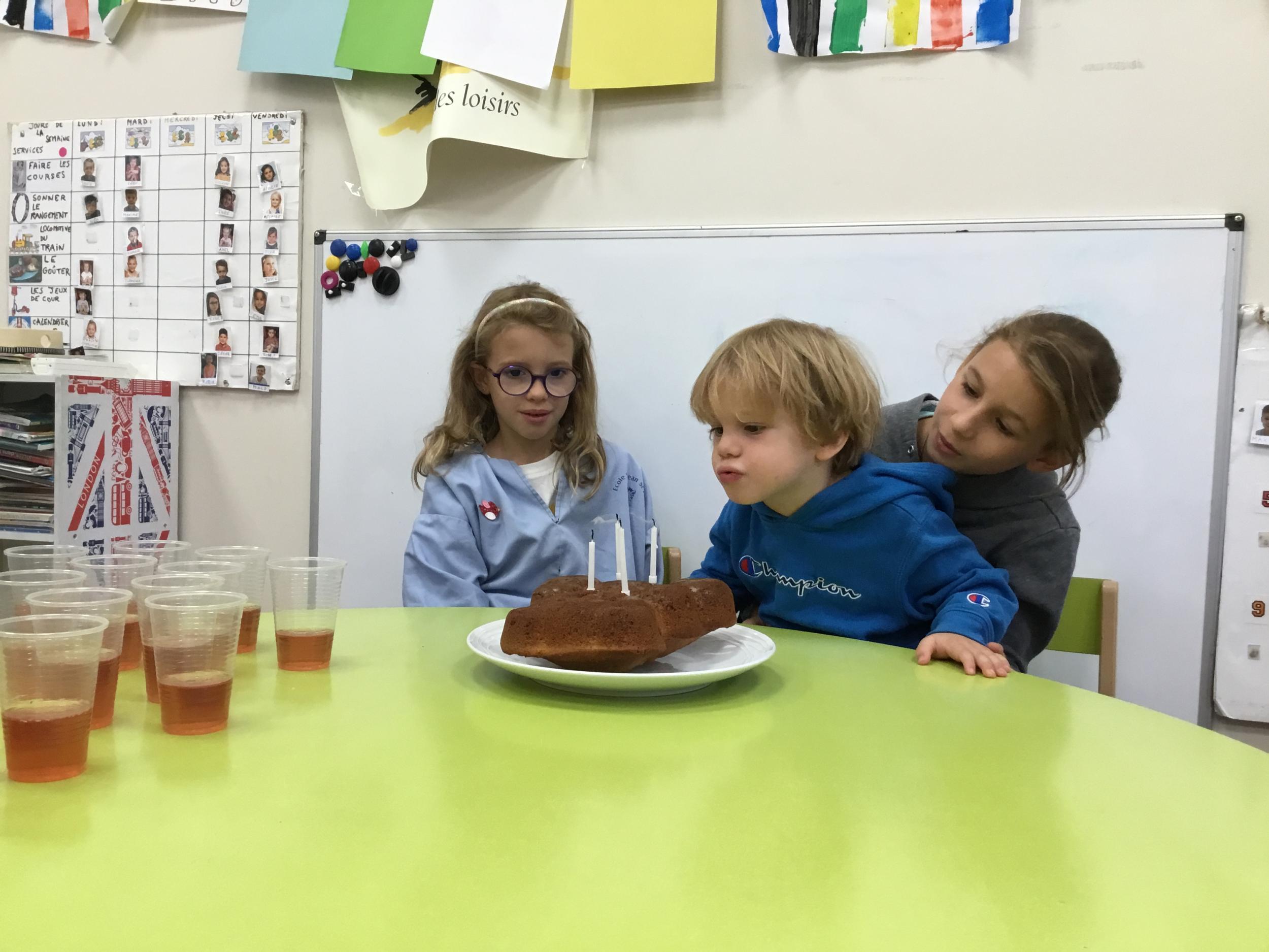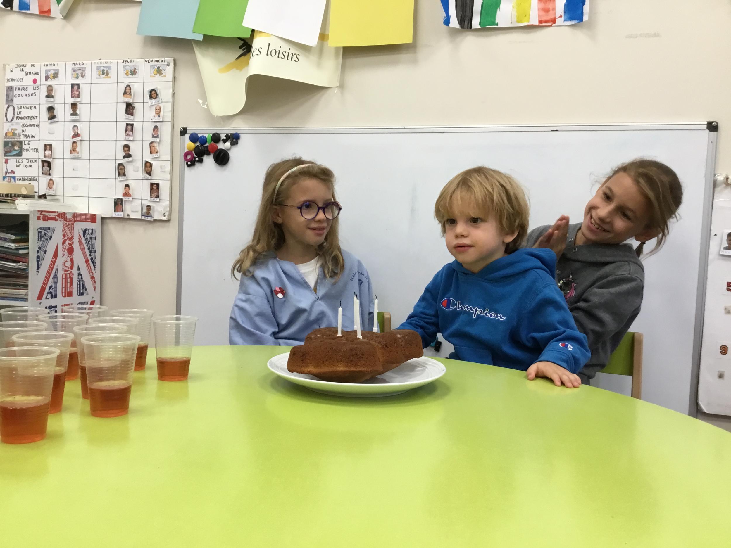 Vendredi dernier, nous avons fêté les anniversaires de Céleste et Léon . Nous avons chanté puis mangé les gâteaux que nous avions fait la veille. Nous nous sommes une fois de plus régalés.