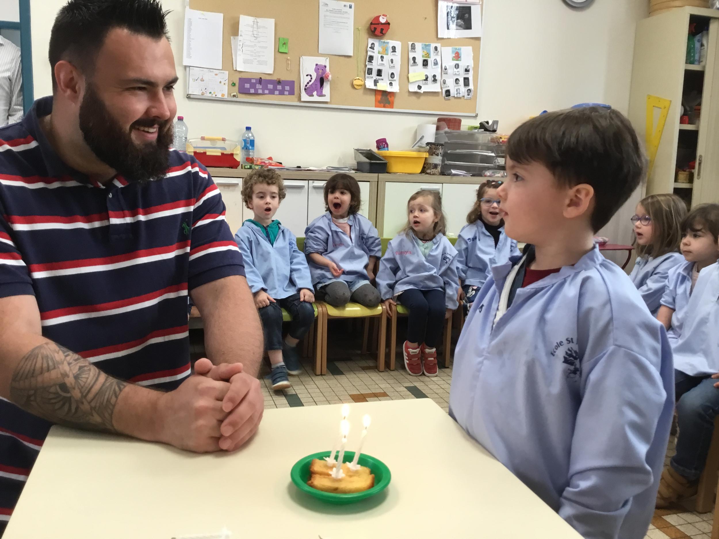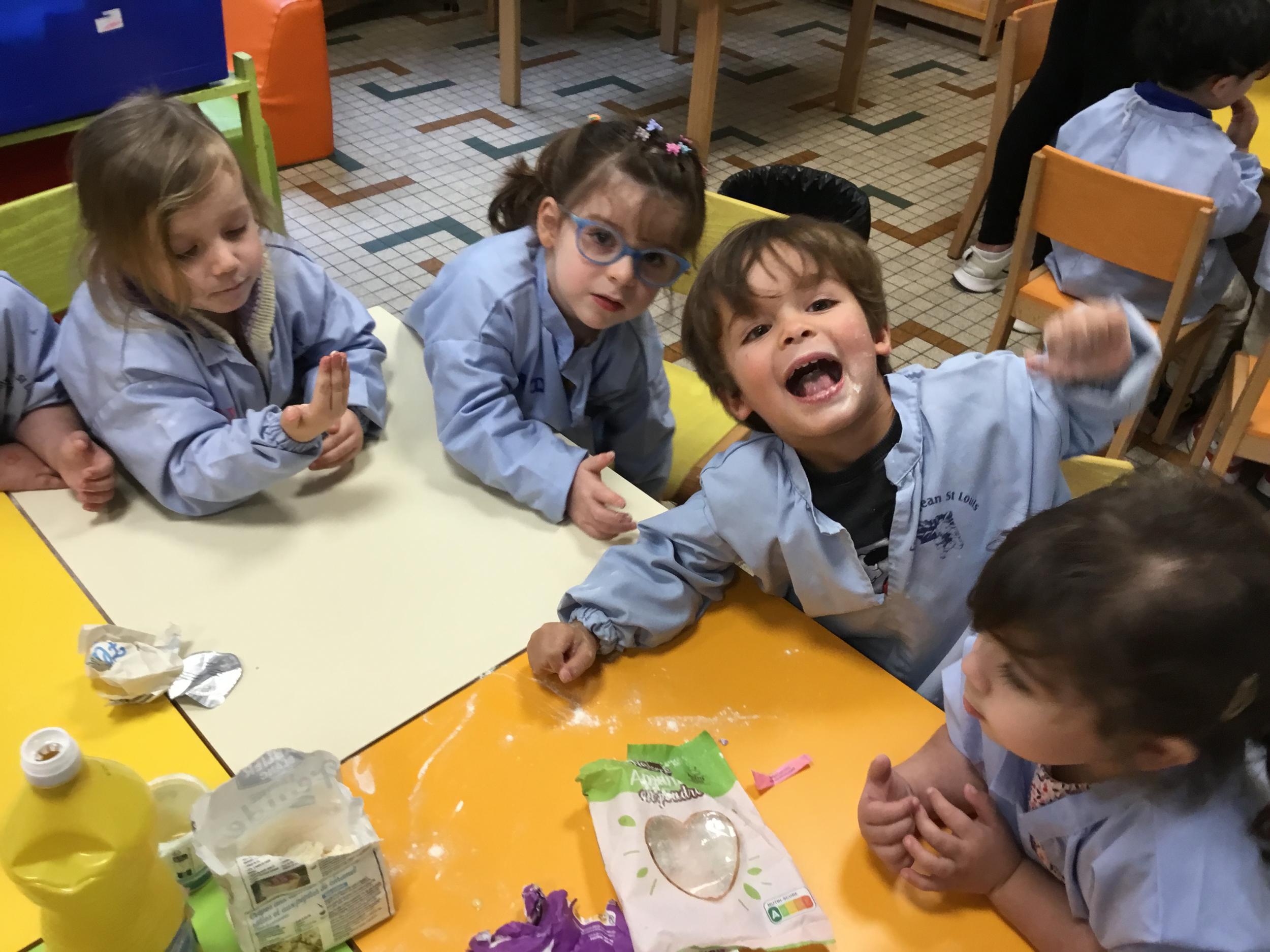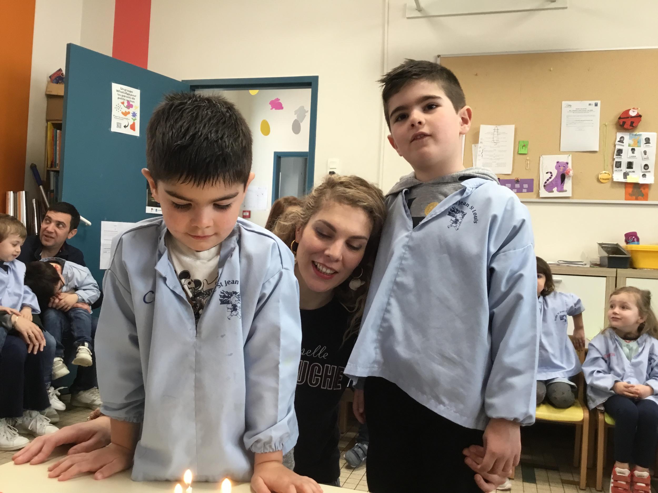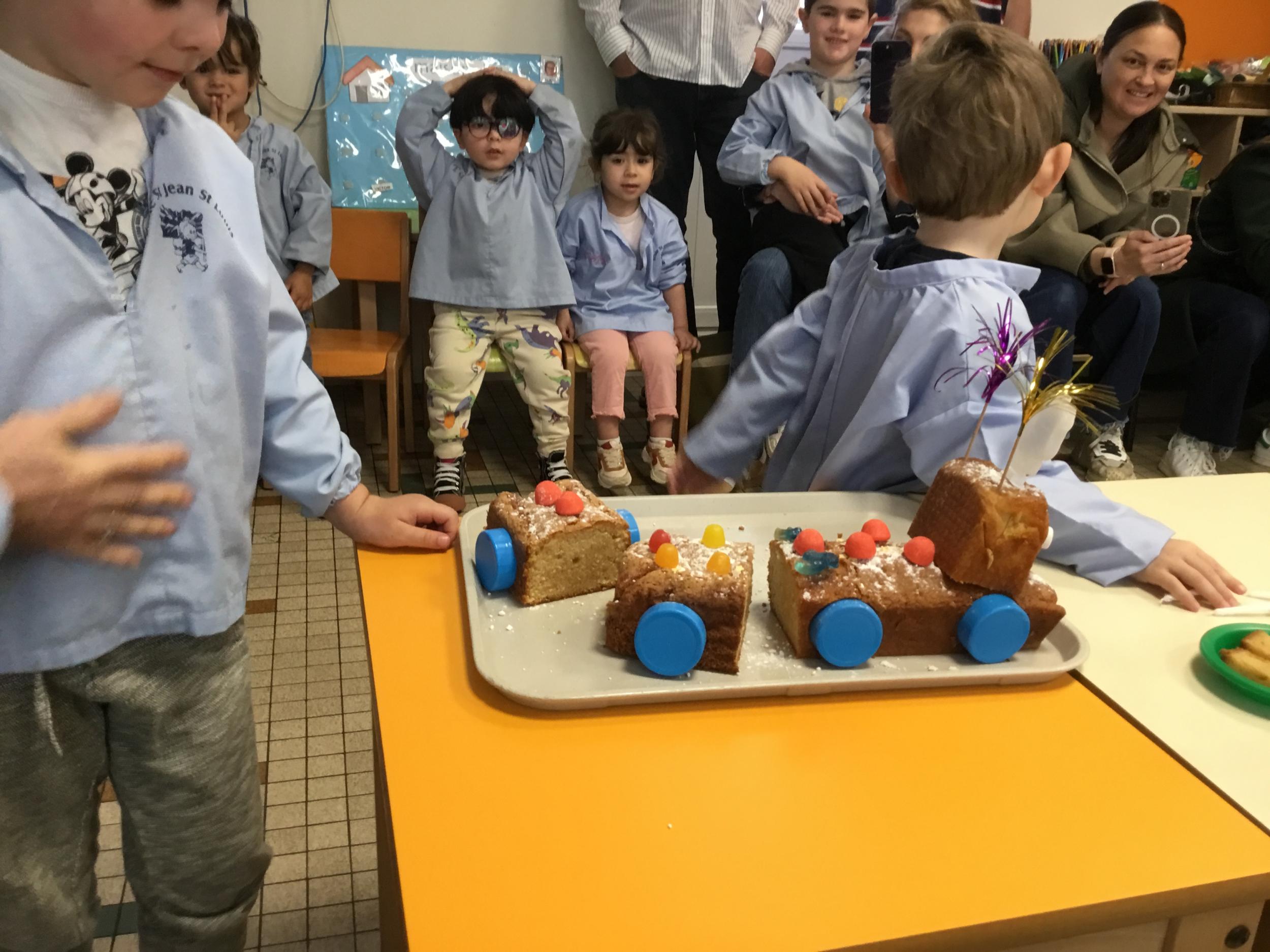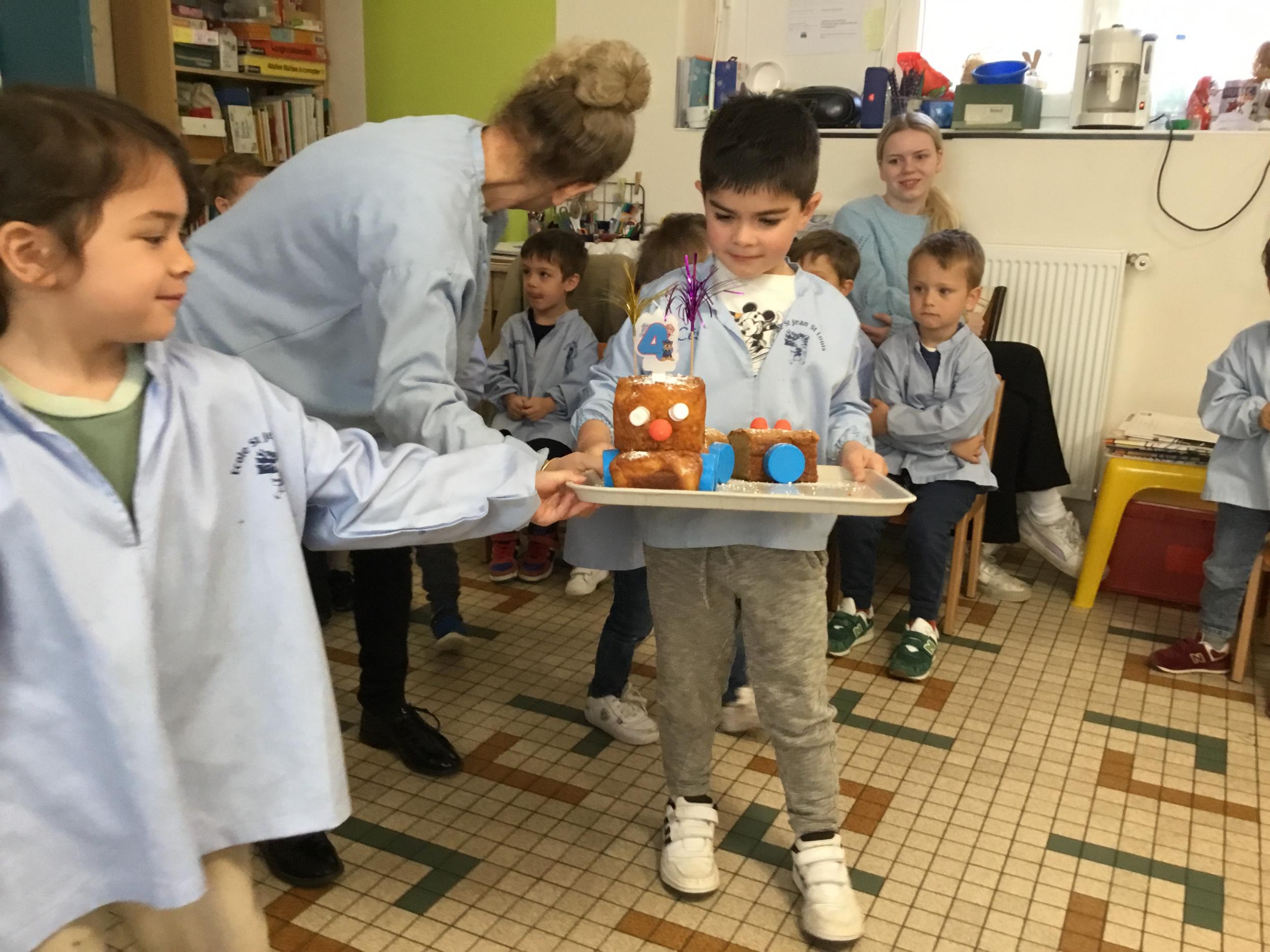 Petite et moyenne section 01/04/2024 Nous avons souhaité un joyeux anniversaire à nos tps, Nans et Jules, et à nos grands ps Eugénie, Victor, Kenzo et Gabin L’atelier patisserie Jour de fête Le bonhomme du mois de mars