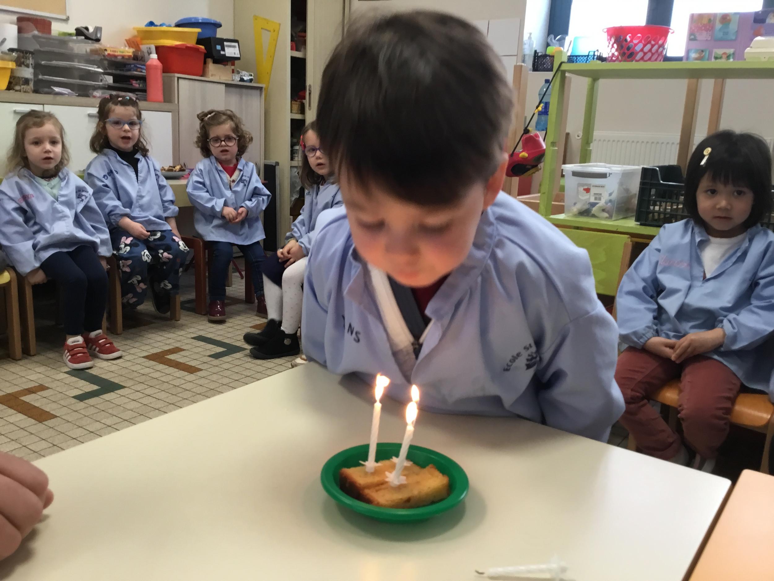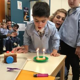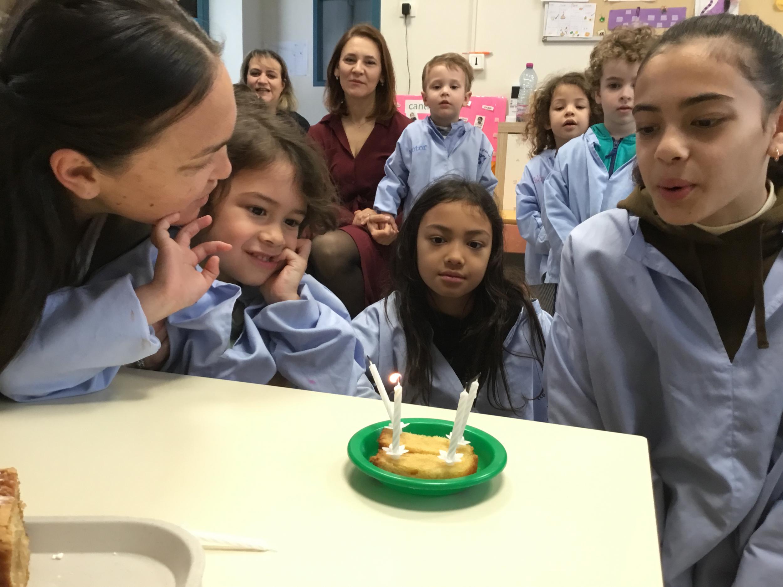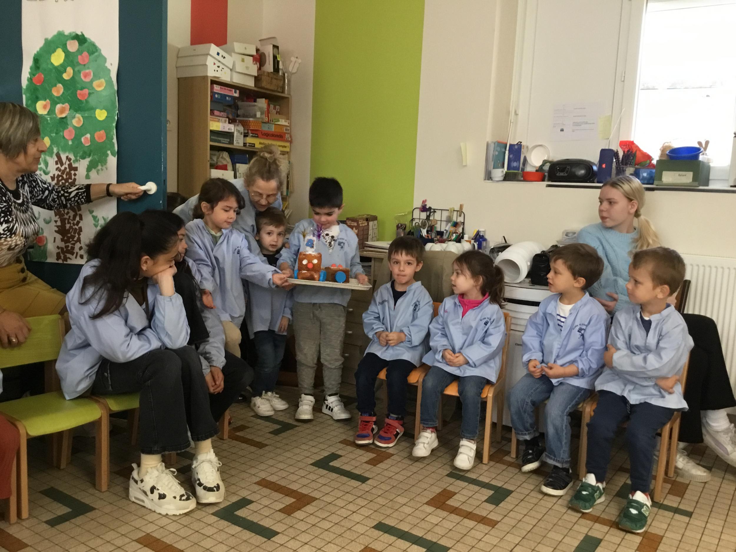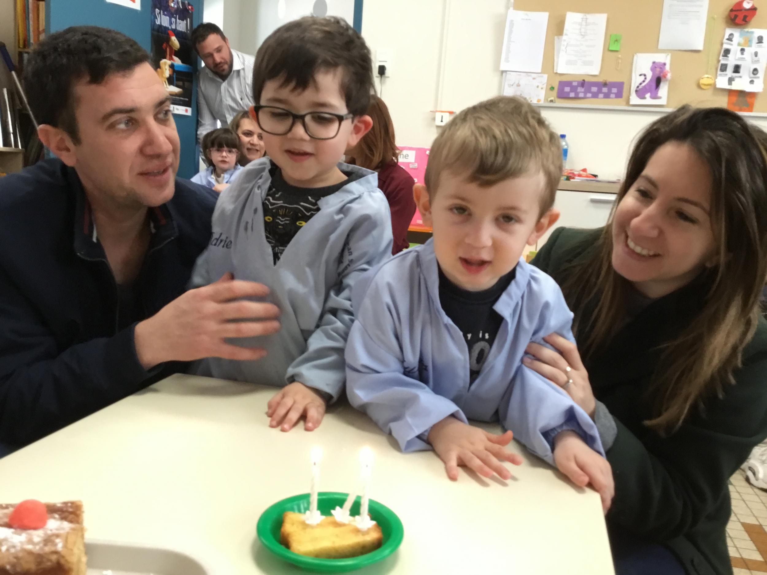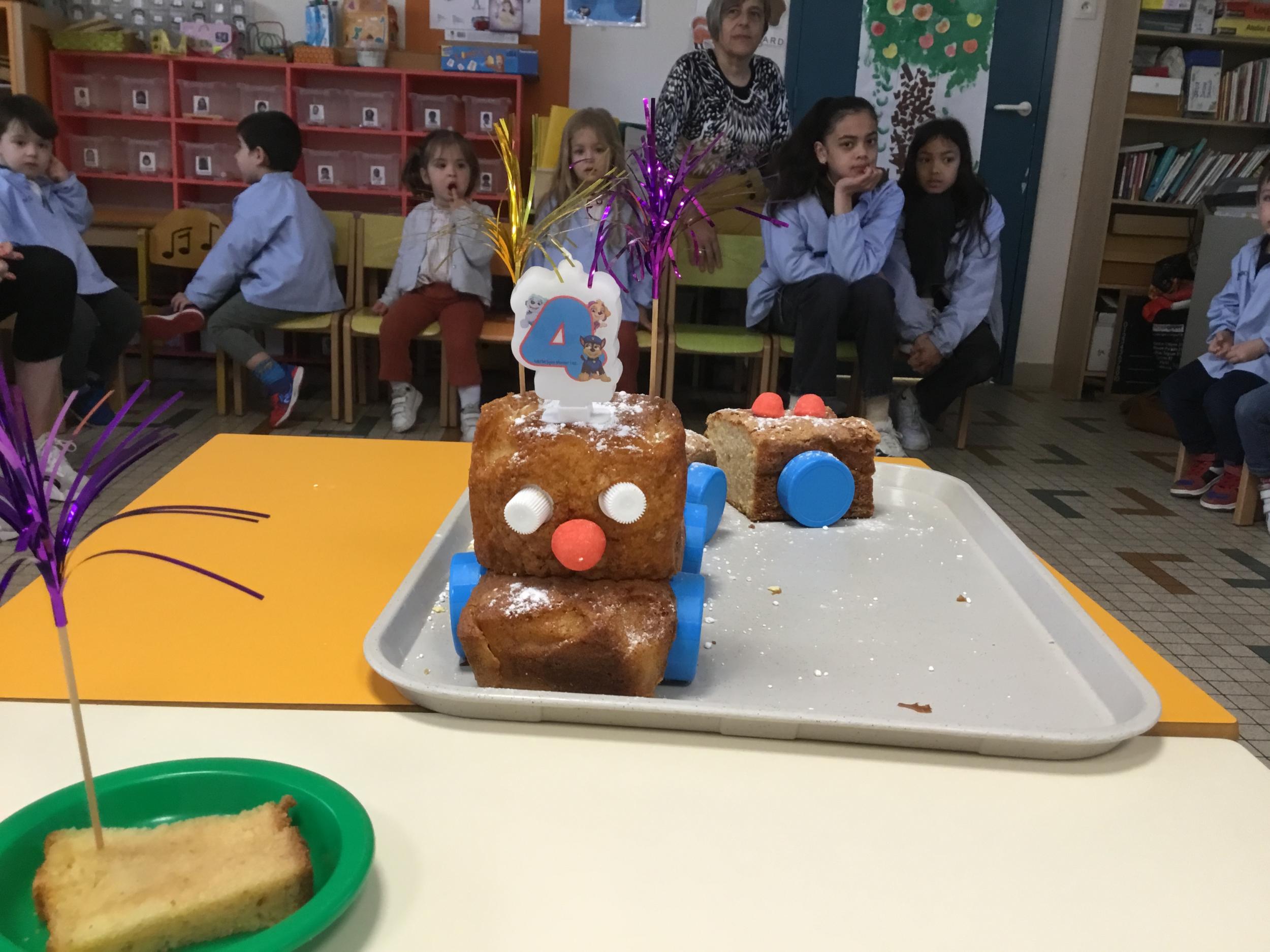 Petite et moyenne section 01/04/2024 Nous avons souhaité un joyeux anniversaire à nos tps, Nans et Jules, et à nos grands ps Eugénie, Victor, Kenzo et Gabin L’atelier patisserie Jour de fête Le bonhomme du mois de mars