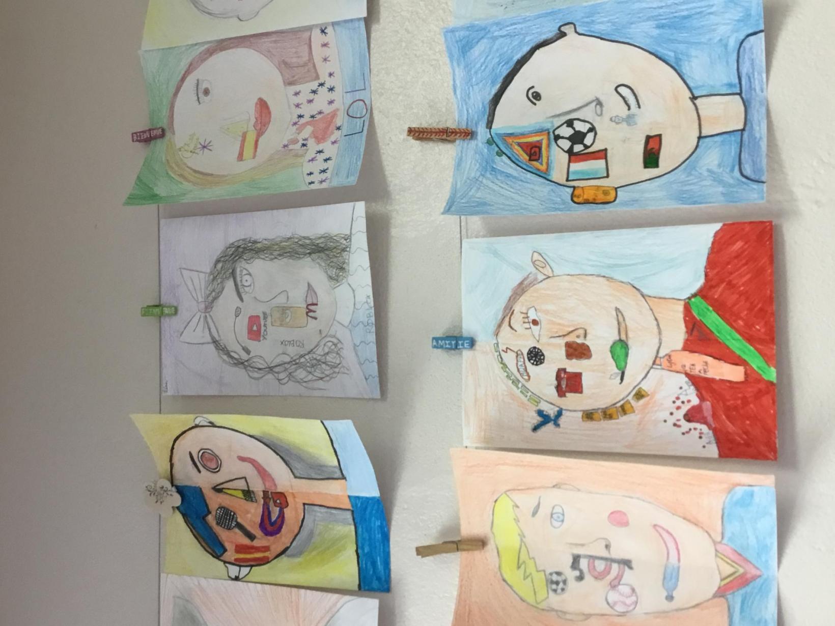 On finit les dessins où il fallait découper des images, de ce qu’on aime : les films, les repas, les boissons, un peu tout ça… Je vais vous expliquer comment on fait : Sandrine nous donne une feuille en carton, après on commence à prendre un crayon à papier, et on trace une tête, un cou et une silhouette, avec d’un côté, ce que l’on aime et de l’autre, notre portrait physique.