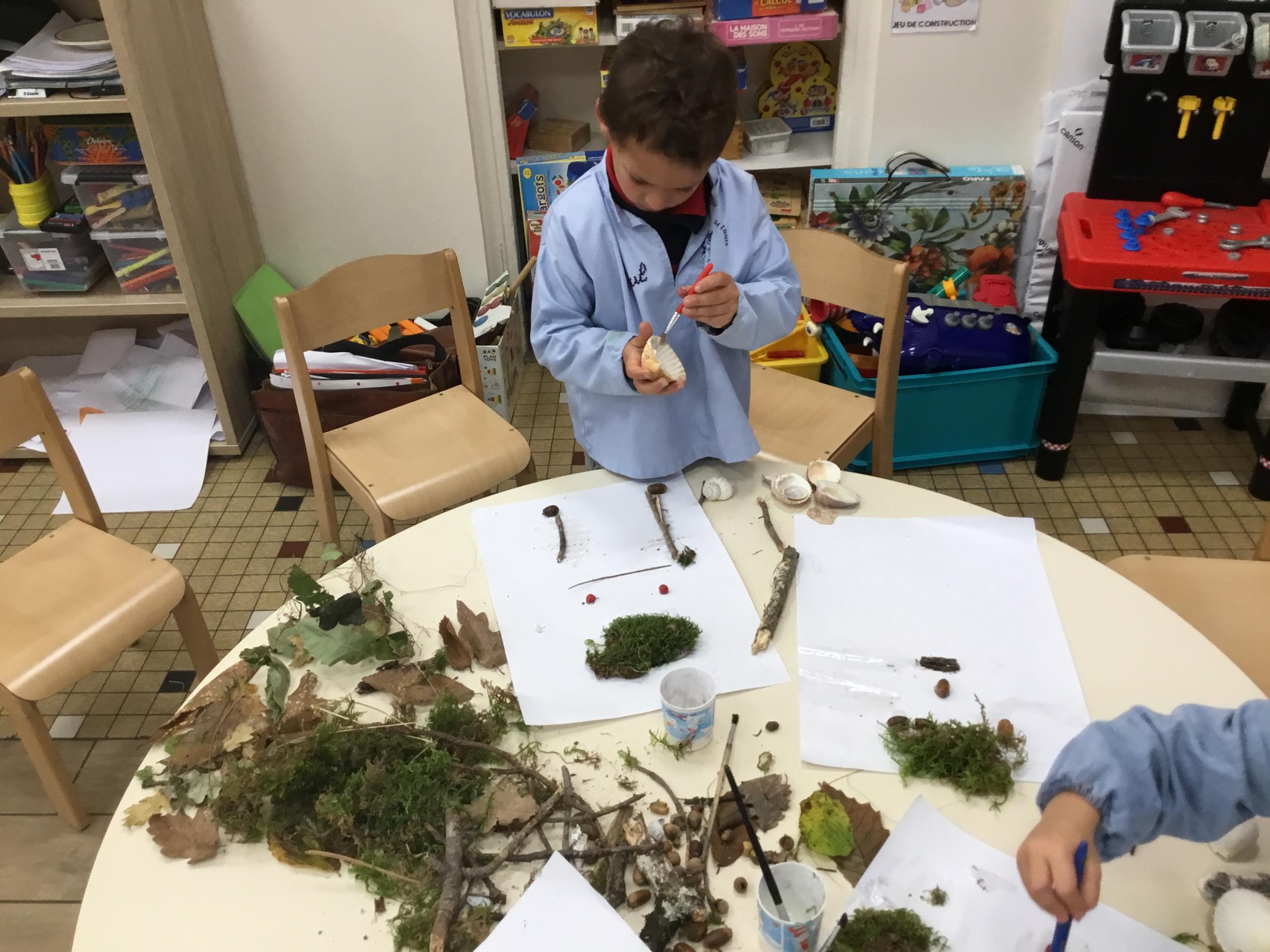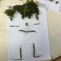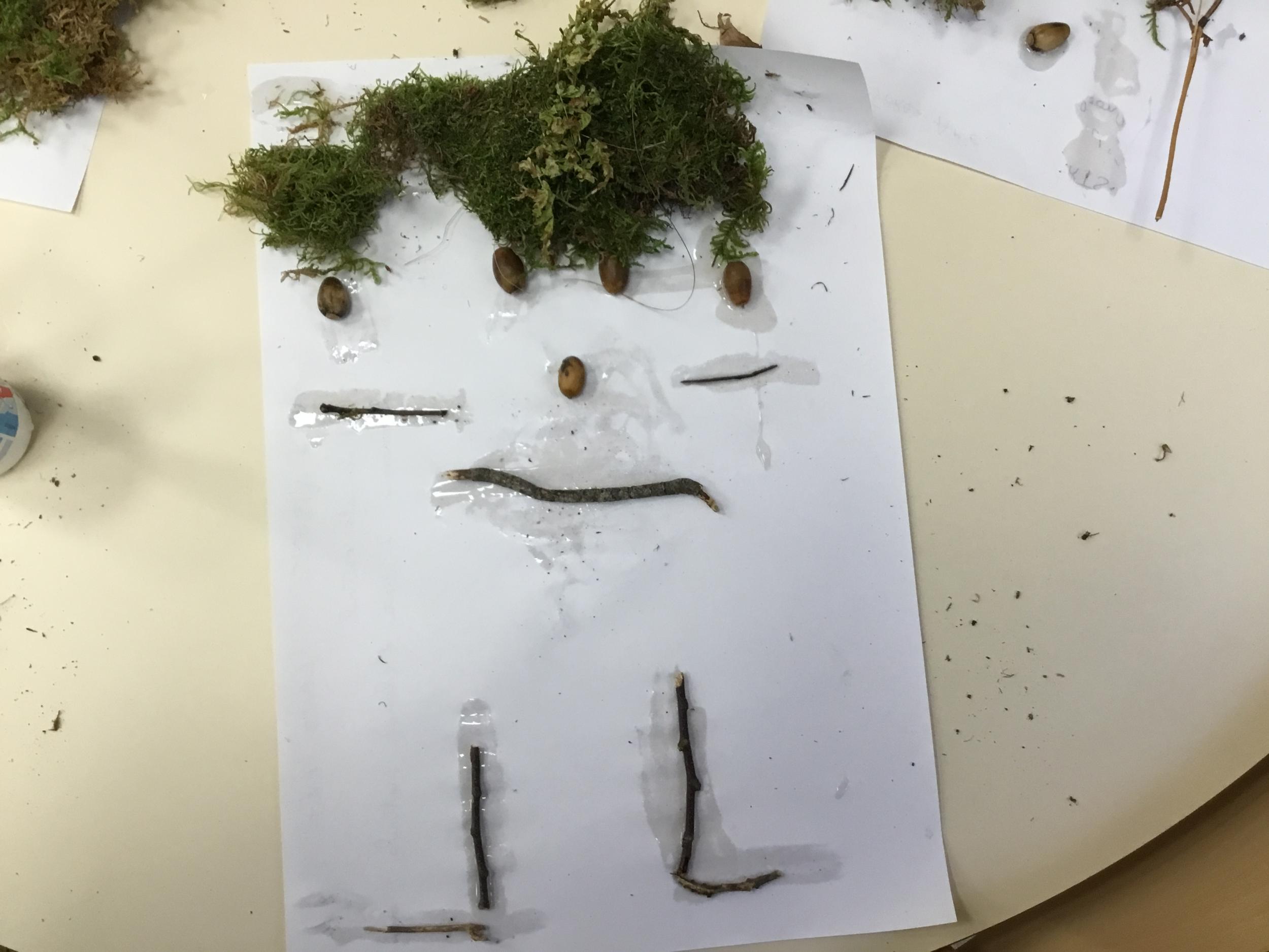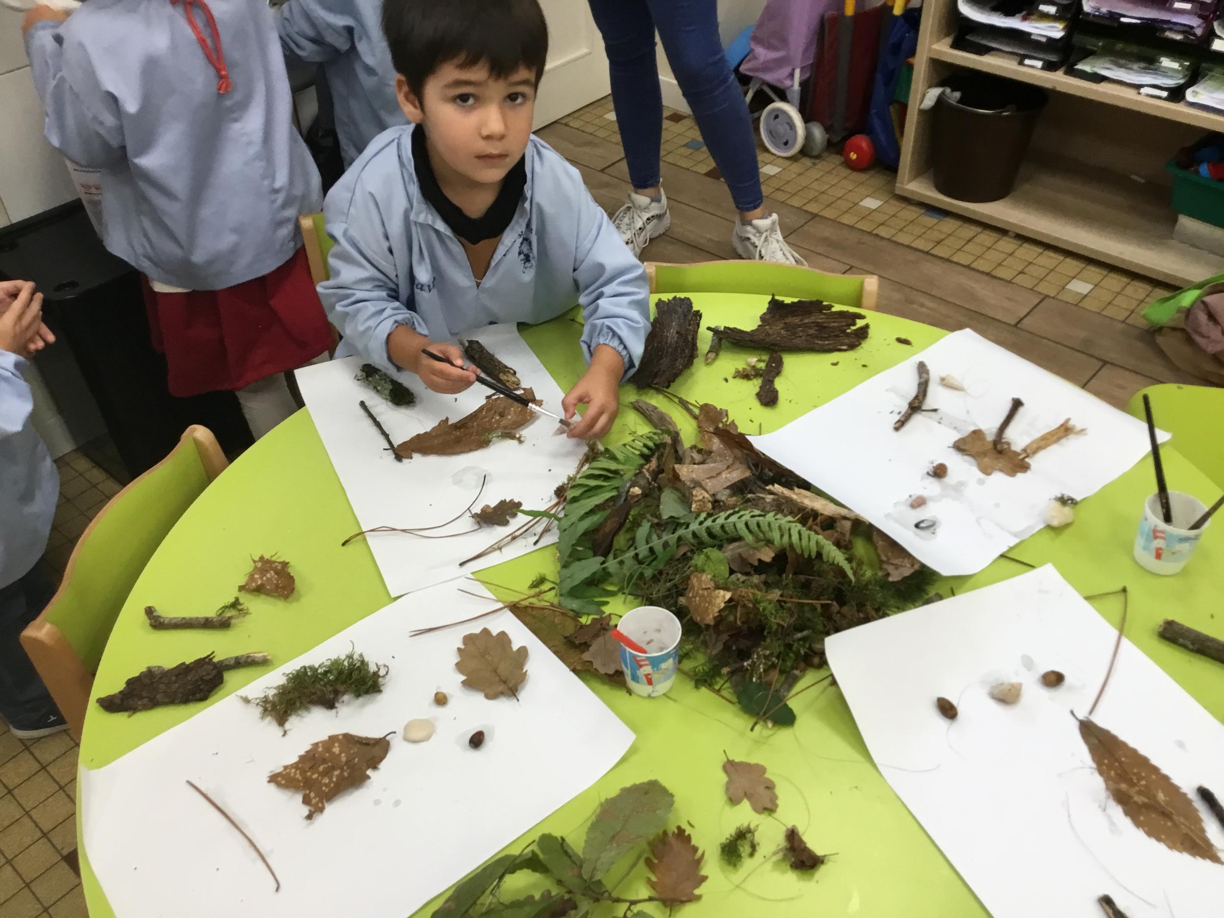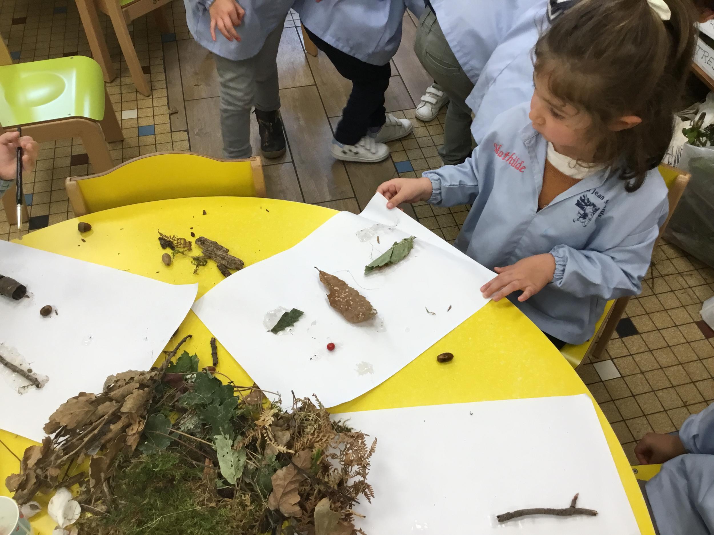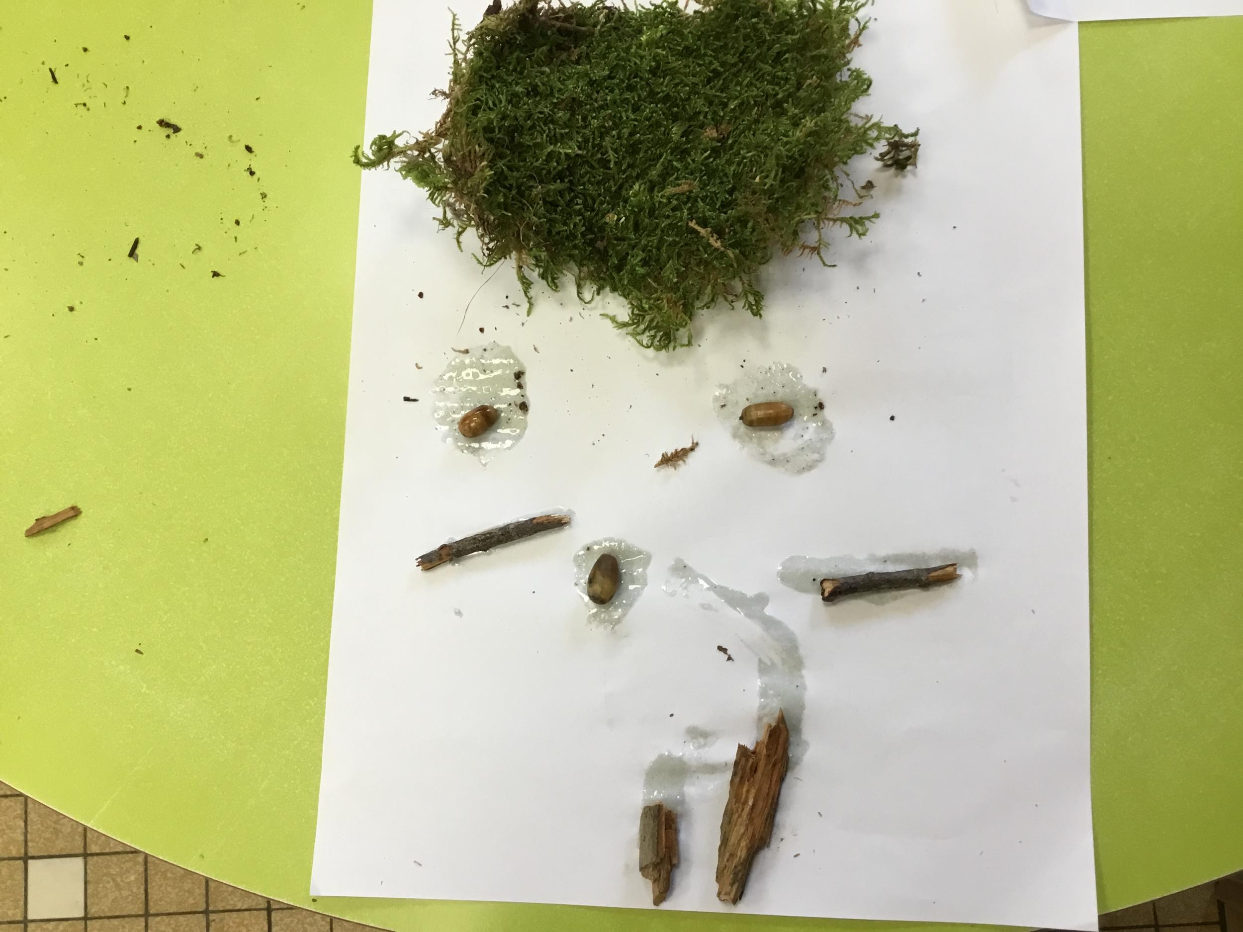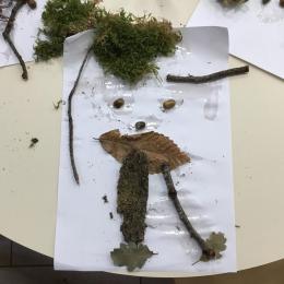 Petite et moyenne section 21/10/2021 Les élèves devaient fabriquer un bonhomme sur une grande feuille à partir des éléments naturels de la forêt ( plus les coquillages😃).