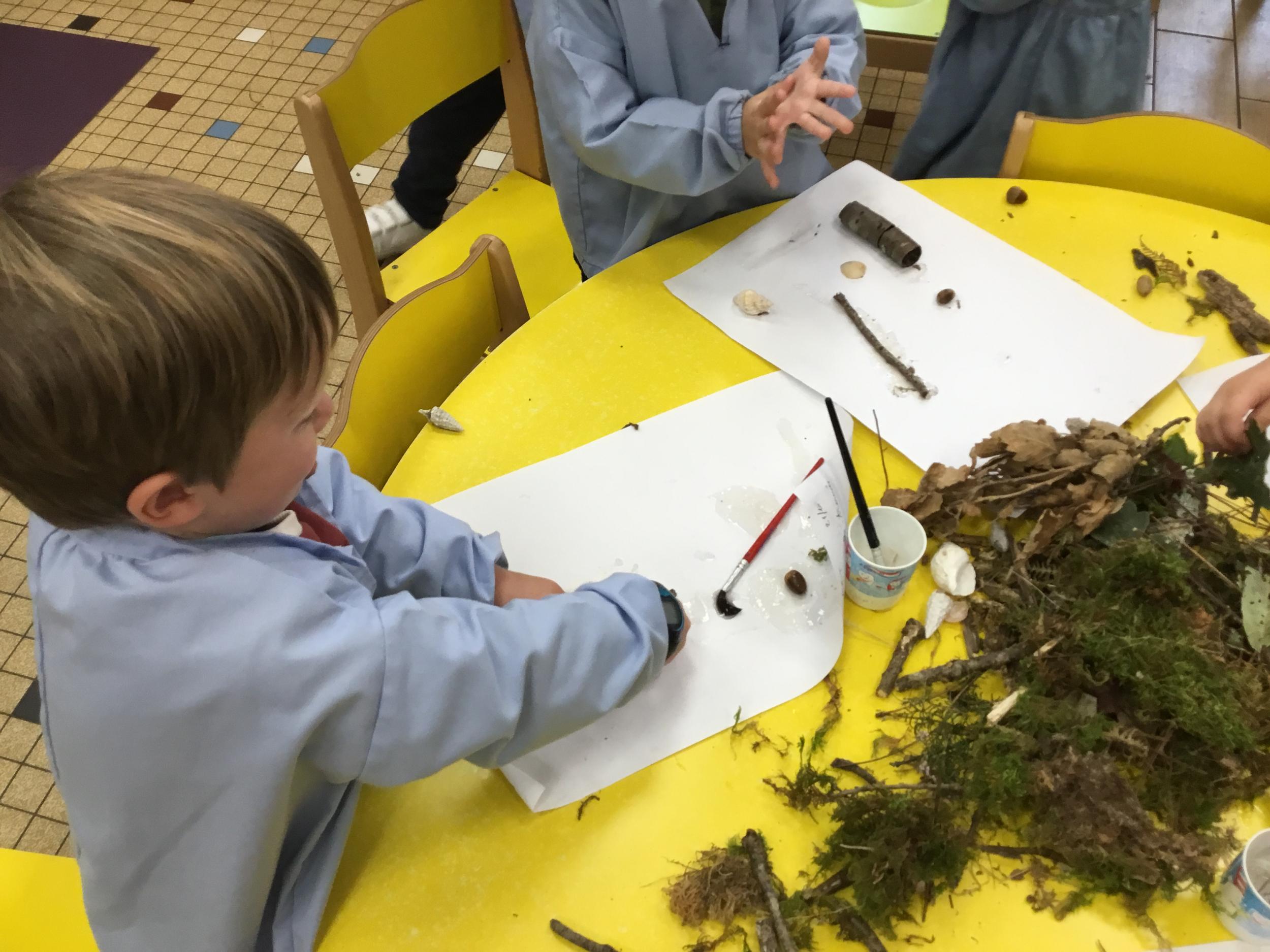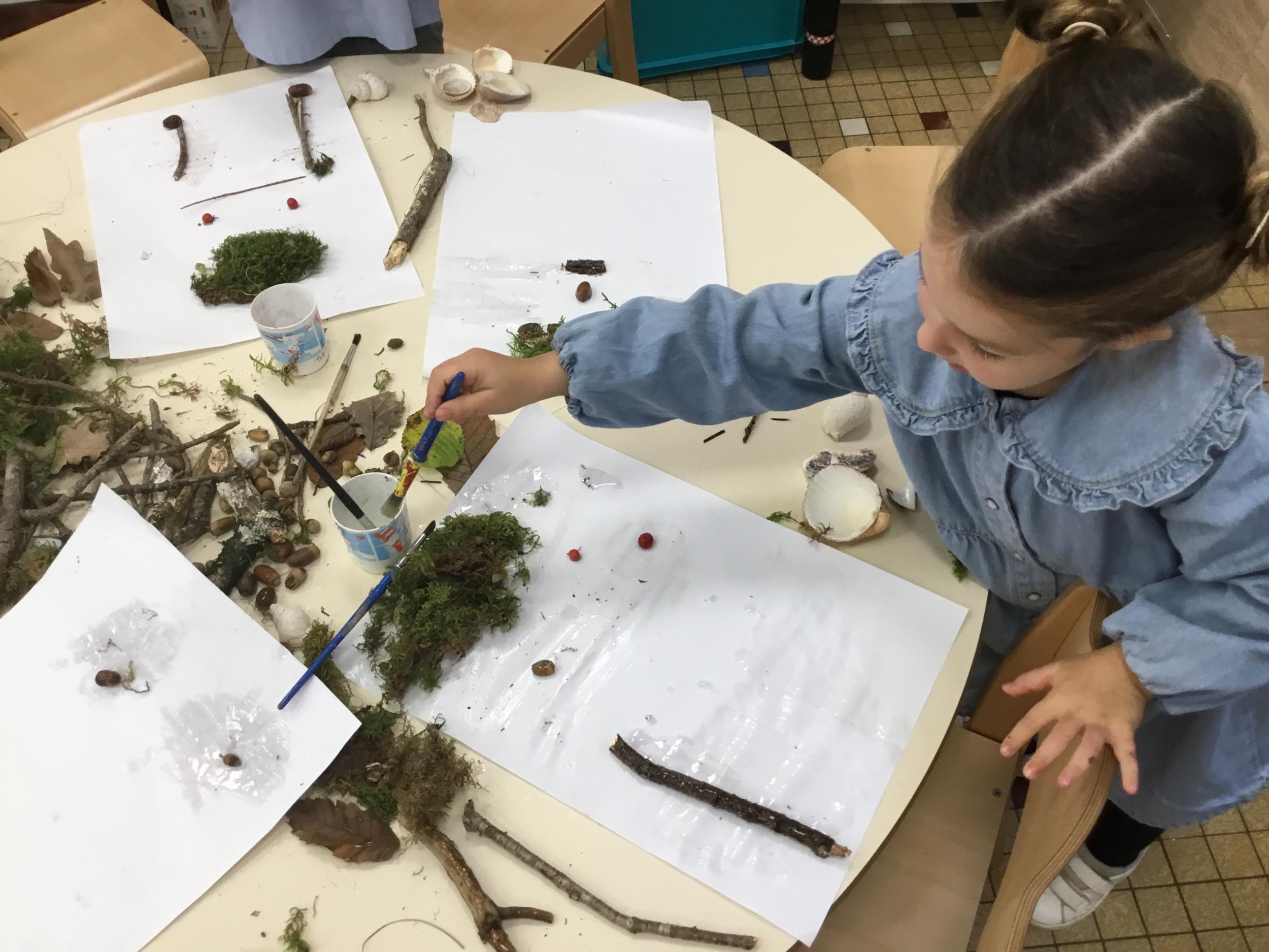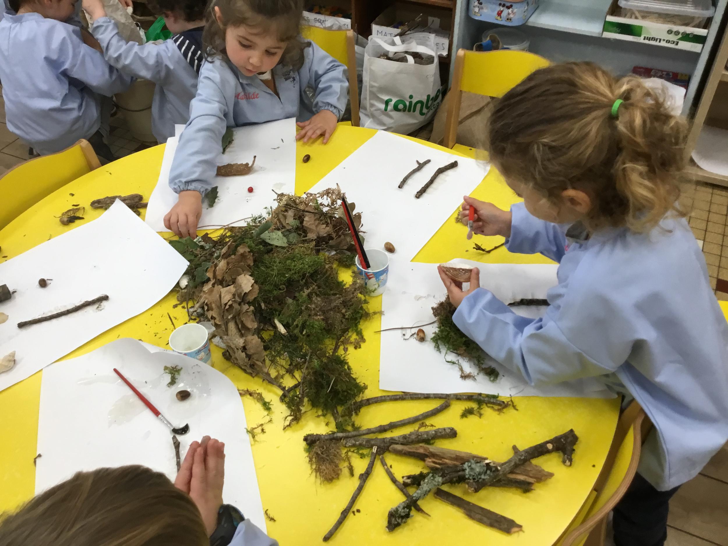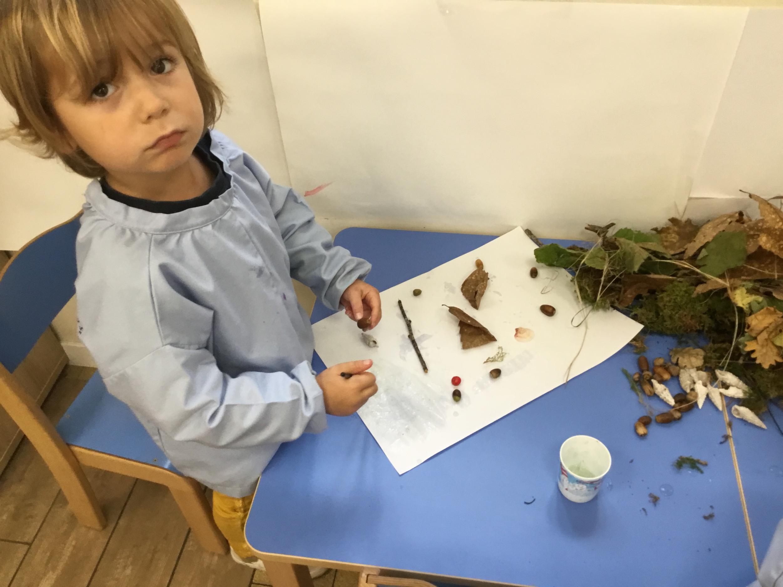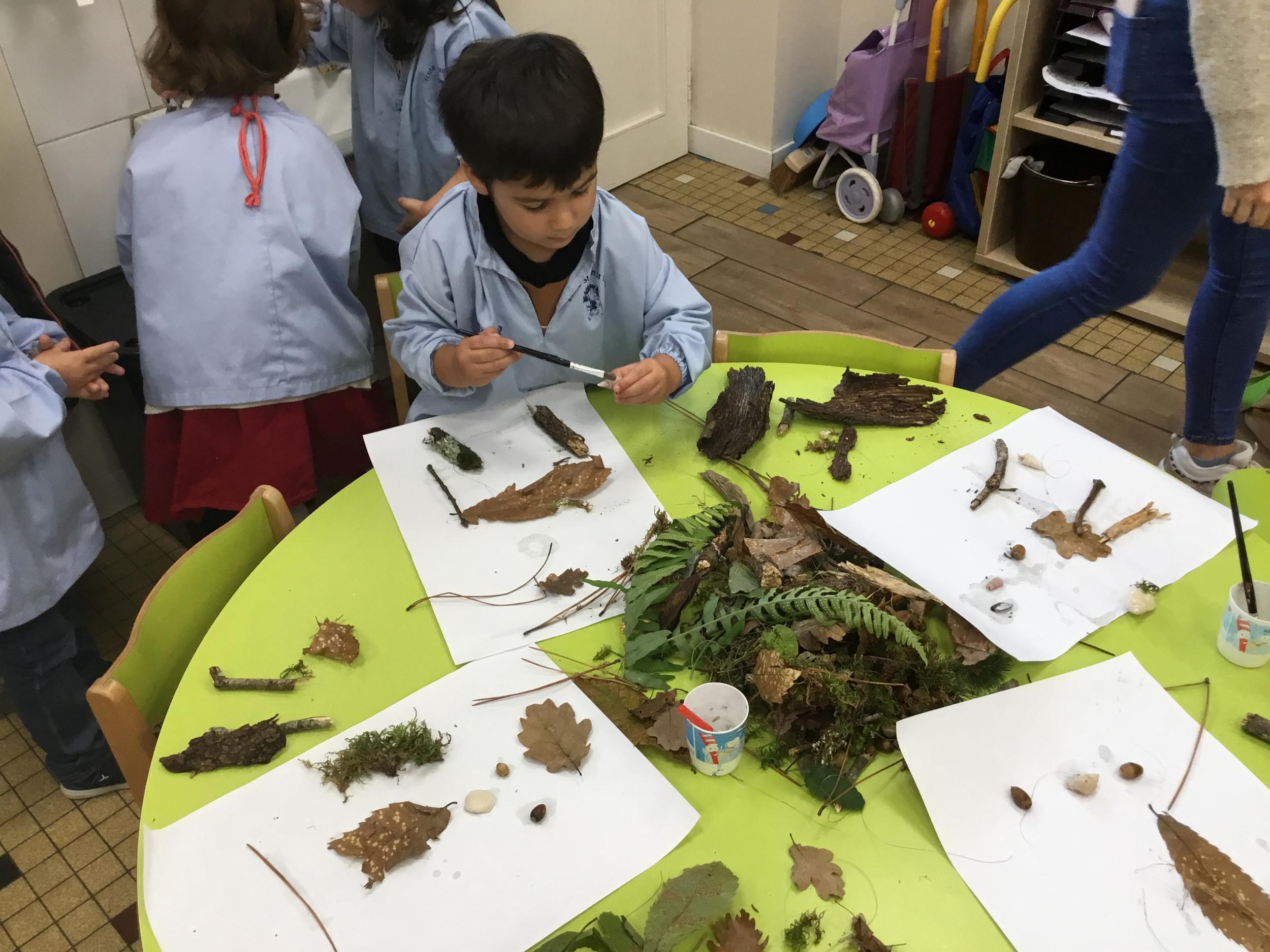 Petite et moyenne section 21/10/2021 Les élèves devaient fabriquer un bonhomme sur une grande feuille à partir des éléments naturels de la forêt ( plus les coquillages😃).