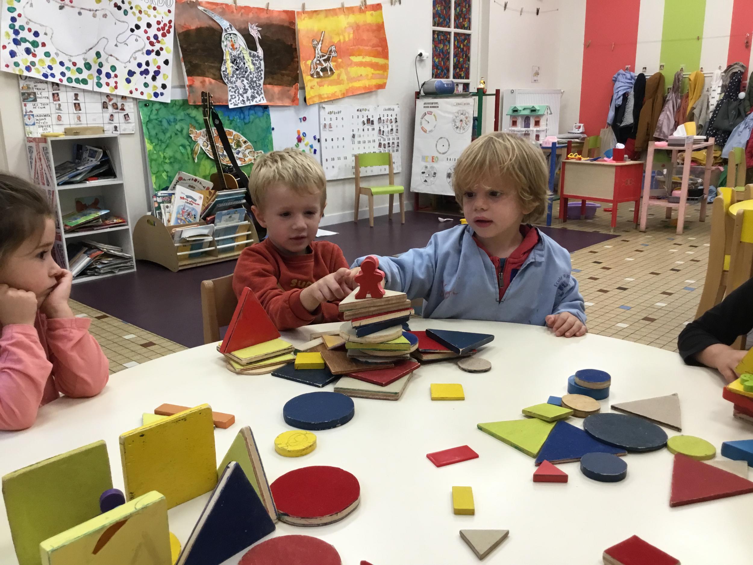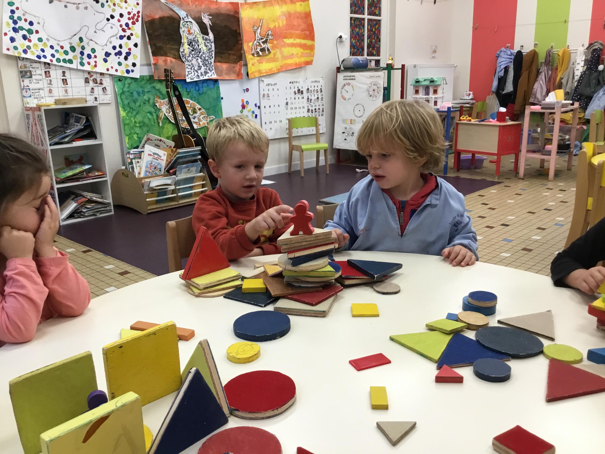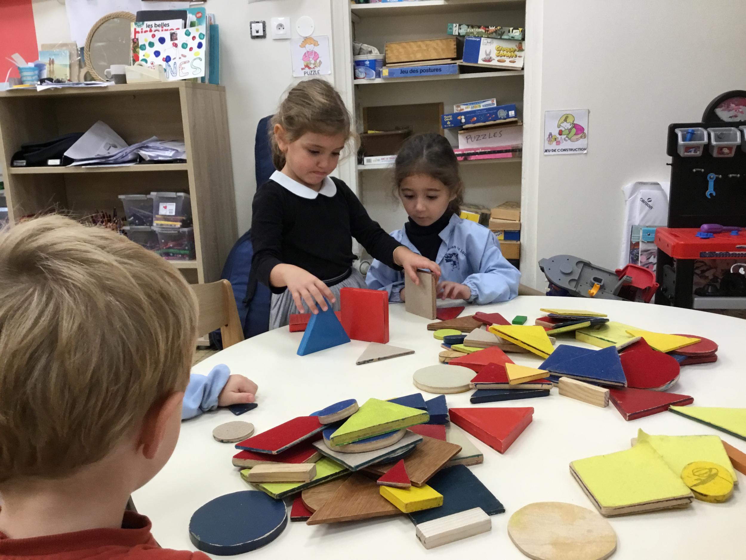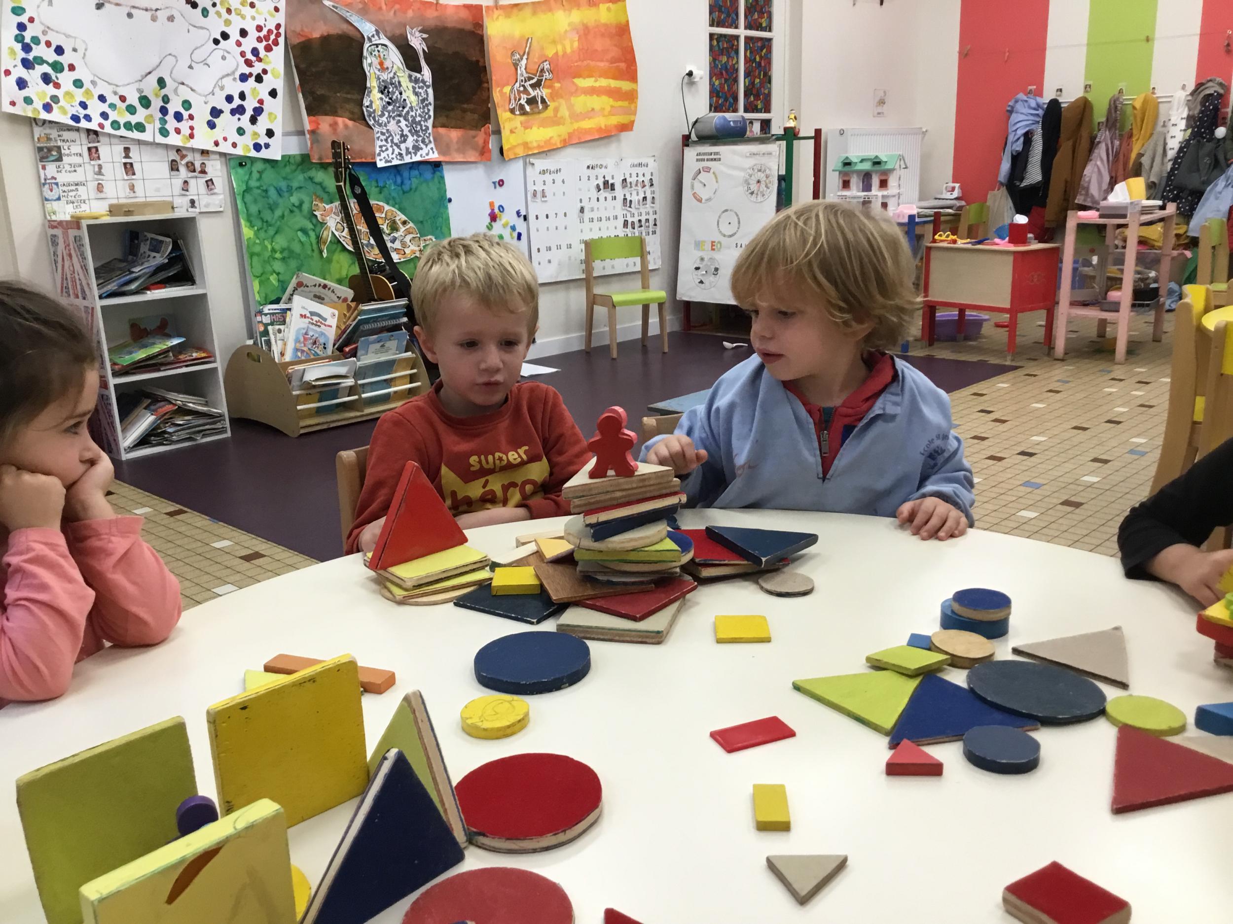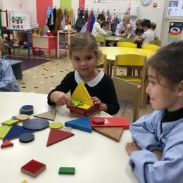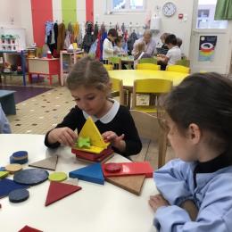 Dans cet atelier, les élèves sont par deux et doivent ensemble fabriquer un château commun. Pour cela, je leur demande de discuter pour s’organiser. Puis , une fois le château construit, à l’oral , ils doivent le présenter aux autres élèves . Pour cela , ils décrivent les différentes parties de leur château . Ils nomment ainsi les formes géométriques utilisées.