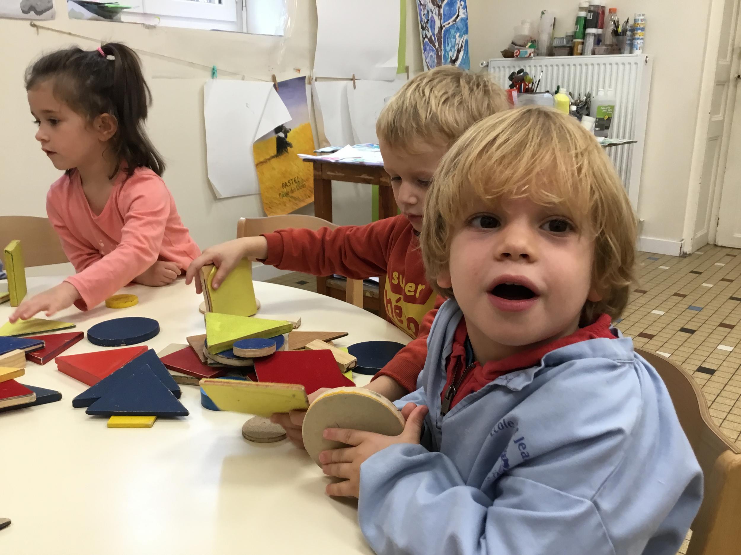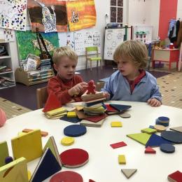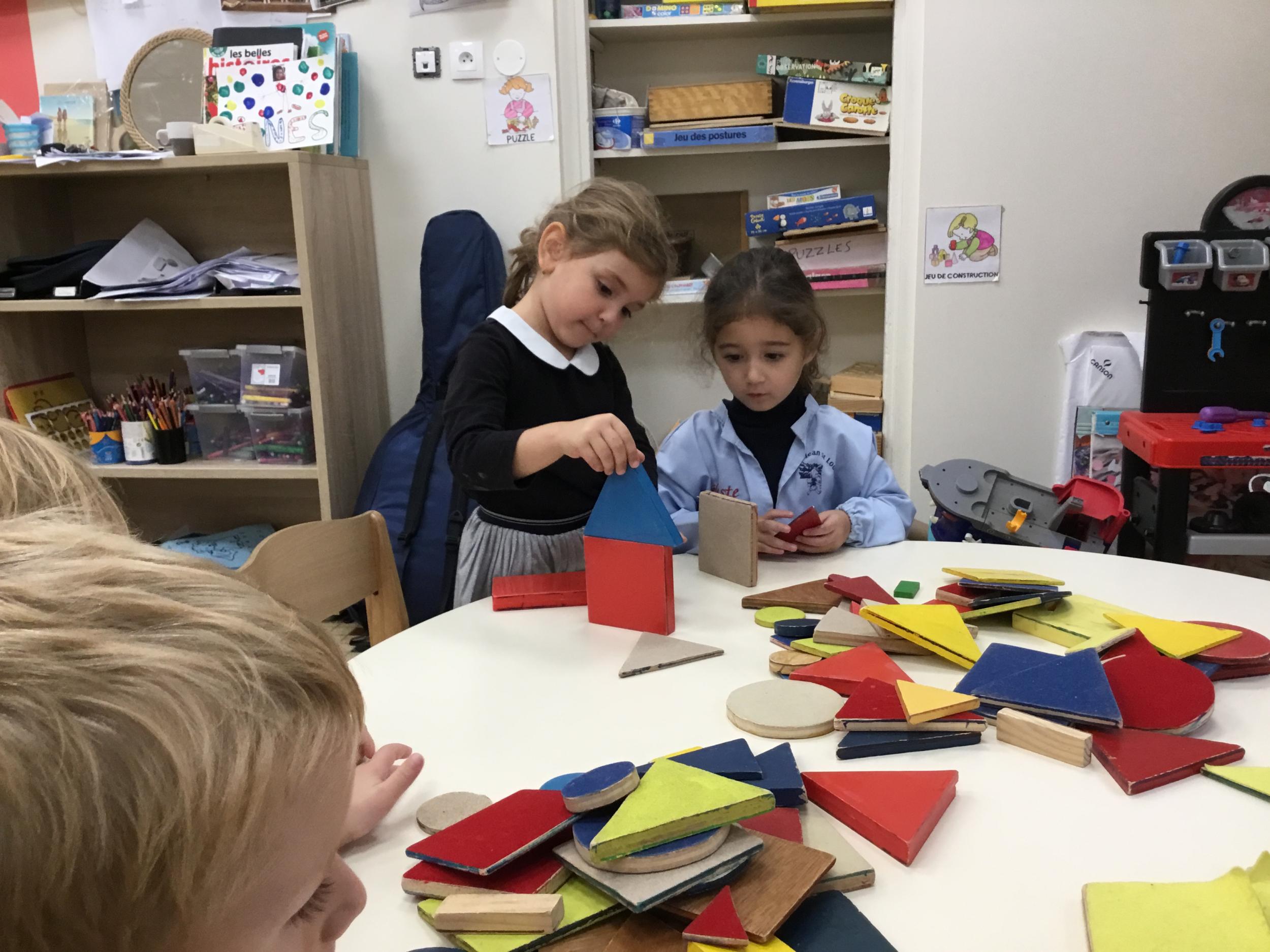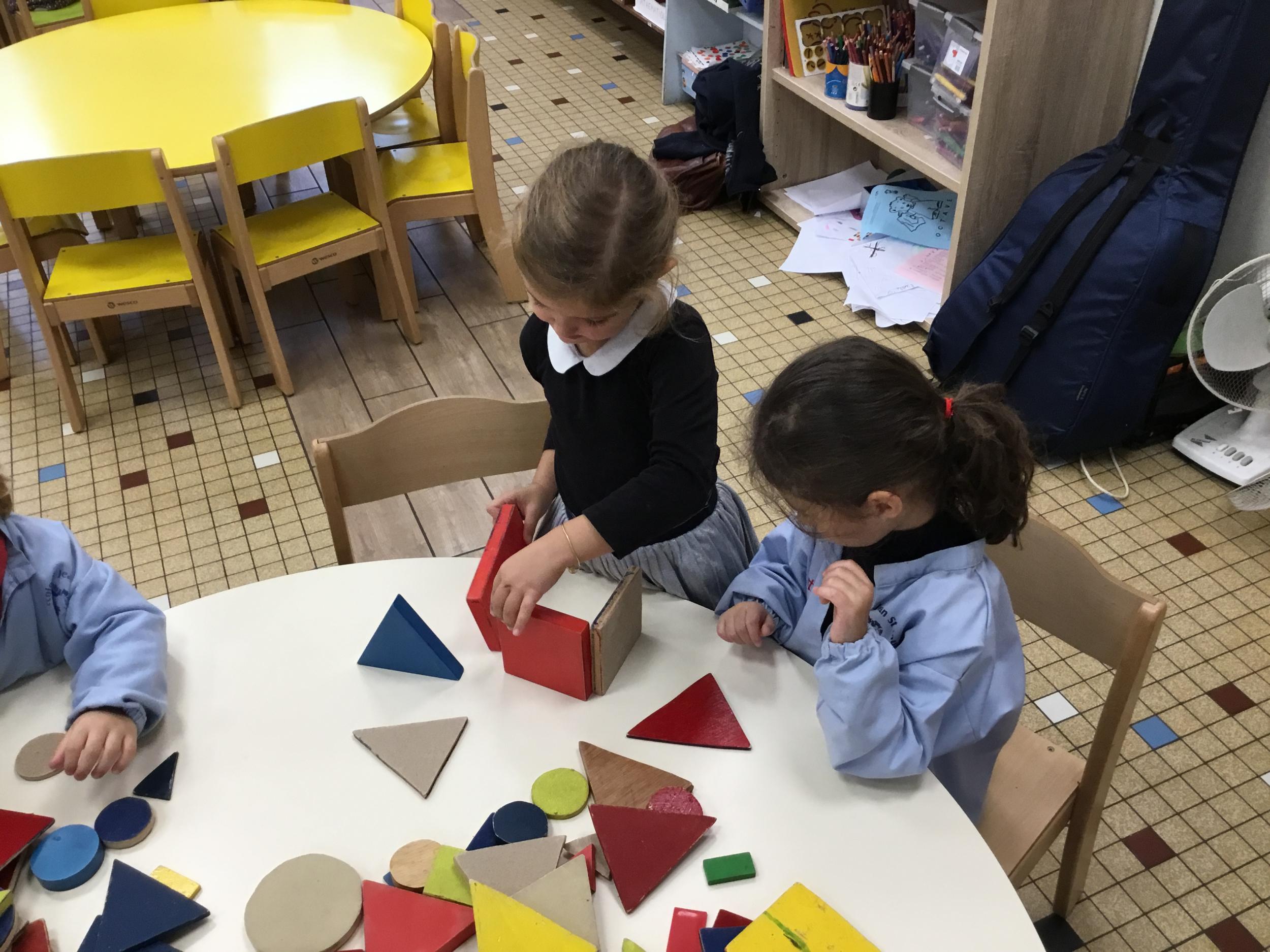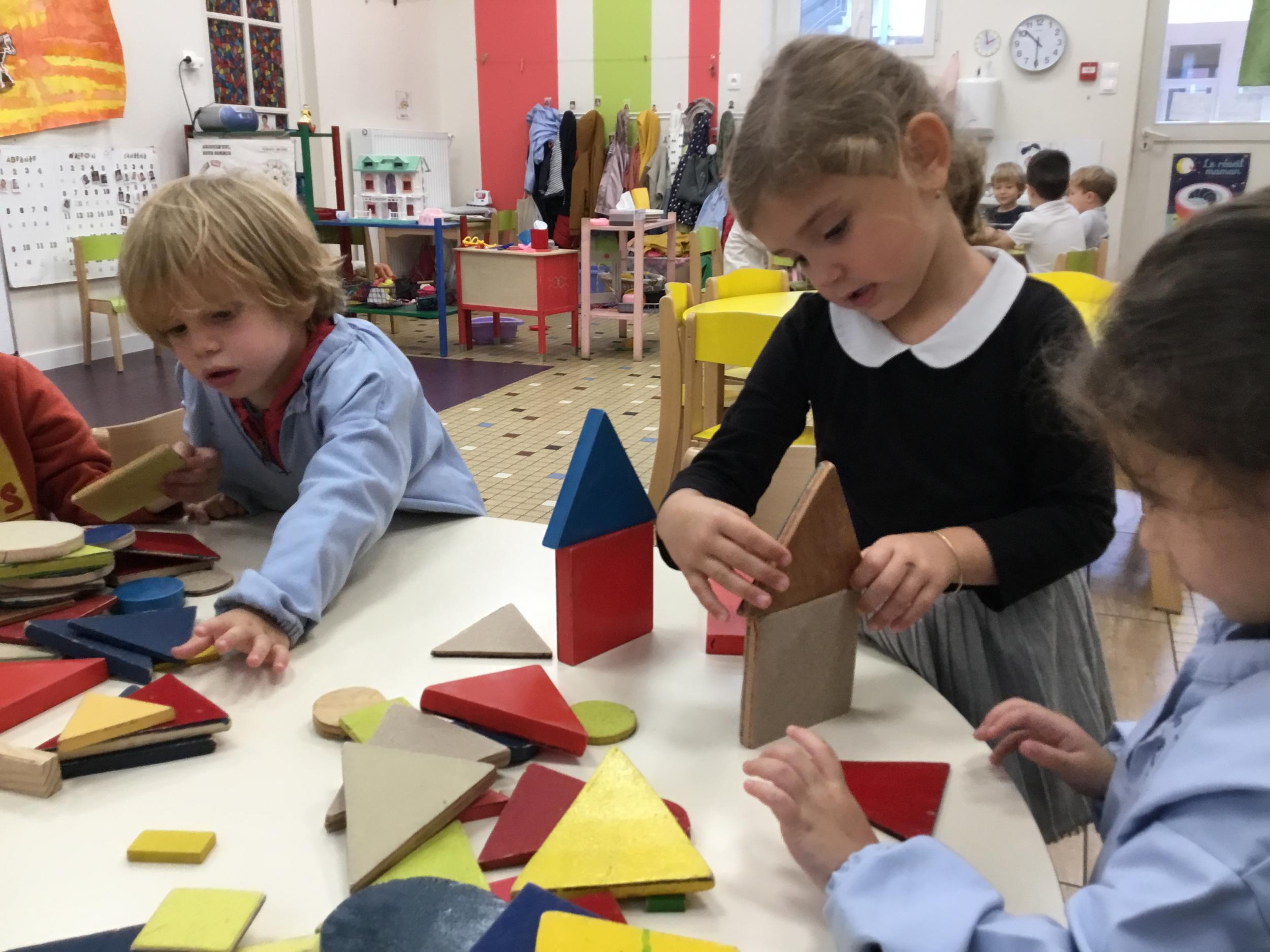 Dans cet atelier, les élèves sont par deux et doivent ensemble fabriquer un château commun. Pour cela, je leur demande de discuter pour s’organiser. Puis , une fois le château construit, à l’oral , ils doivent le présenter aux autres élèves . Pour cela , ils décrivent les différentes parties de leur château . Ils nomment ainsi les formes géométriques utilisées.