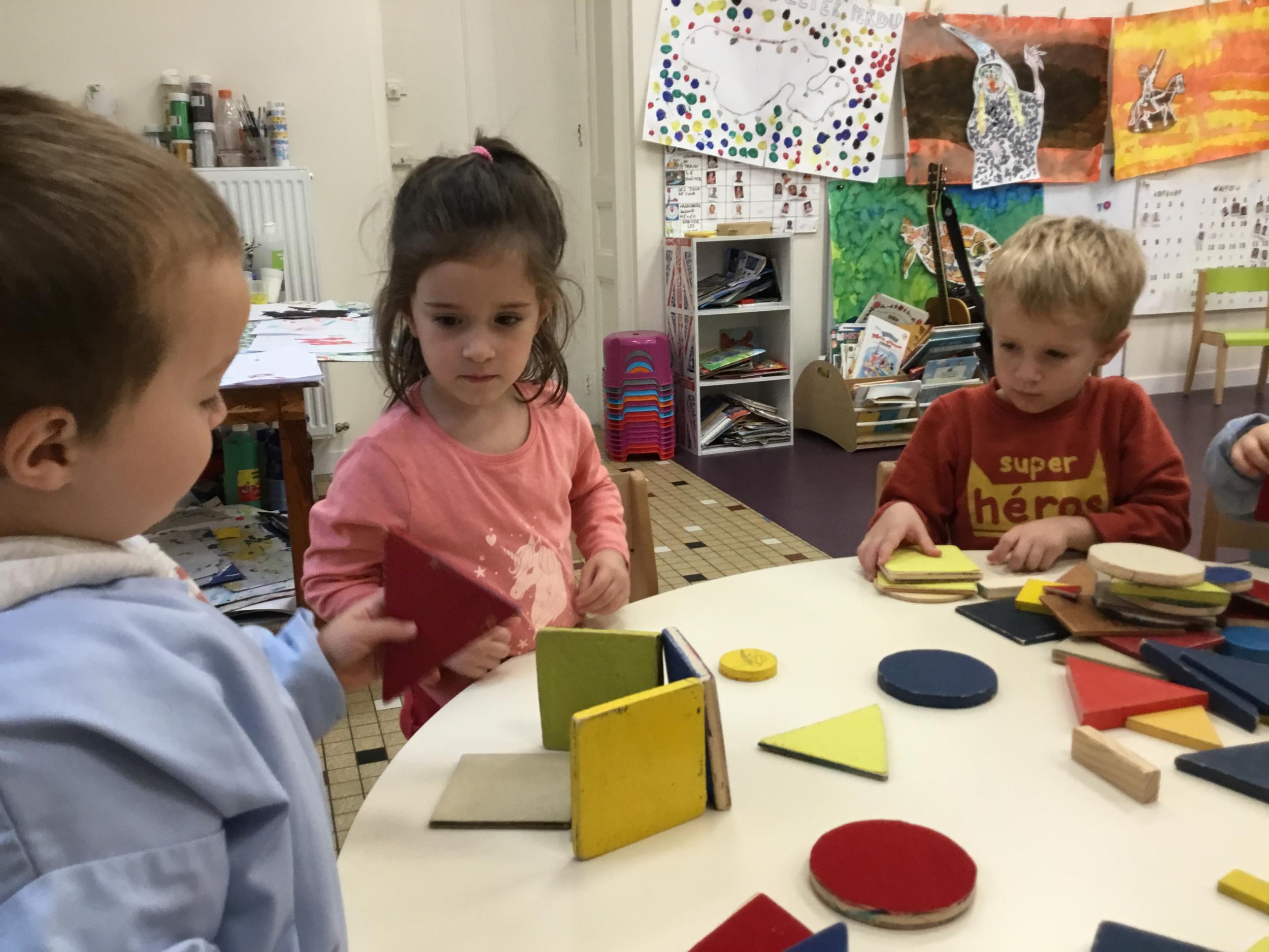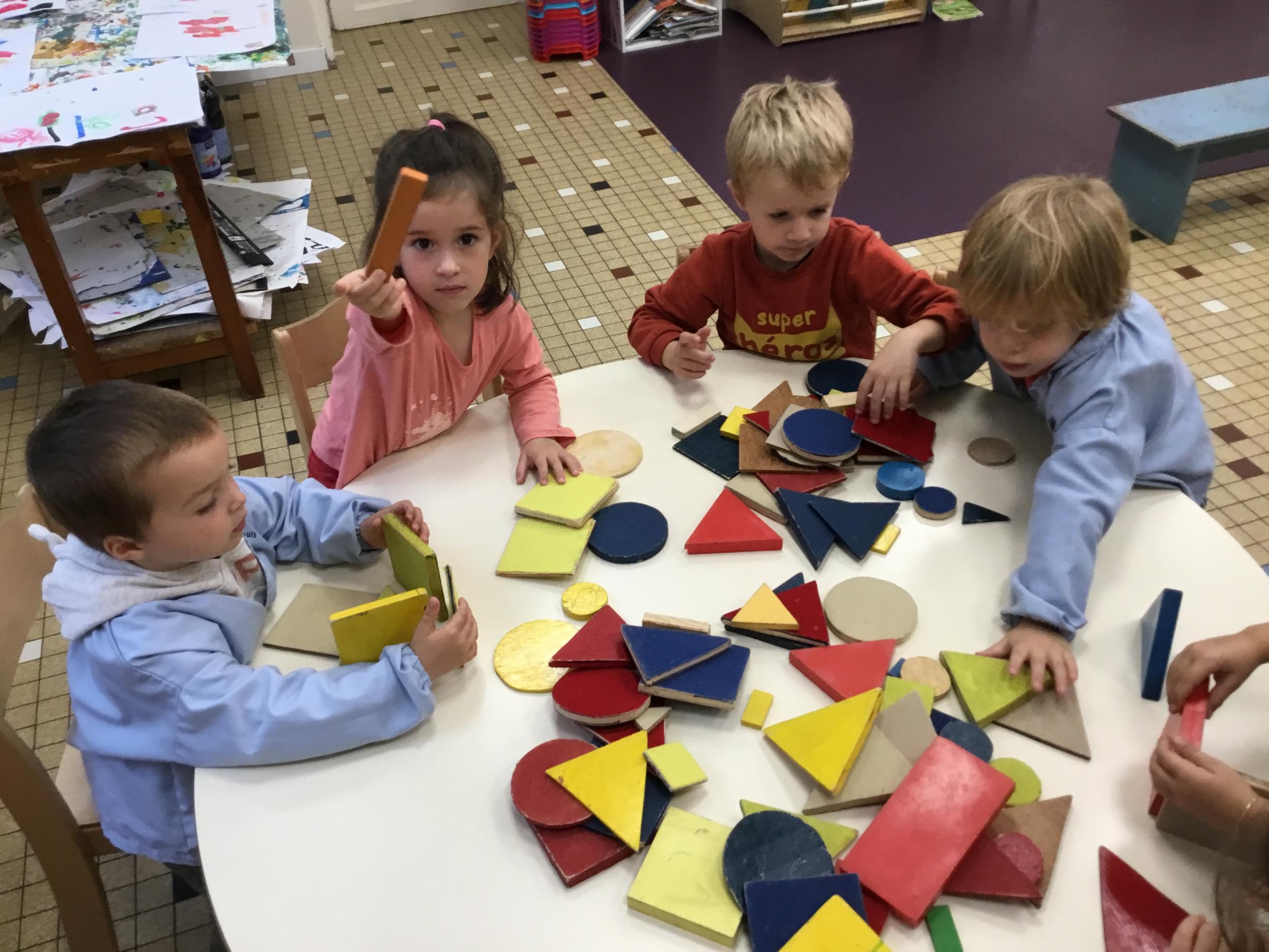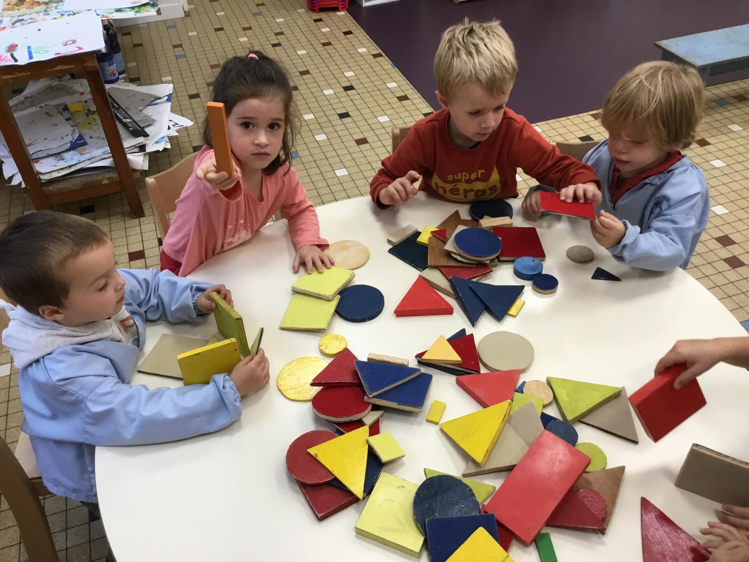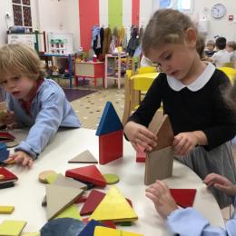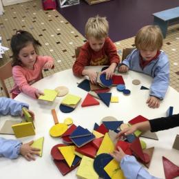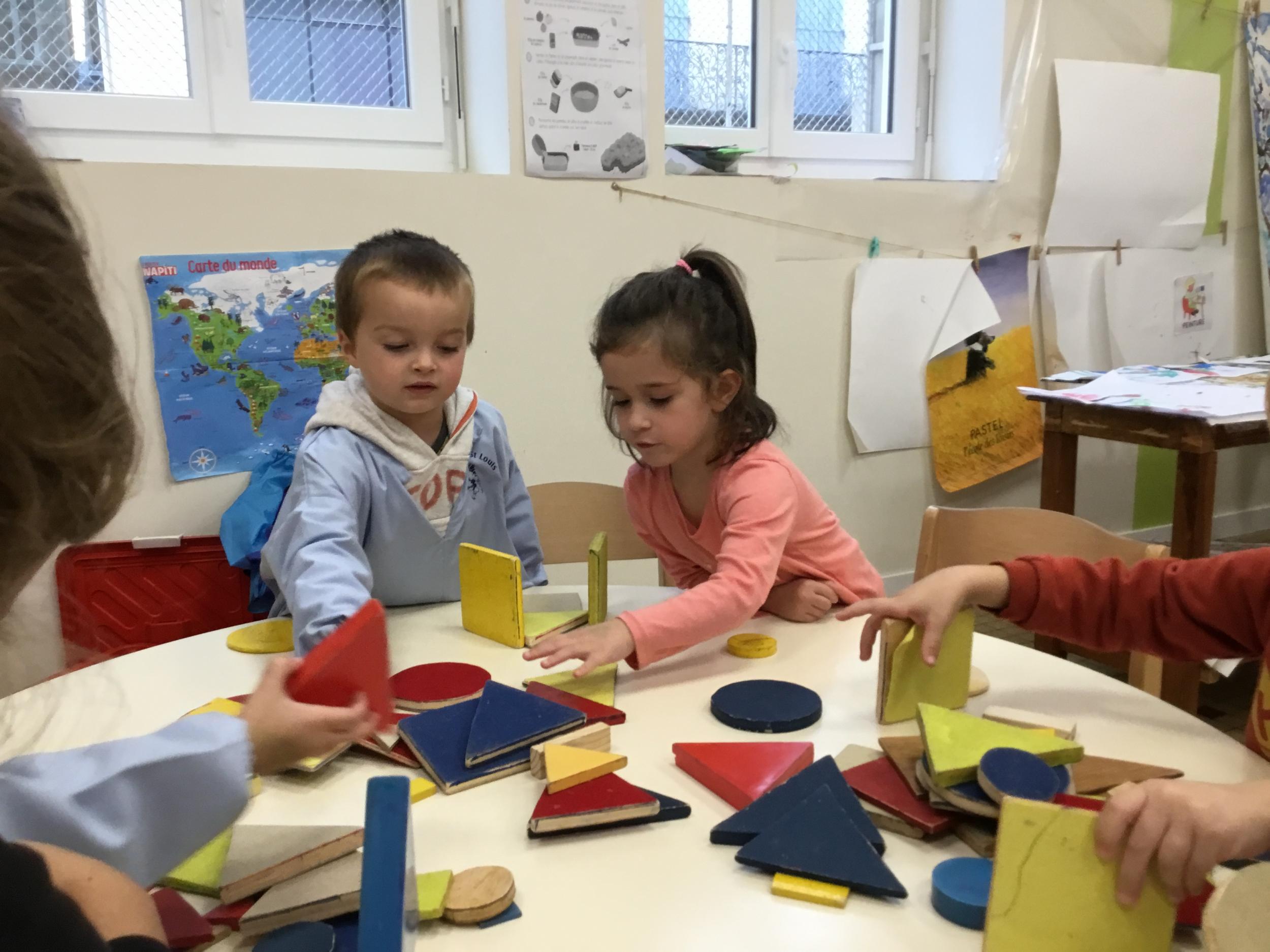 Dans cet atelier, les élèves sont par deux et doivent ensemble fabriquer un château commun. Pour cela, je leur demande de discuter pour s’organiser. Puis , une fois le château construit, à l’oral , ils doivent le présenter aux autres élèves . Pour cela , ils décrivent les différentes parties de leur château . Ils nomment ainsi les formes géométriques utilisées.