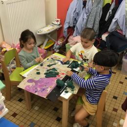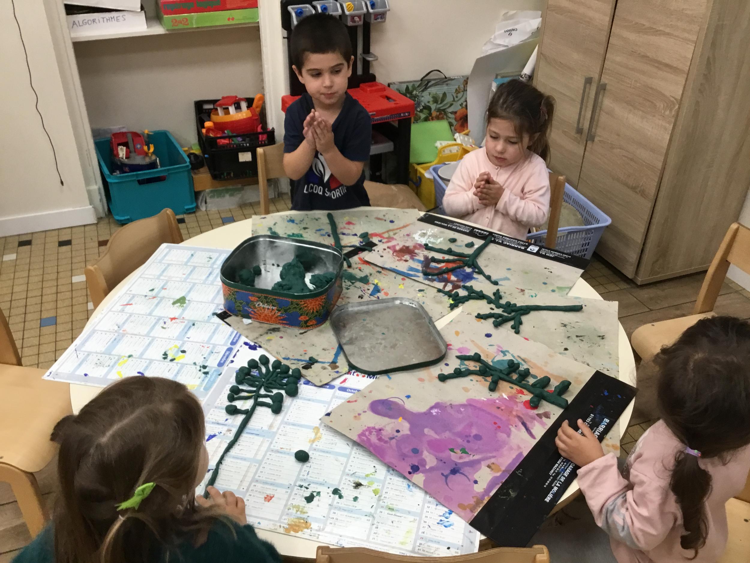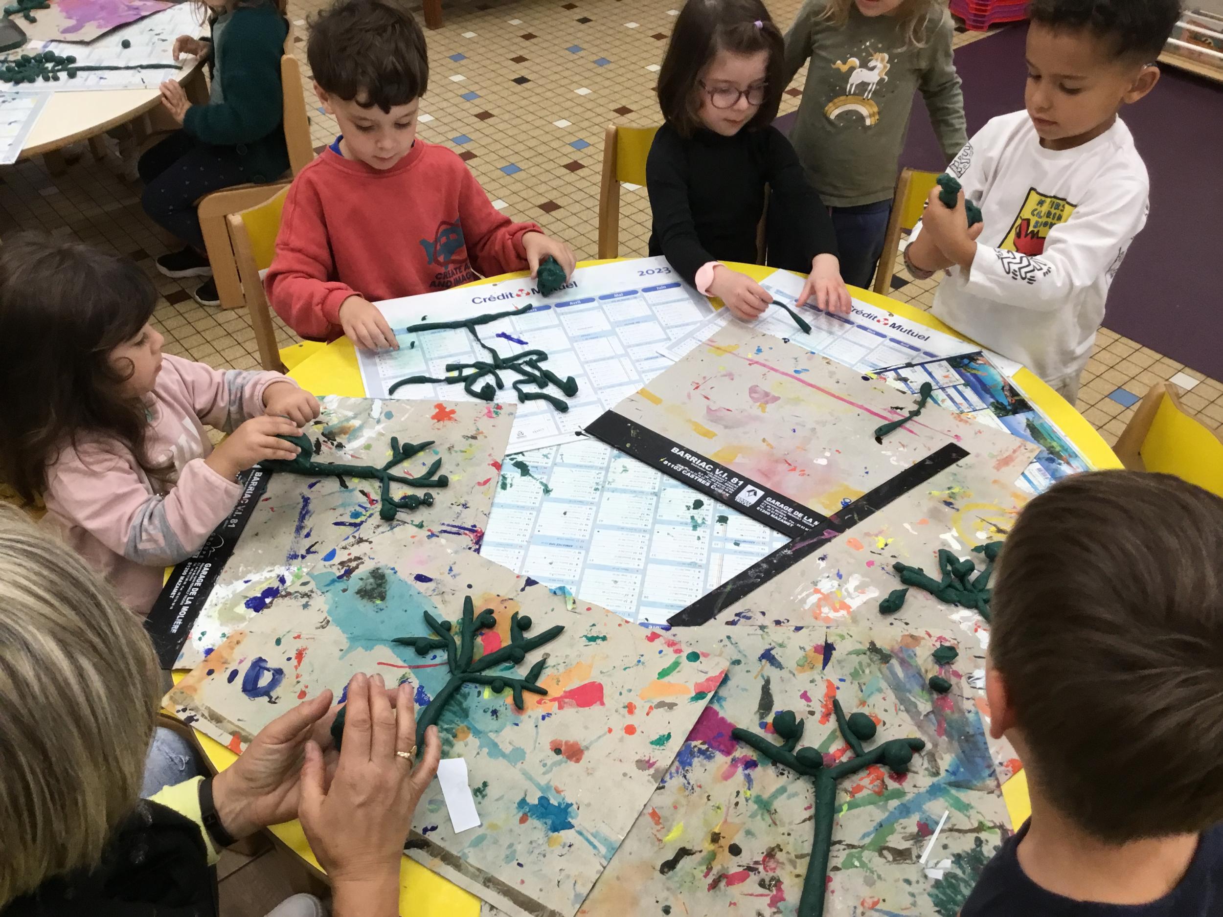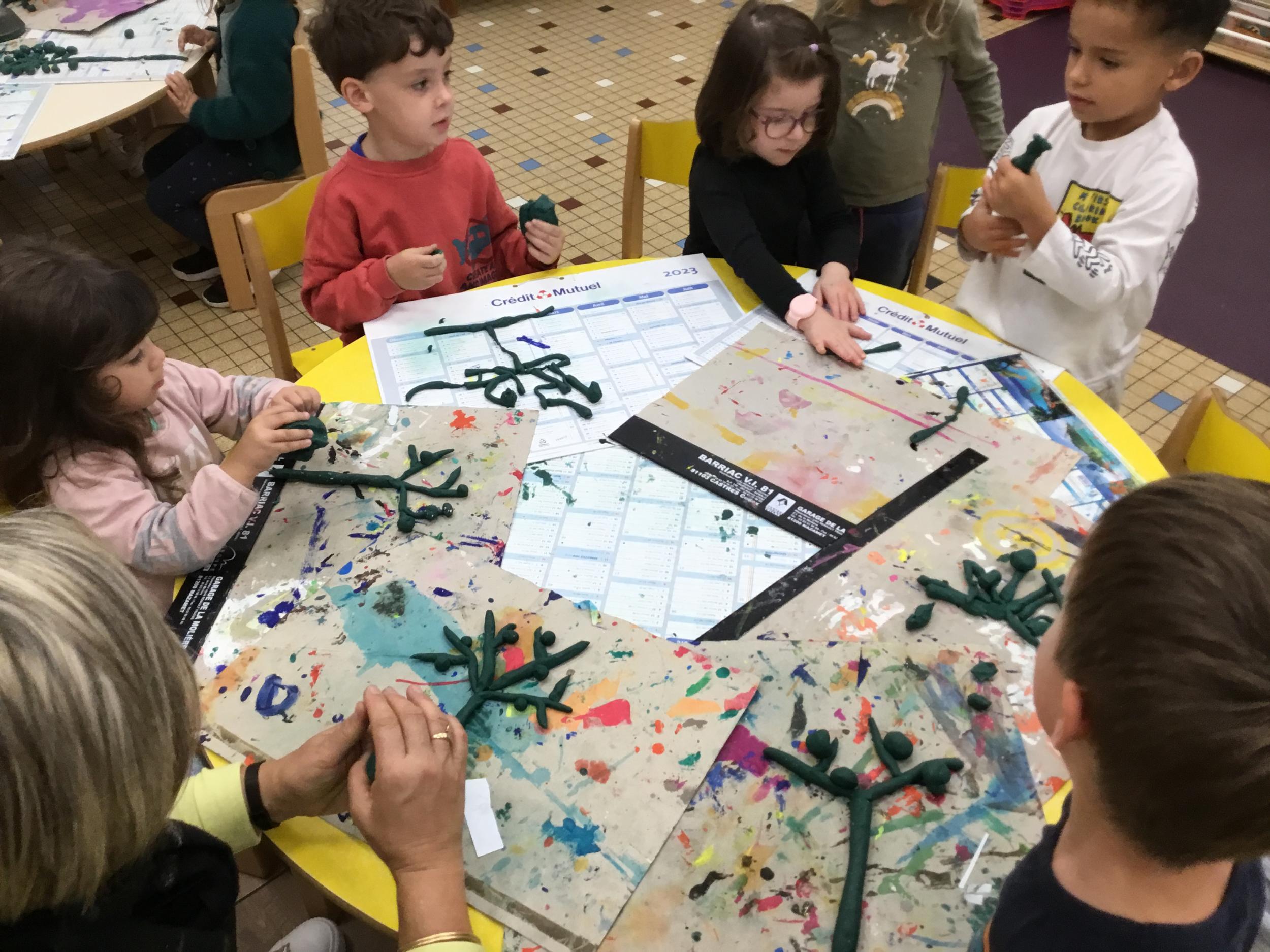 Petite et moyenne section 04/10/2024 Les élèves de MS ont fabriqué les pommiers de Montdragon en pâte à modeler.