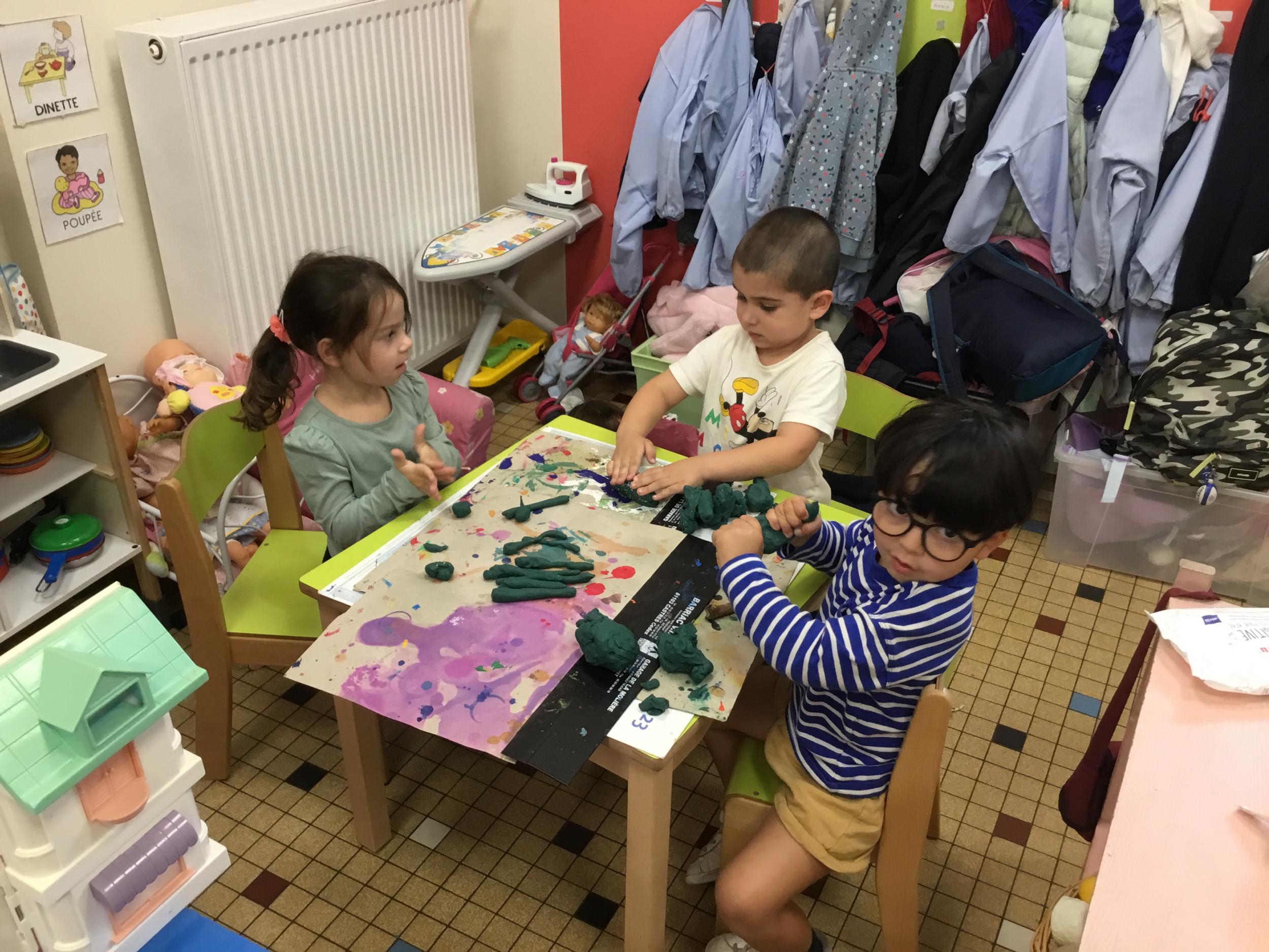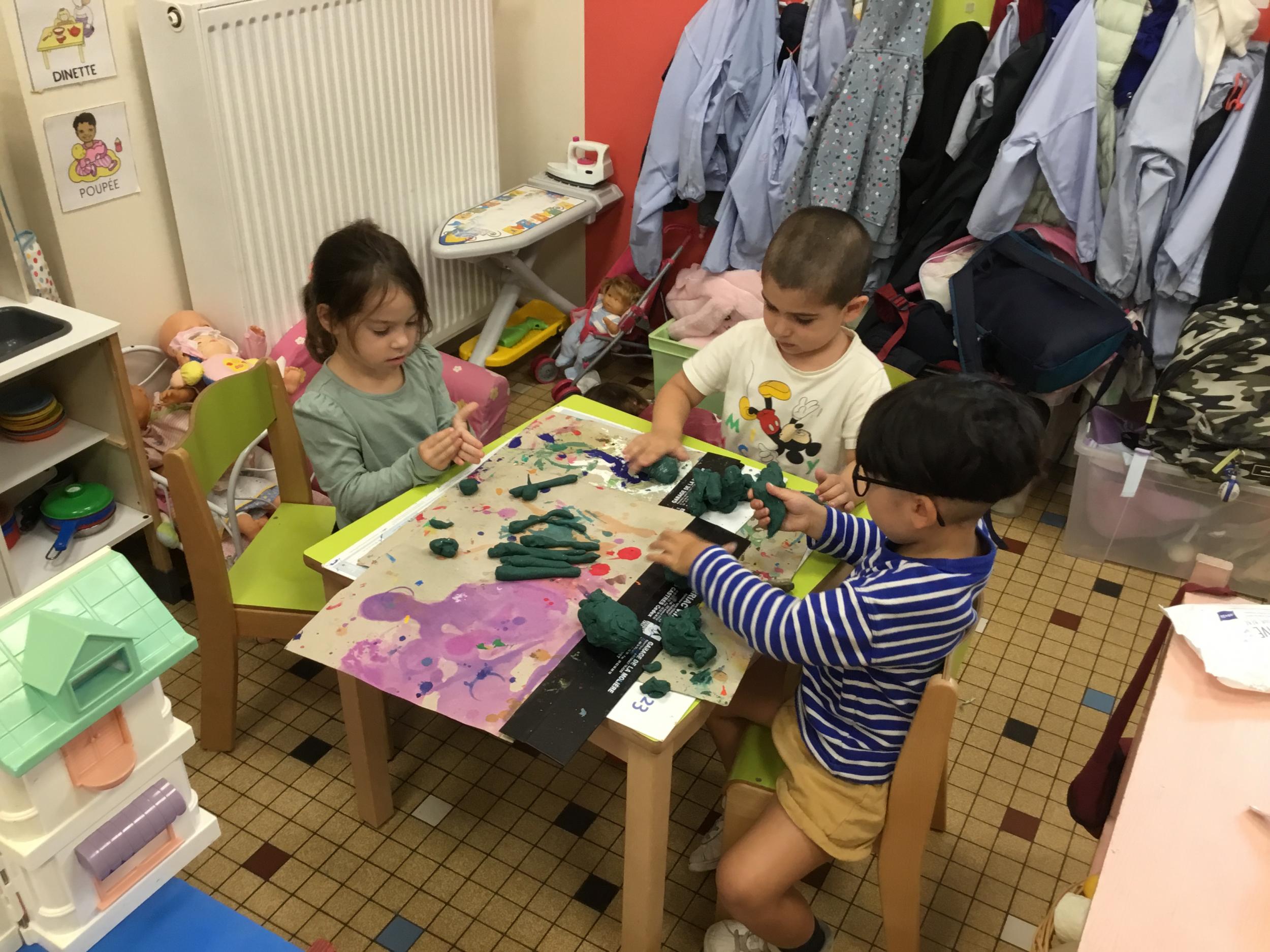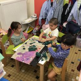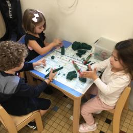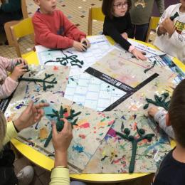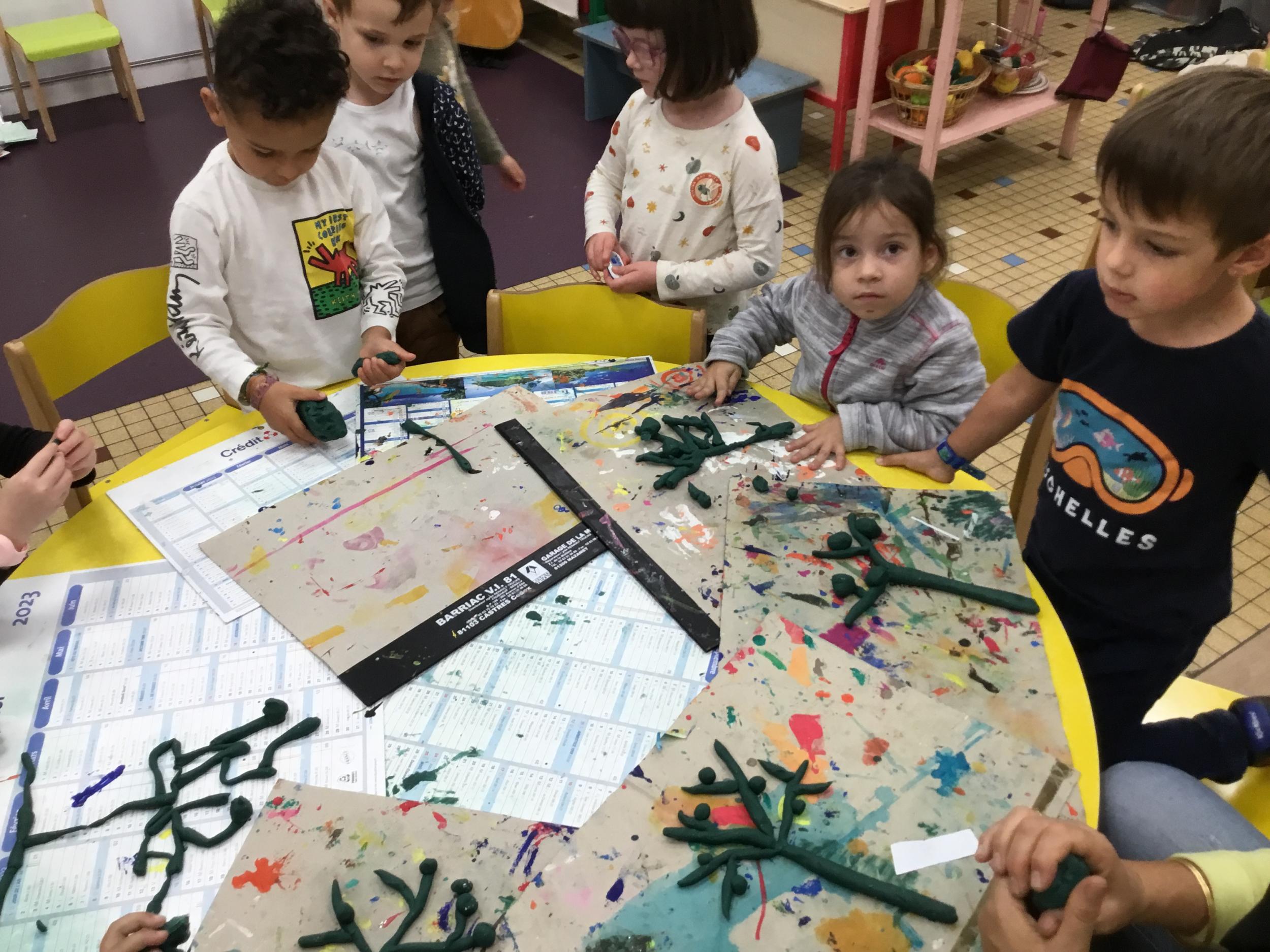 Petite et moyenne section 04/10/2024 Les élèves de MS ont fabriqué les pommiers de Montdragon en pâte à modeler.