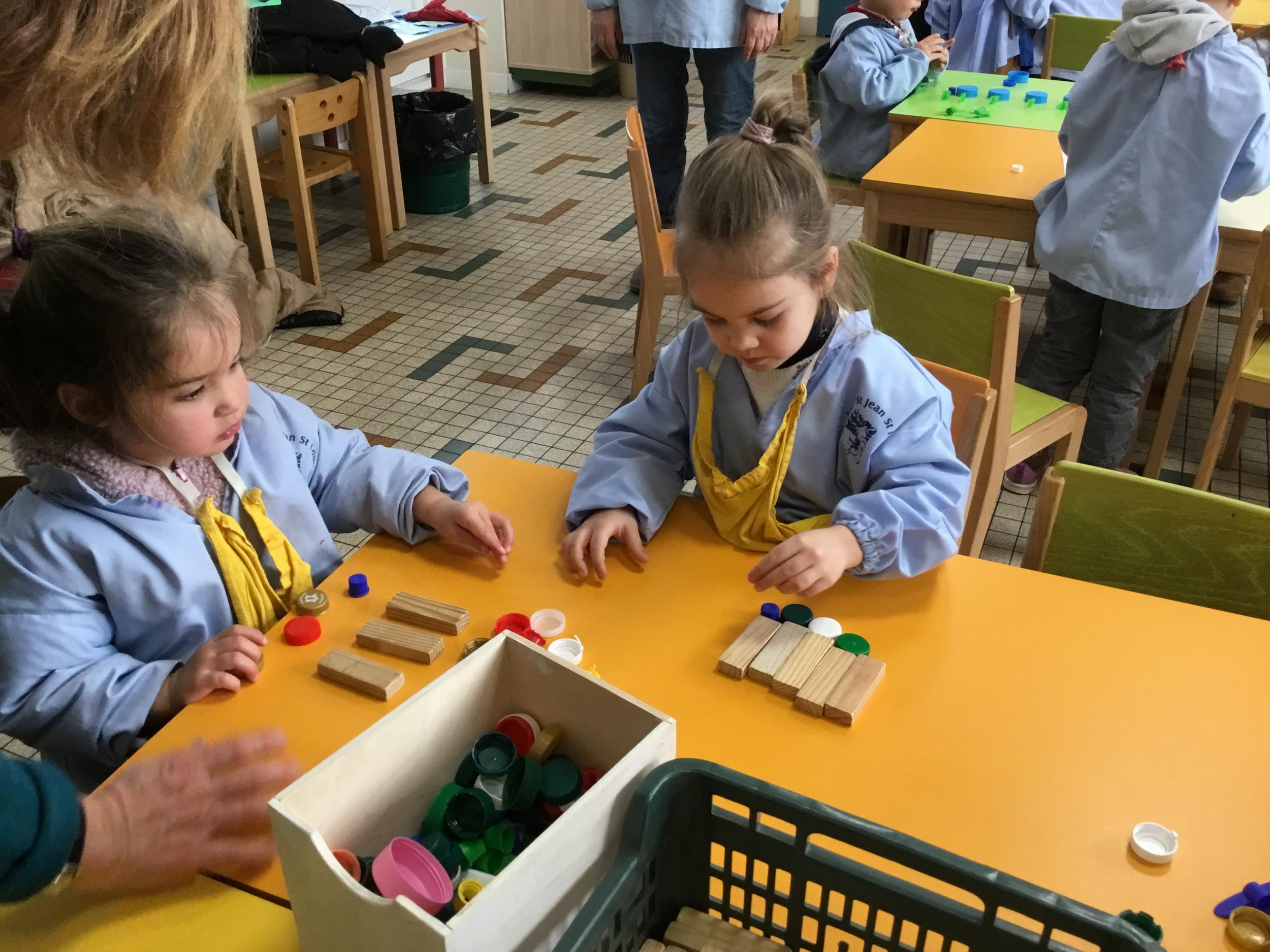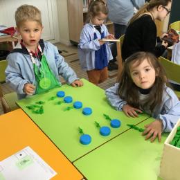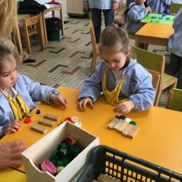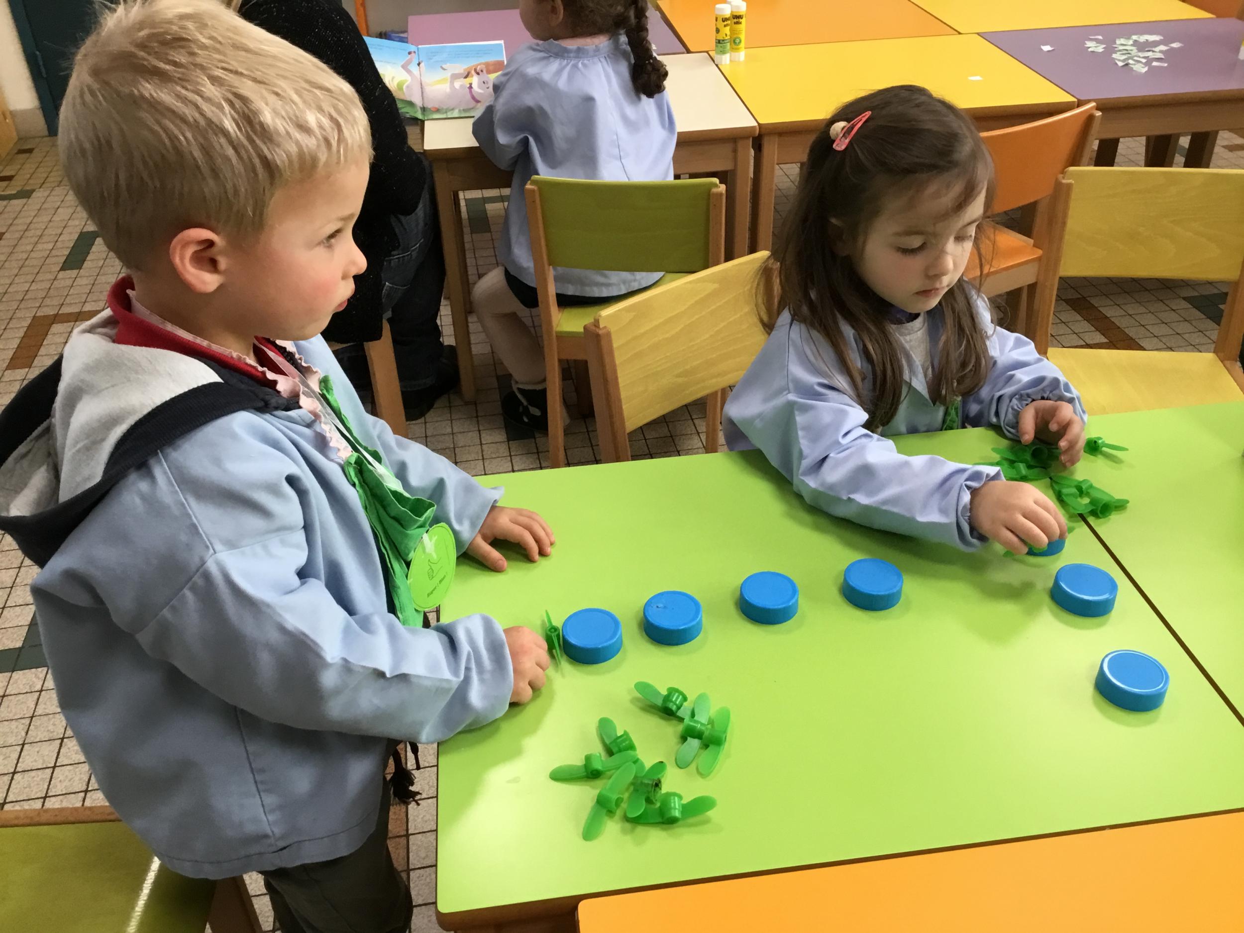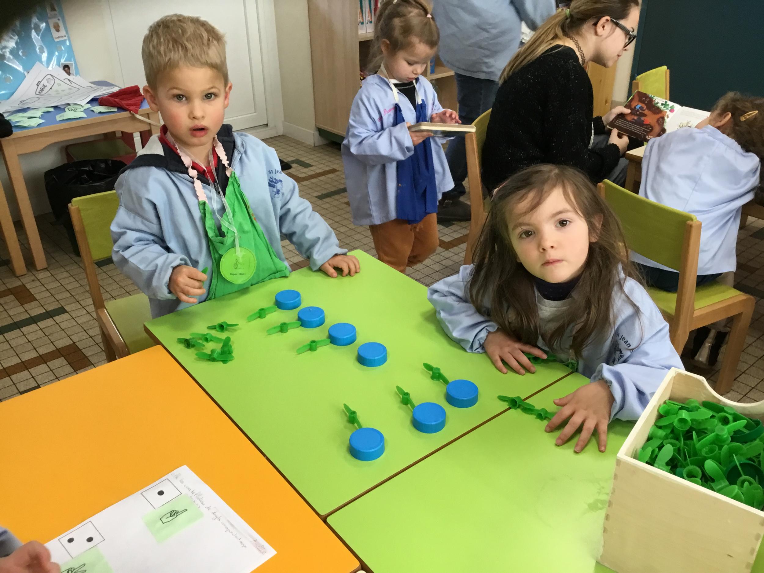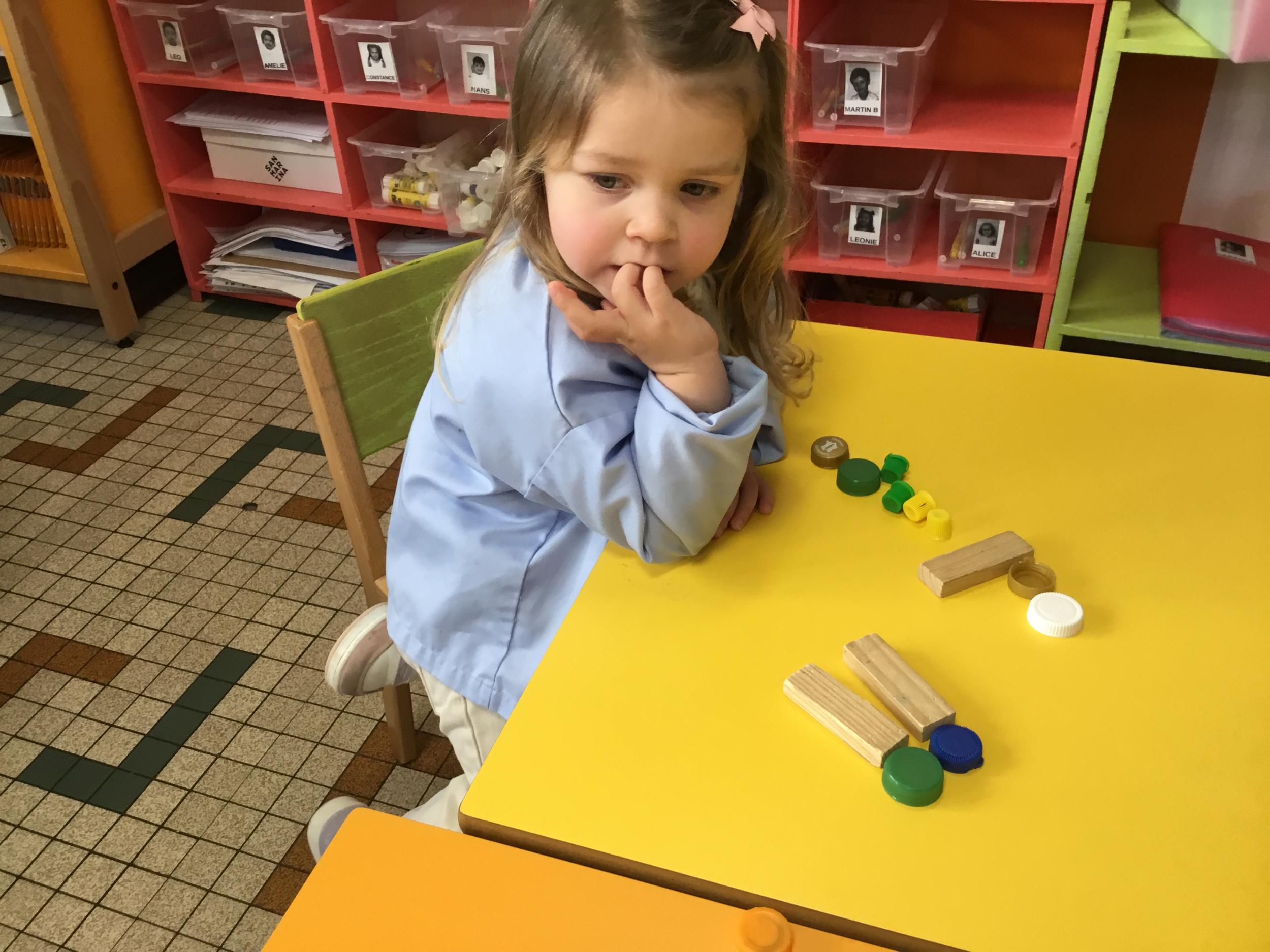 Nous avons travaillé à construire une collection équivalente à une autre collection. Puis nous avons testé nos connaissances pour rapprocher une constellation de doigts et une constellation de points.