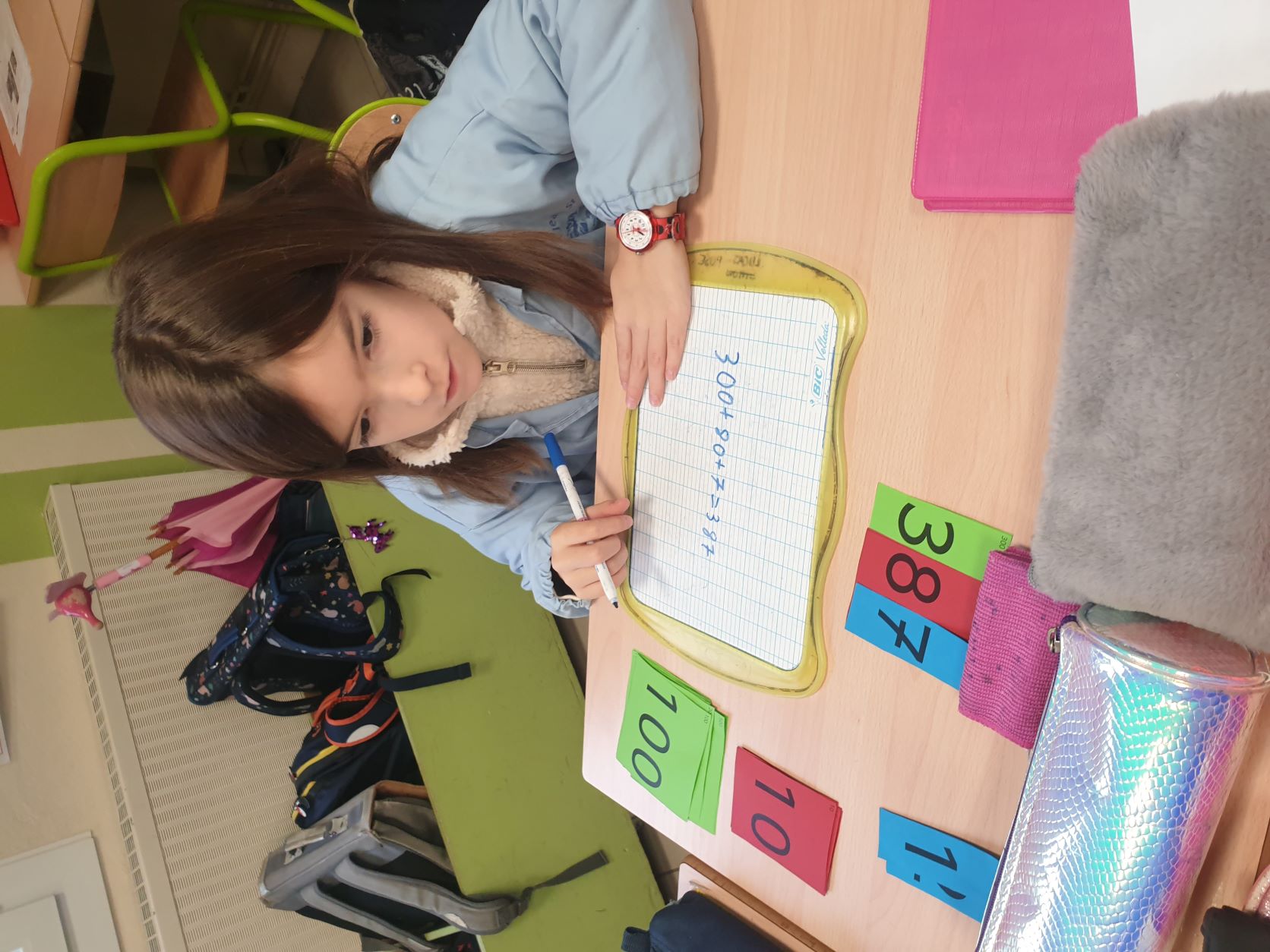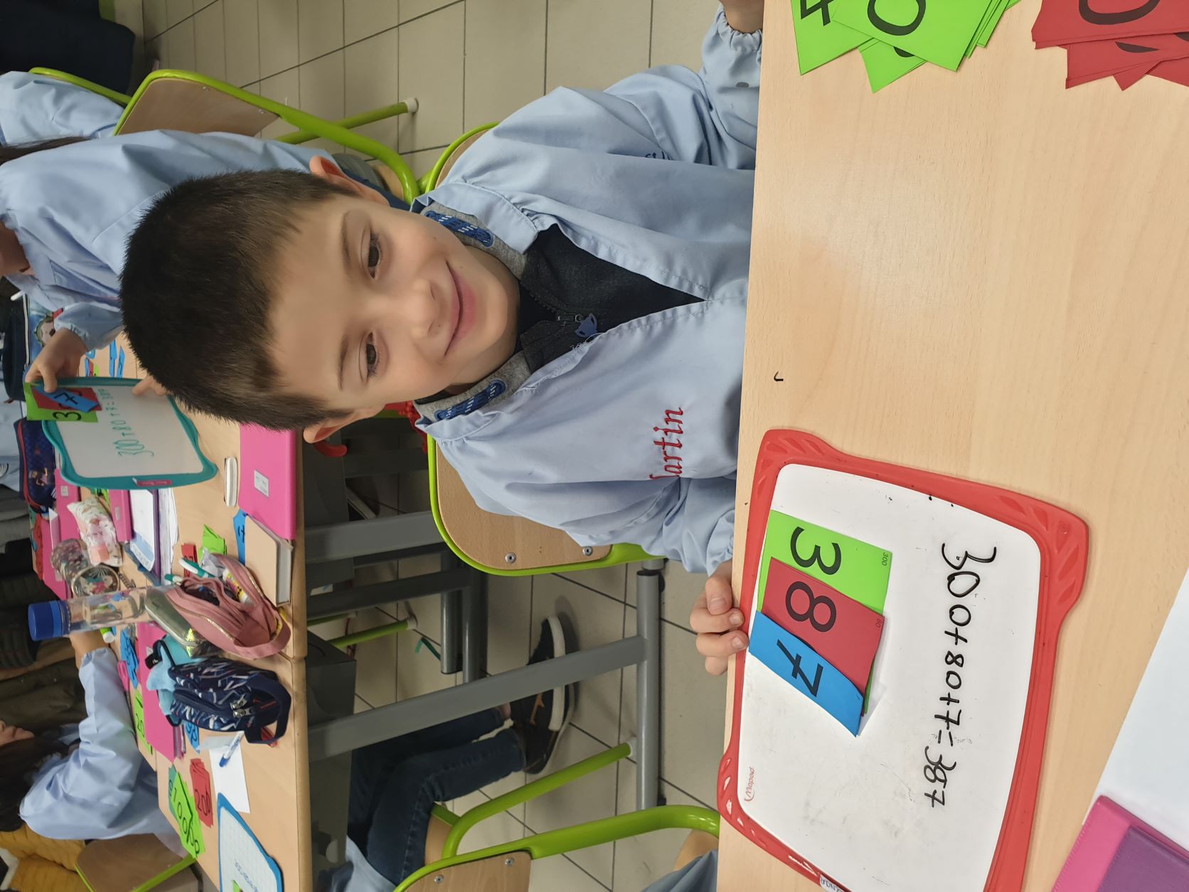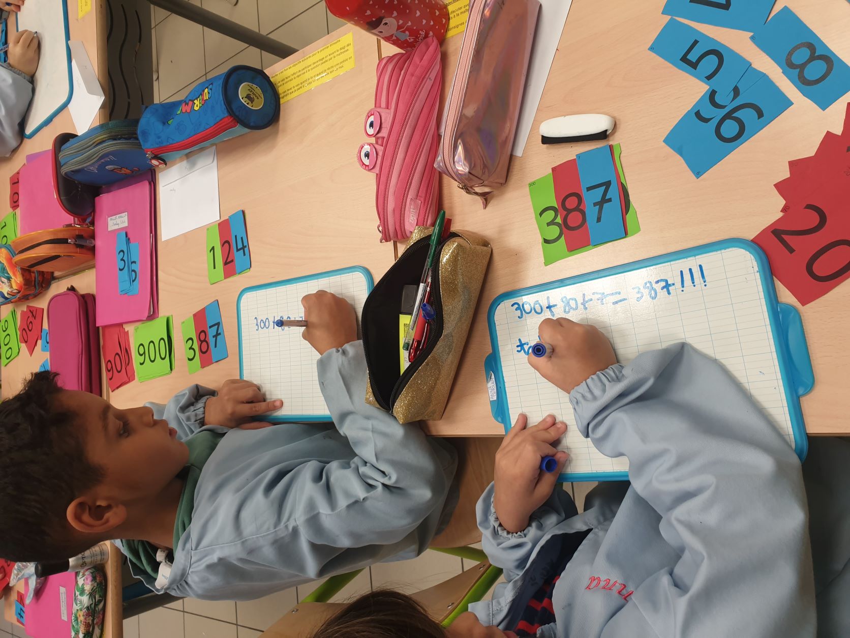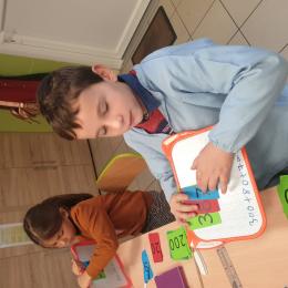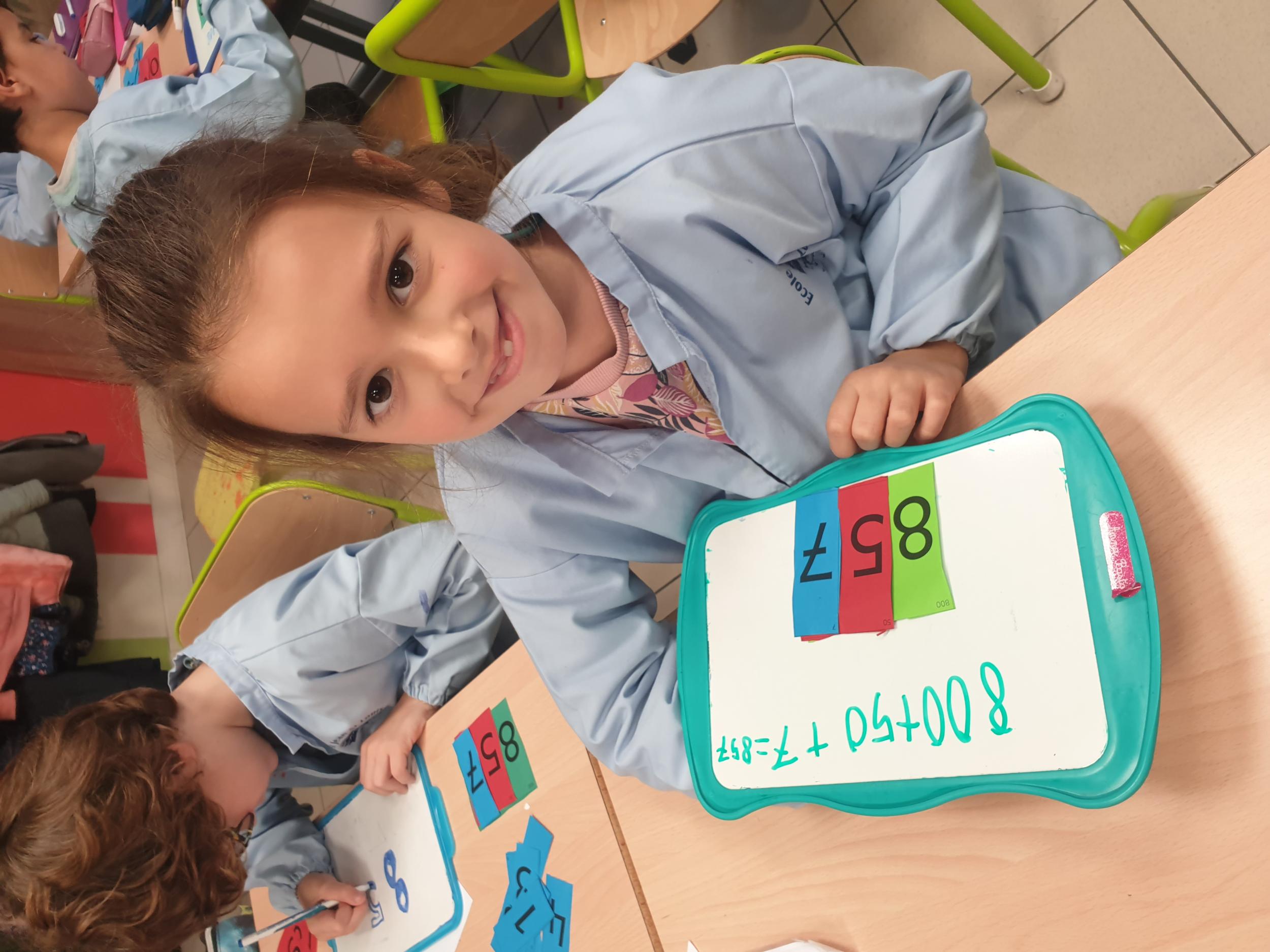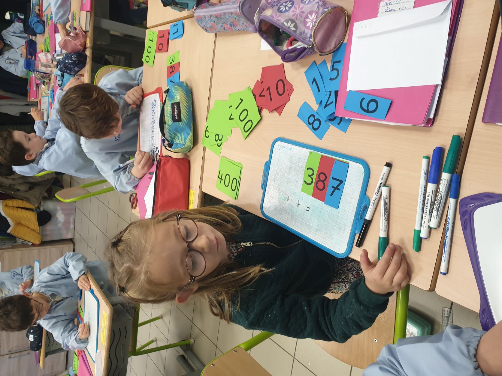 Cela permet aux élèves qui sont un peu en difficultés en numération de pouvoir décomposer et recomposer les nombres en jouant et de comprendre davantage le système décimal. Tous apprennent en jouant, en prenant du plaisir et en souriant. Ce qui est très intéressant c'est que la maîtresse de CE2 utilise également ce matériel, les élèves de CE1 sauront déjà l'utiliser l'année prochaine mais évidemment avec davantage d'étiquettes pour travailler sur des nombres plus grands.