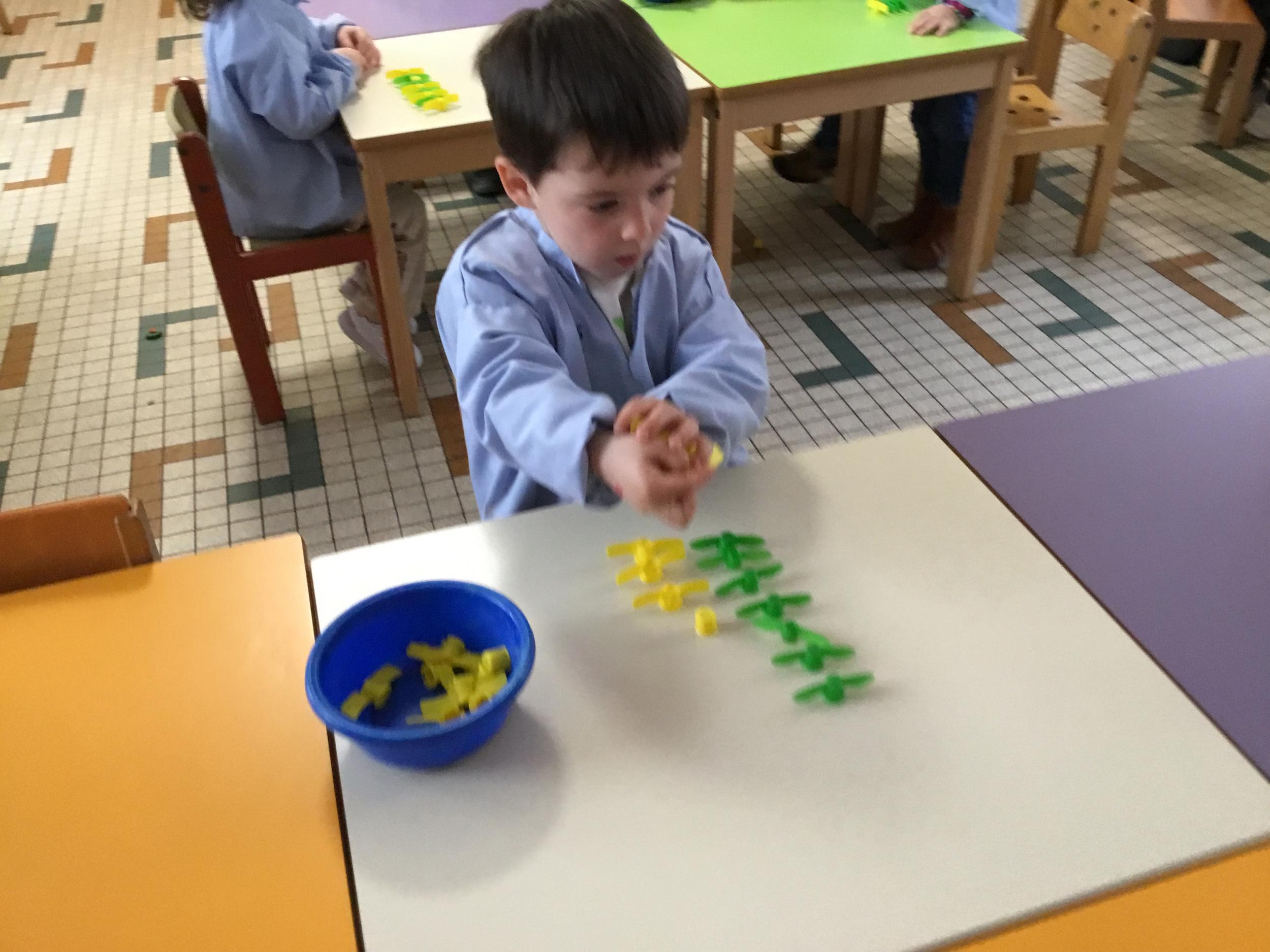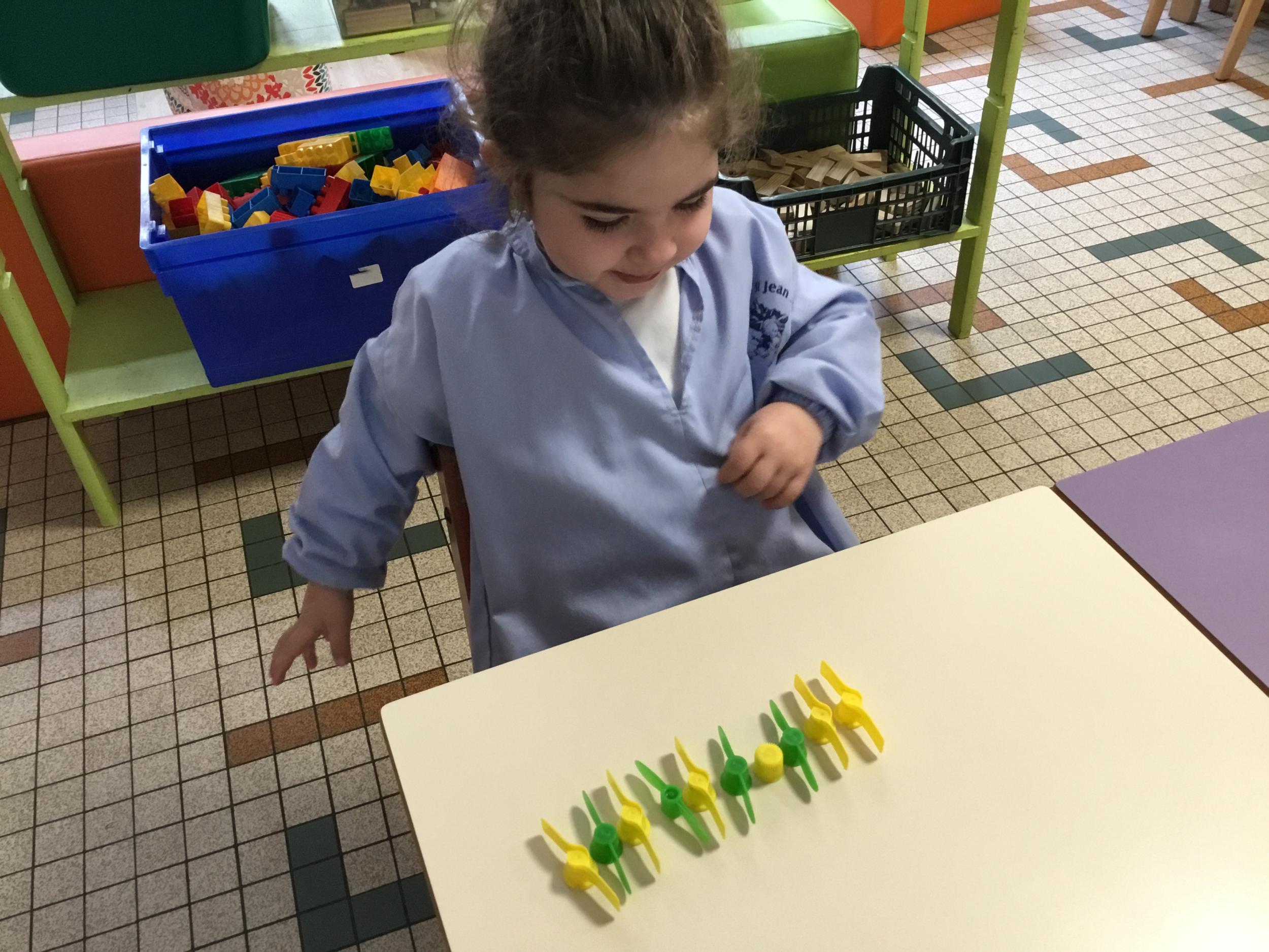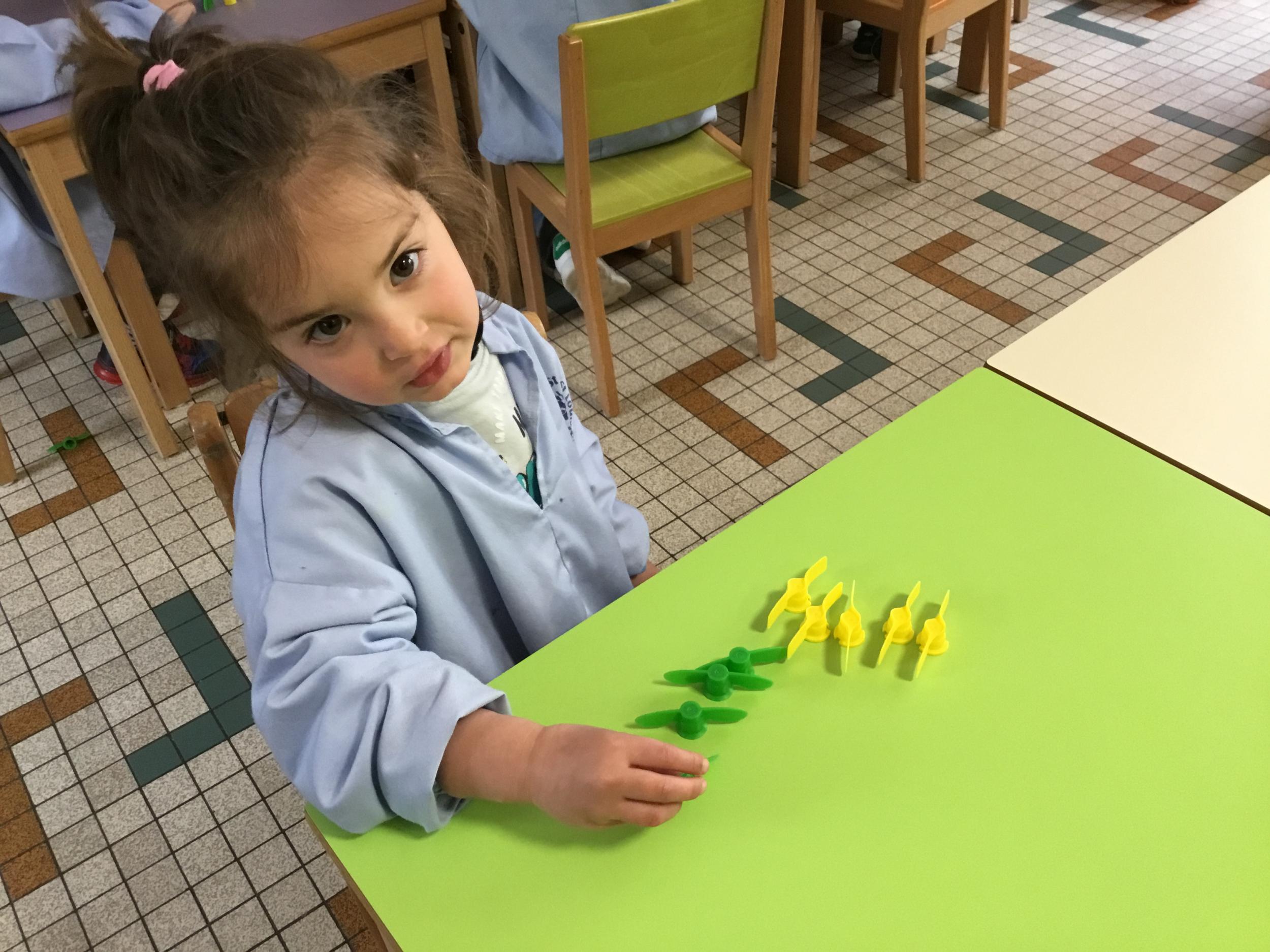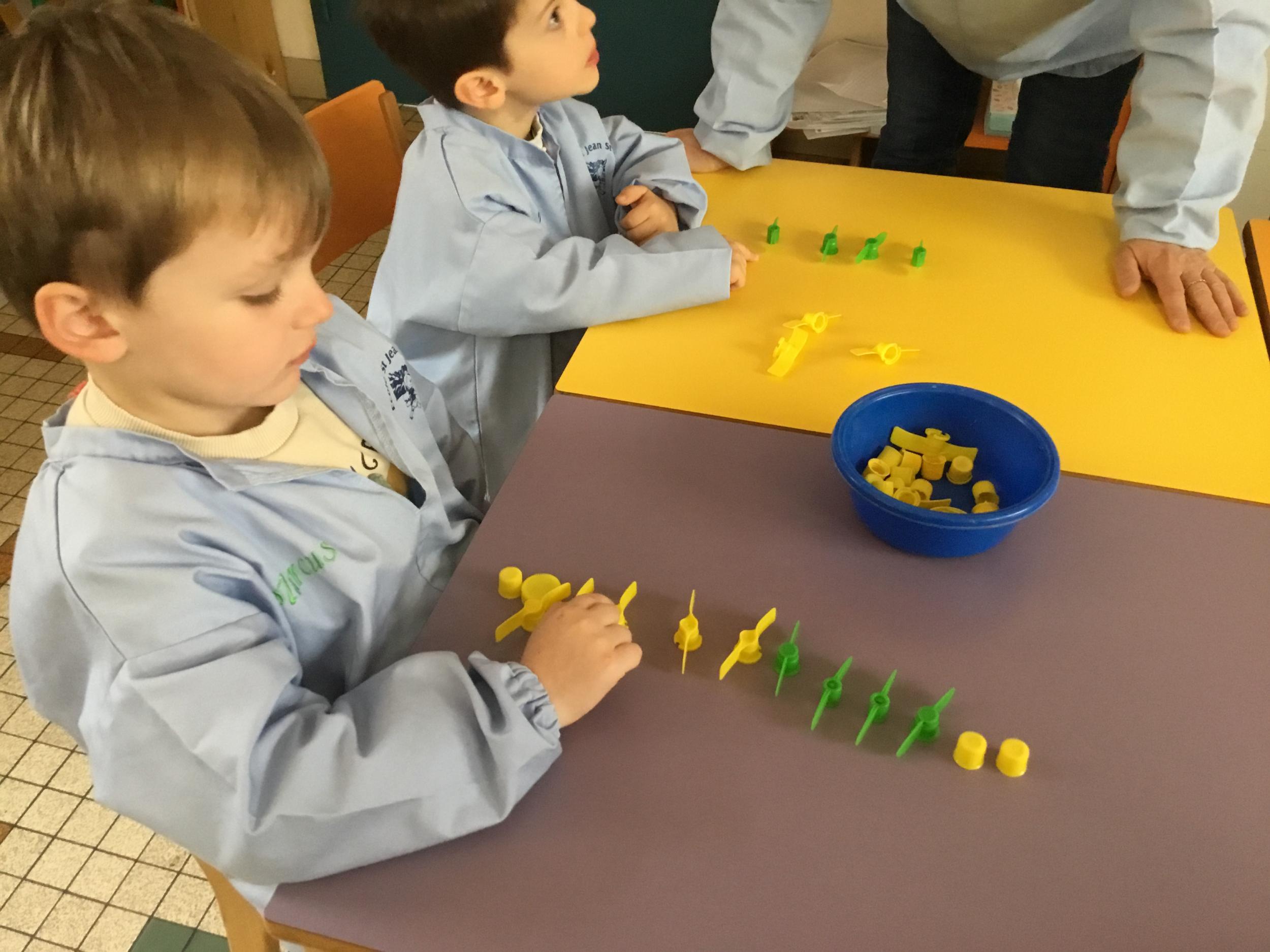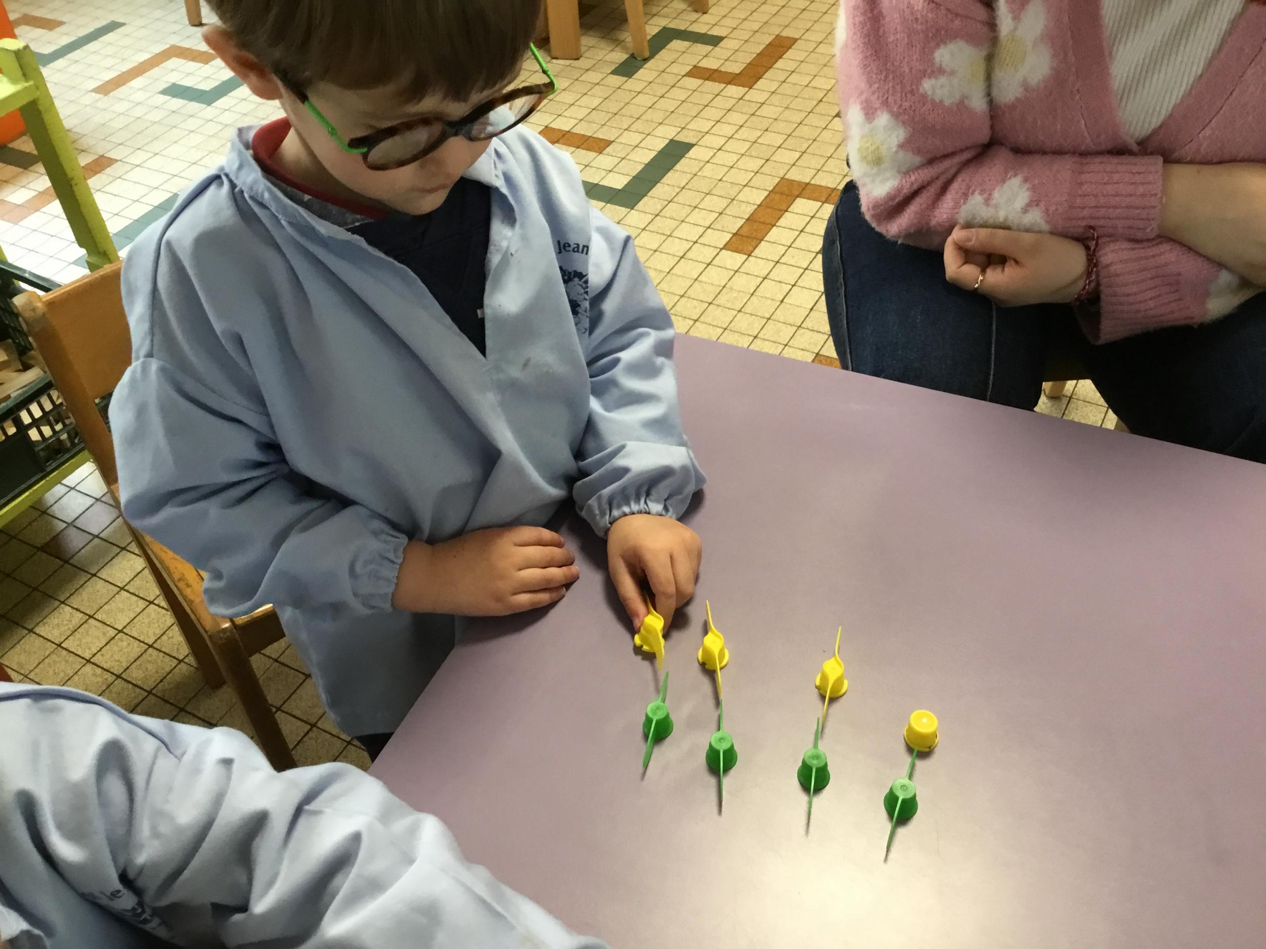 Les élèves devaient choisir autant de bouchons jaunes que de bouchons verts . La maîtresse observait leur stratégie et adaptait le nombre de bouchons au niveau de maîtrise de la compétence .