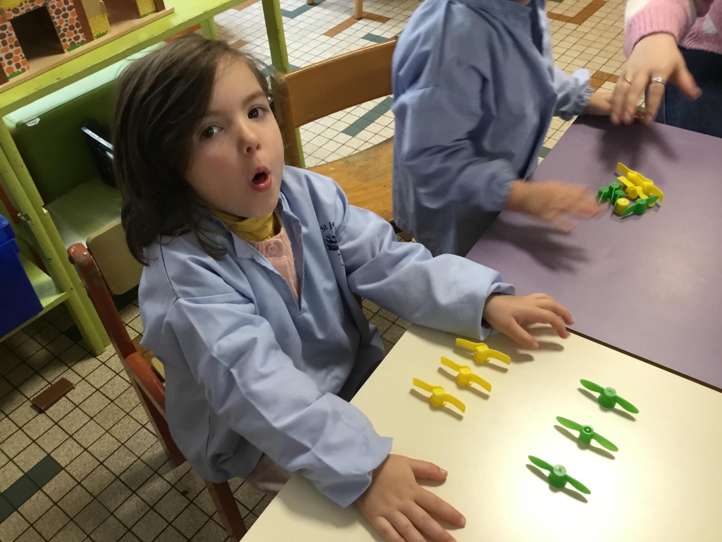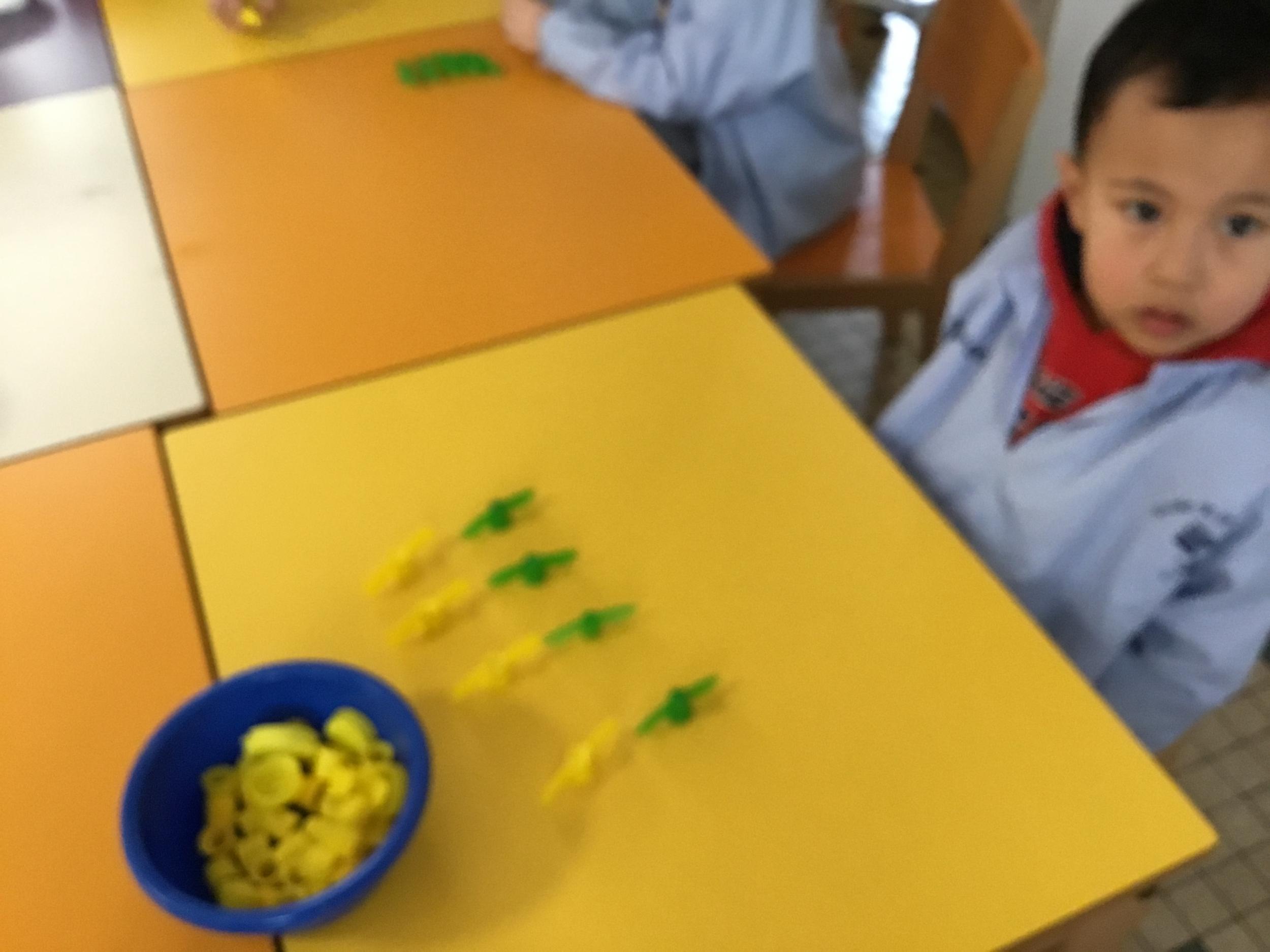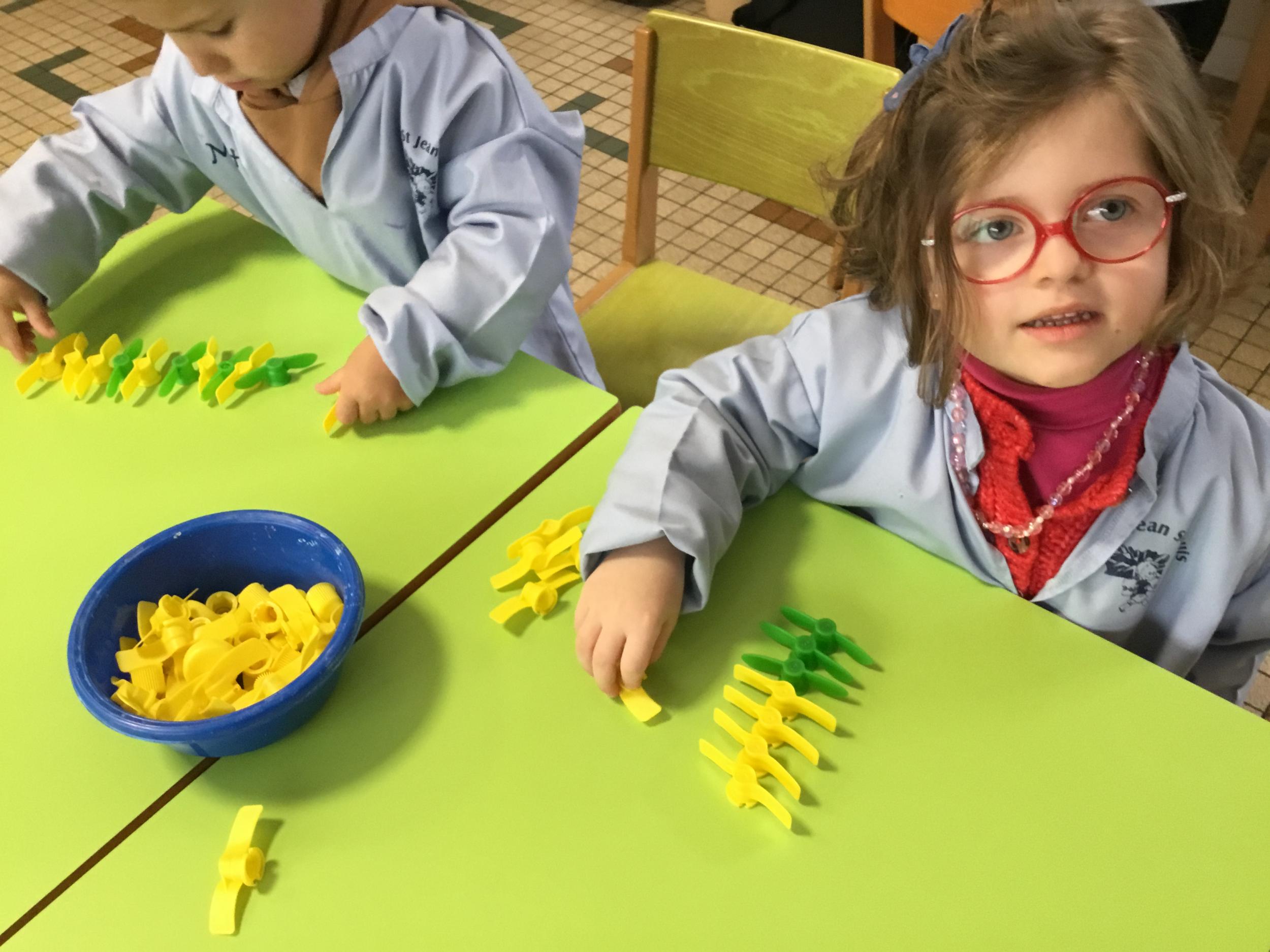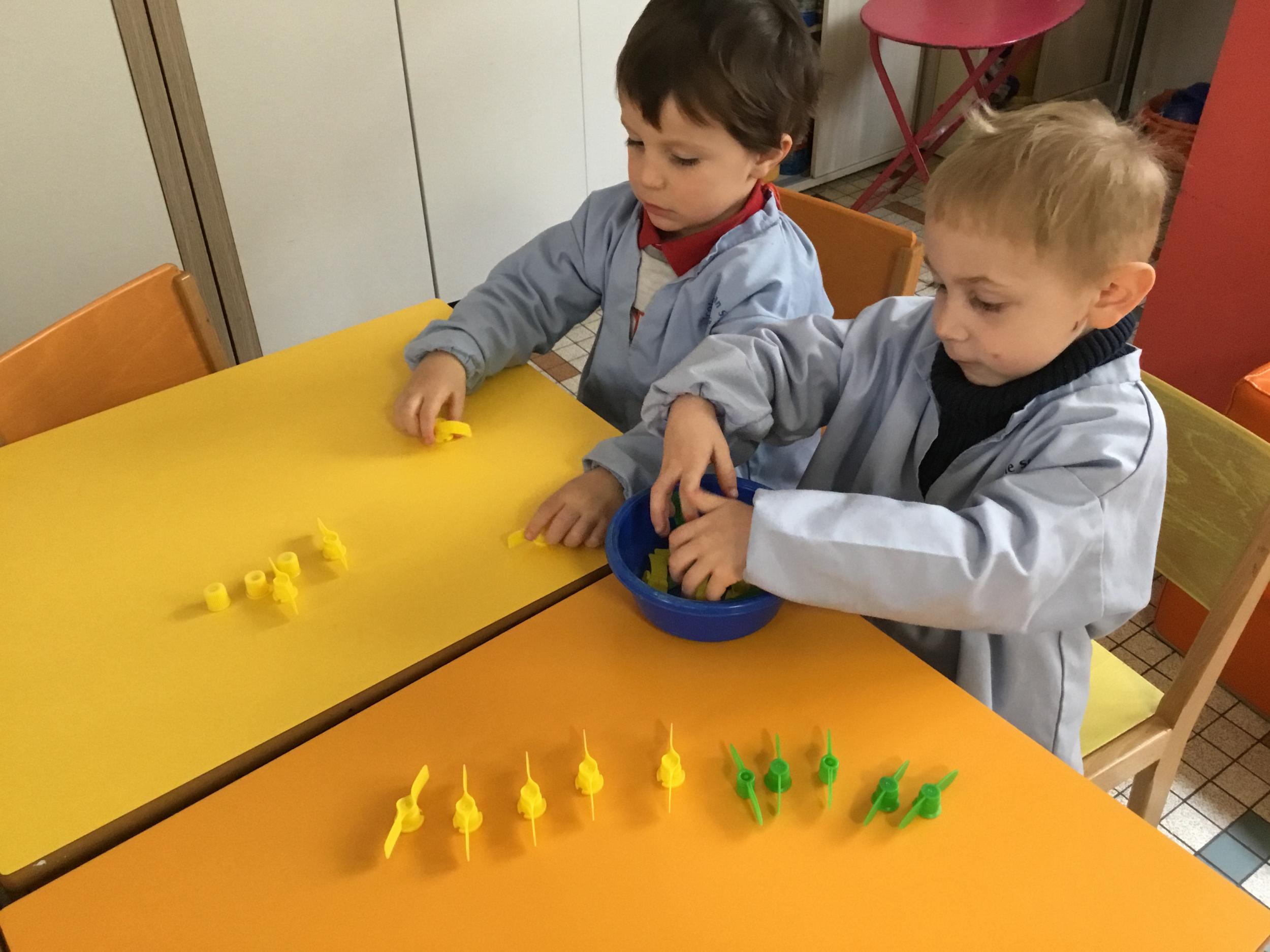 Les élèves devaient choisir autant de bouchons jaunes que de bouchons verts . La maîtresse observait leur stratégie et adaptait le nombre de bouchons au niveau de maîtrise de la compétence .