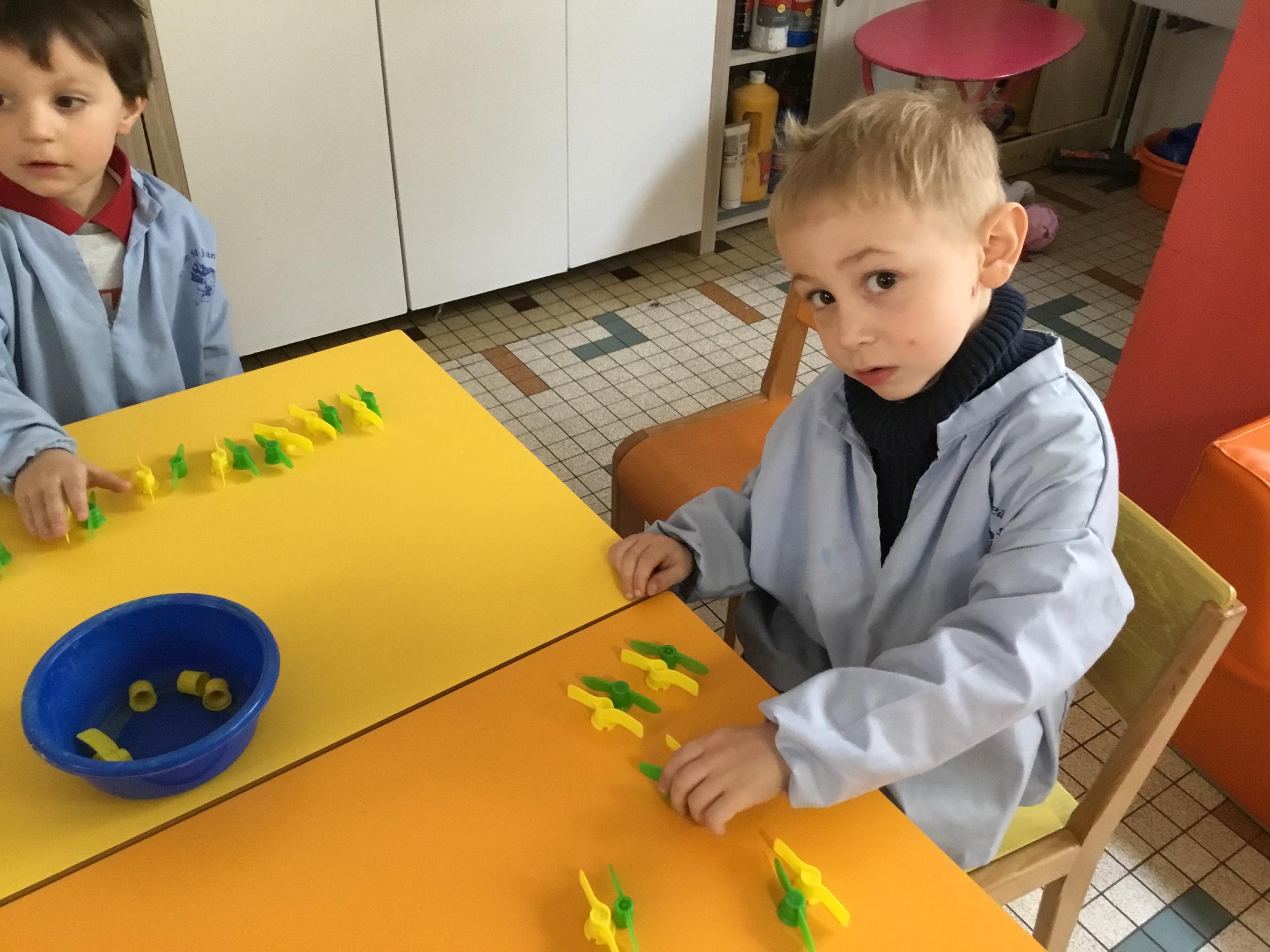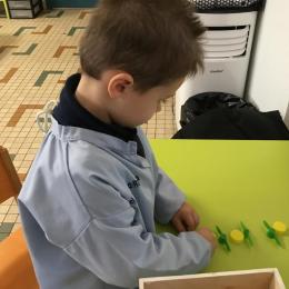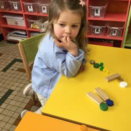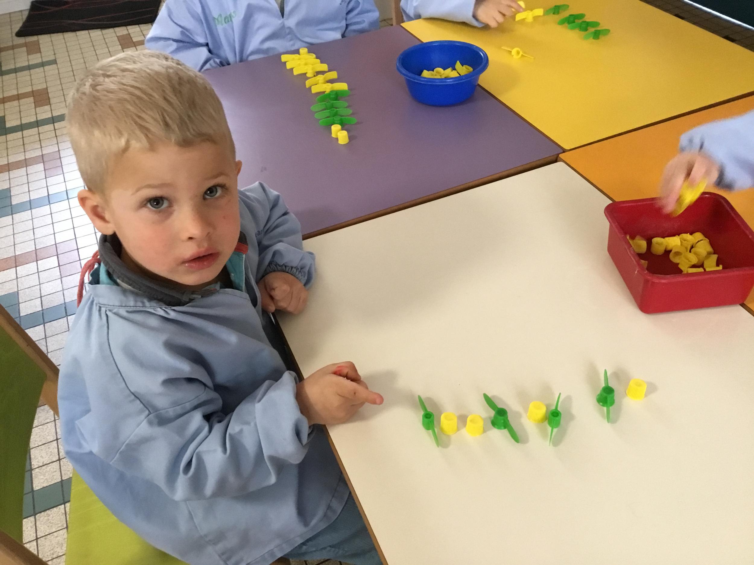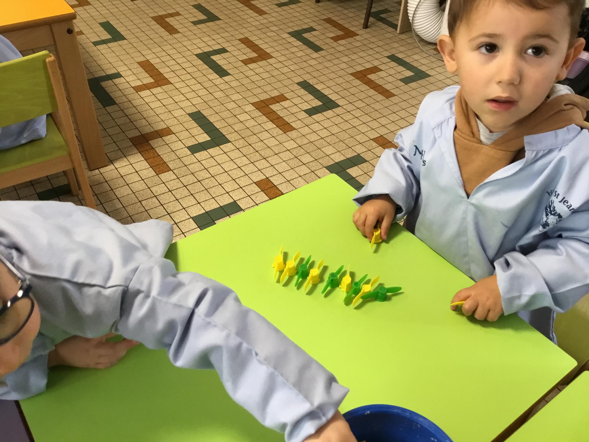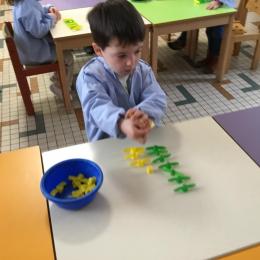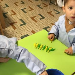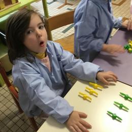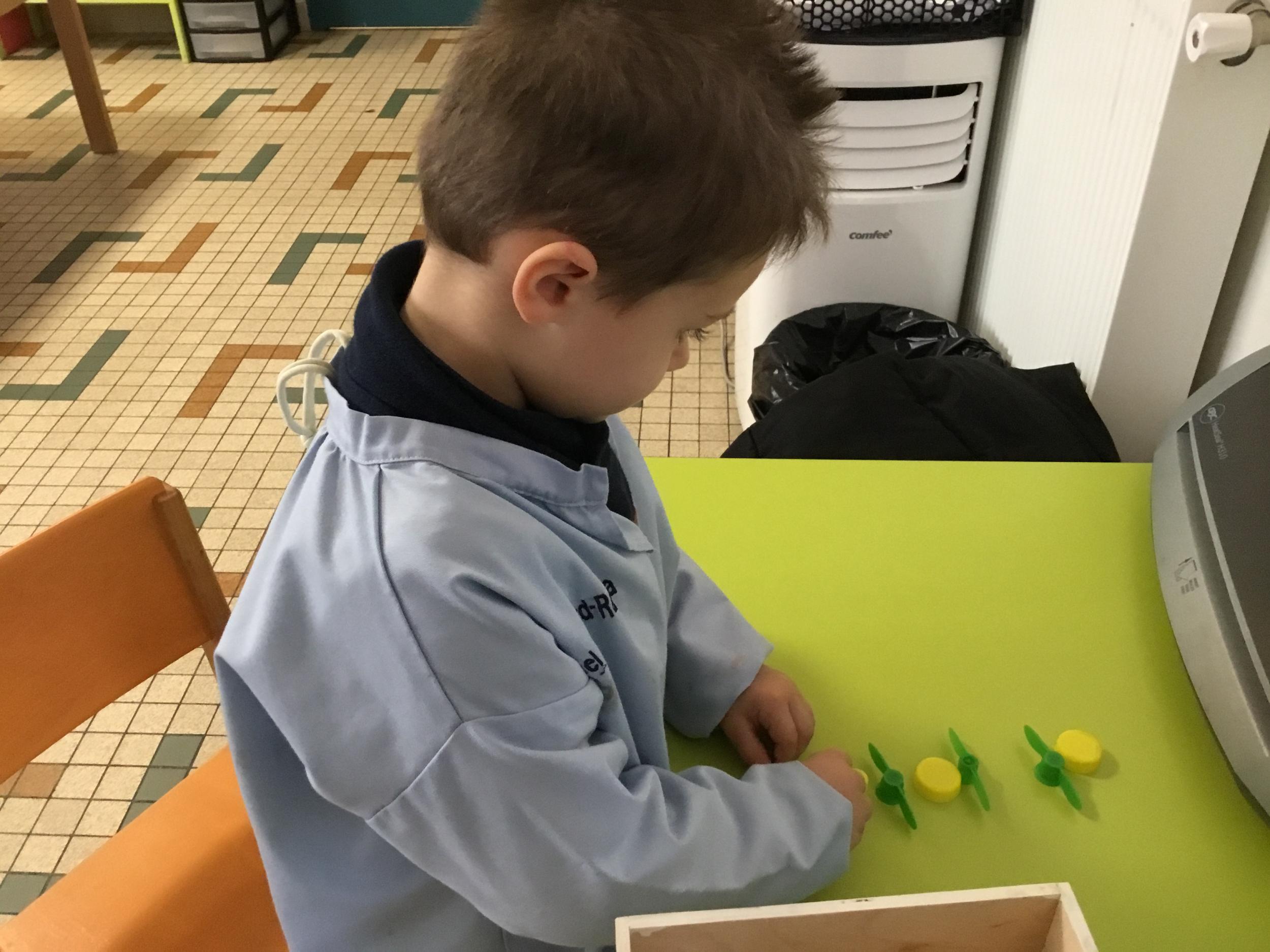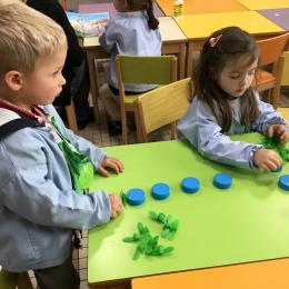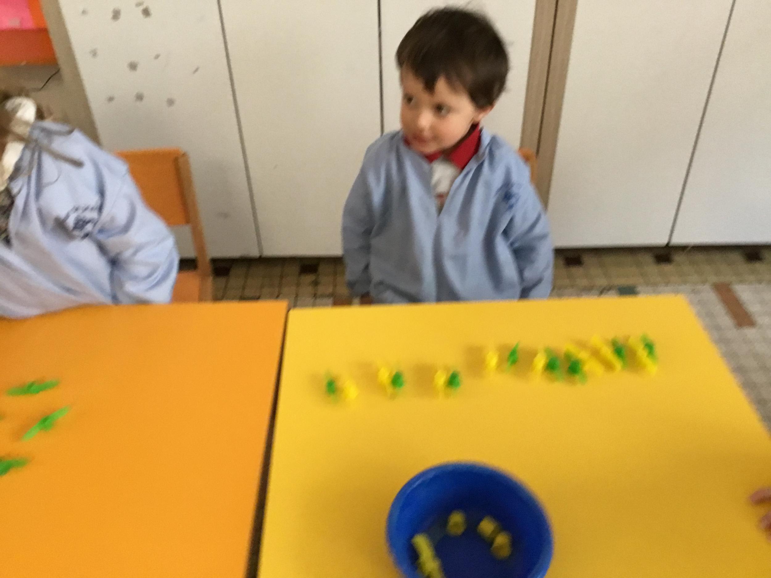 Les élèves devaient choisir autant de bouchons jaunes que de bouchons verts . La maîtresse observait leur stratégie et adaptait le nombre de bouchons au niveau de maîtrise de la compétence .