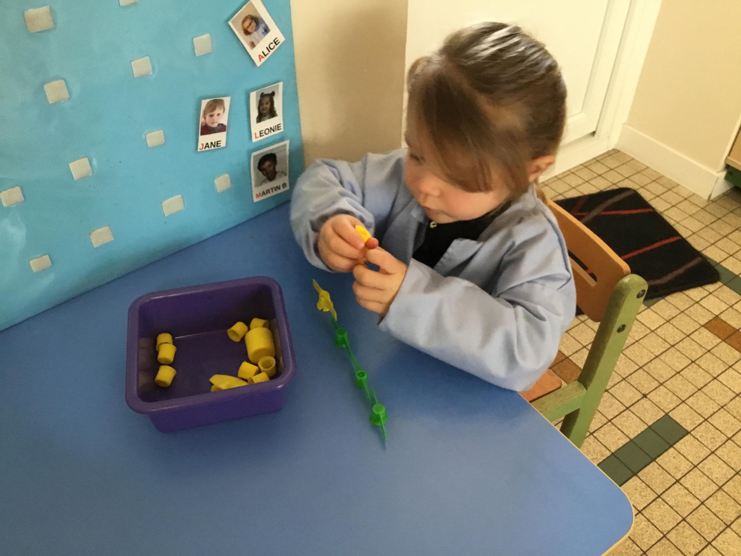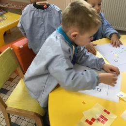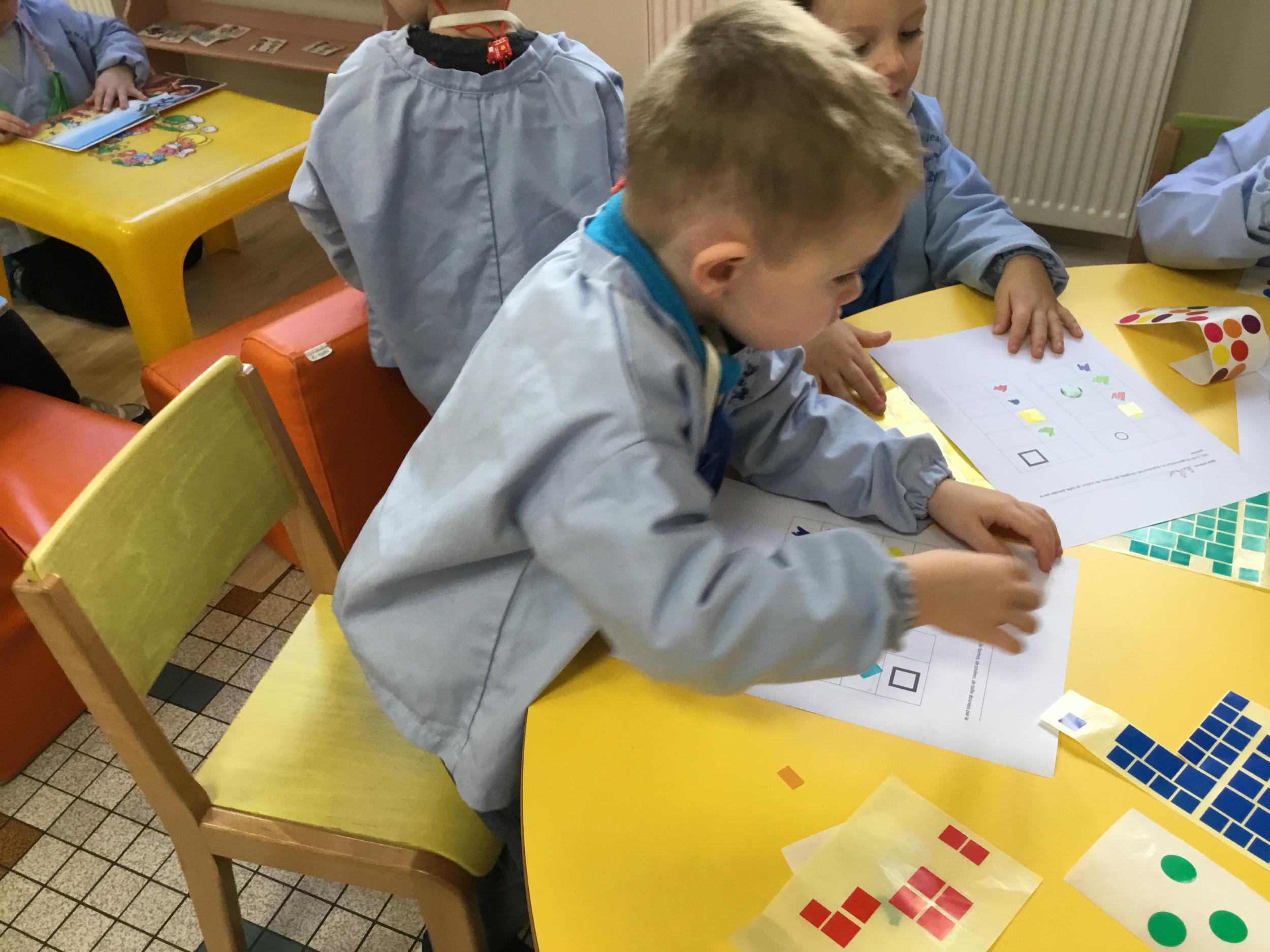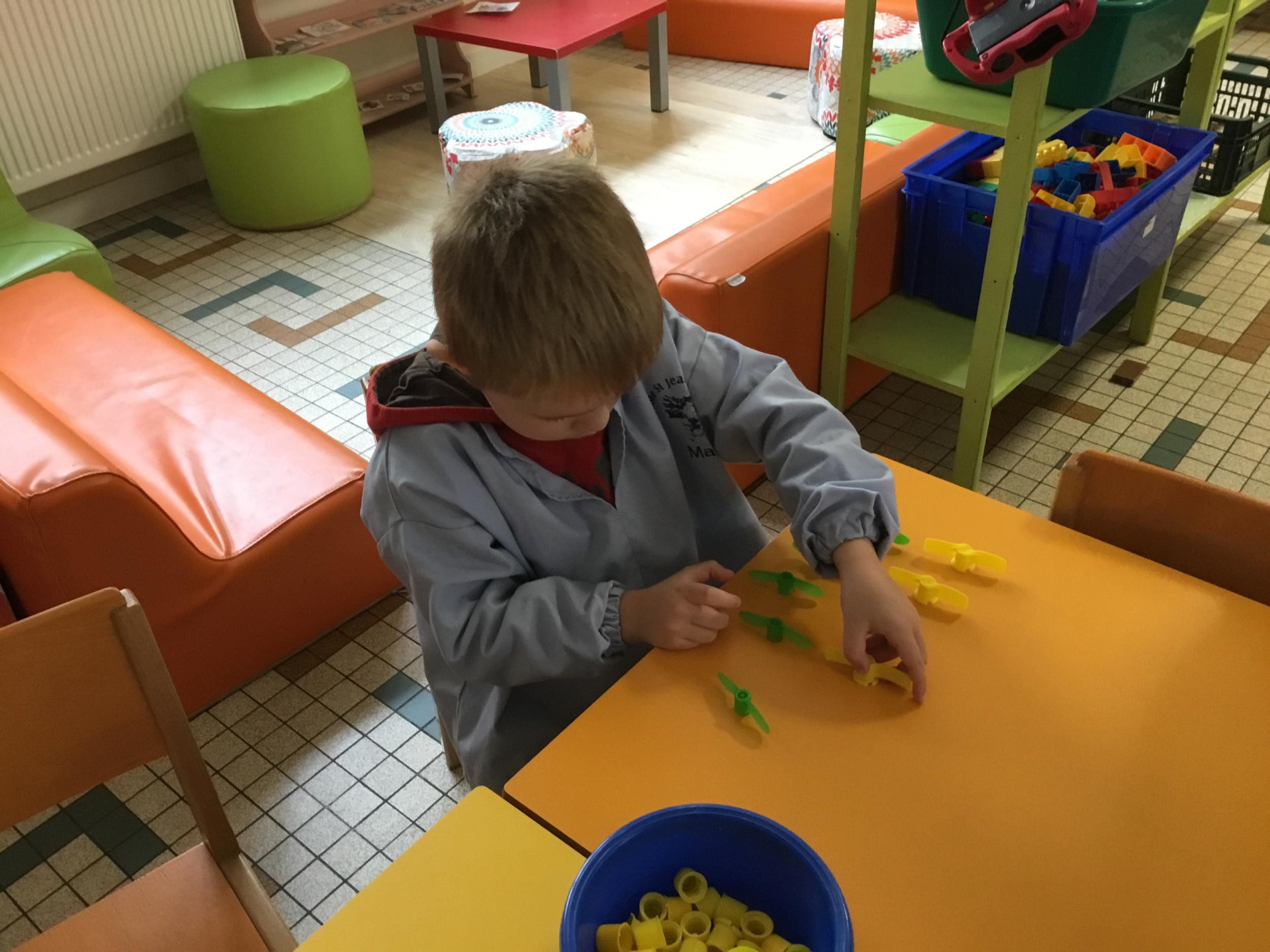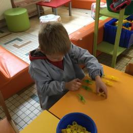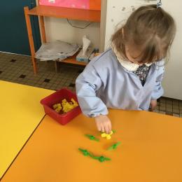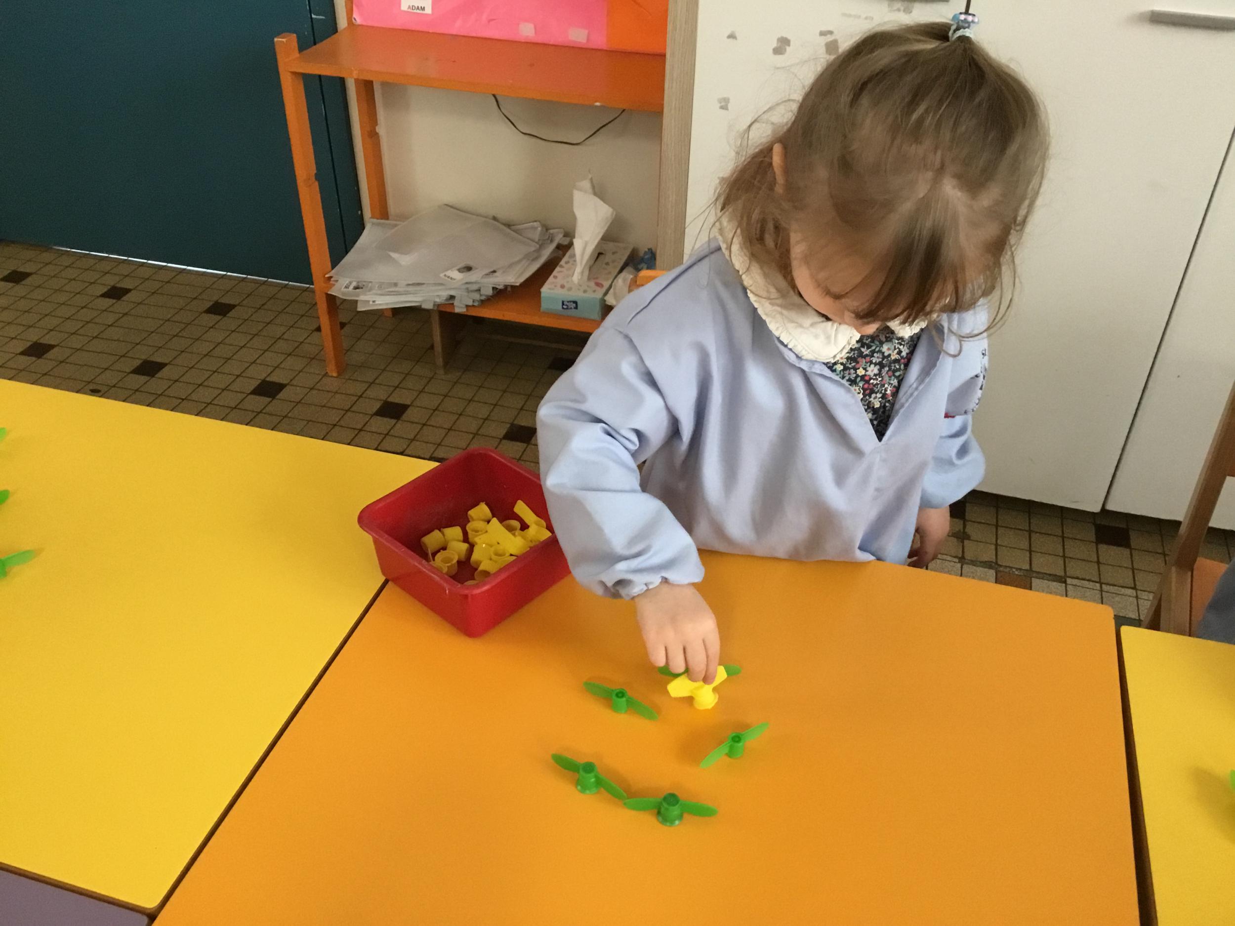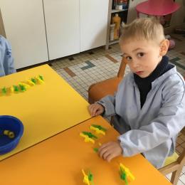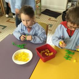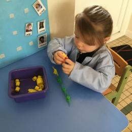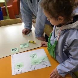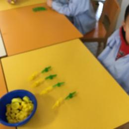 Les élèves devaient choisir autant de bouchons jaunes que de bouchons verts . La maîtresse observait leur stratégie et adaptait le nombre de bouchons au niveau de maîtrise de la compétence .