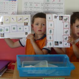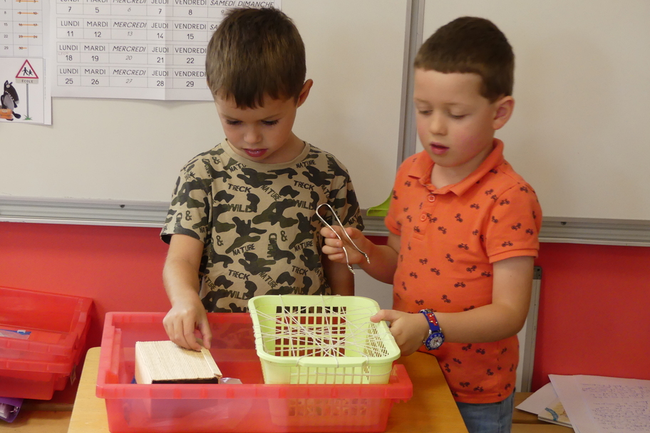 Ainsi, les élèves savent que les boites rouges (aux brevets blancs!) couvrent le domaine de la découverte du monde (le vivant avec des jeux sur les animaux et la matière avec de nombreux jeux de pinces très diverses pour muscler les doigts et favoriser l'écriture par la suite).