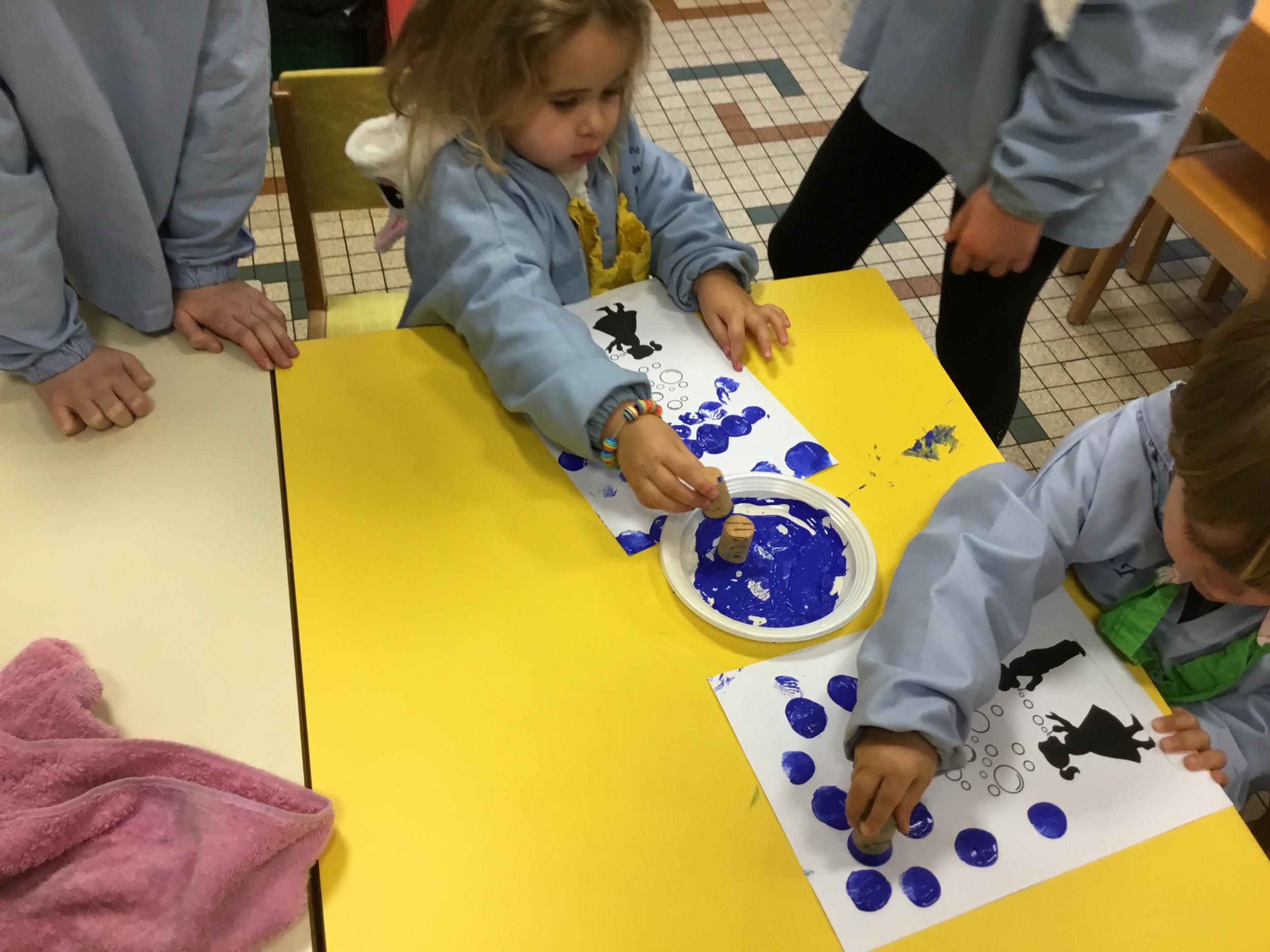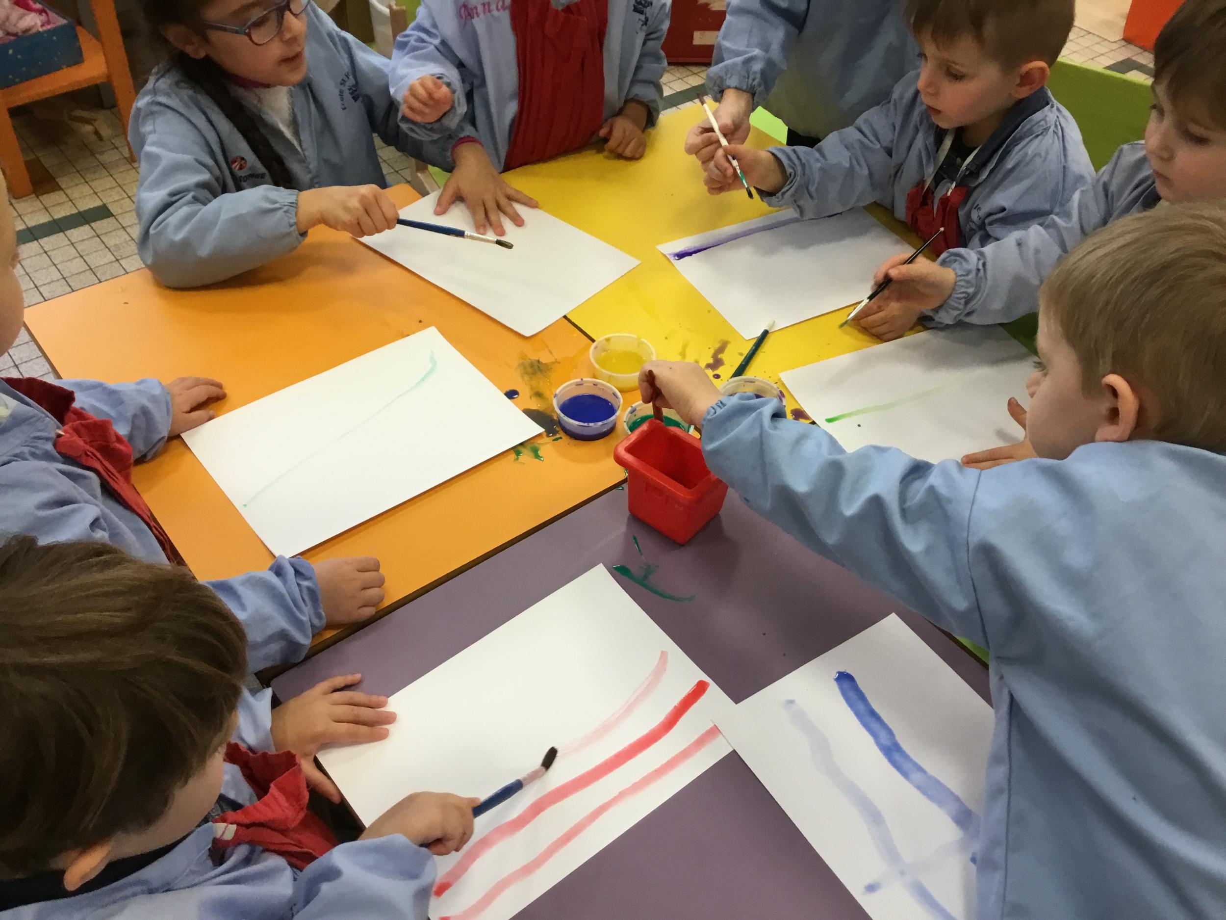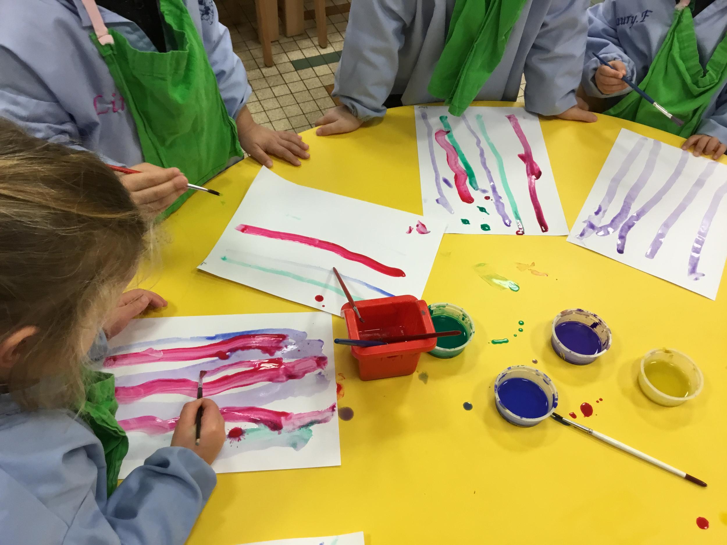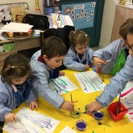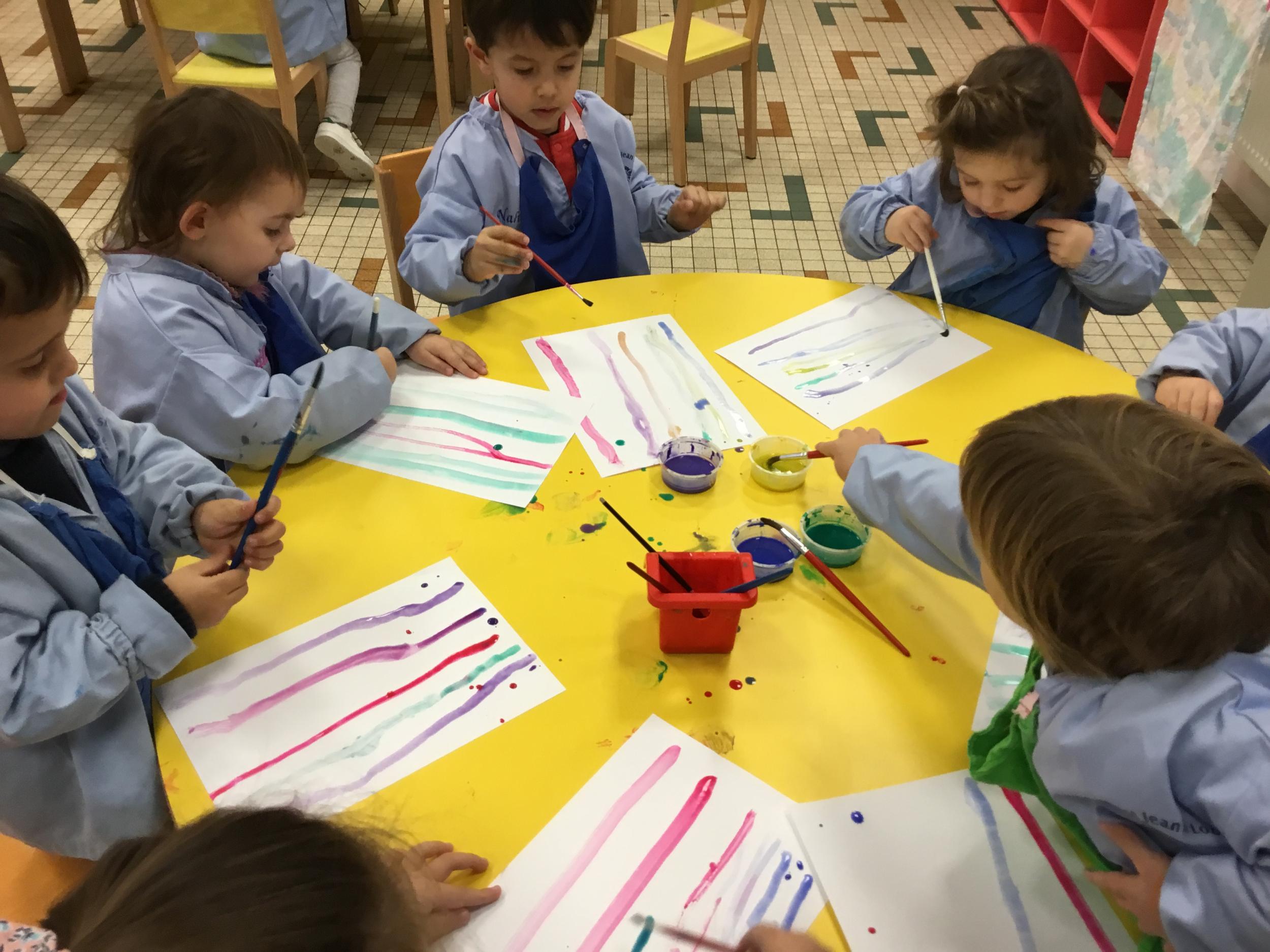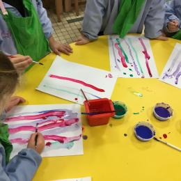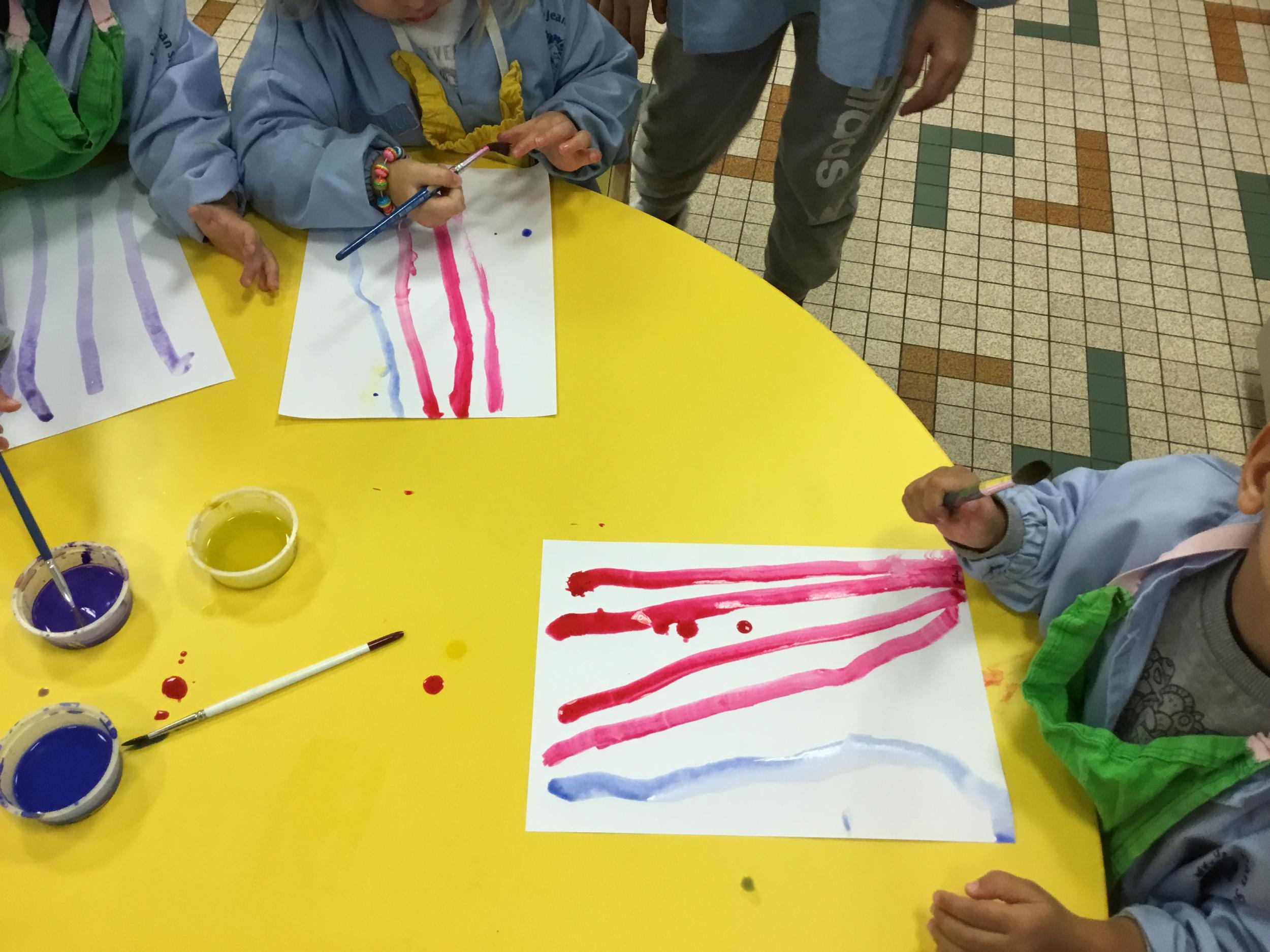 26/01/2020 A l’aide de bouchons les élèves ont laissé des traces pou représenter des bulles de savon. Ils ont représenté la pluie à l’aide d’un pinceau. Dernière séance sur le trait vertical.