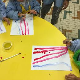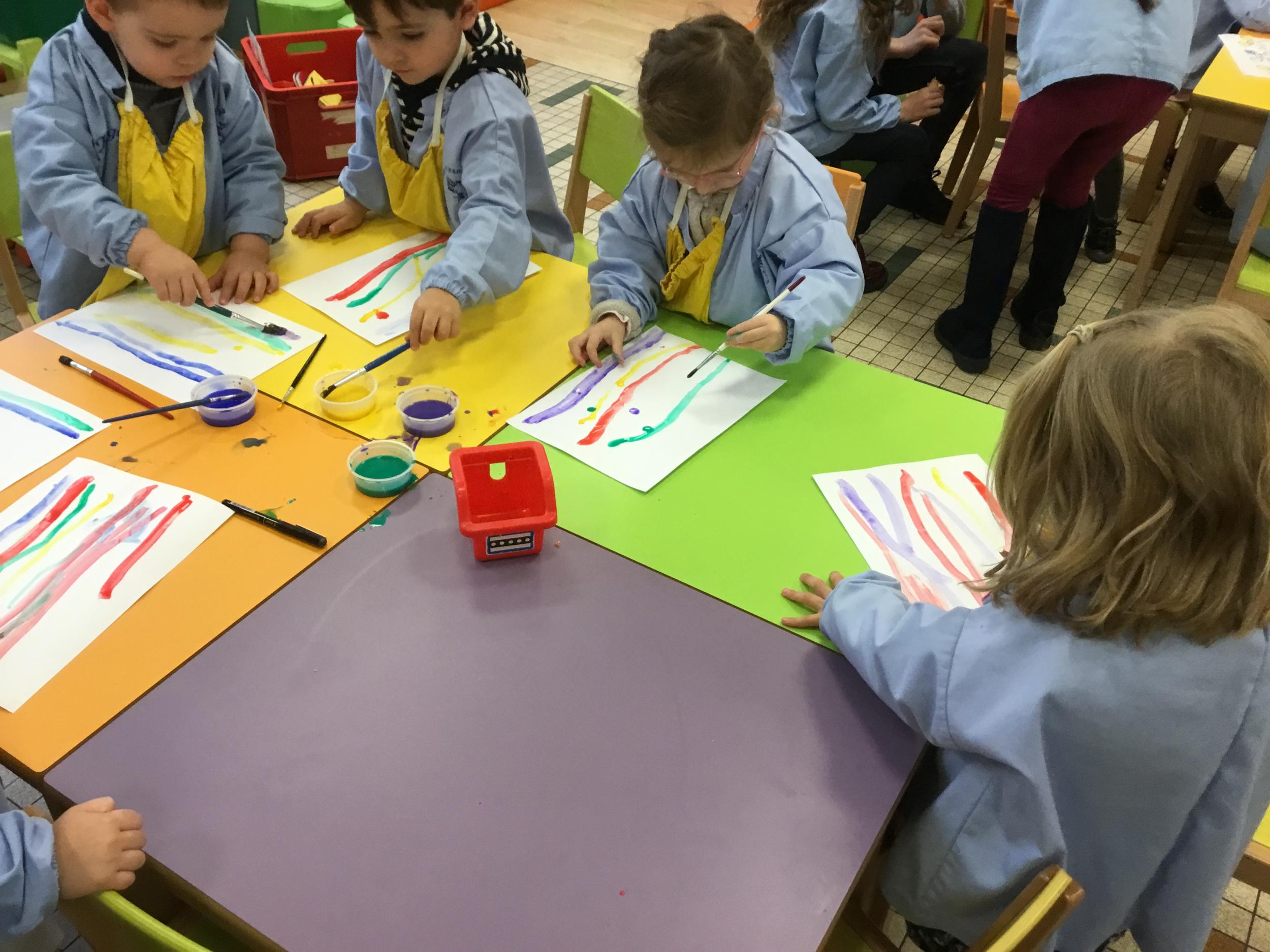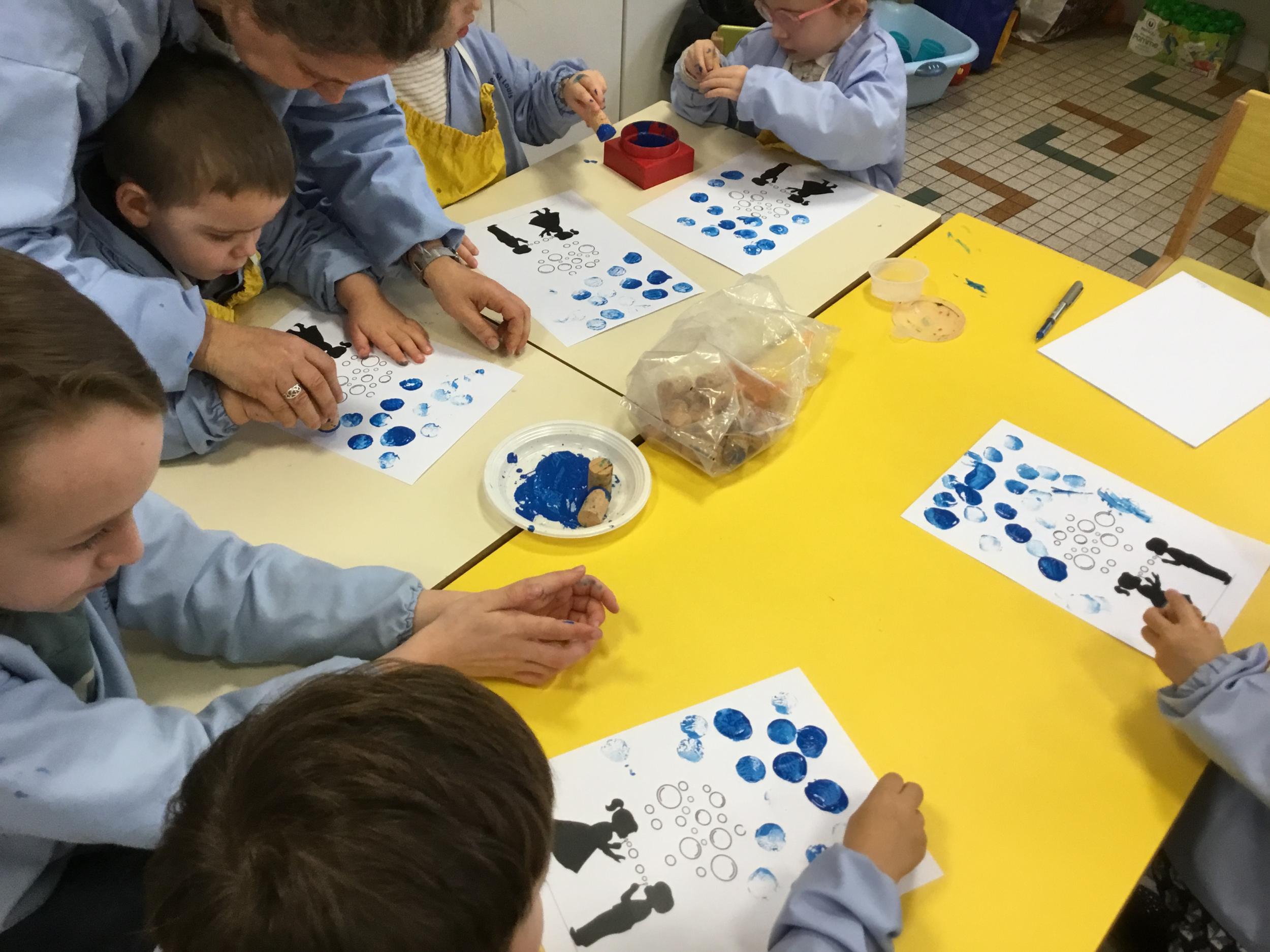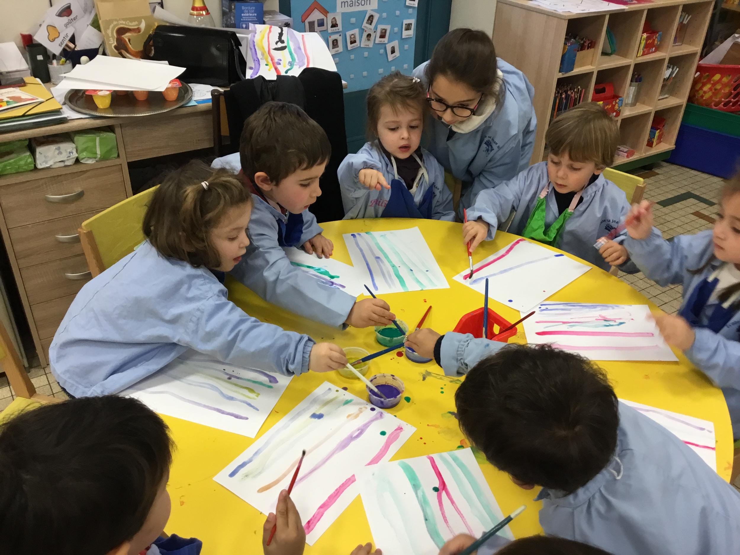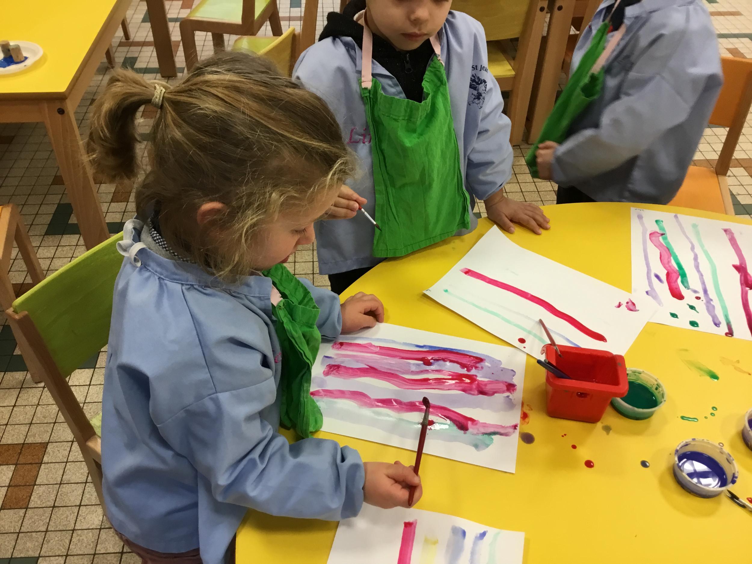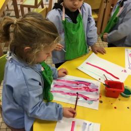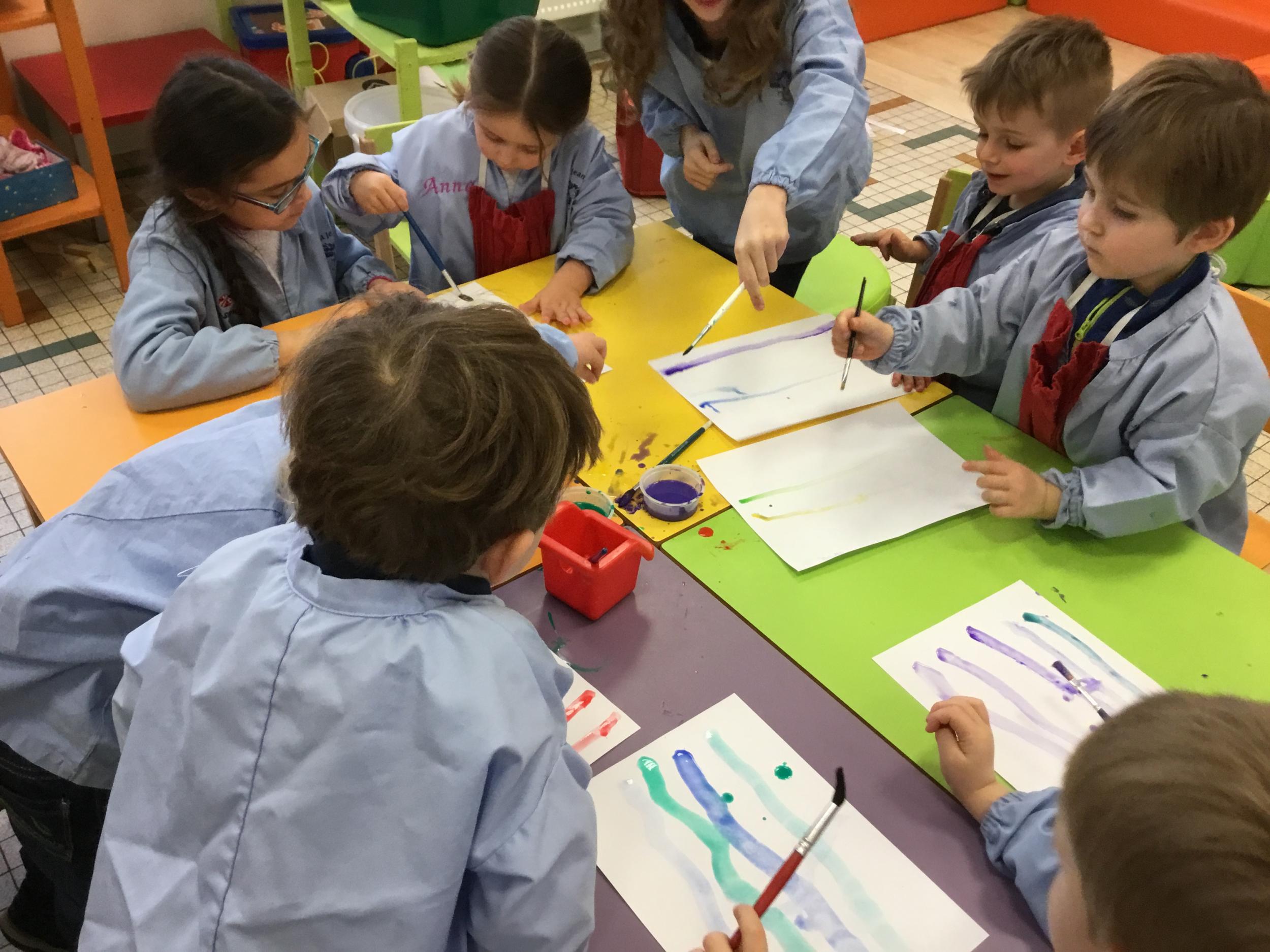 26/01/2020 A l’aide de bouchons les élèves ont laissé des traces pou représenter des bulles de savon. Ils ont représenté la pluie à l’aide d’un pinceau. Dernière séance sur le trait vertical.