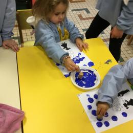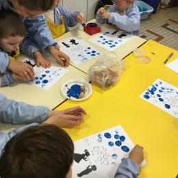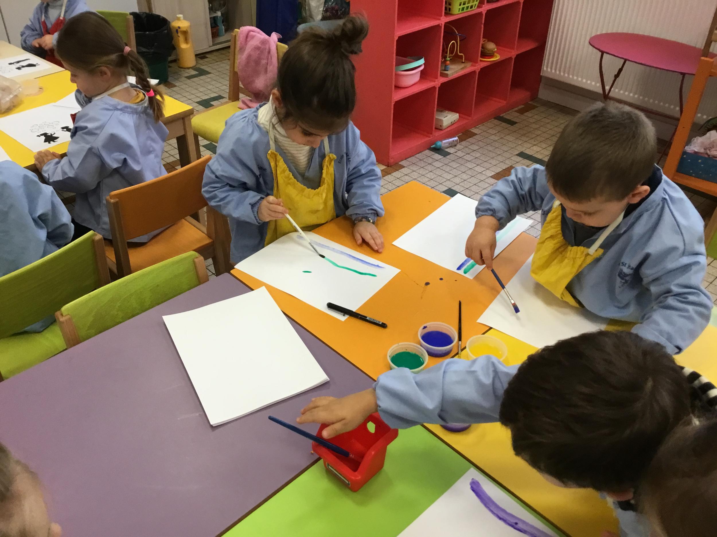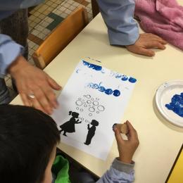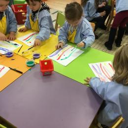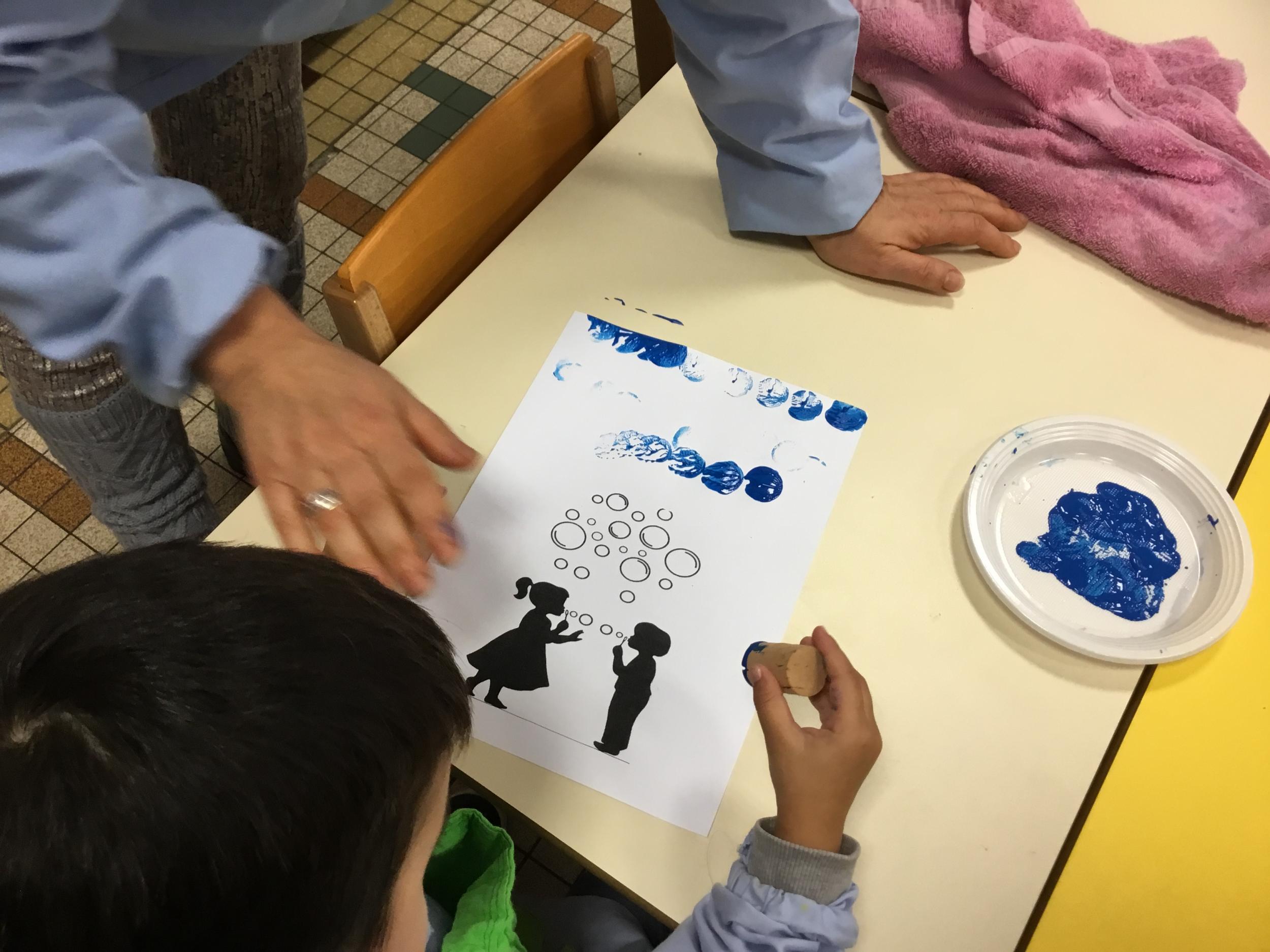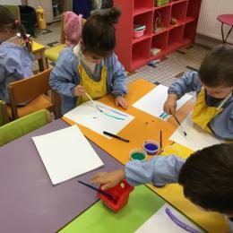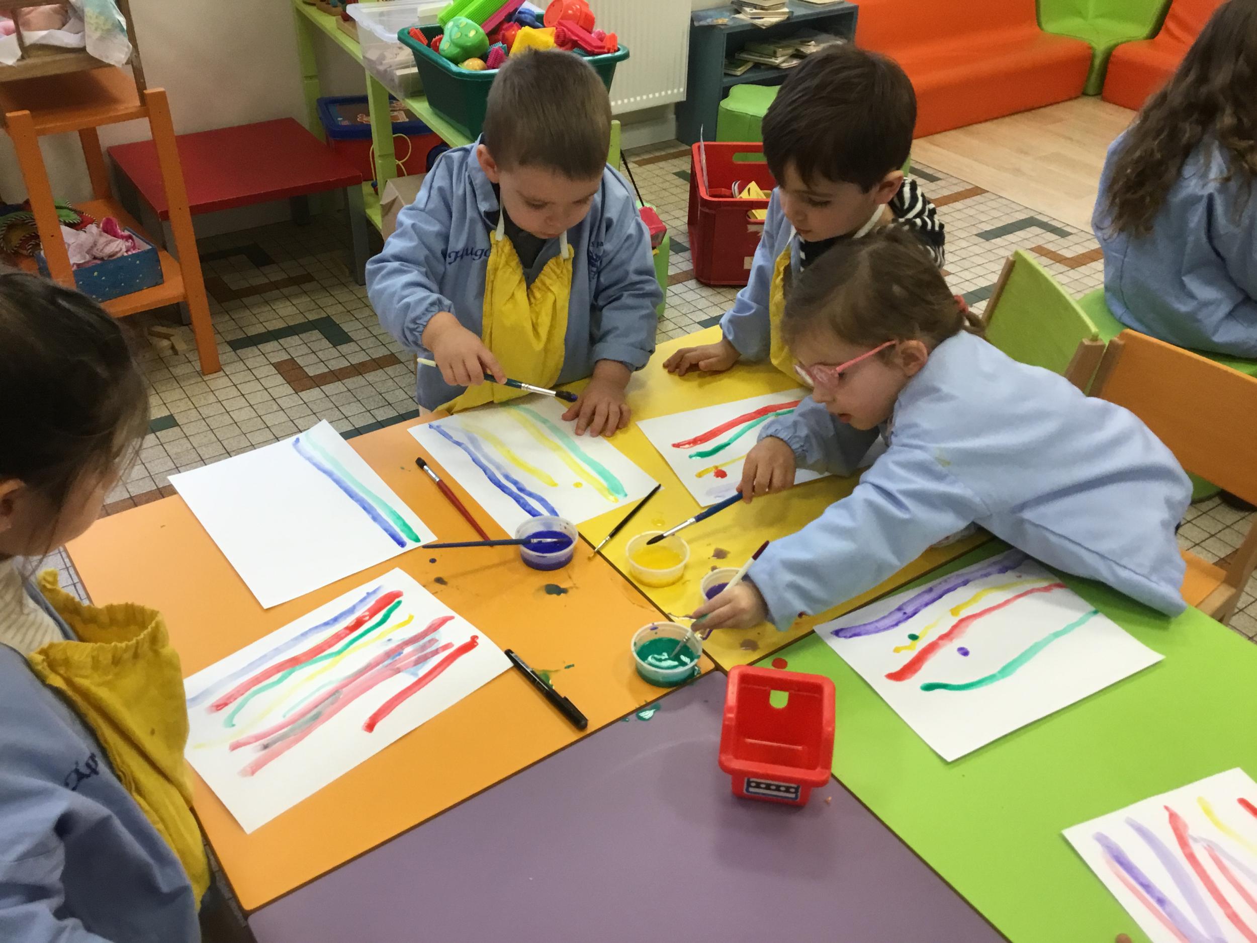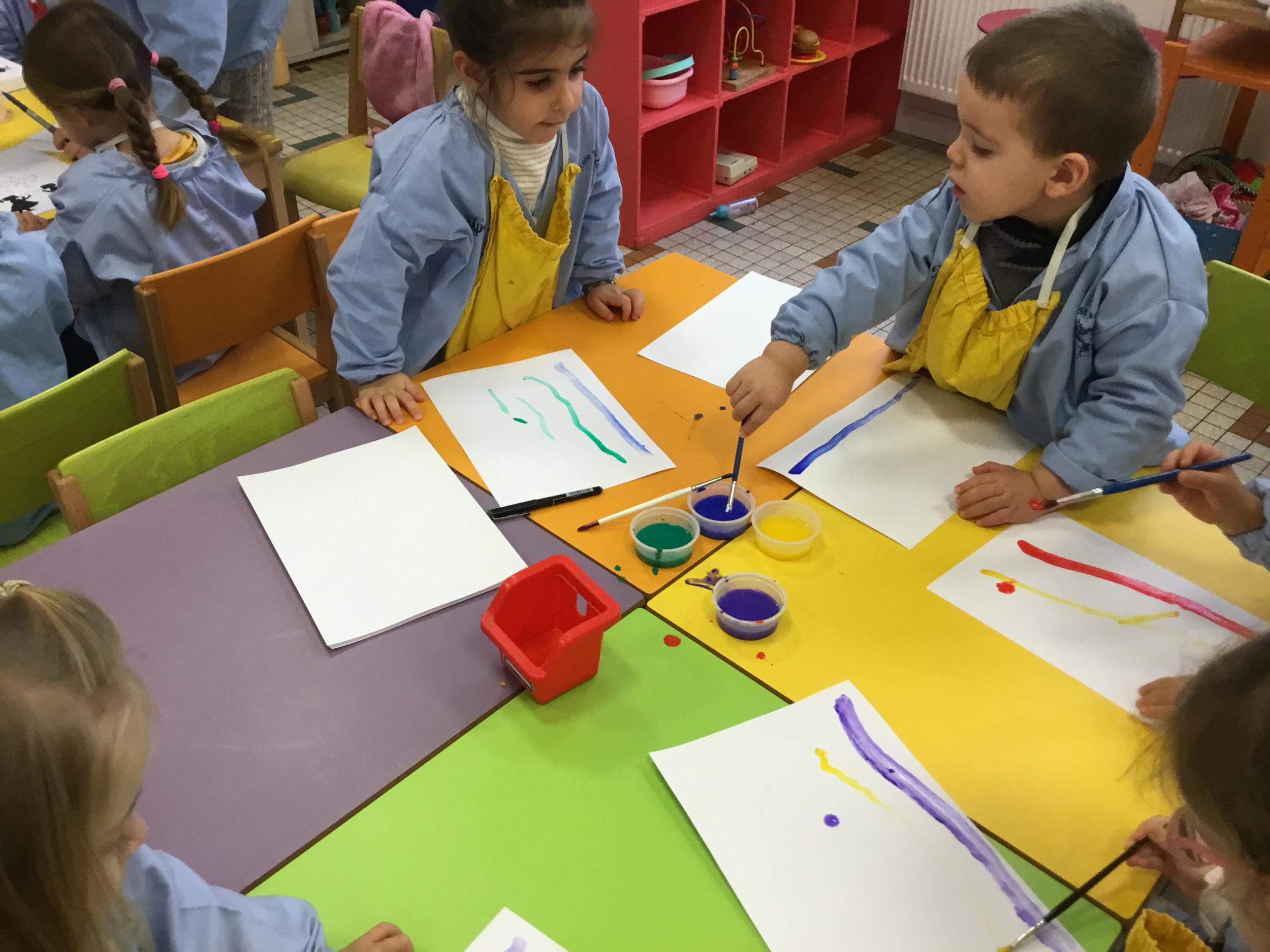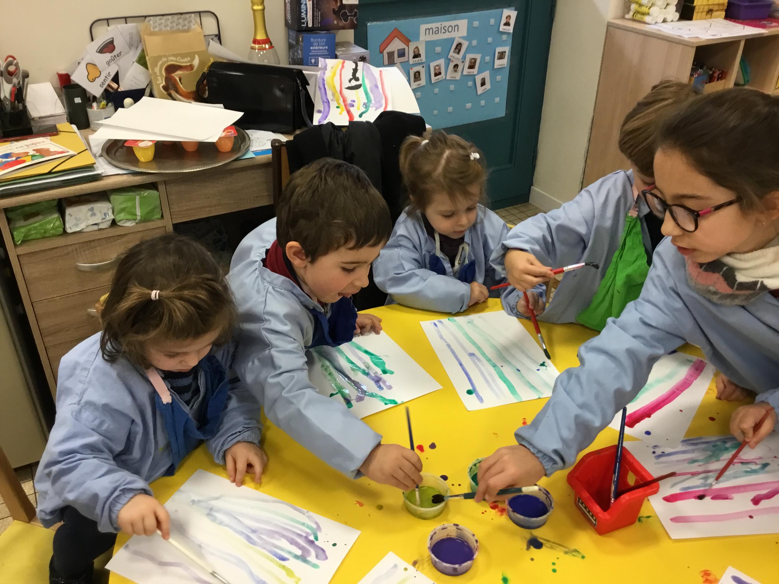 26/01/2020 A l’aide de bouchons les élèves ont laissé des traces pou représenter des bulles de savon. Ils ont représenté la pluie à l’aide d’un pinceau. Dernière séance sur le trait vertical.