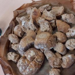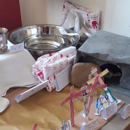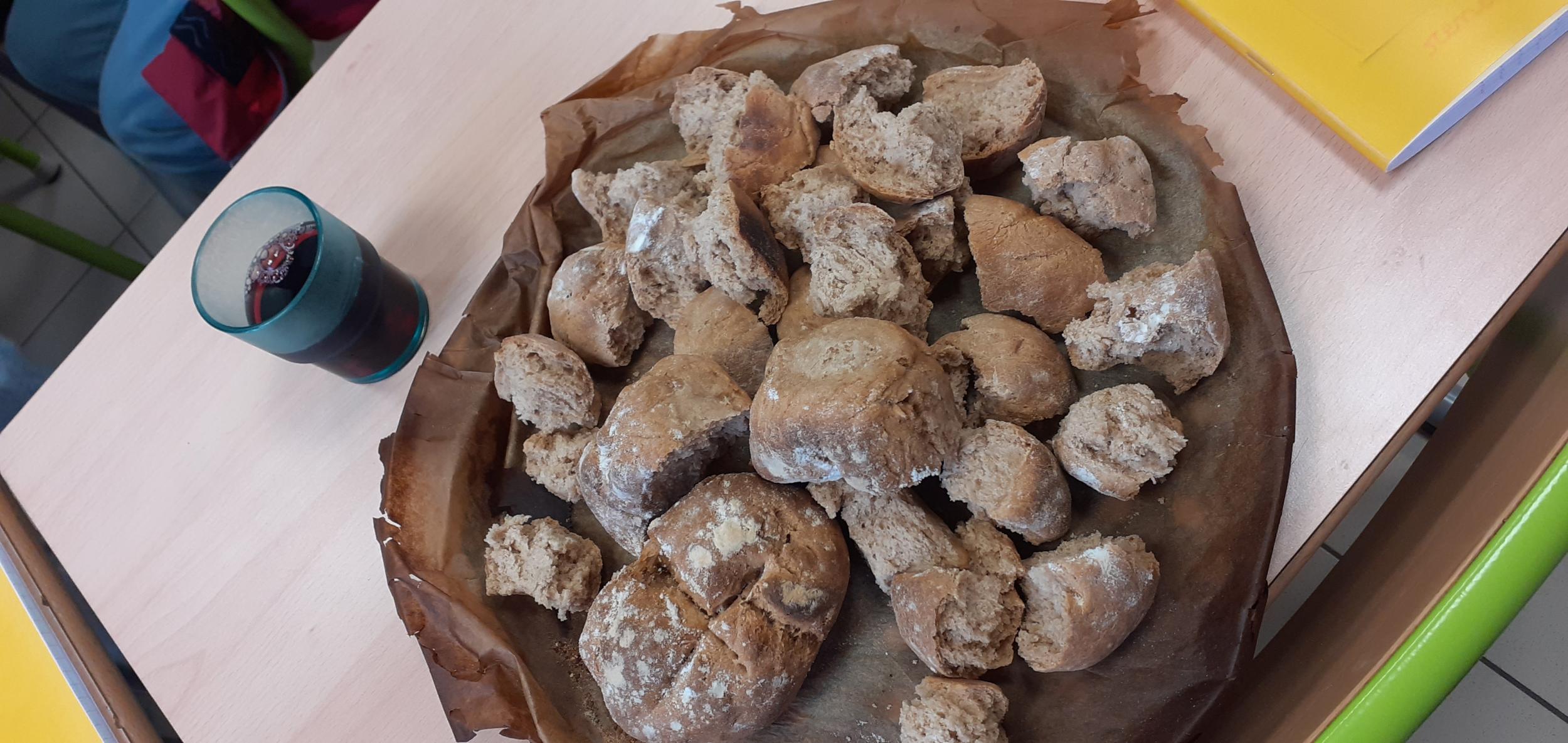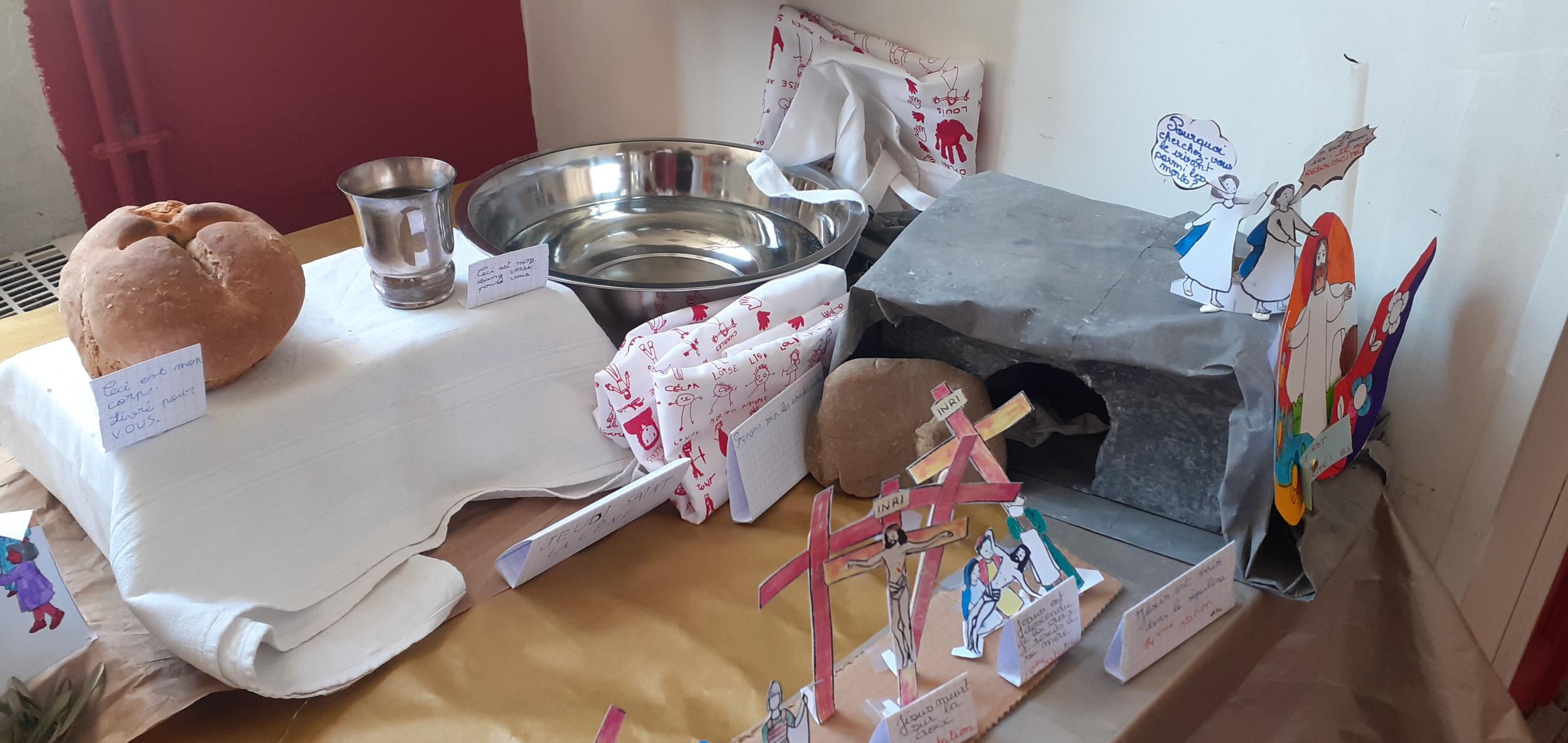 - Les CM1 ont cuit du pain et reproduit les étapes du Jeudi Saint , le lavement des pieds et la Cène.