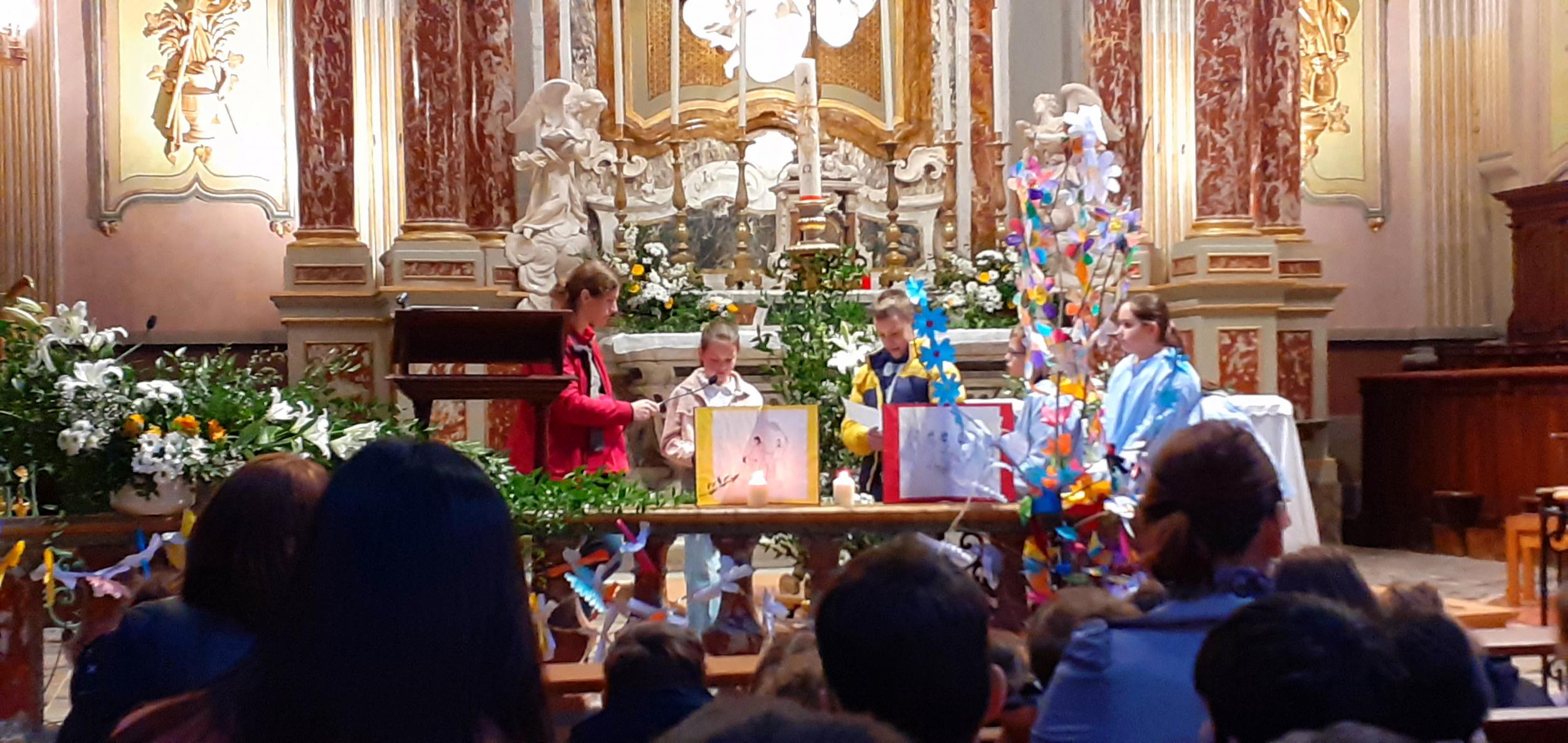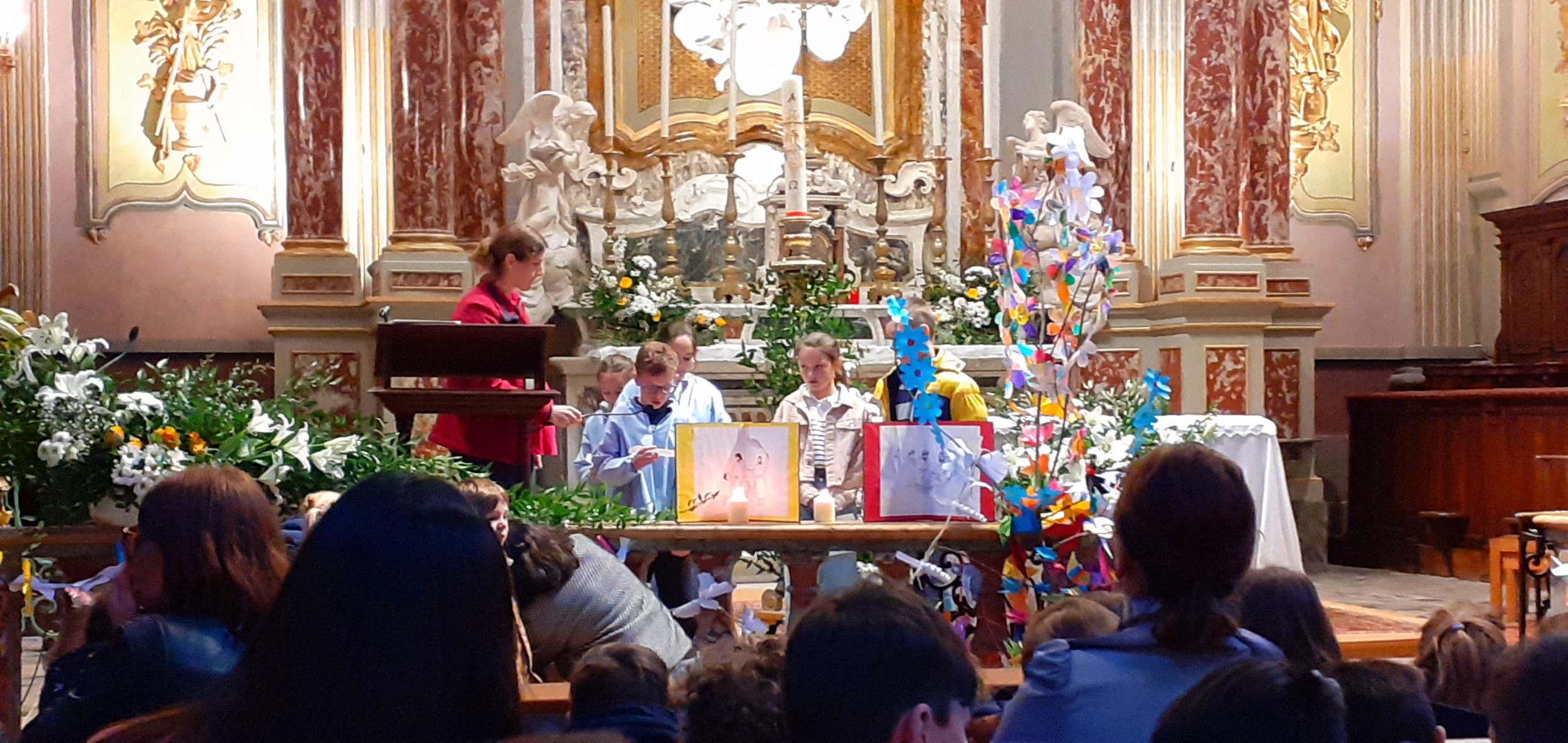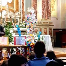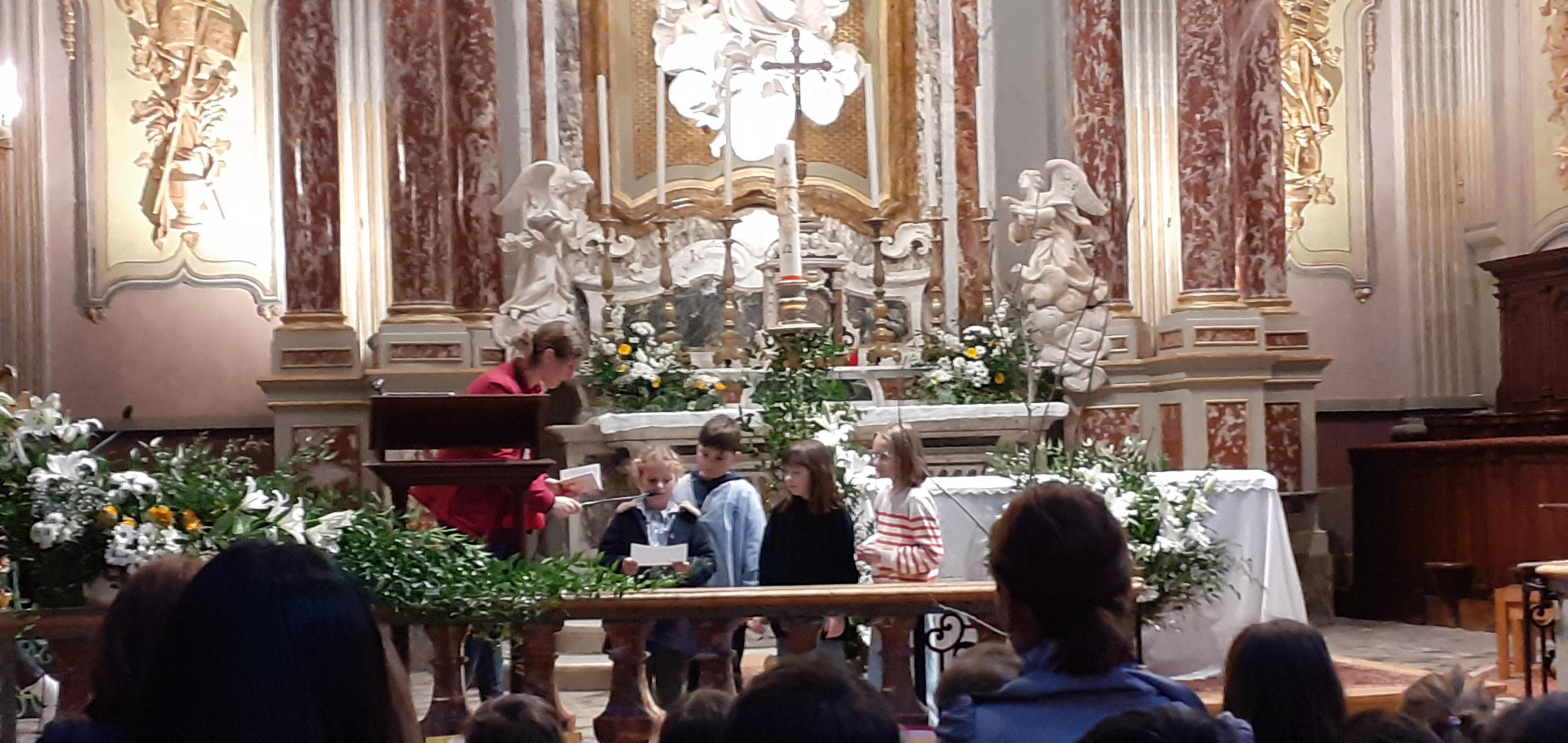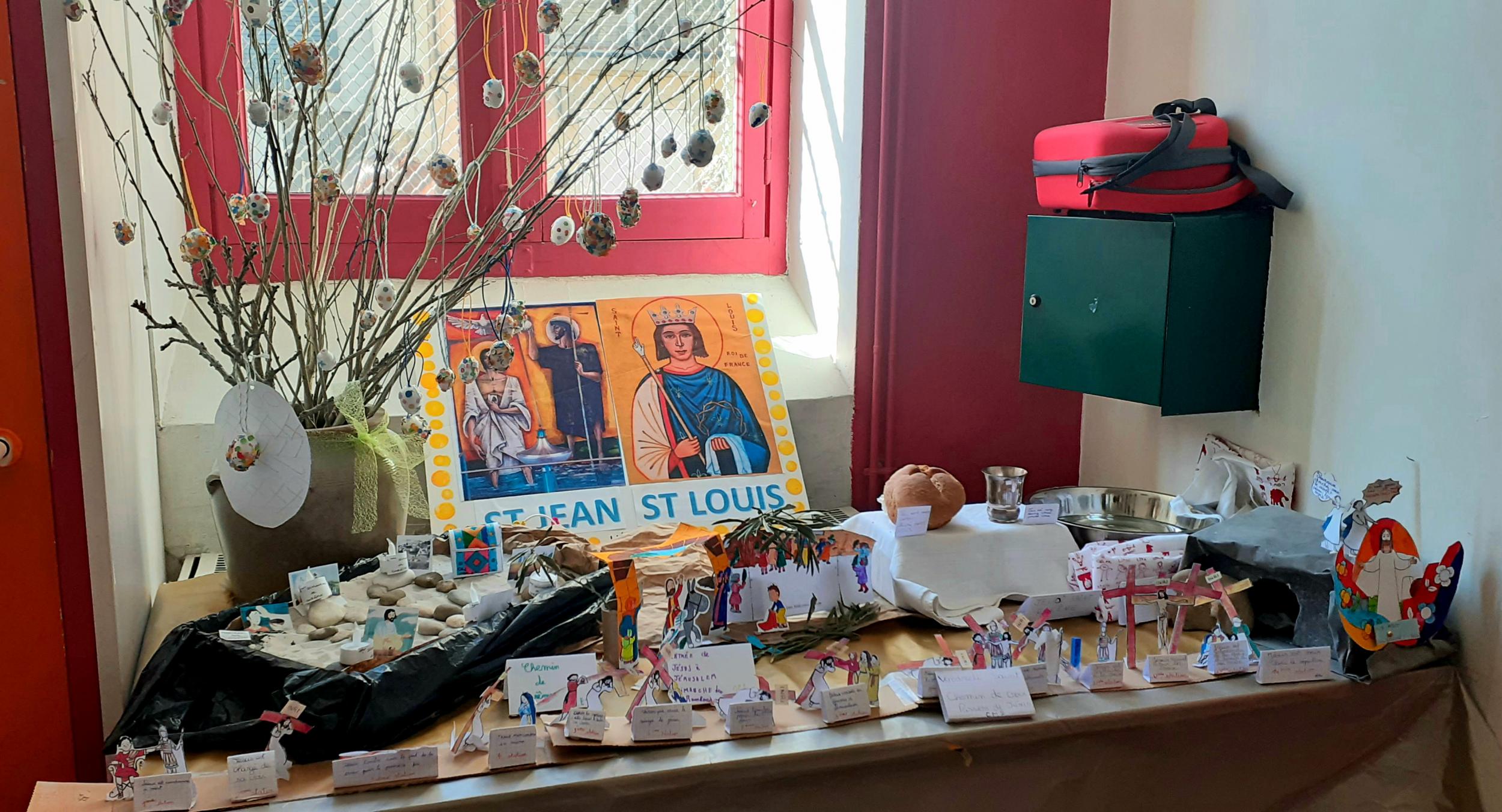 La célébration de Pâques a eu lieu mardi matin à l'église de La Platé, toute fleurie. Chaque classe a réalisé une guirlande de fleurs ou d'oiseaux pour redonner vie à une branche morte. Les CE ont rédigé et lu les intentions de prière pénitentielle, les CM celles de la prière universelle. Tout le monde a récité le Notre-Père et chanté un bel Ave Maria.