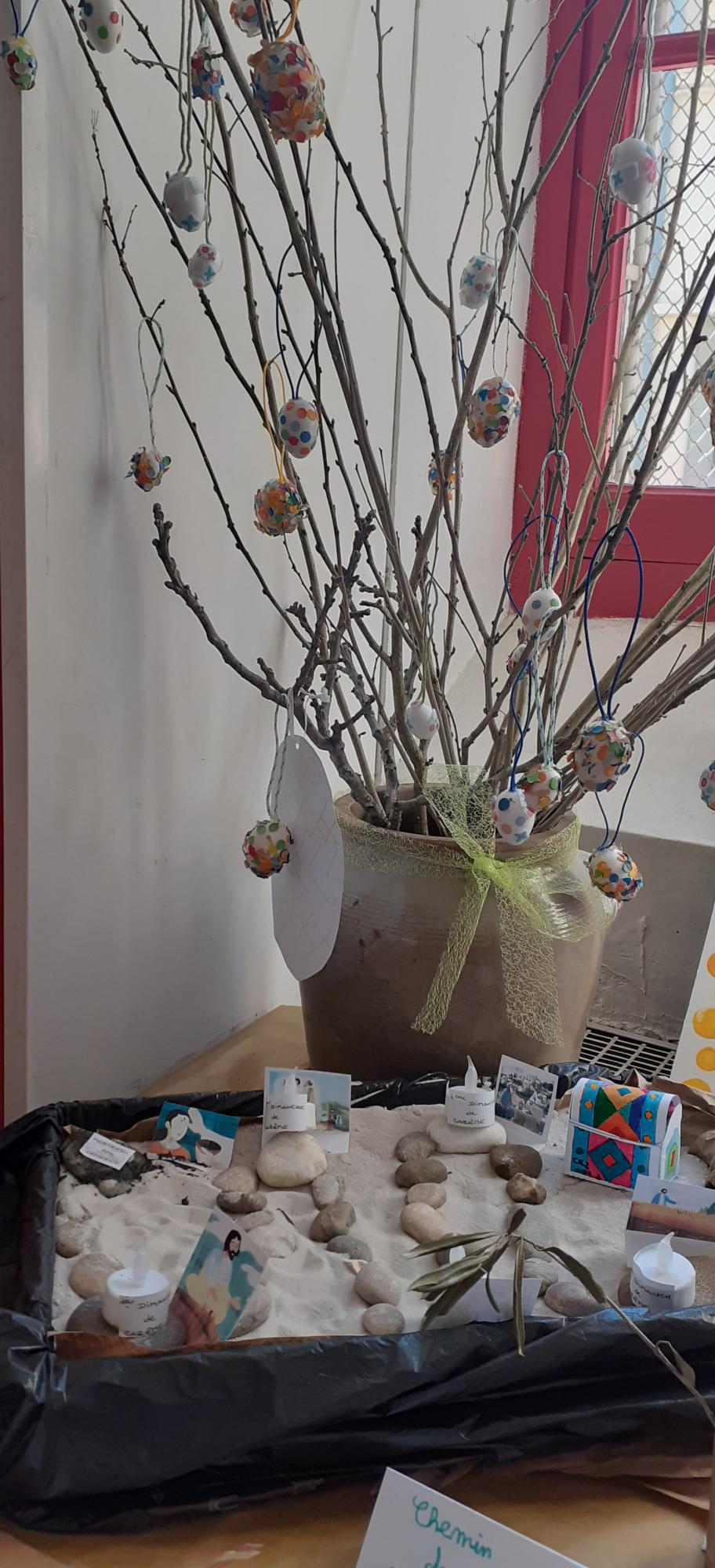 Voici un aperçu de la réflexion des élèves de l'école pendant le Carême, à travers leurs réalisations dans le hall d'entrée :