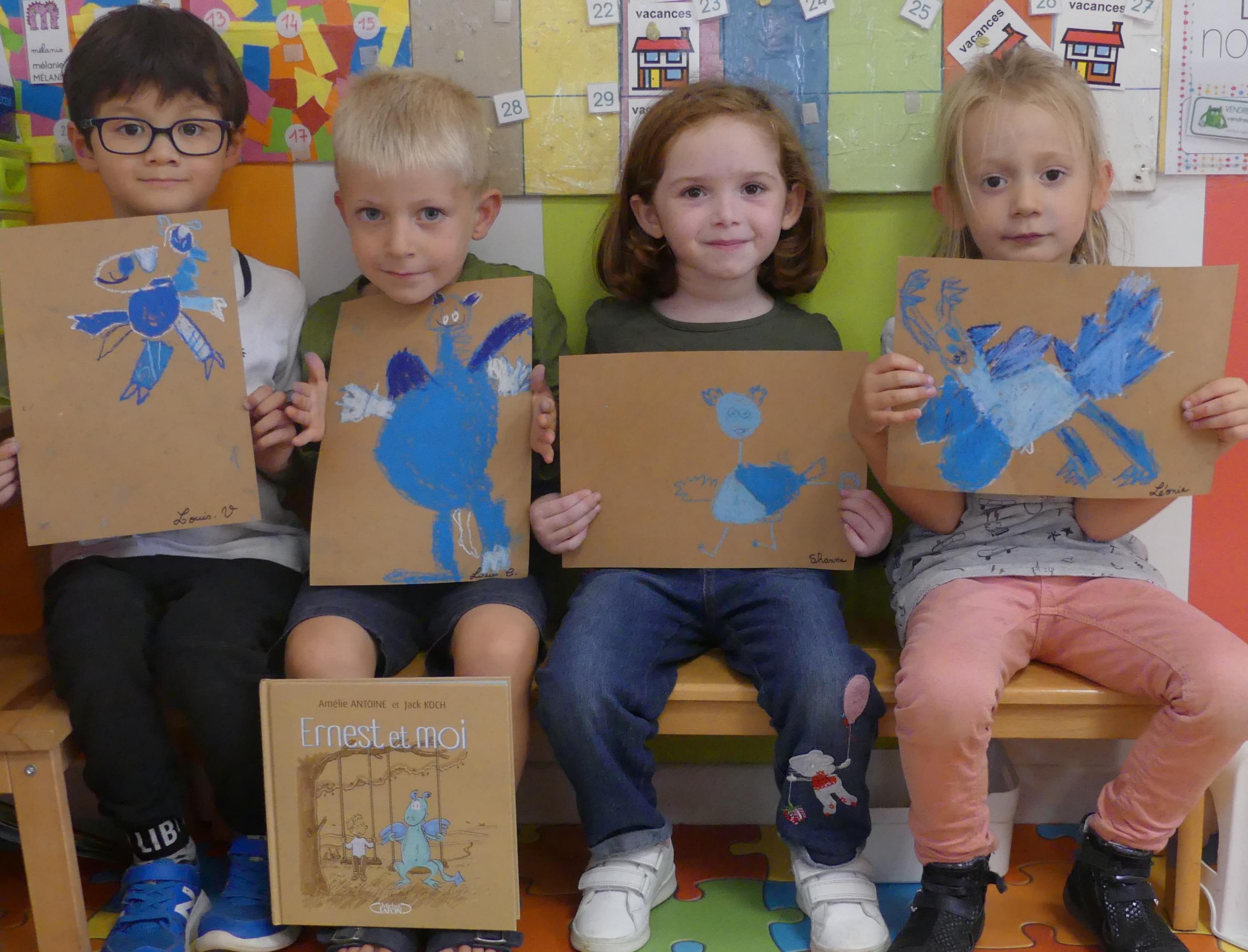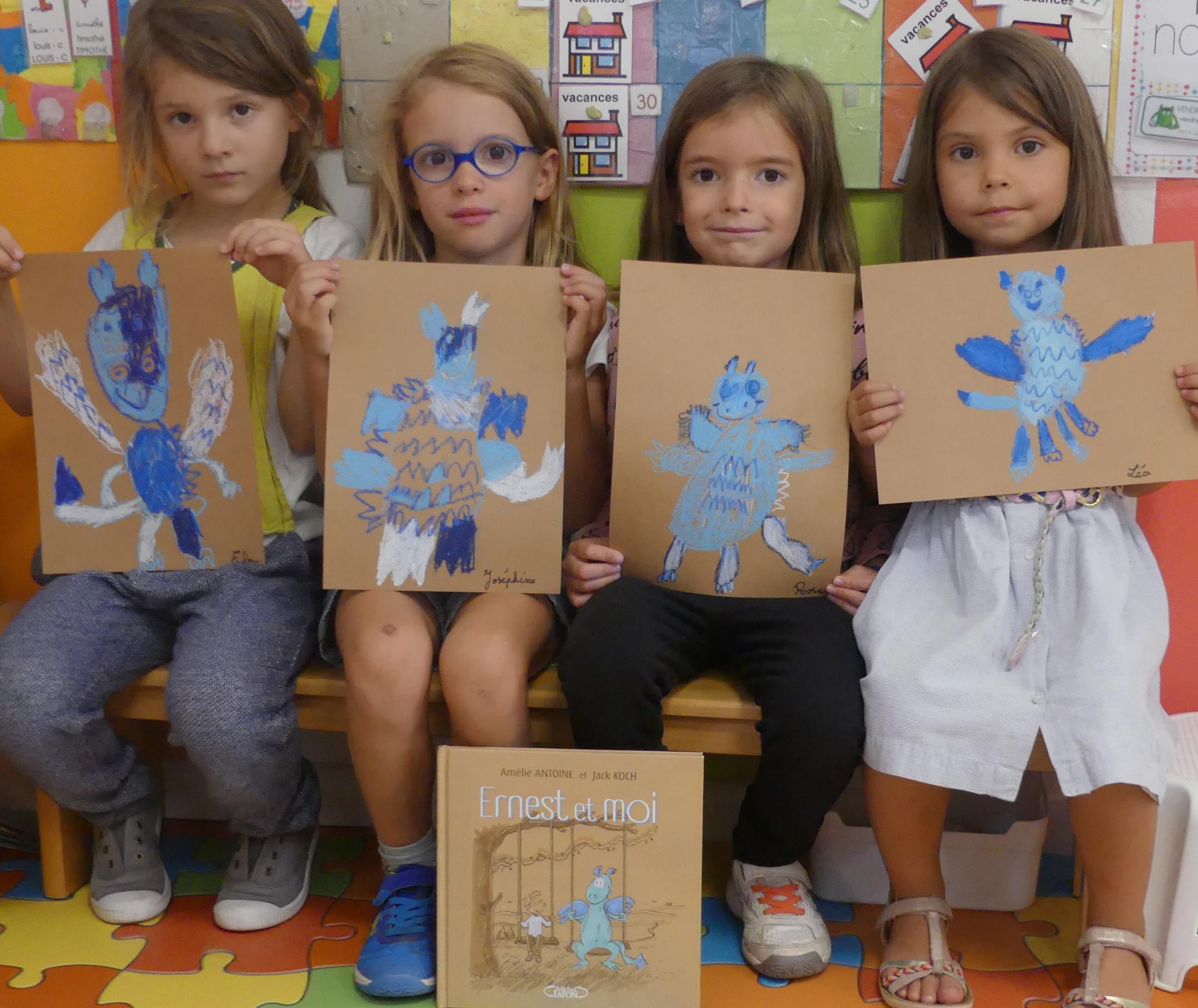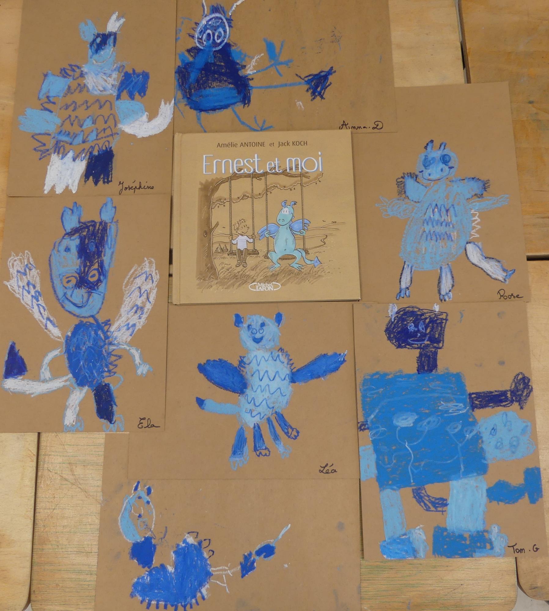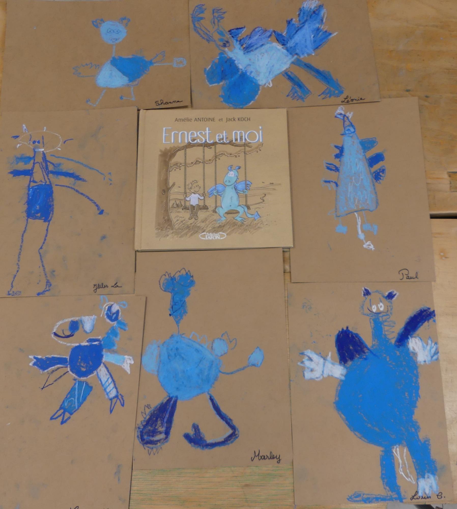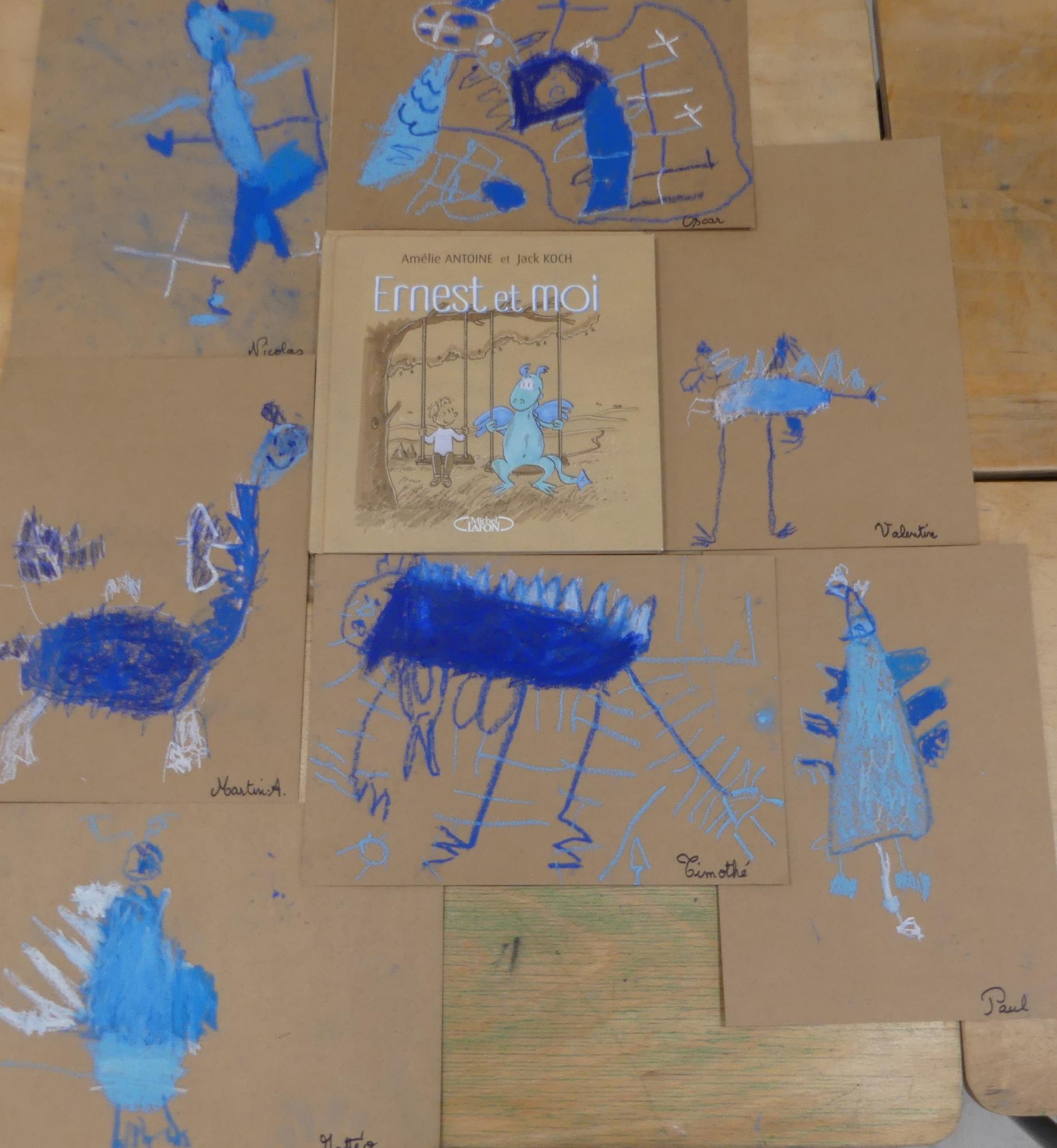 Comme album de rentrée, nous avons lu et travaillé "Ernest et moi". C'est l' histoire d'un petit garçon qui se retrouve seul après avoir déménagé. S'ennuyant, il s'invente un ami imaginaire : un petit dragon bleu qui devient vite grand pendant l'été. La rentrée arrive, Lucien a du mal à se faire des amis.. jusqu'à ce qu'il en trouve un et que son ami imaginaire ne lui soit plus utile.