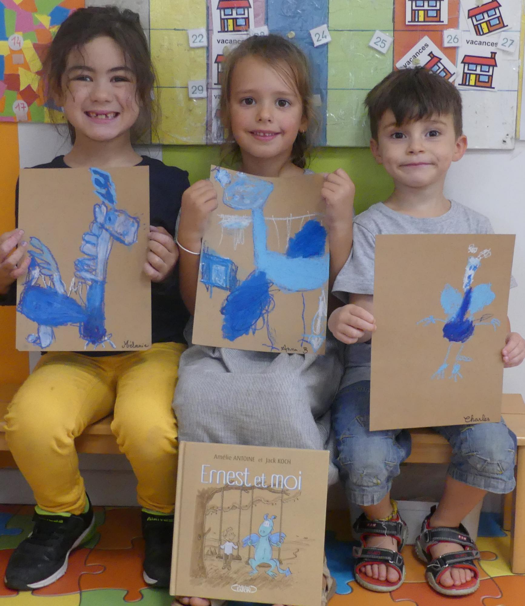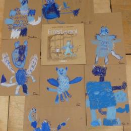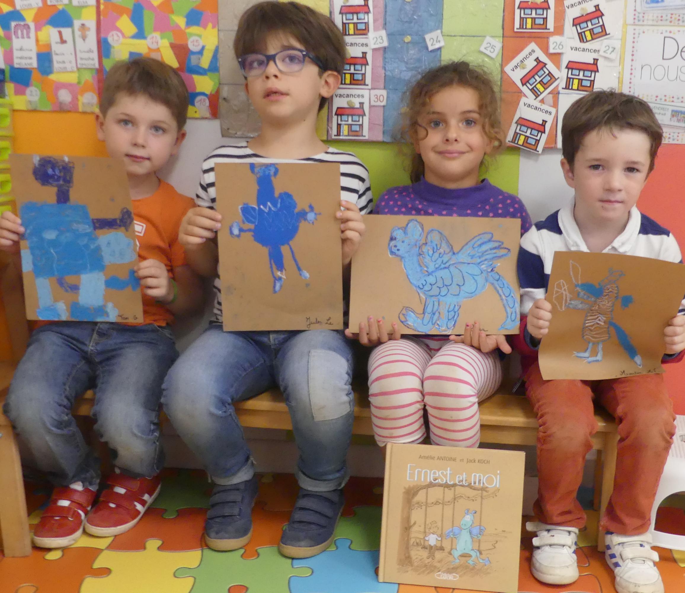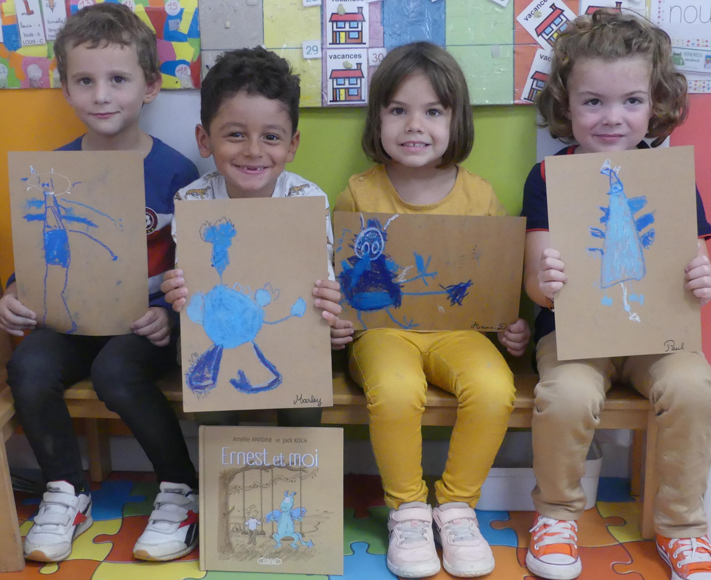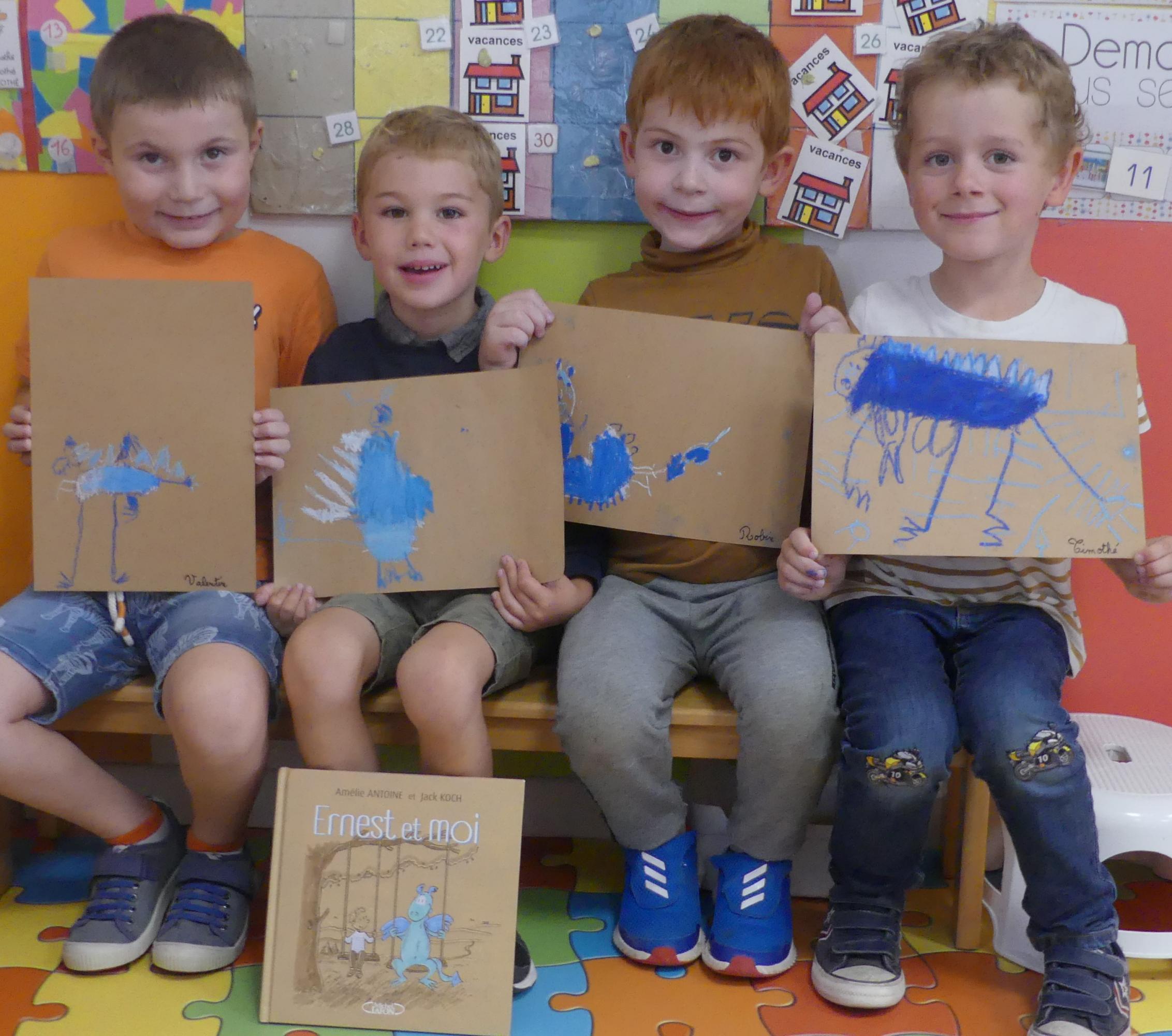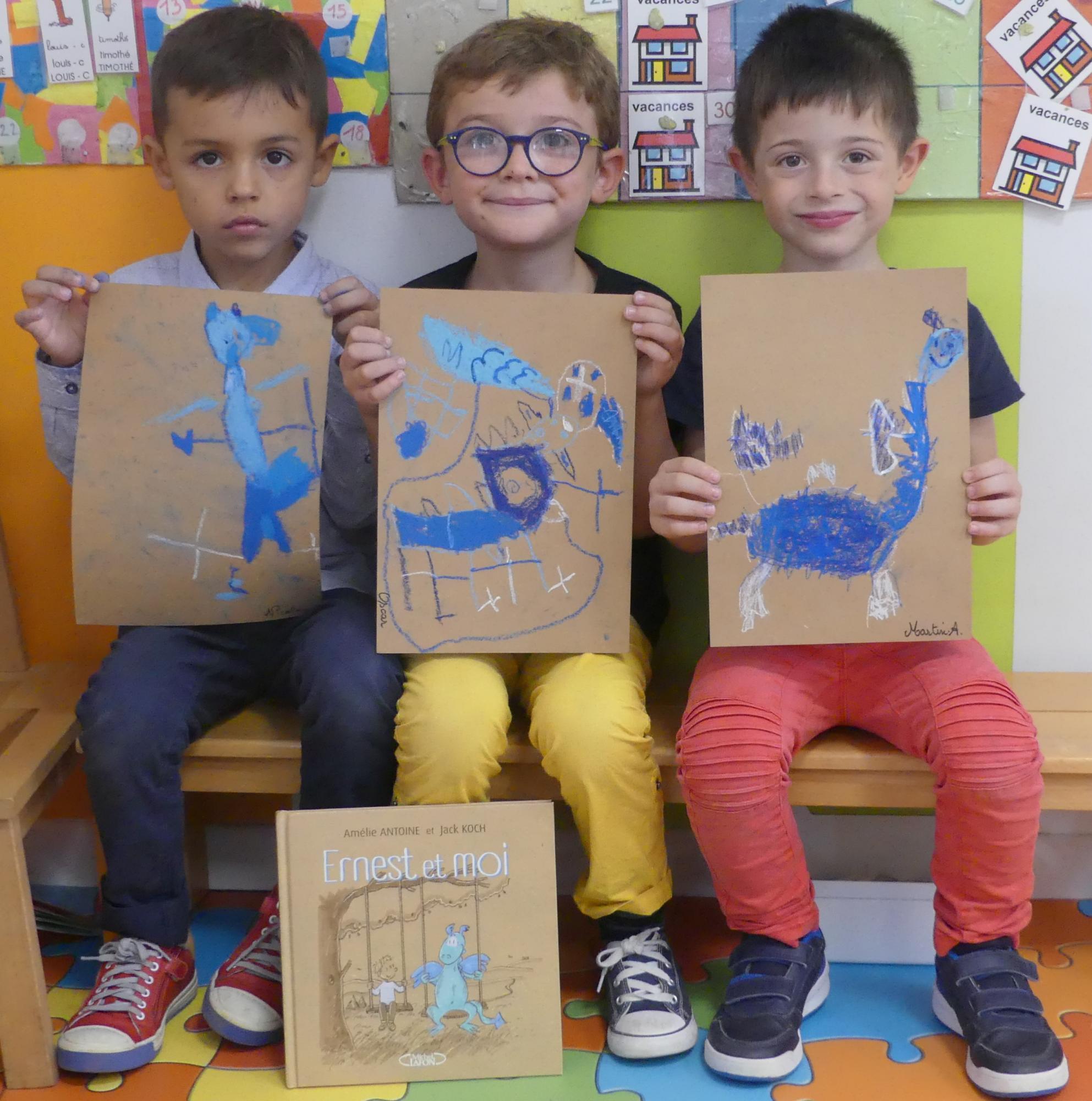 Comme album de rentrée, nous avons lu et travaillé "Ernest et moi". C'est l' histoire d'un petit garçon qui se retrouve seul après avoir déménagé. S'ennuyant, il s'invente un ami imaginaire : un petit dragon bleu qui devient vite grand pendant l'été. La rentrée arrive, Lucien a du mal à se faire des amis.. jusqu'à ce qu'il en trouve un et que son ami imaginaire ne lui soit plus utile.