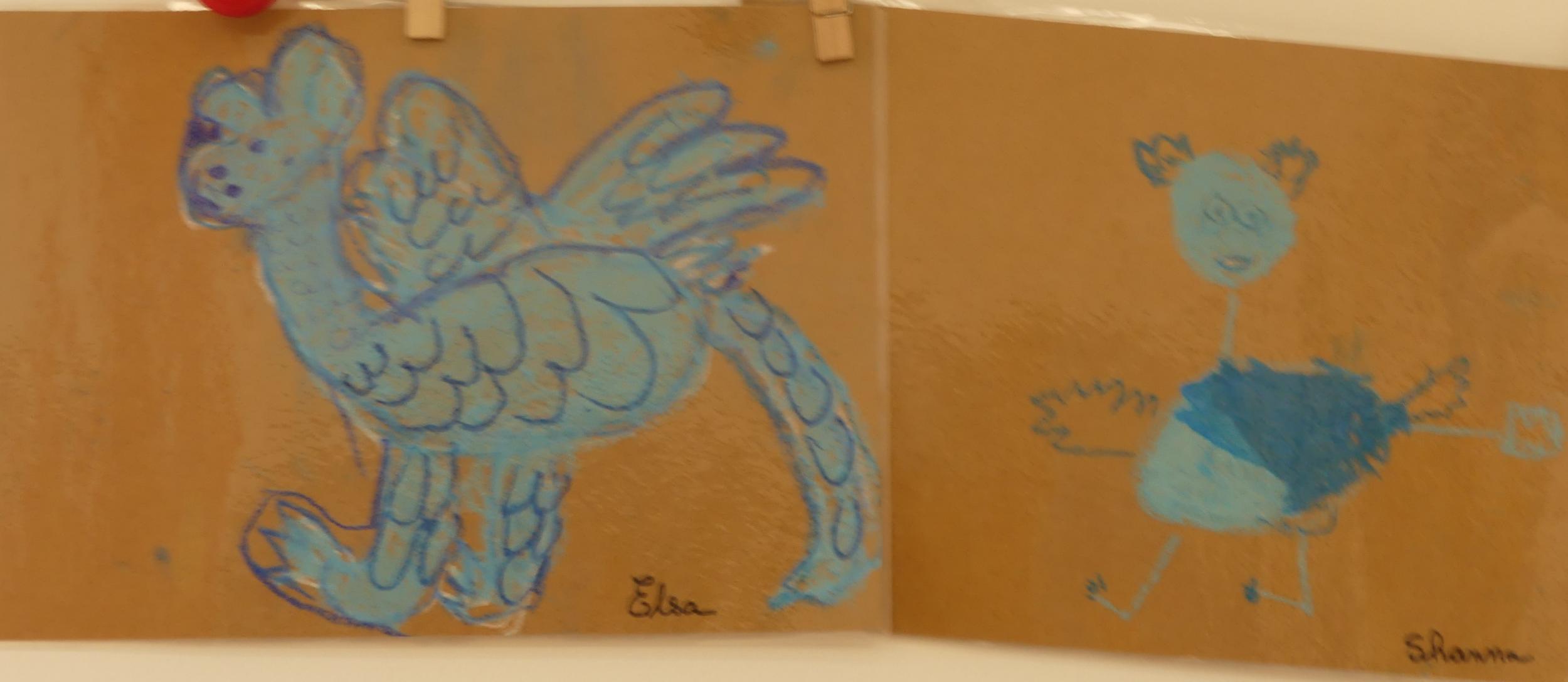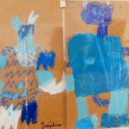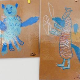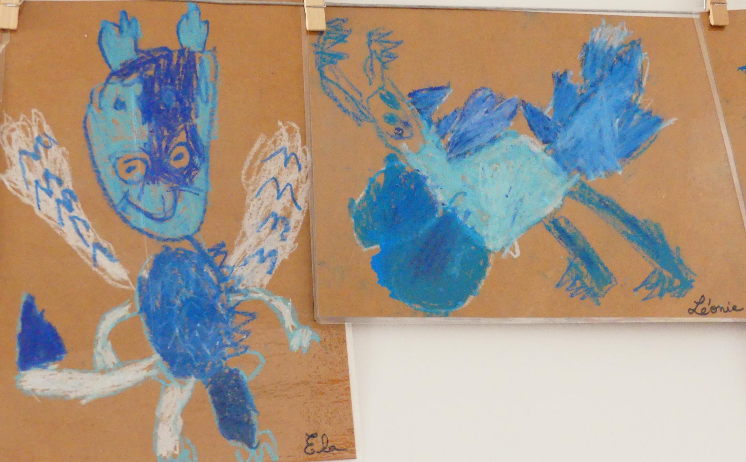 J'ai alors proposé aux élèves, d'établir la carte mentale du dragon pour connaitre ses caractéristiques et savoir comment le dessiner. Ensuite, nous avons pris une feuille de kraft, des pastels gras dans divers tons de bleus et blanc, et chacun a dessiné son dragon bleu, à la façon de Jack Koch!