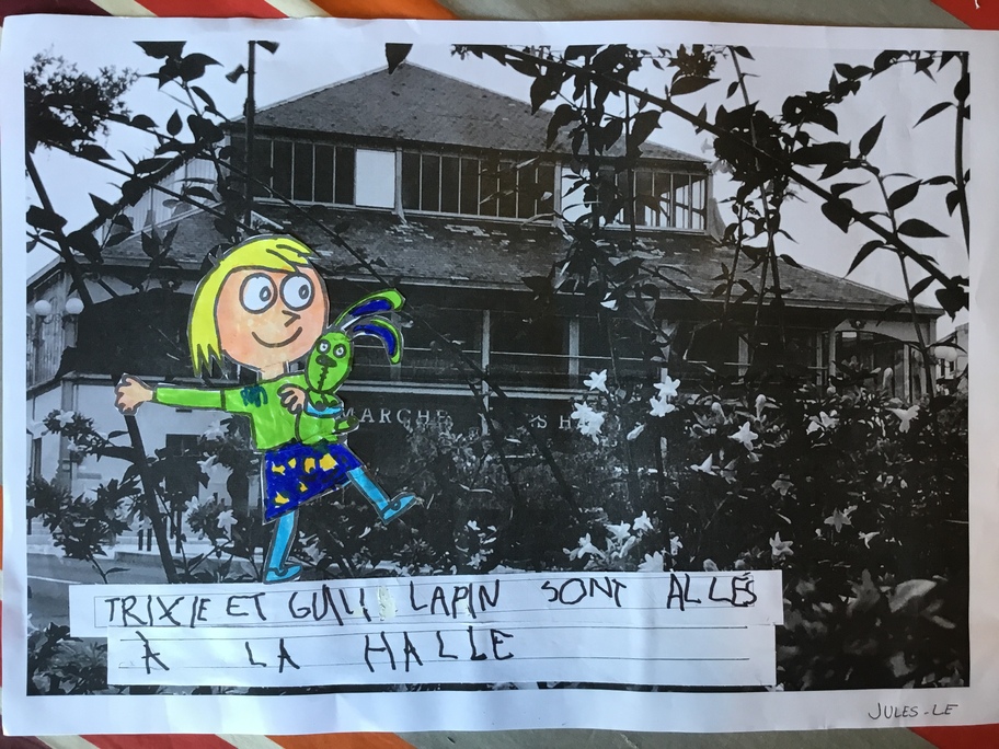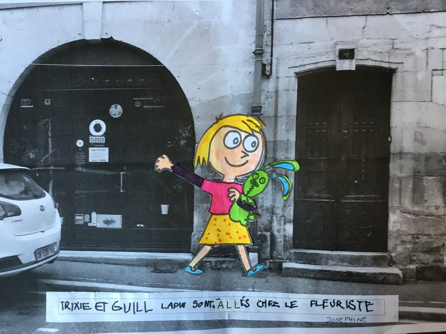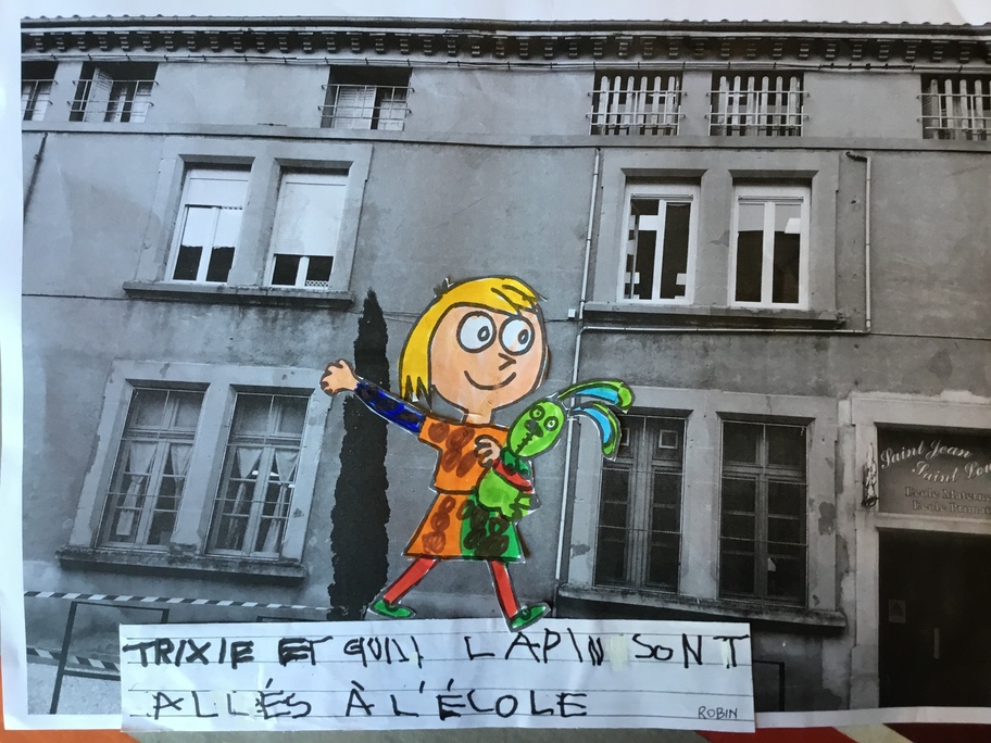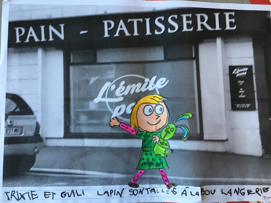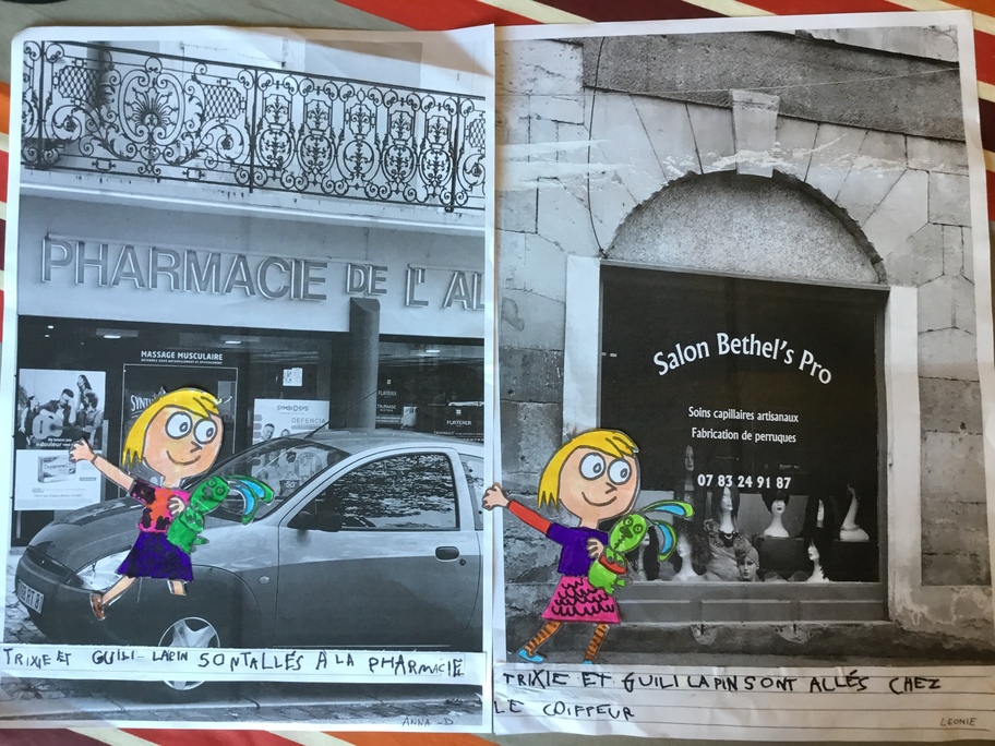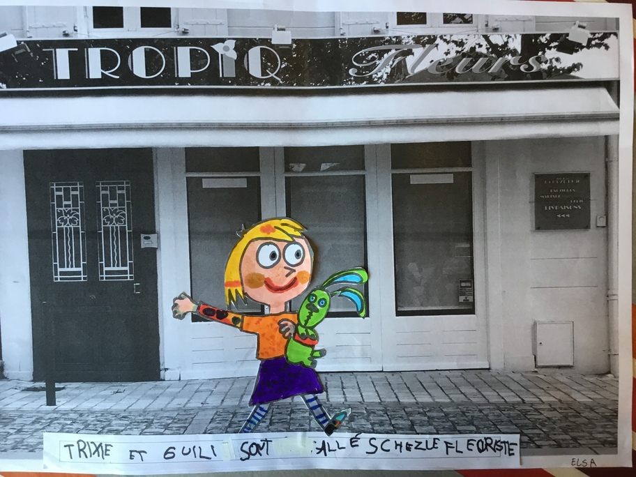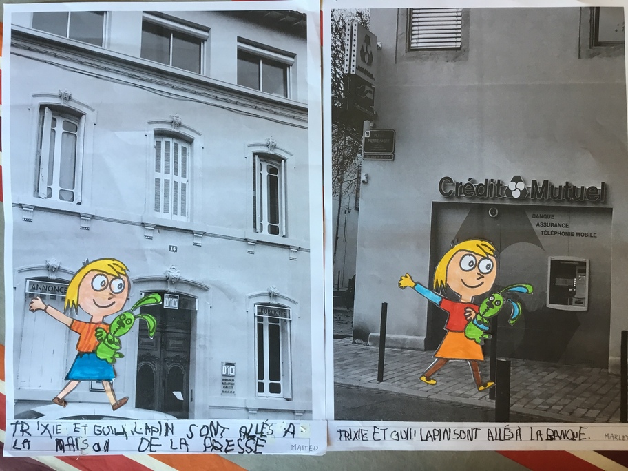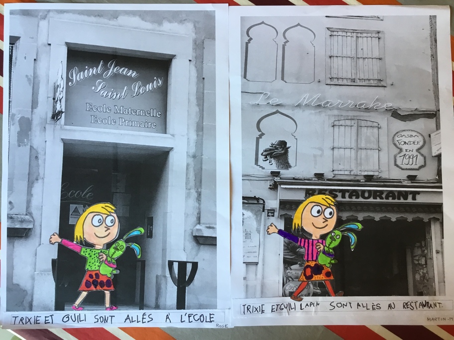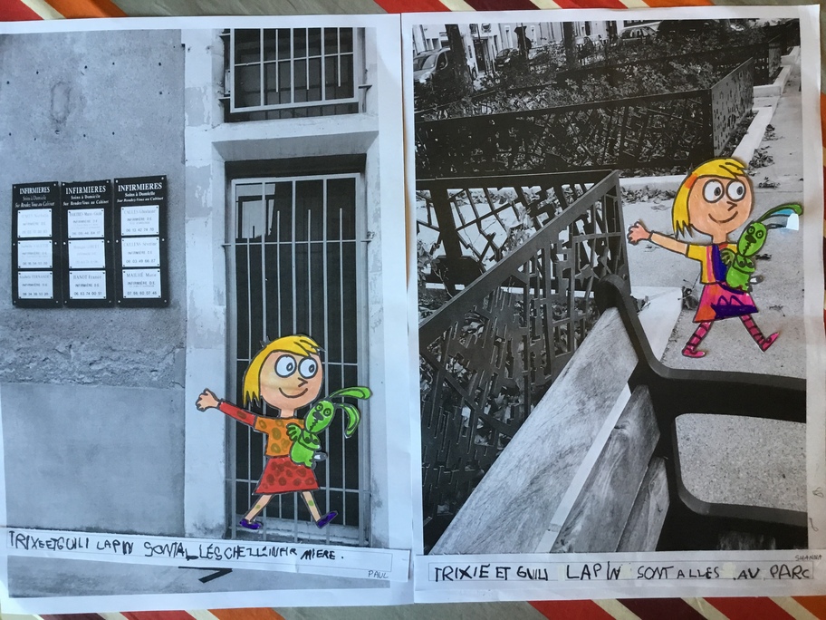 Puis chaque élève a colorié Trixie en respectant le code de l'album (sauf pour les vêtements) puis la collé sur sa photo et à copié une phrase indiquant où la scène se passe.