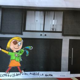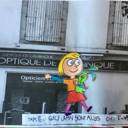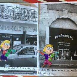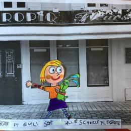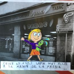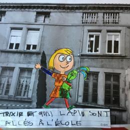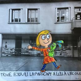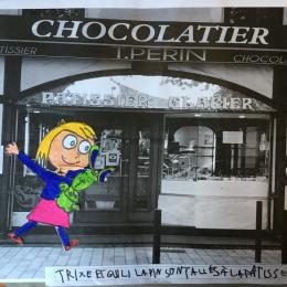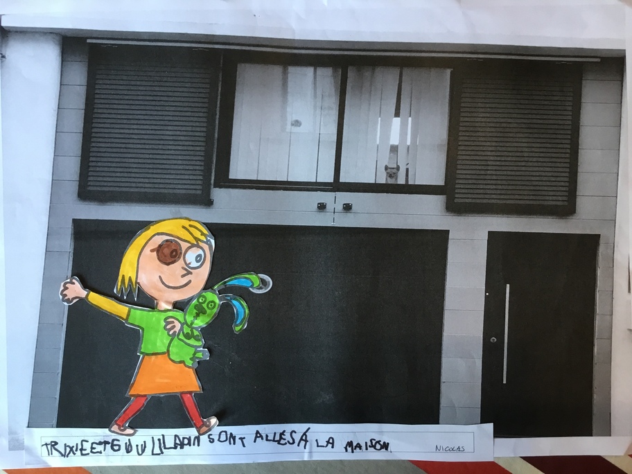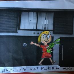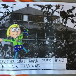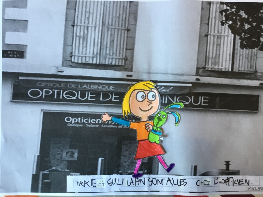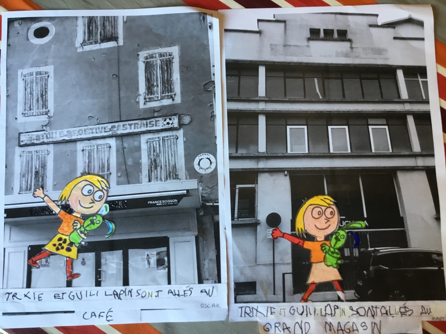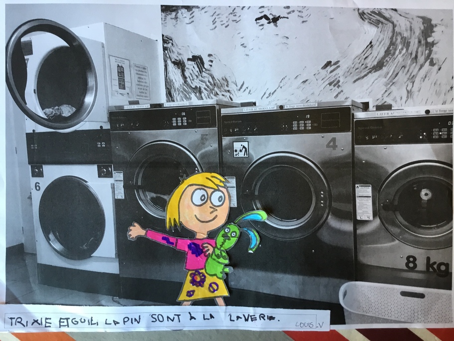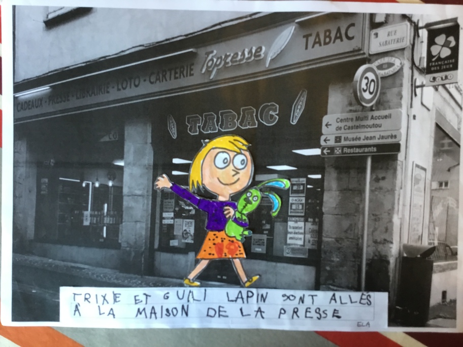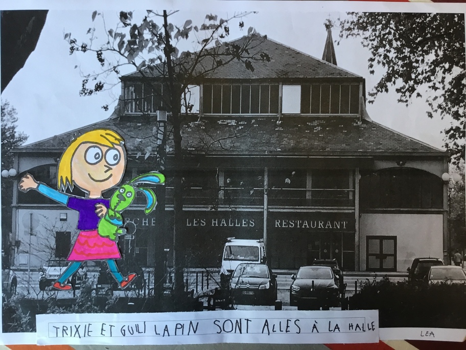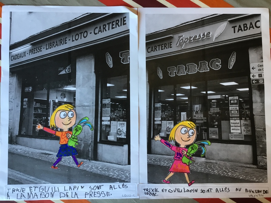 Puis chaque élève a colorié Trixie en respectant le code de l'album (sauf pour les vêtements) puis la collé sur sa photo et à copié une phrase indiquant où la scène se passe.