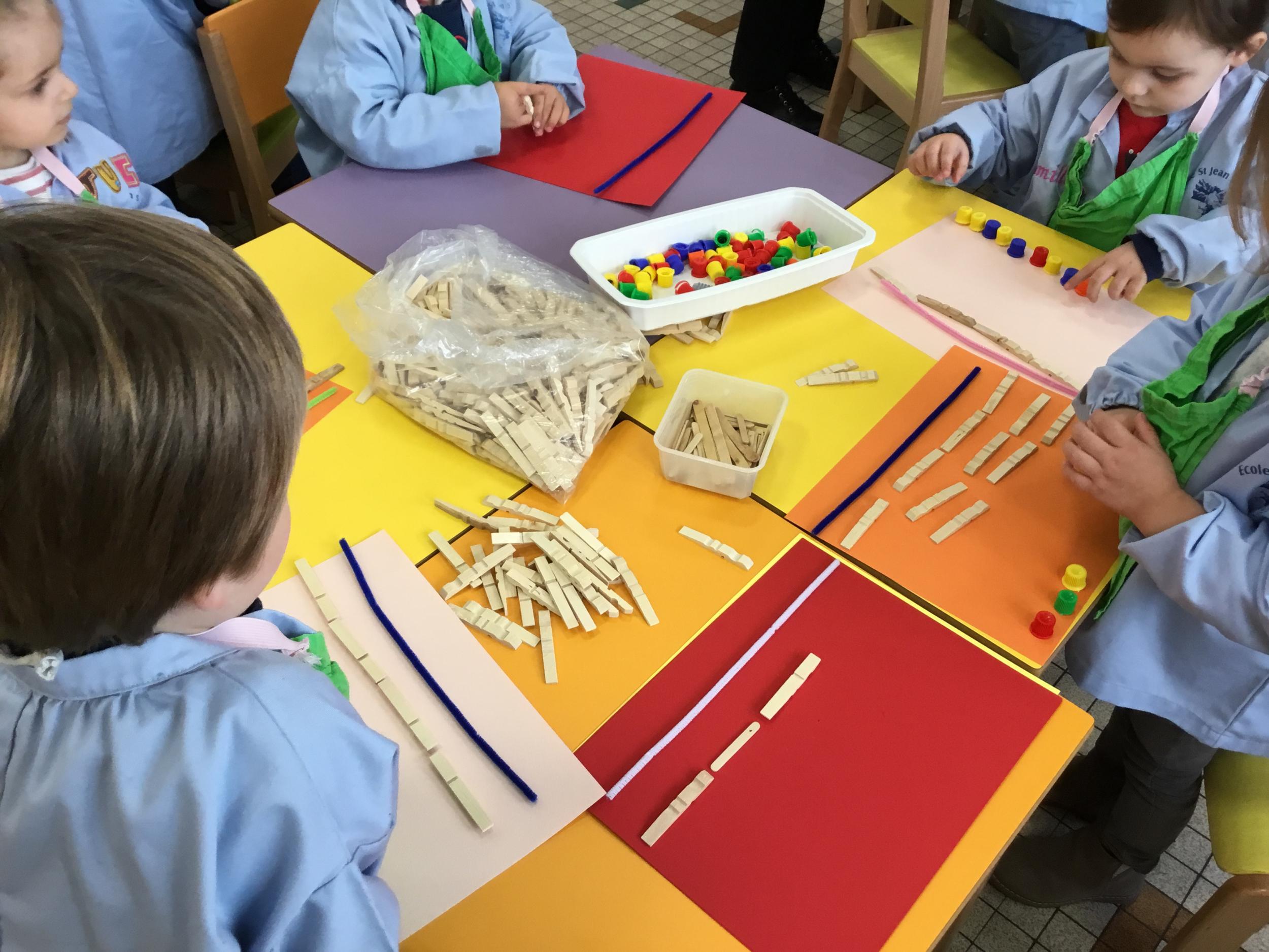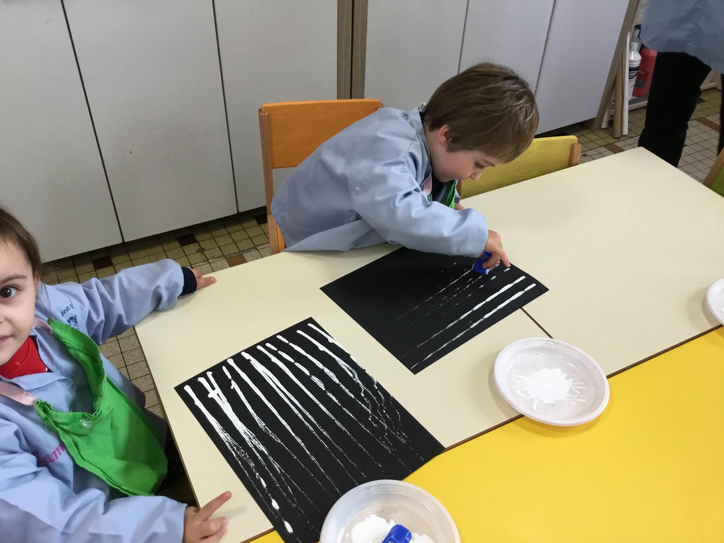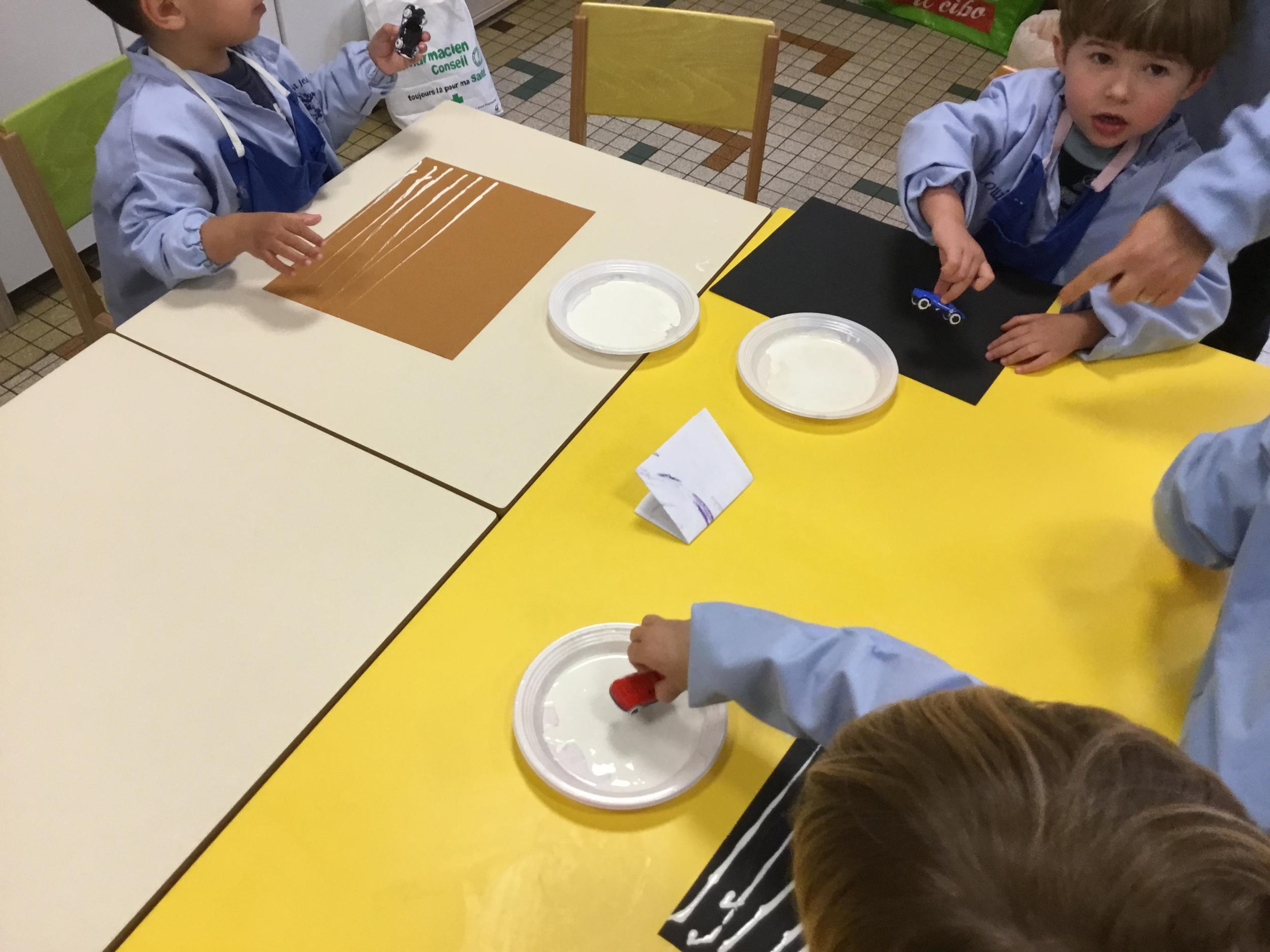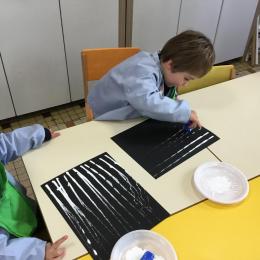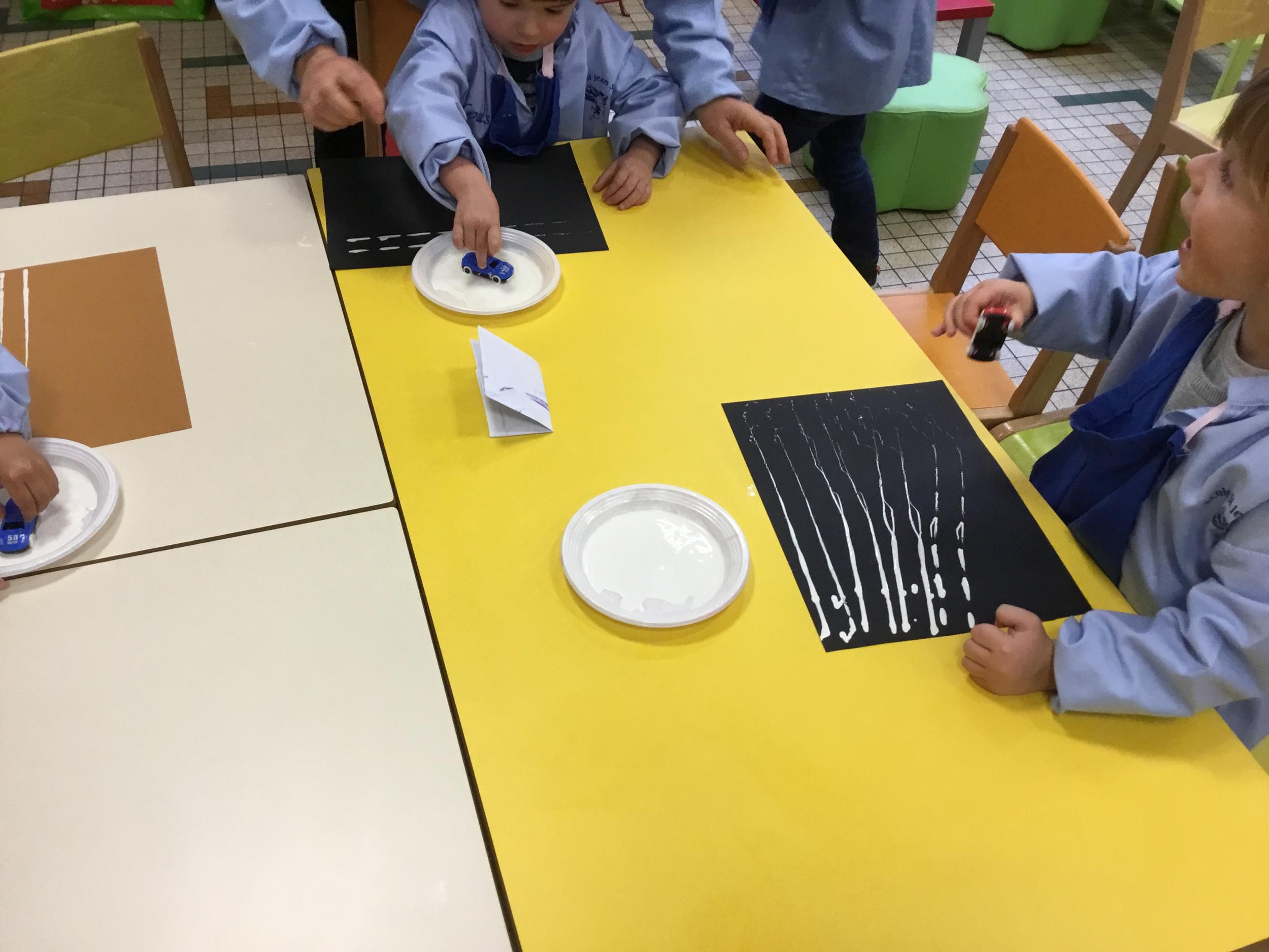 Cette période les élèves vont travailler sur le trait horizontal. Pour commencer, ils doivent appréhender le sens de l'écrit de la gauche vers la droite. Pour cela, ils ont travaillé le geste en faisant rouler, sur une feuille noire, des petites voitures trempées dans de la peinture blanche. Ils ont également aligné des objets sur des feuilles de couleur.