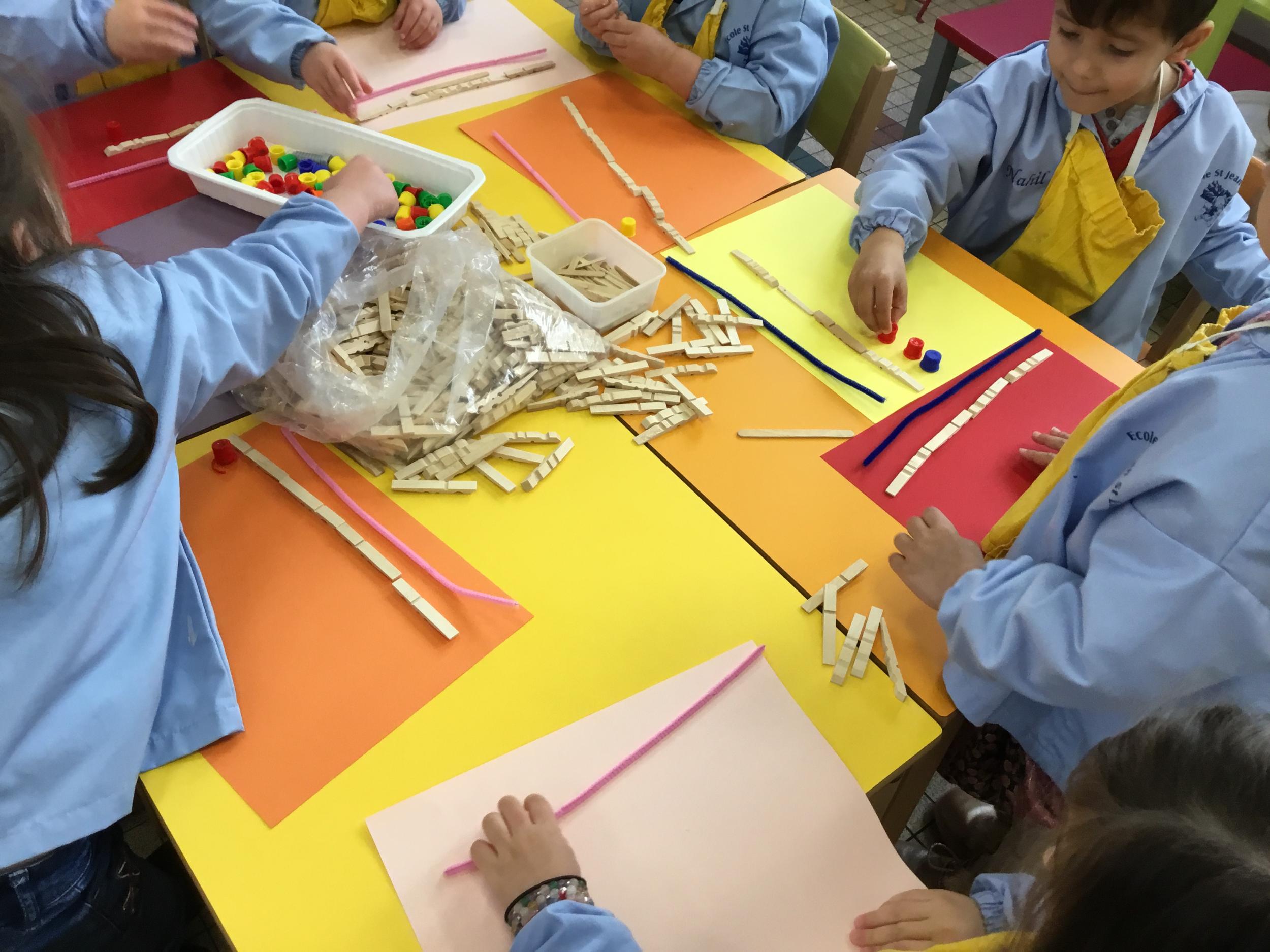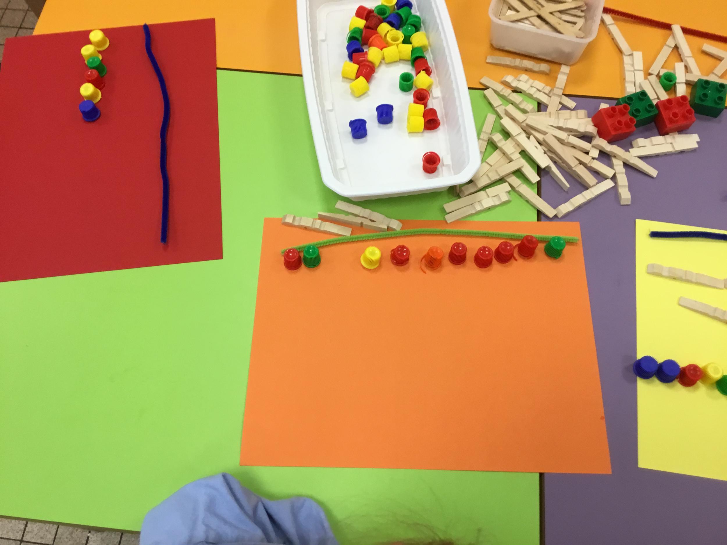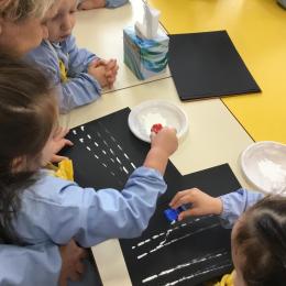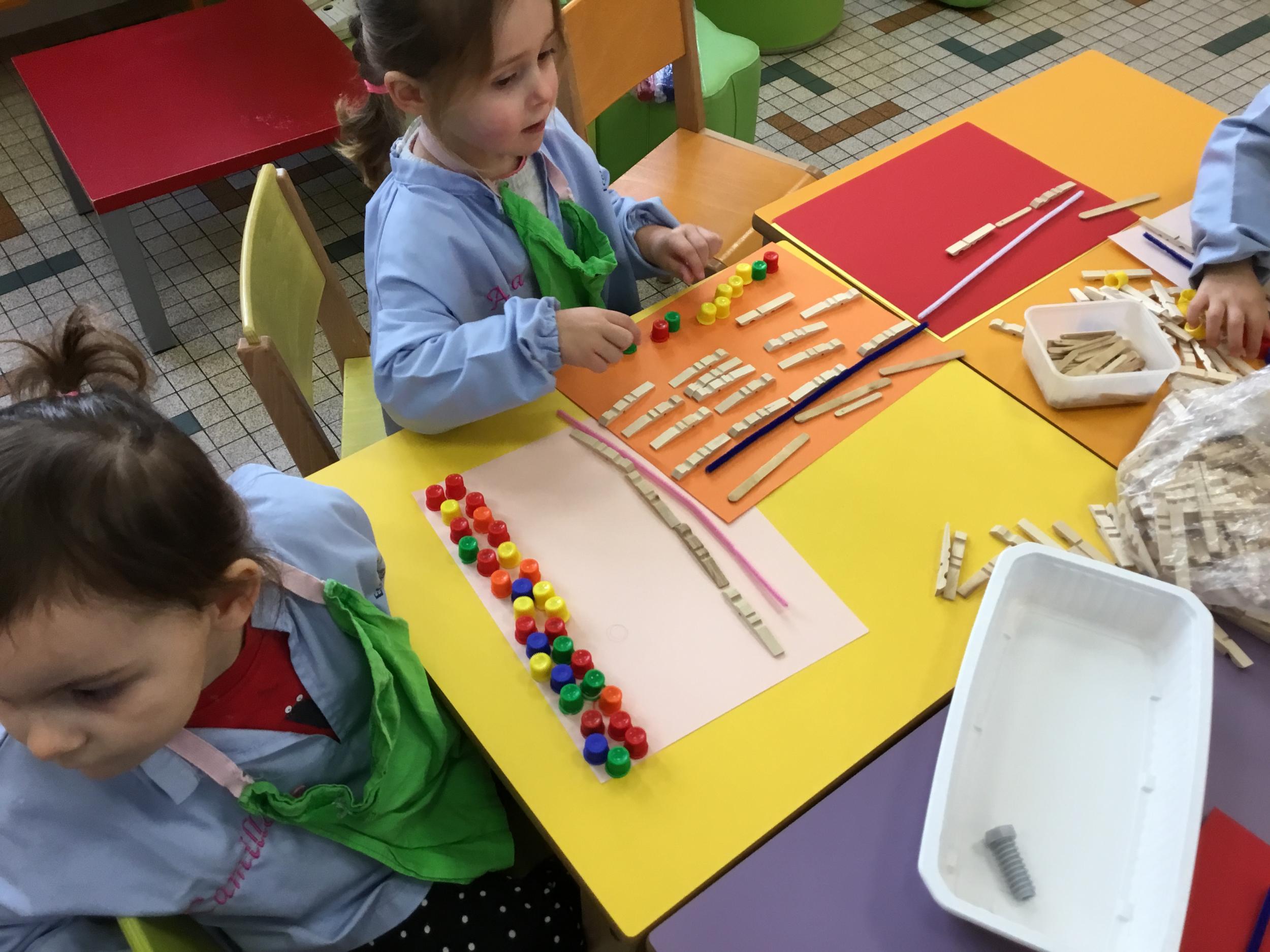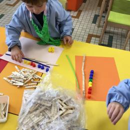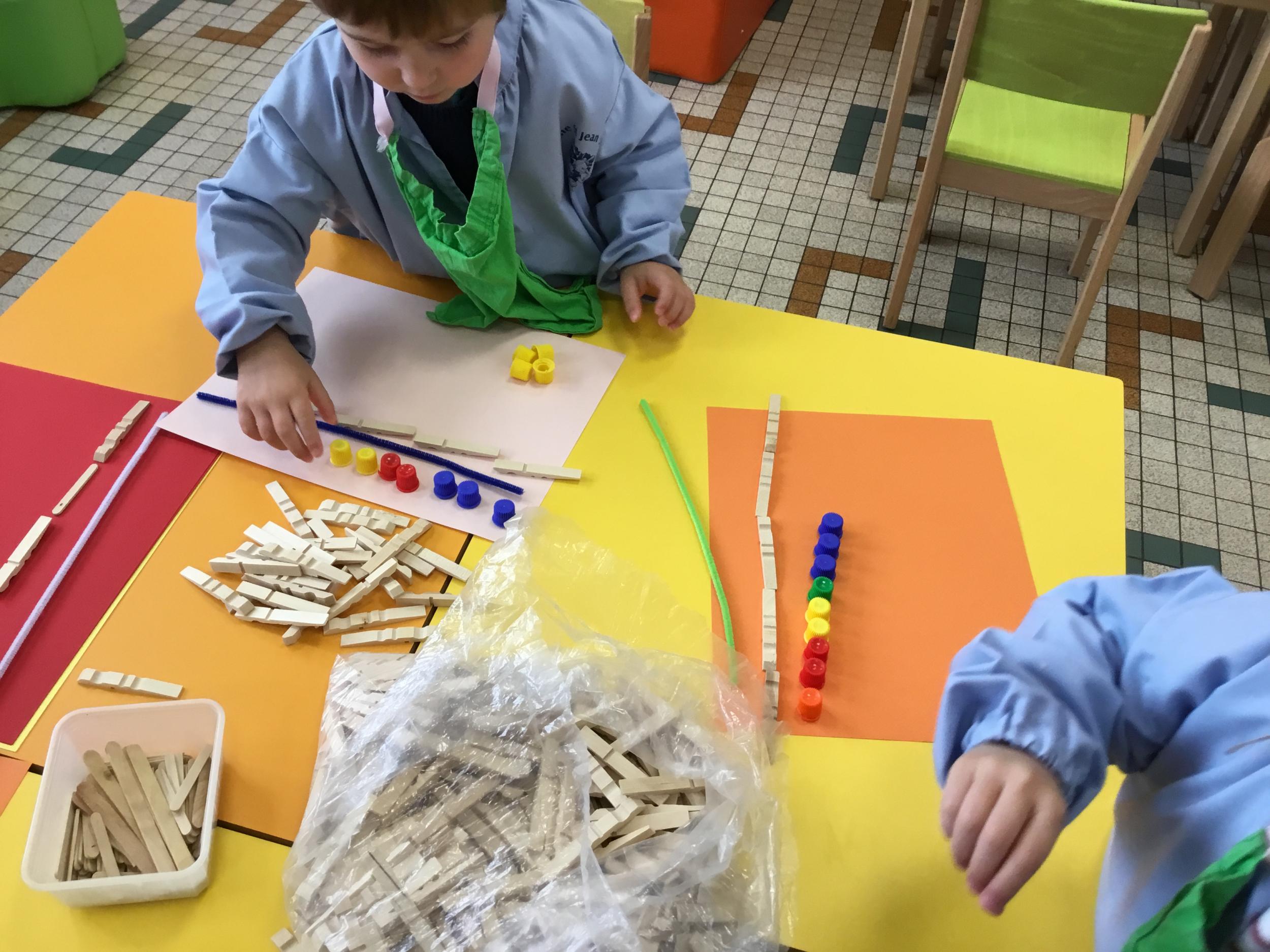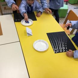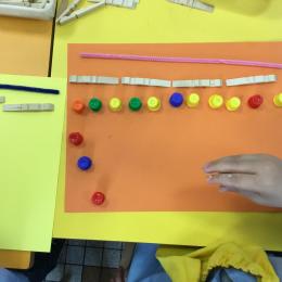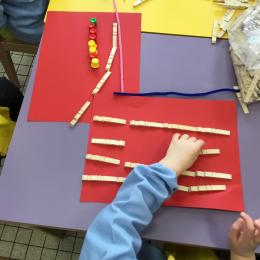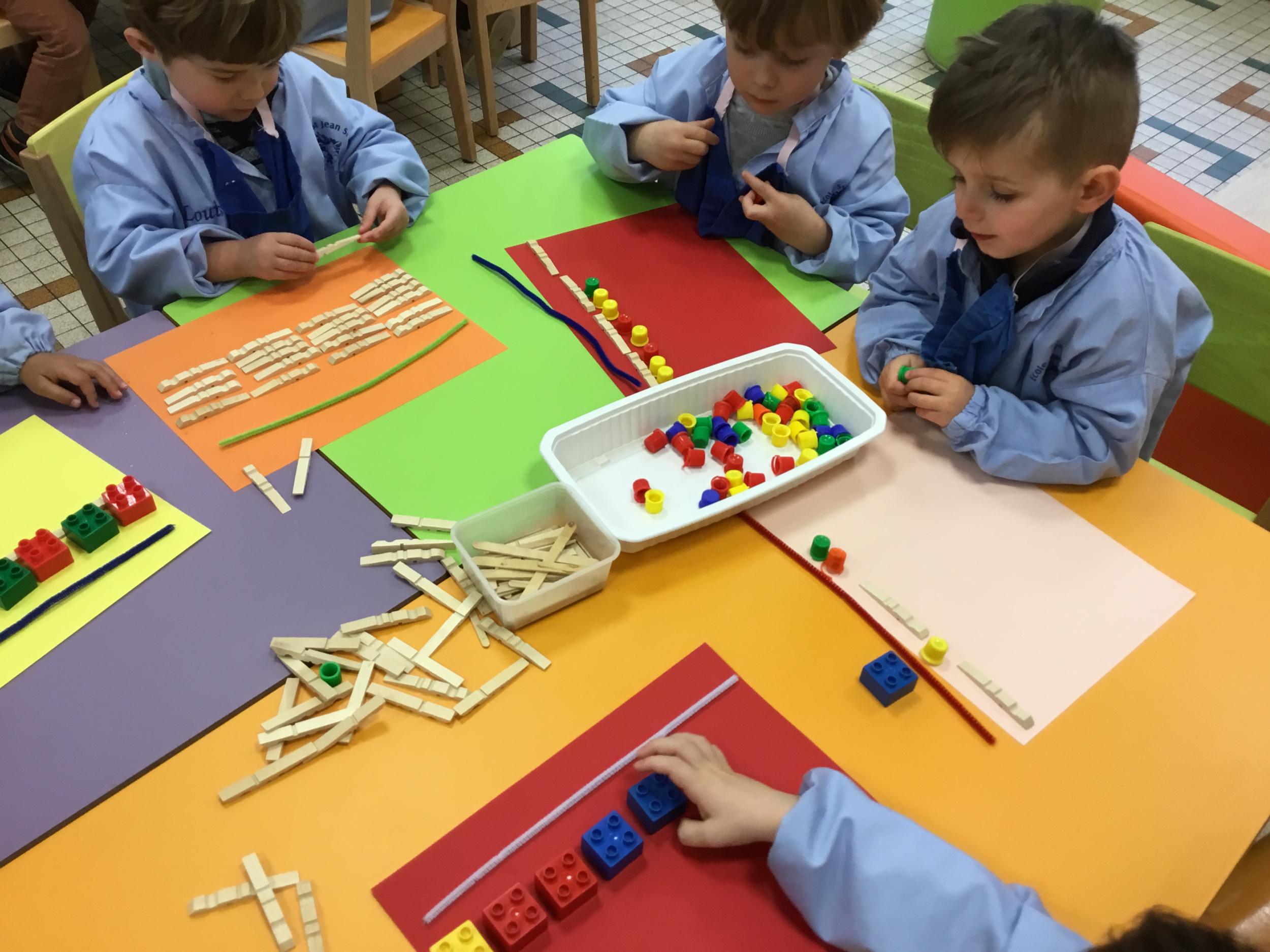 Cette période les élèves vont travailler sur le trait horizontal. Pour commencer, ils doivent appréhender le sens de l'écrit de la gauche vers la droite. Pour cela, ils ont travaillé le geste en faisant rouler, sur une feuille noire, des petites voitures trempées dans de la peinture blanche. Ils ont également aligné des objets sur des feuilles de couleur.