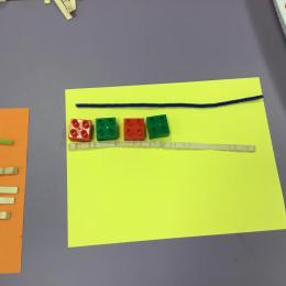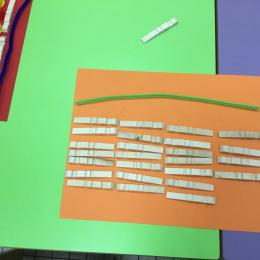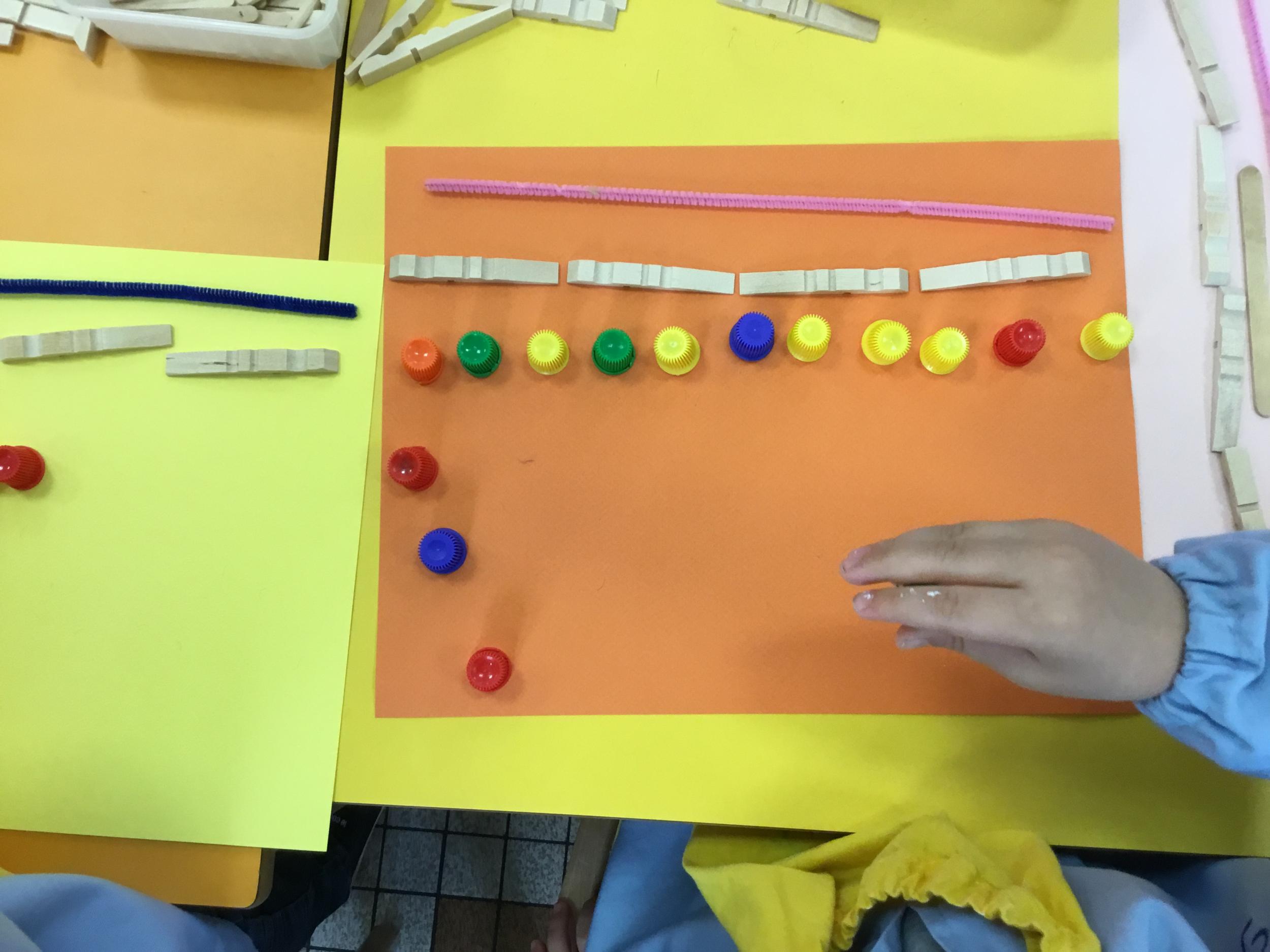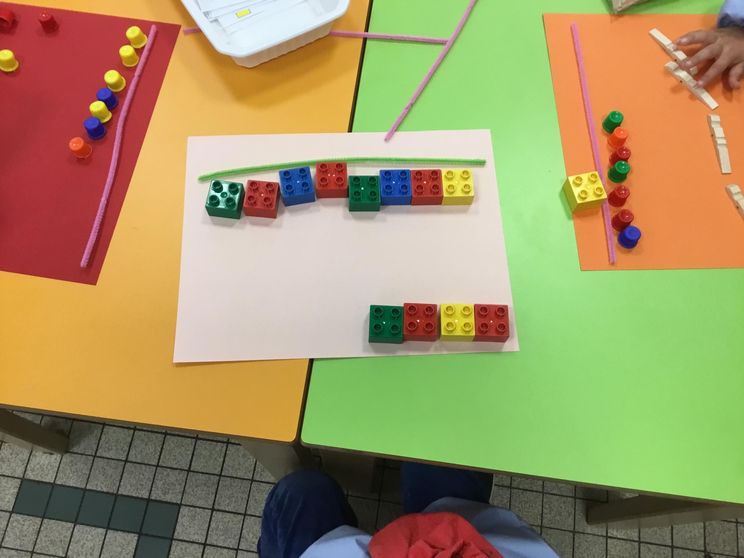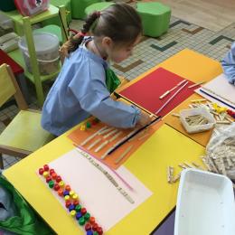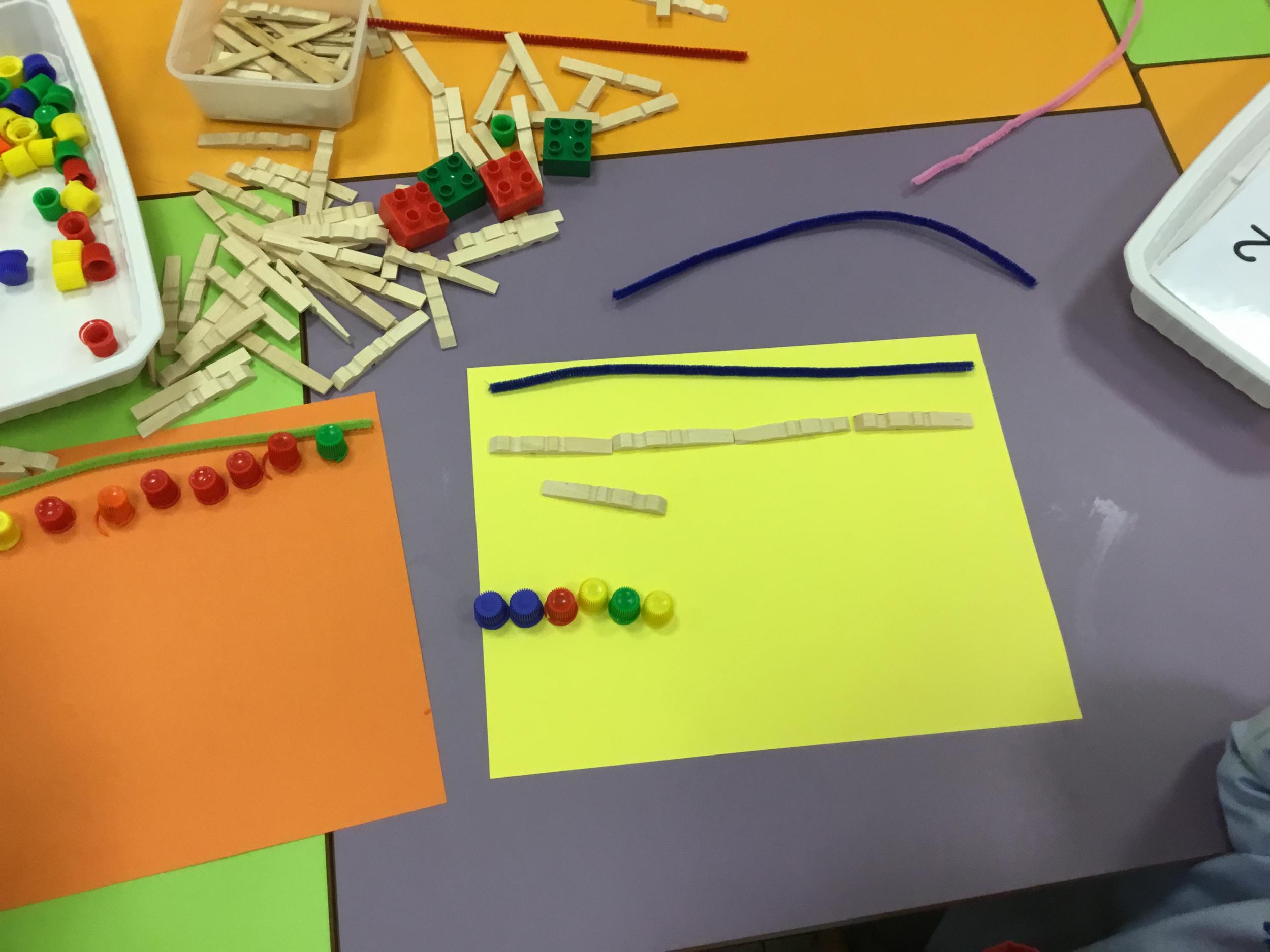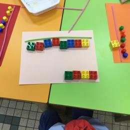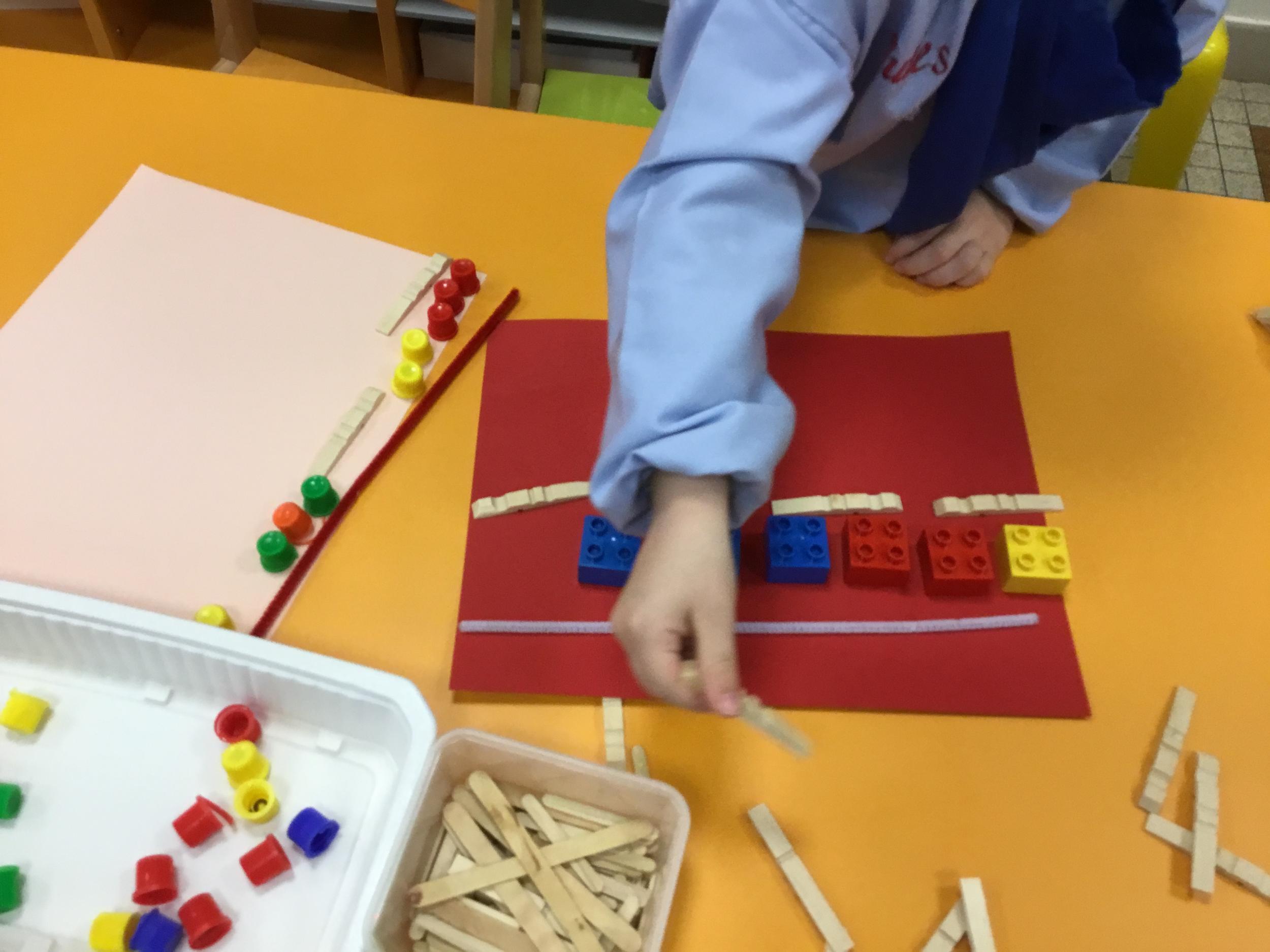 Cette période les élèves vont travailler sur le trait horizontal. Pour commencer, ils doivent appréhender le sens de l'écrit de la gauche vers la droite. Pour cela, ils ont travaillé le geste en faisant rouler, sur une feuille noire, des petites voitures trempées dans de la peinture blanche. Ils ont également aligné des objets sur des feuilles de couleur.