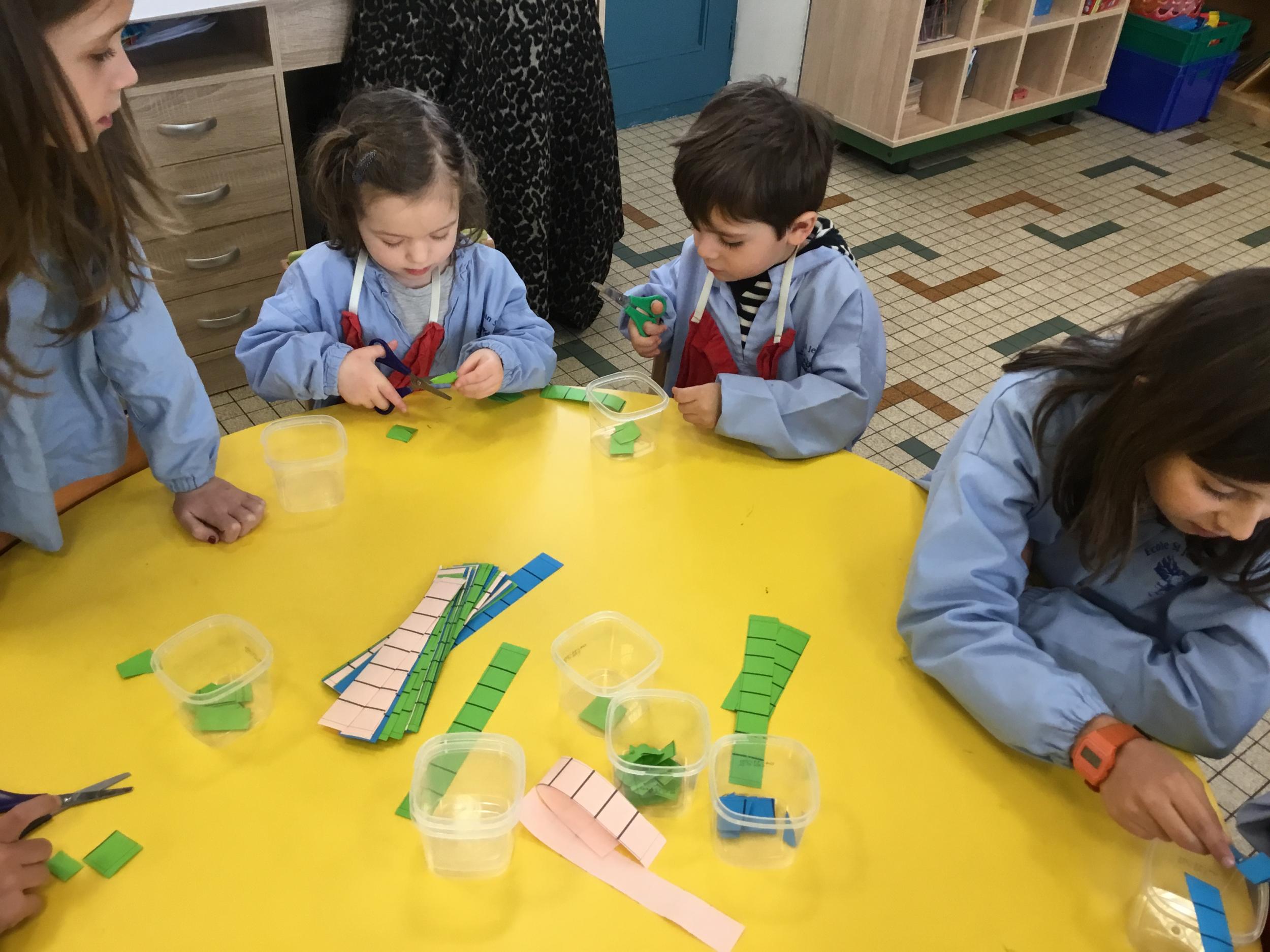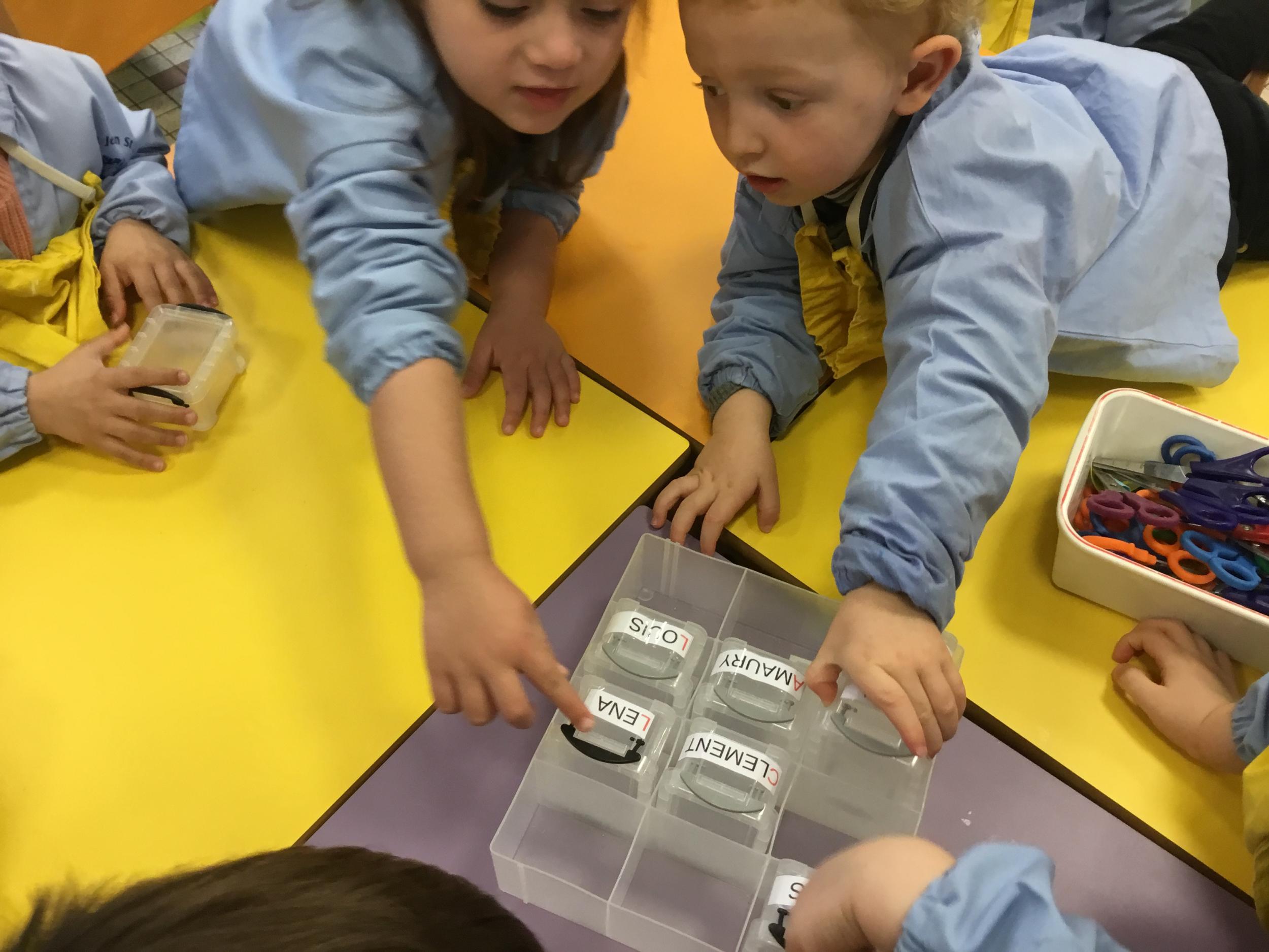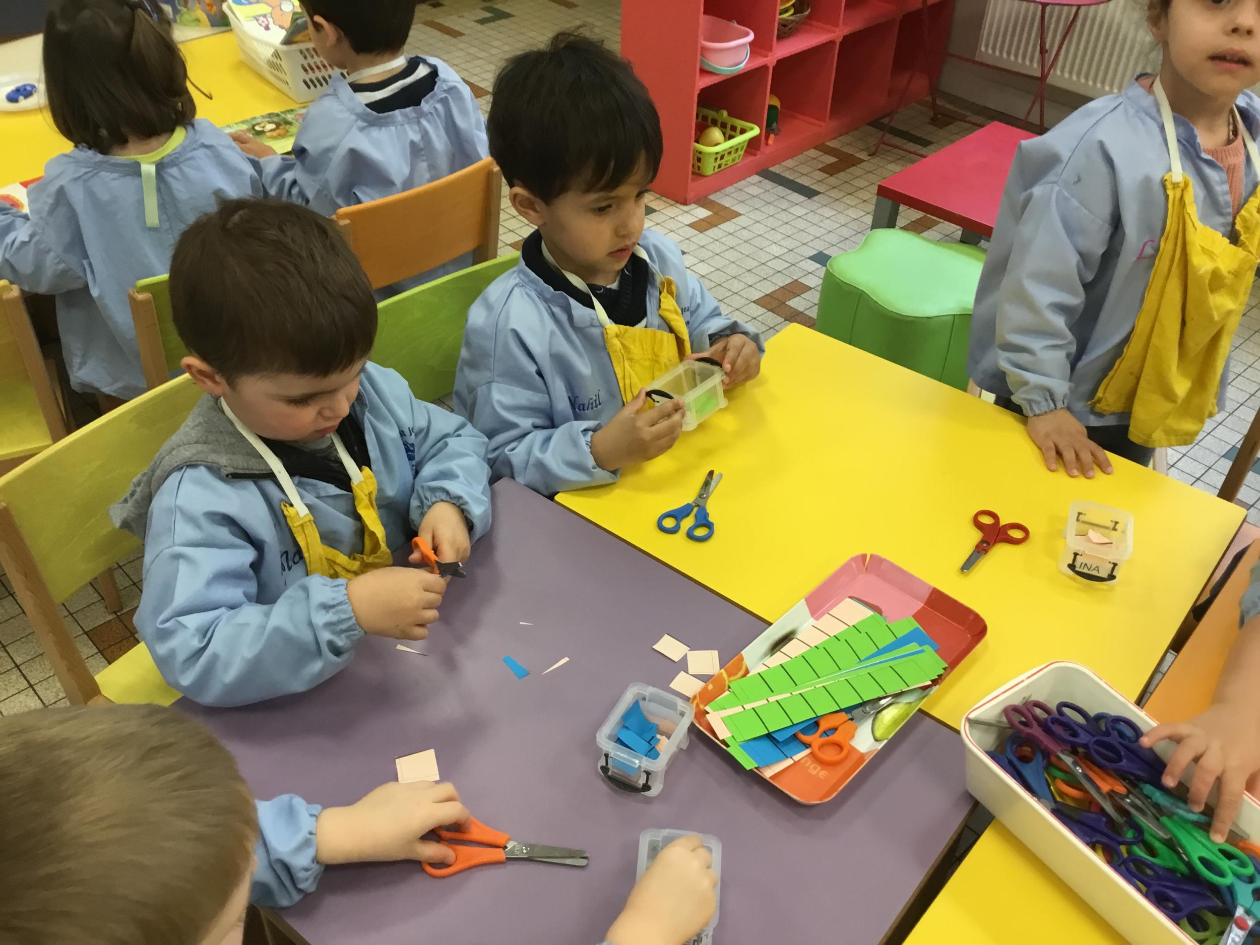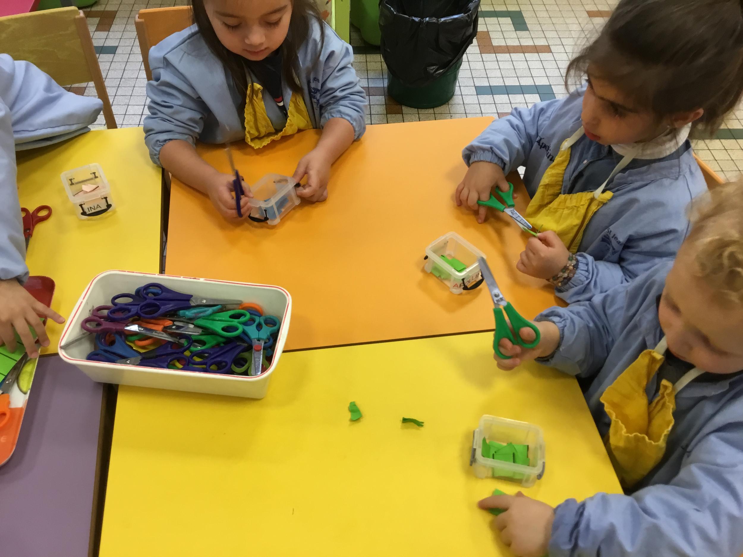 En autonomie, ils ont continué leur apprentissage du découpage. Les petits bouts de papier découpés ont ensuite été rangés dans une petite boîte portant leur prénom.