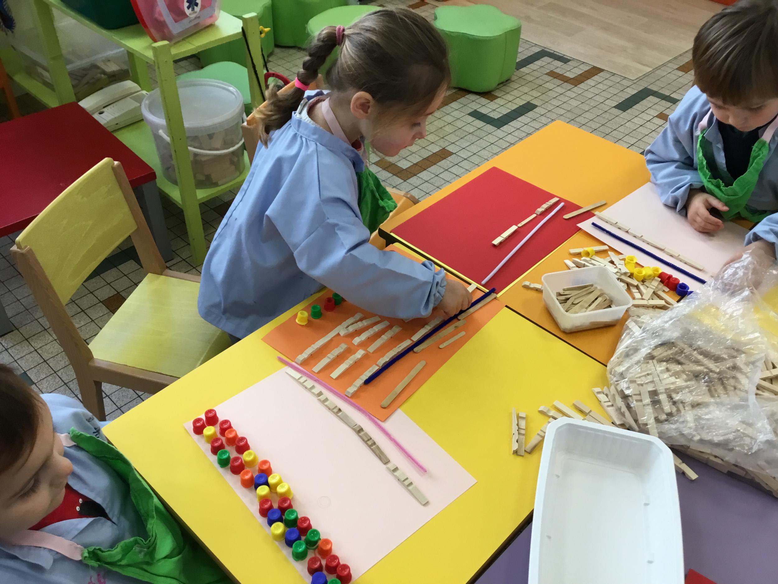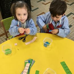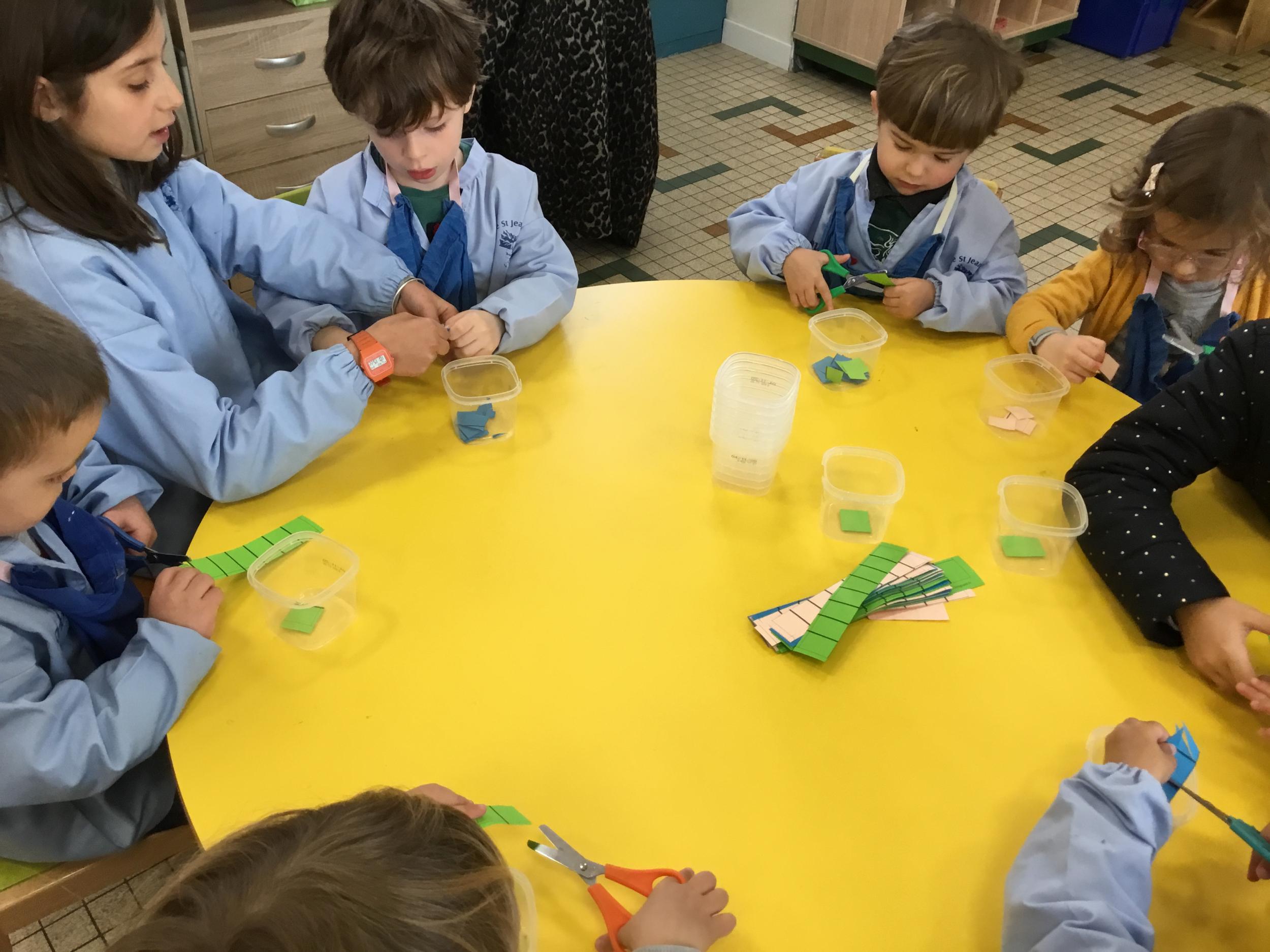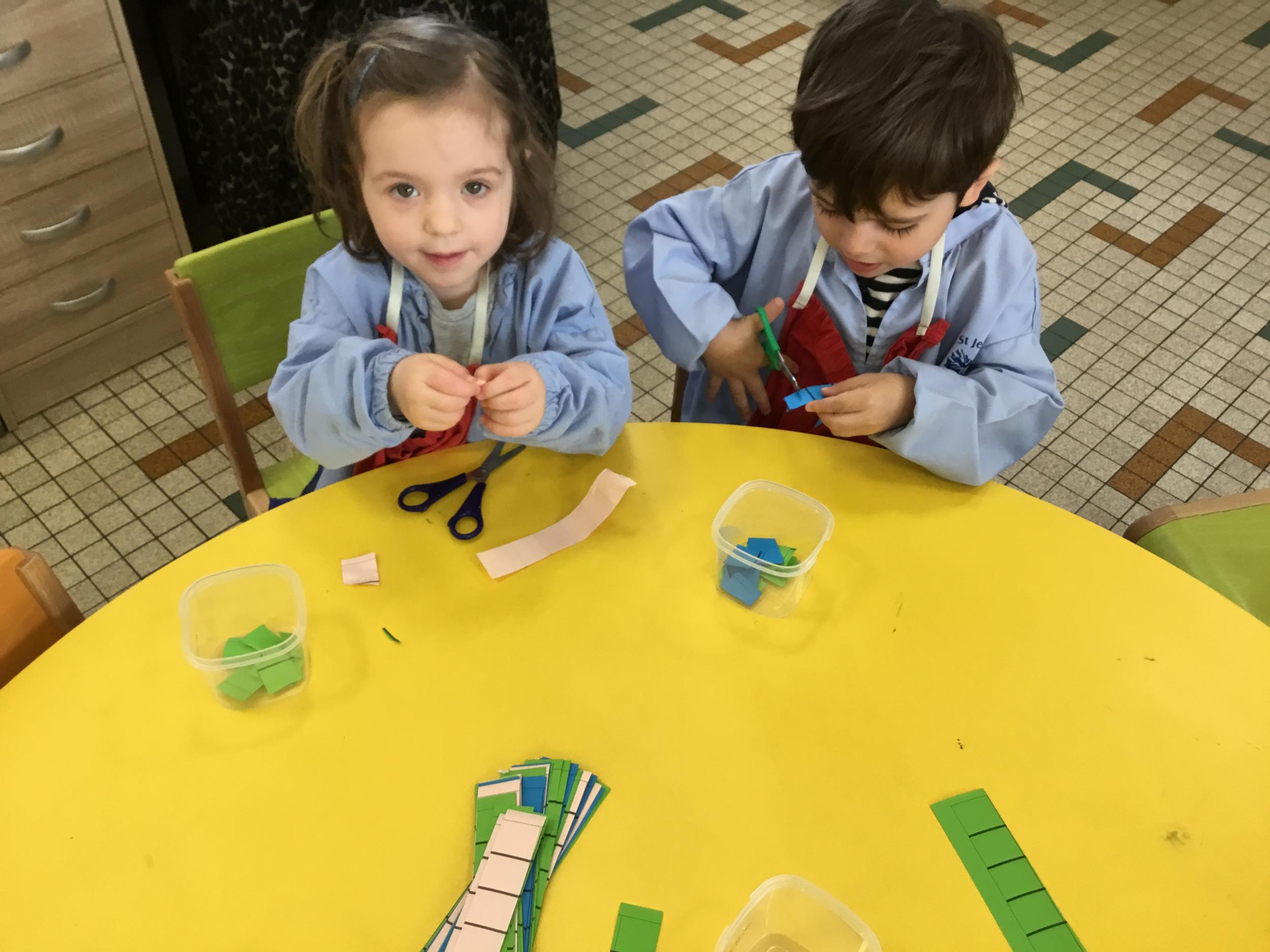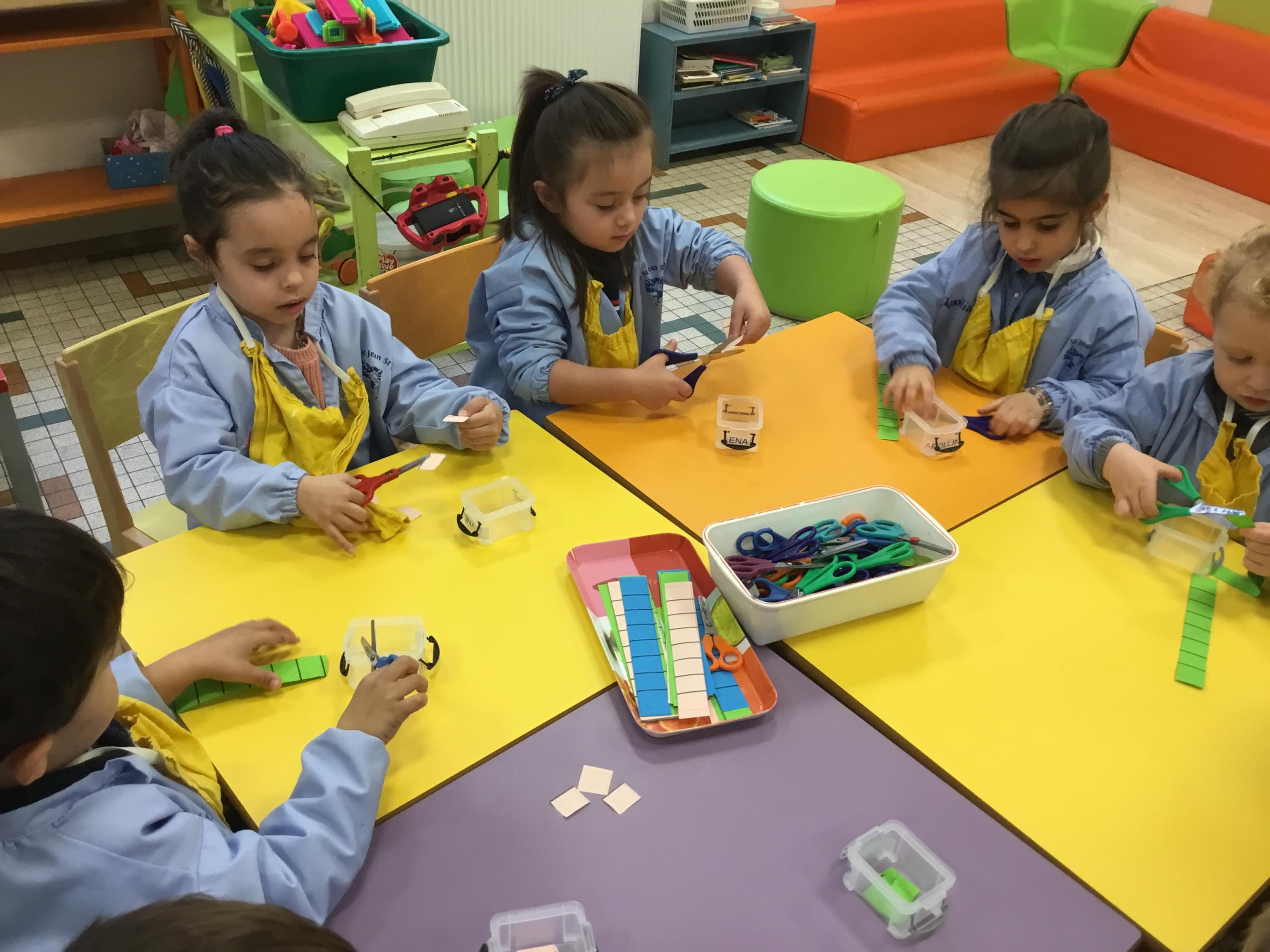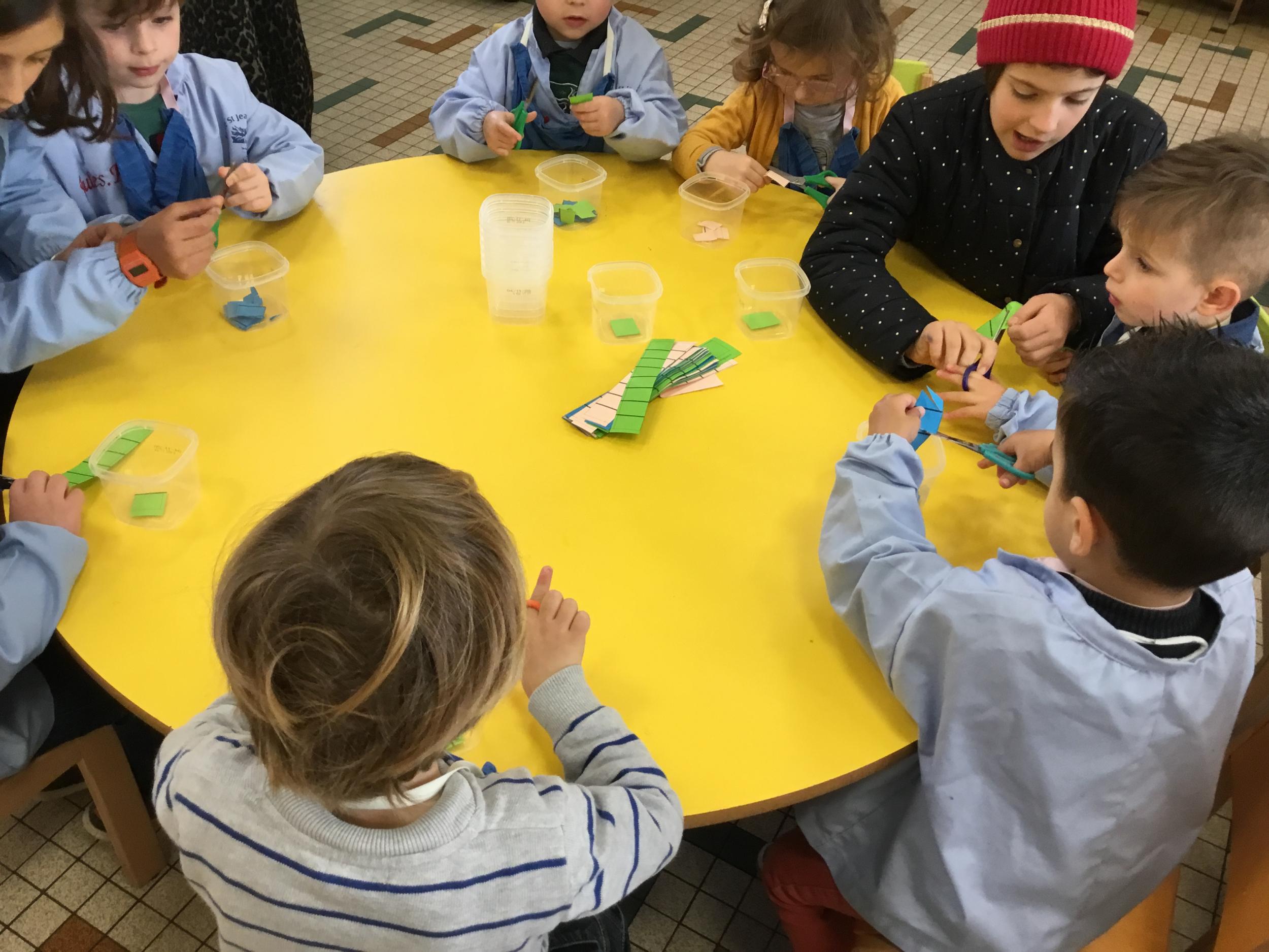 En autonomie, ils ont continué leur apprentissage du découpage. Les petits bouts de papier découpés ont ensuite été rangés dans une petite boîte portant leur prénom.