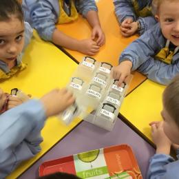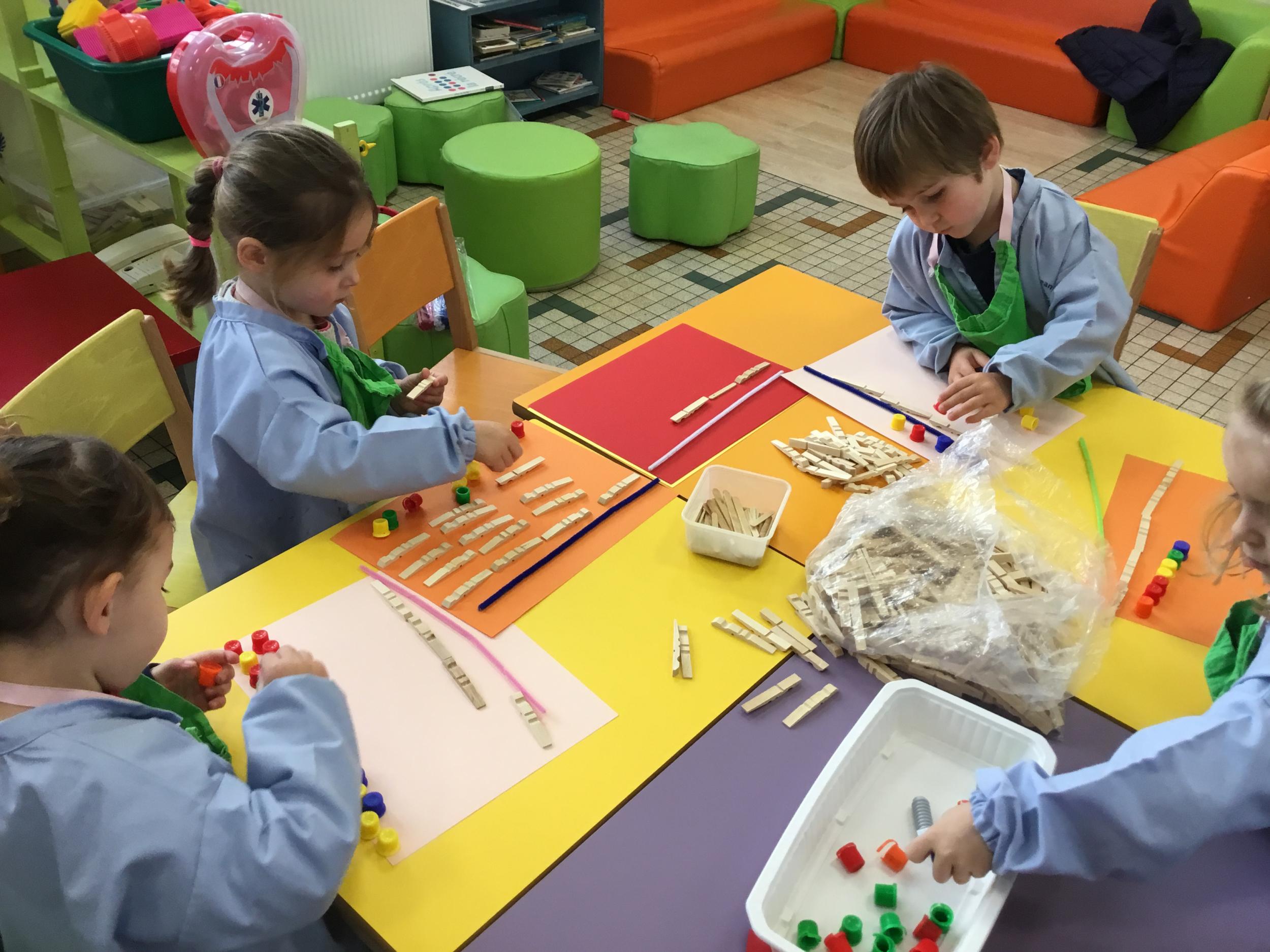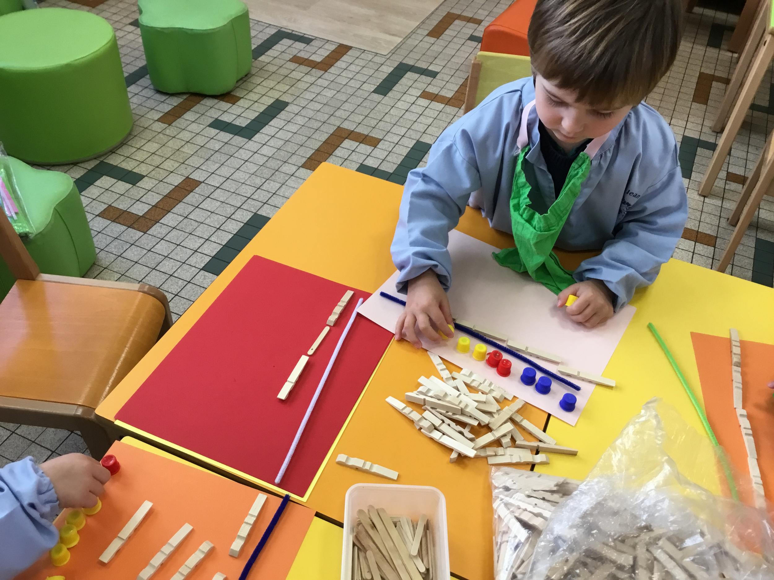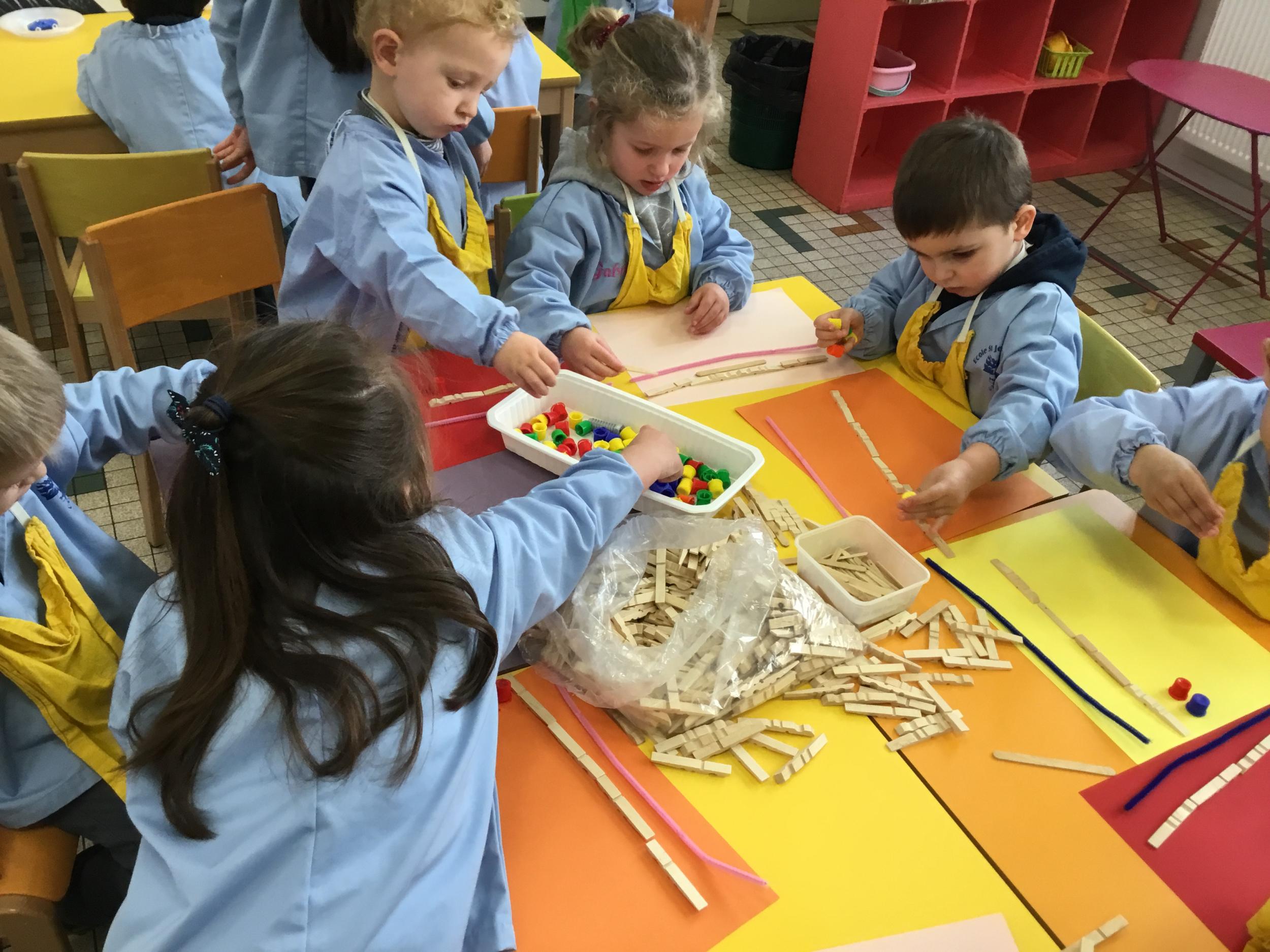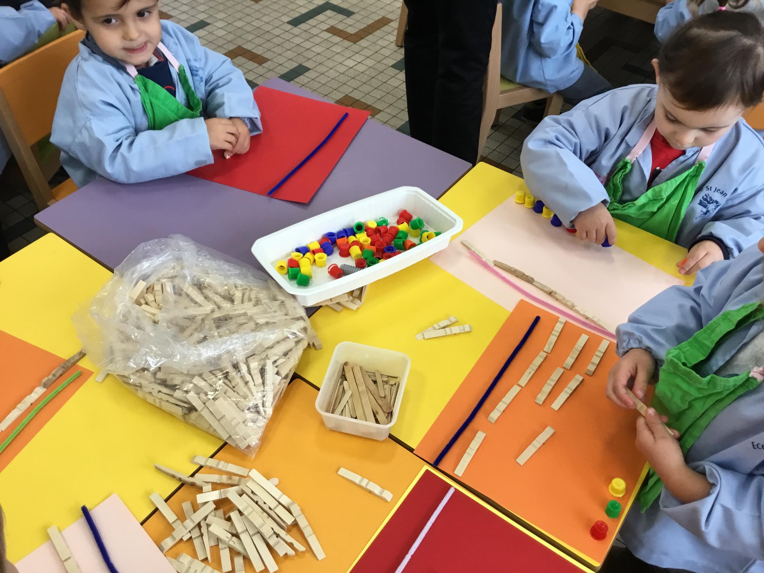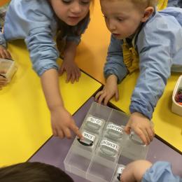 En autonomie, ils ont continué leur apprentissage du découpage. Les petits bouts de papier découpés ont ensuite été rangés dans une petite boîte portant leur prénom.