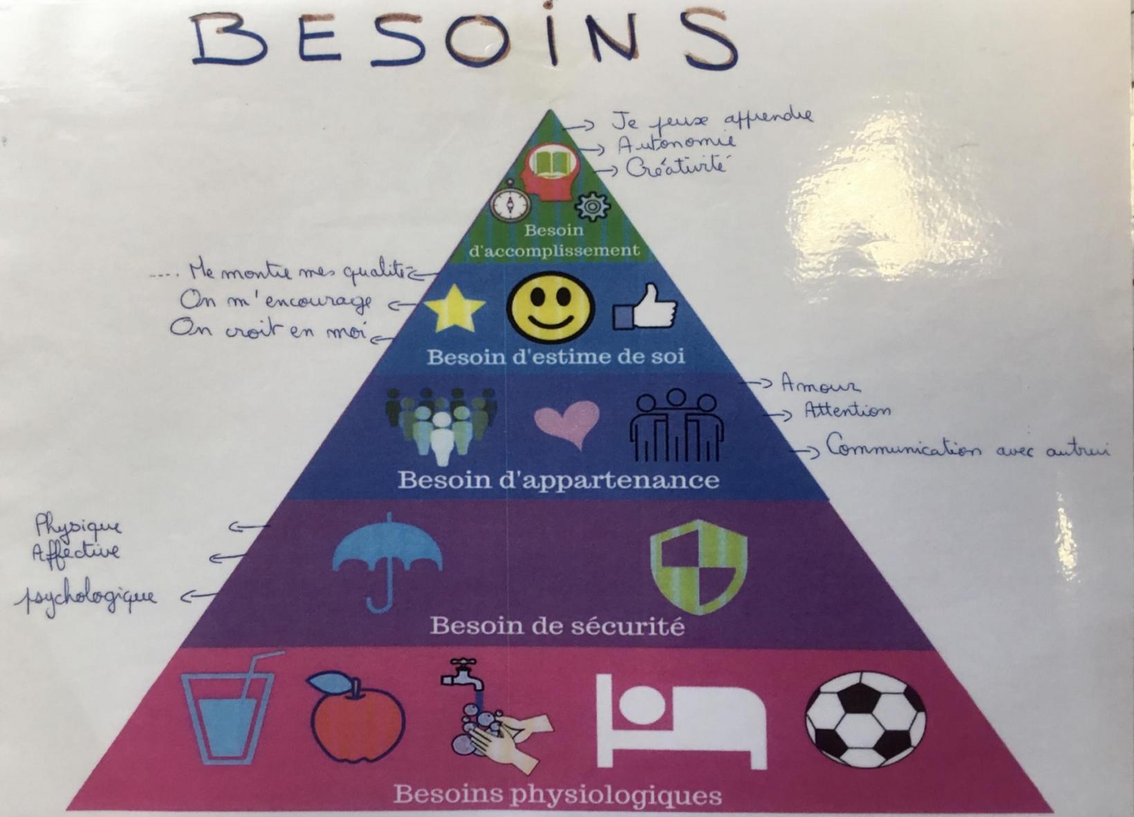 Besoin d’estime de soi, on me montre mes qualités, on m’encourage, on croit en moi : On a le droit de se tromper mais pas de se moquer des autres, on fera mieux la prochaine fois. Il faut être poli avec ses camarades et toutes les personnes de l’école.