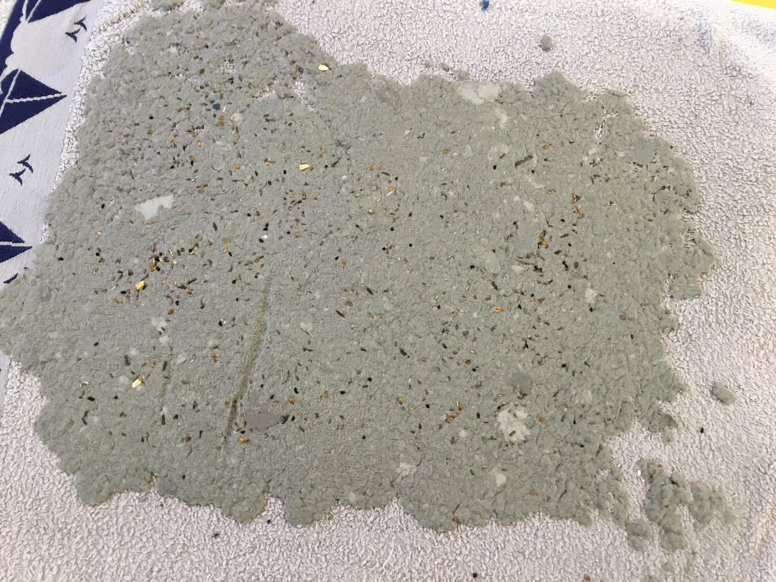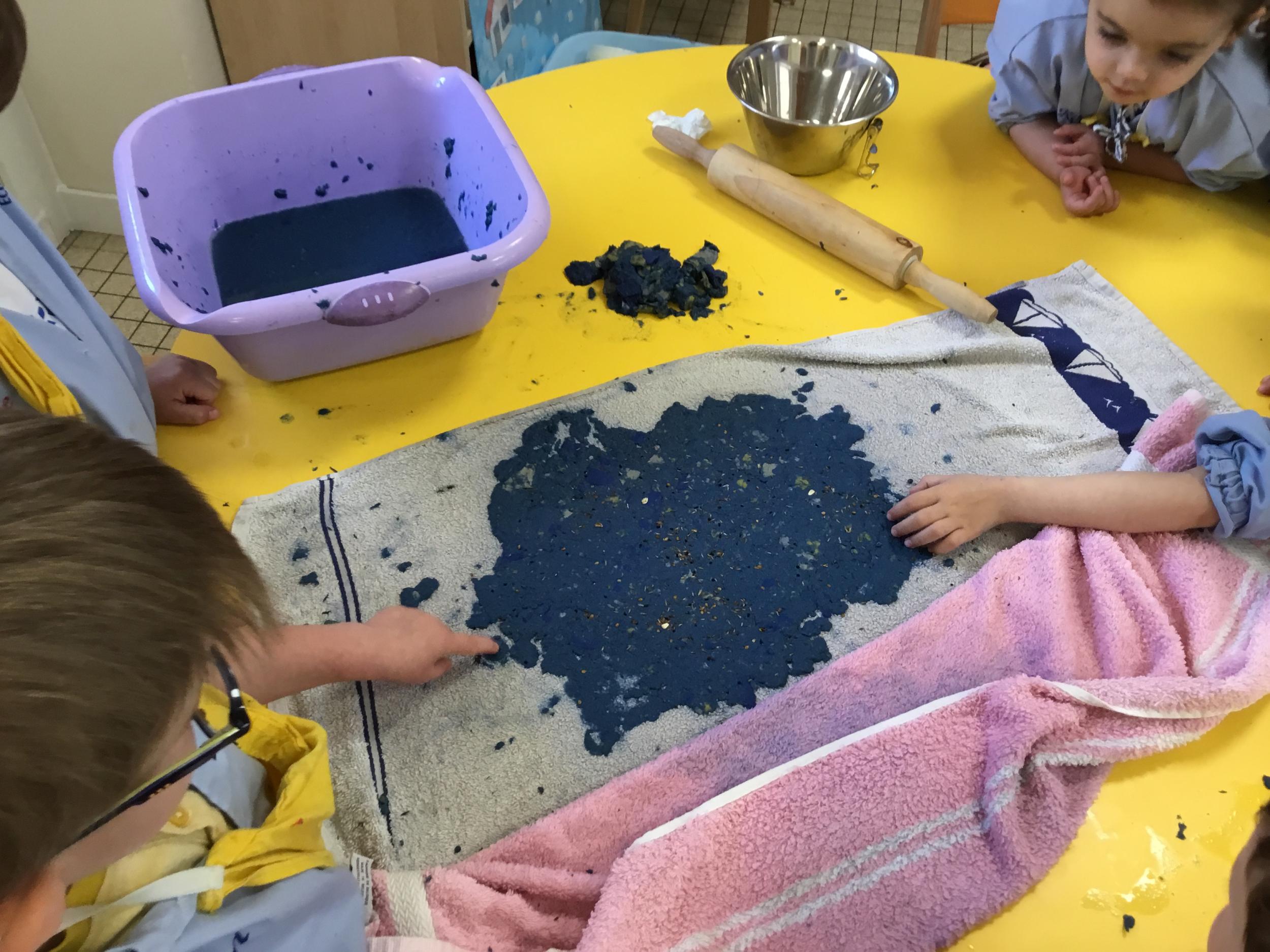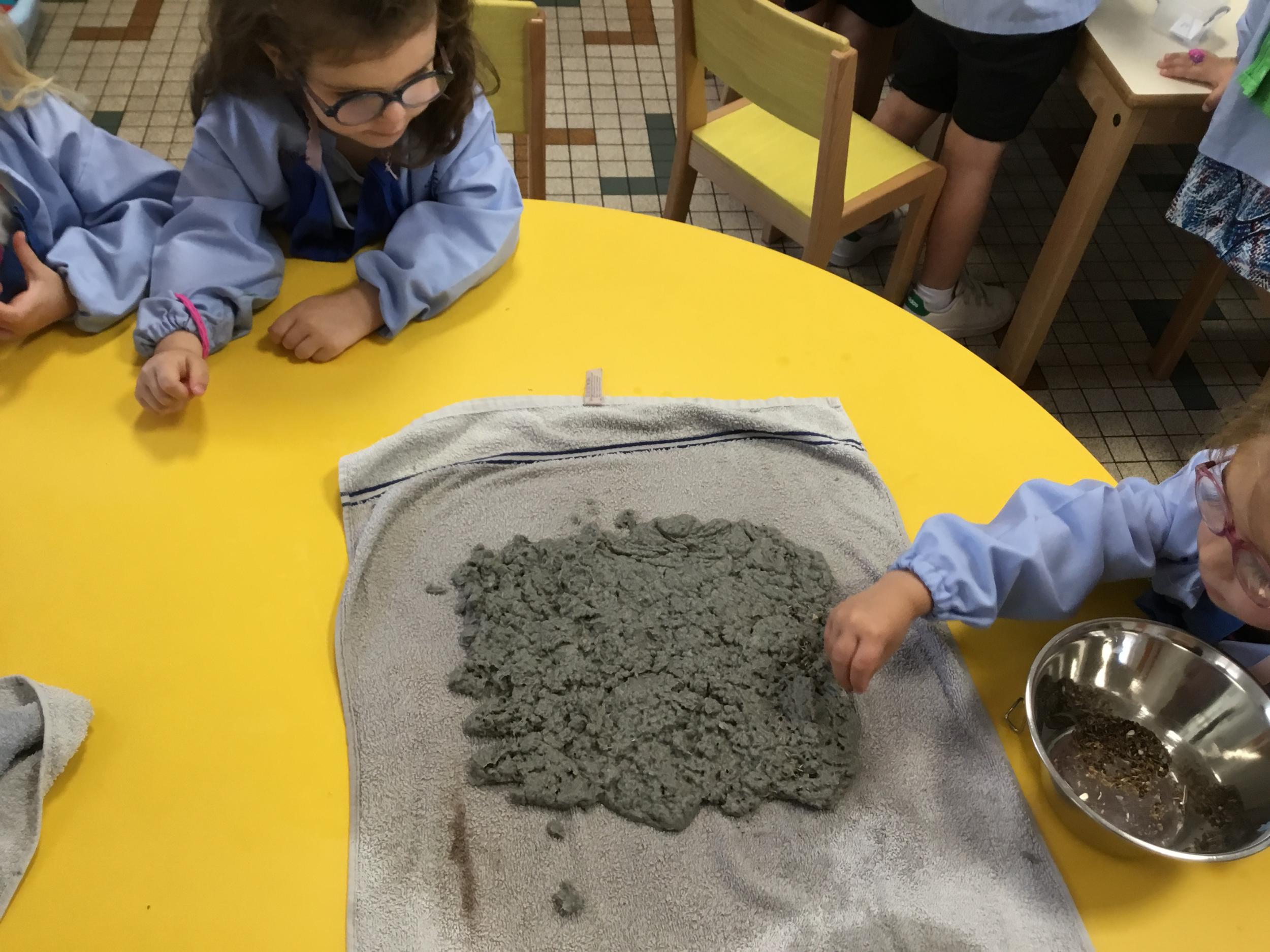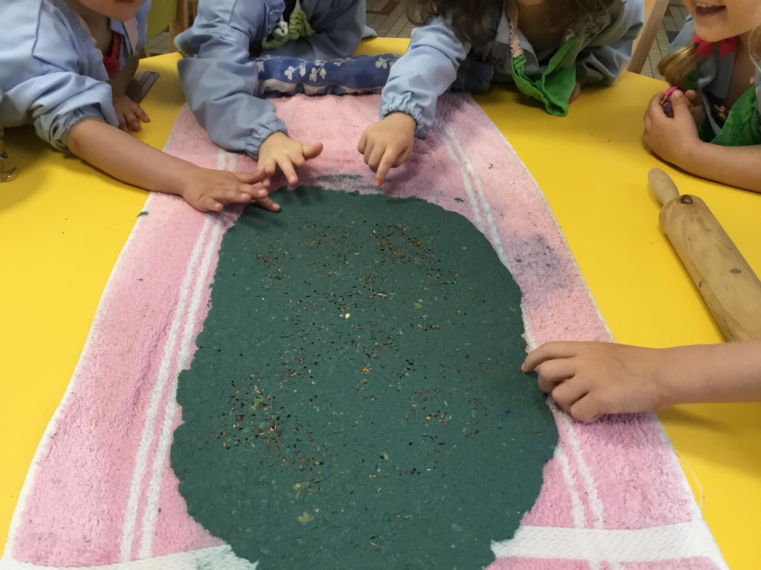 Placer la pâte de papier mâché sur une serviette, la parsemer de graines. La recouvrir d’une autre serviette pour étaler la pâte et retirer l’excédent d’eau. Il n’y a plus qu’à attendre que la feuille de papier sèche.