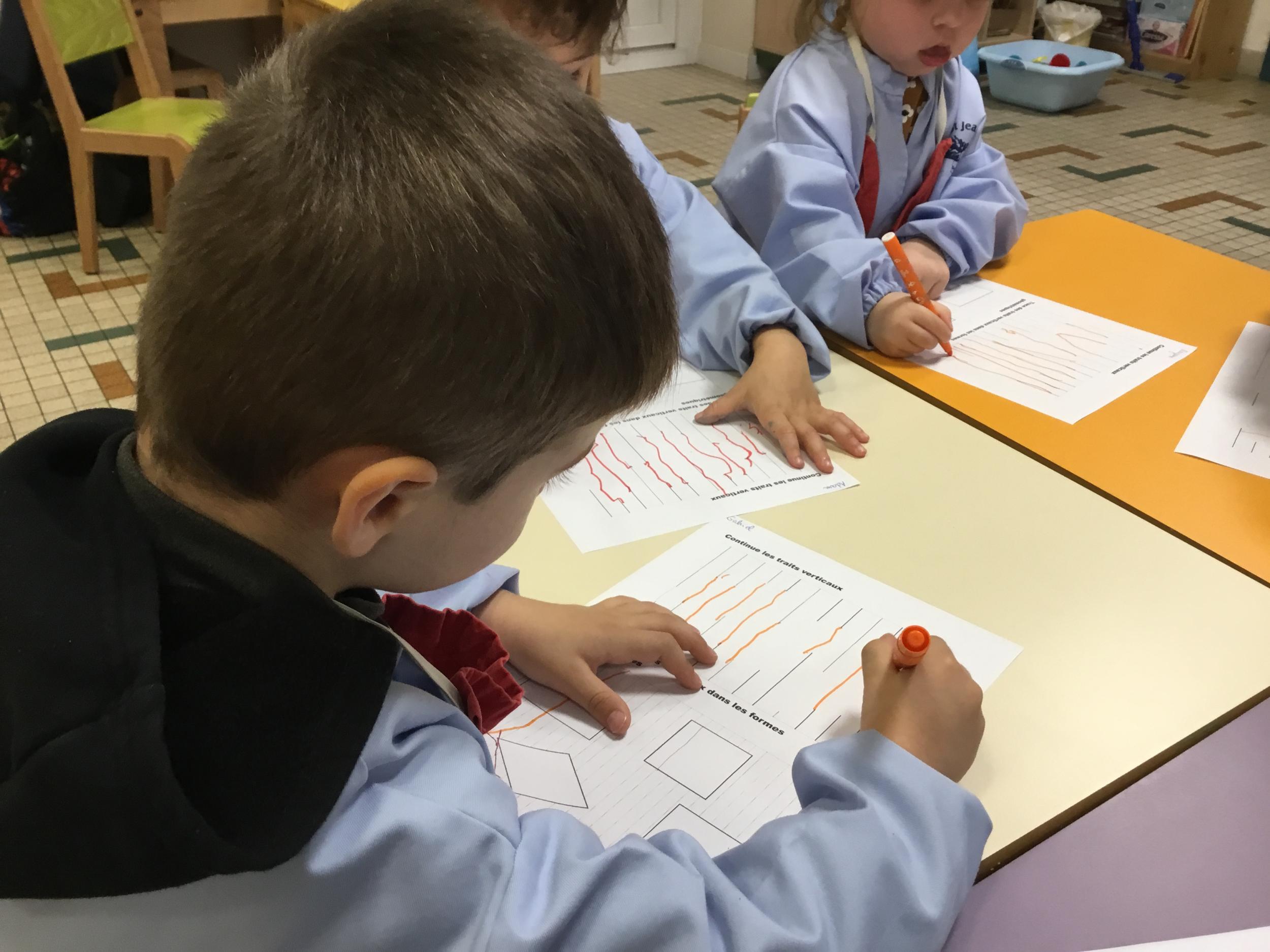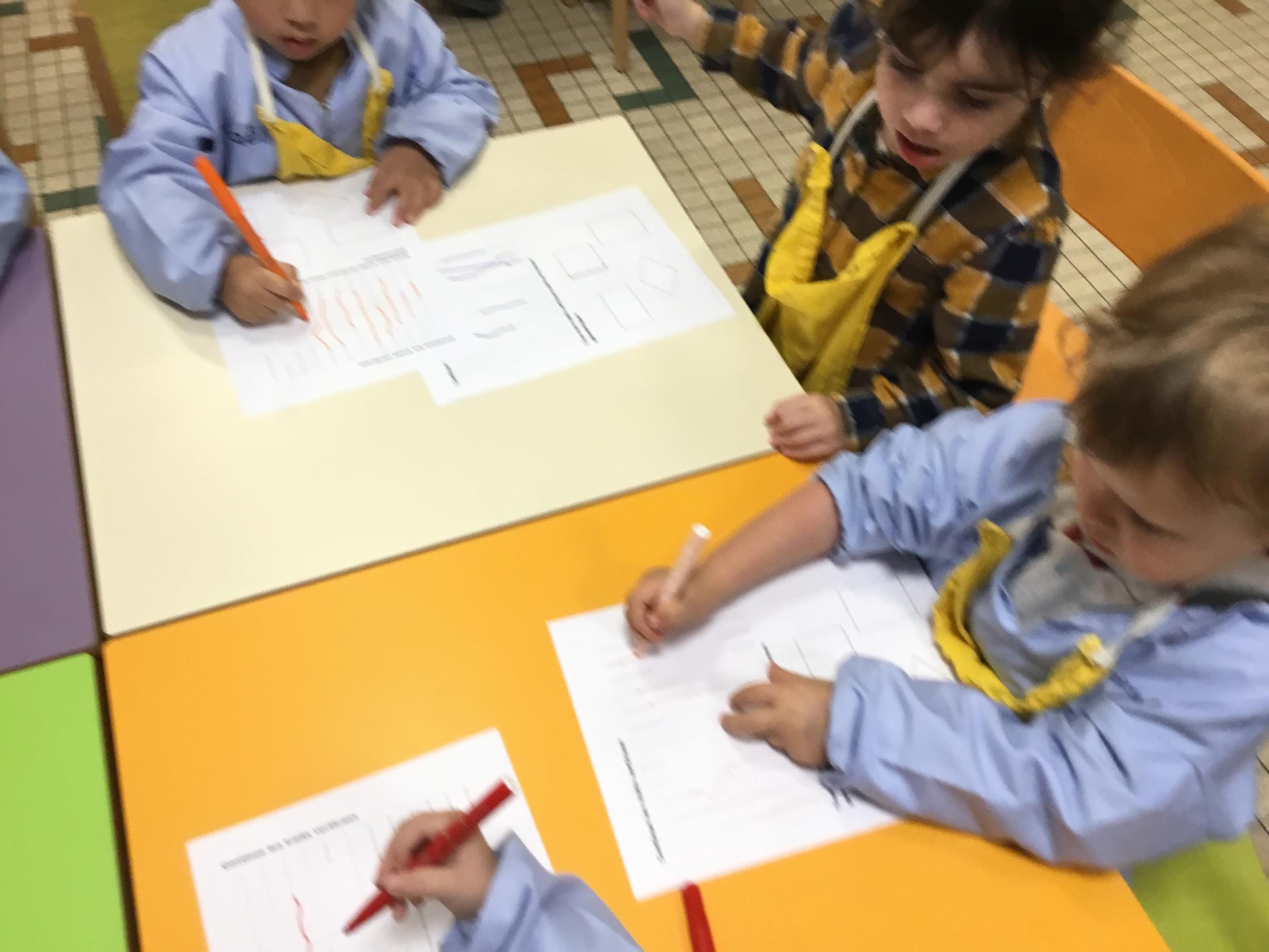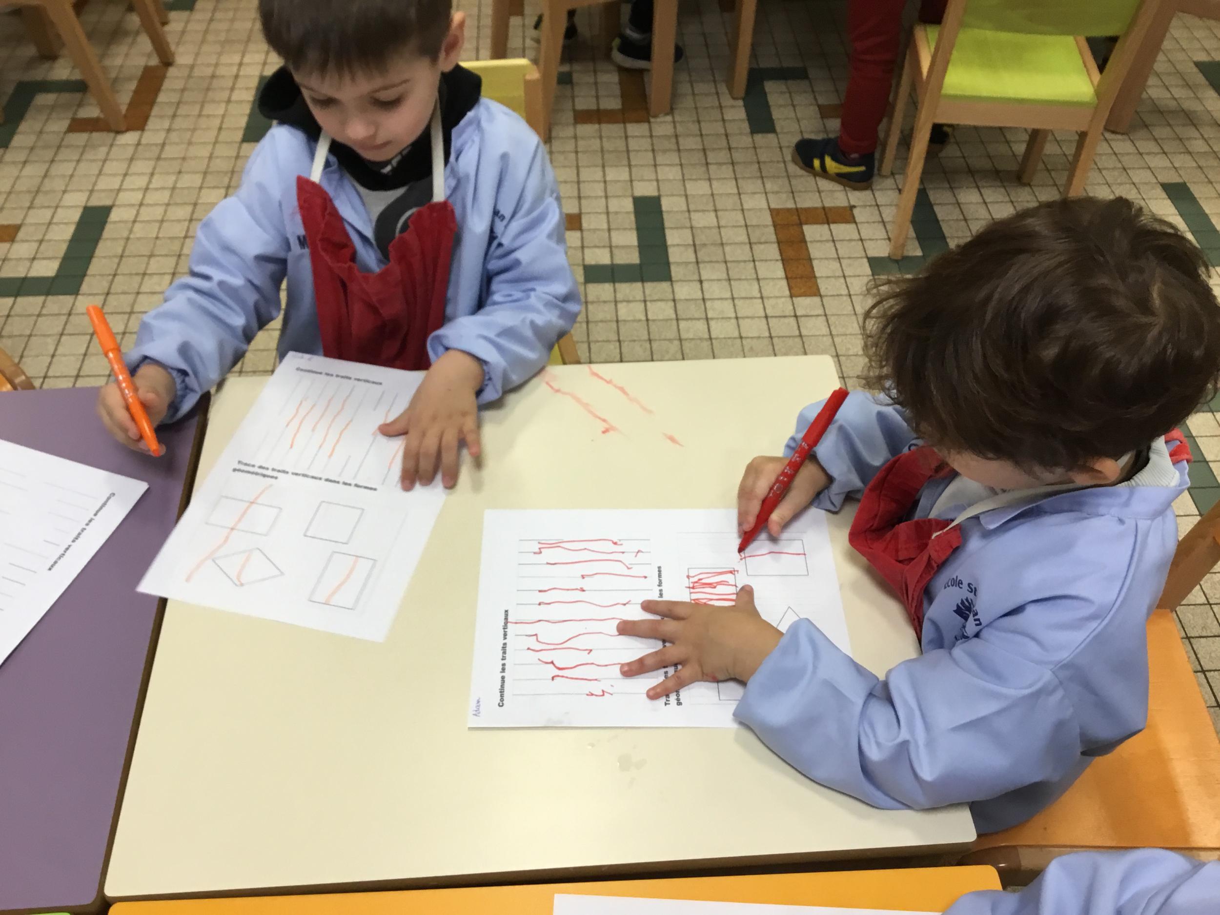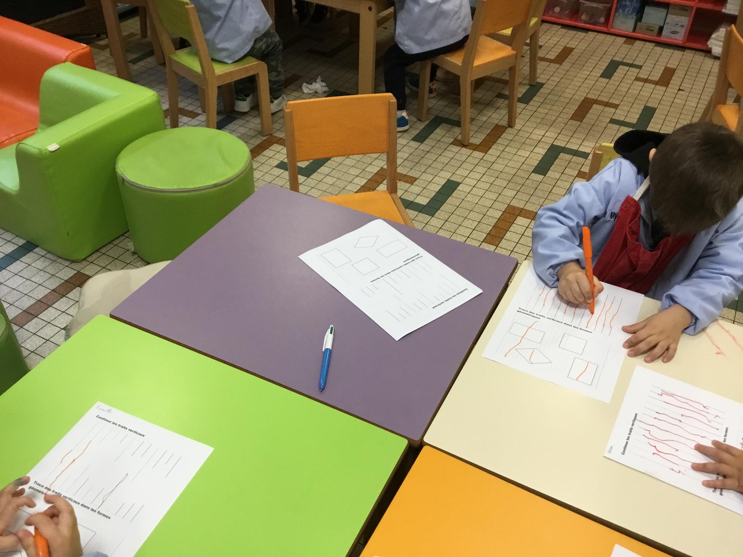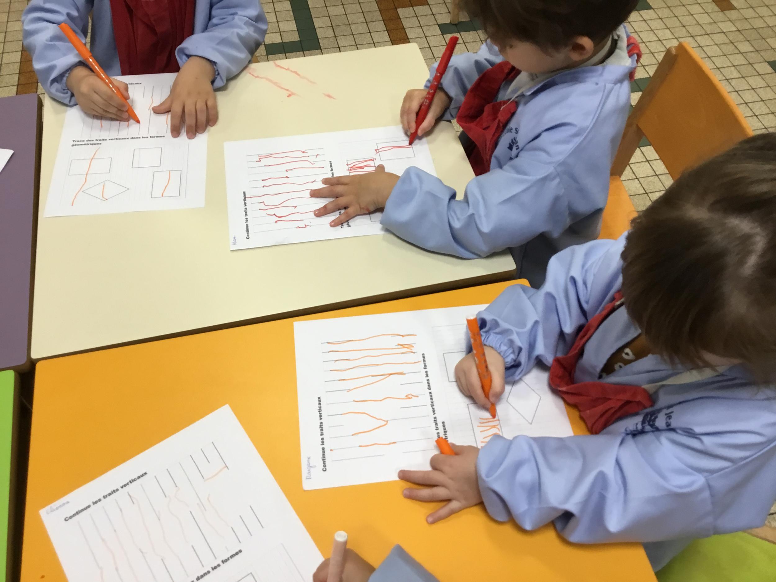 Cette semaine les élèves ont commencé leur bricolage de Noël, achevé leur travail autour du trait vertical et ont continué à travailler autour des formes géométriques.