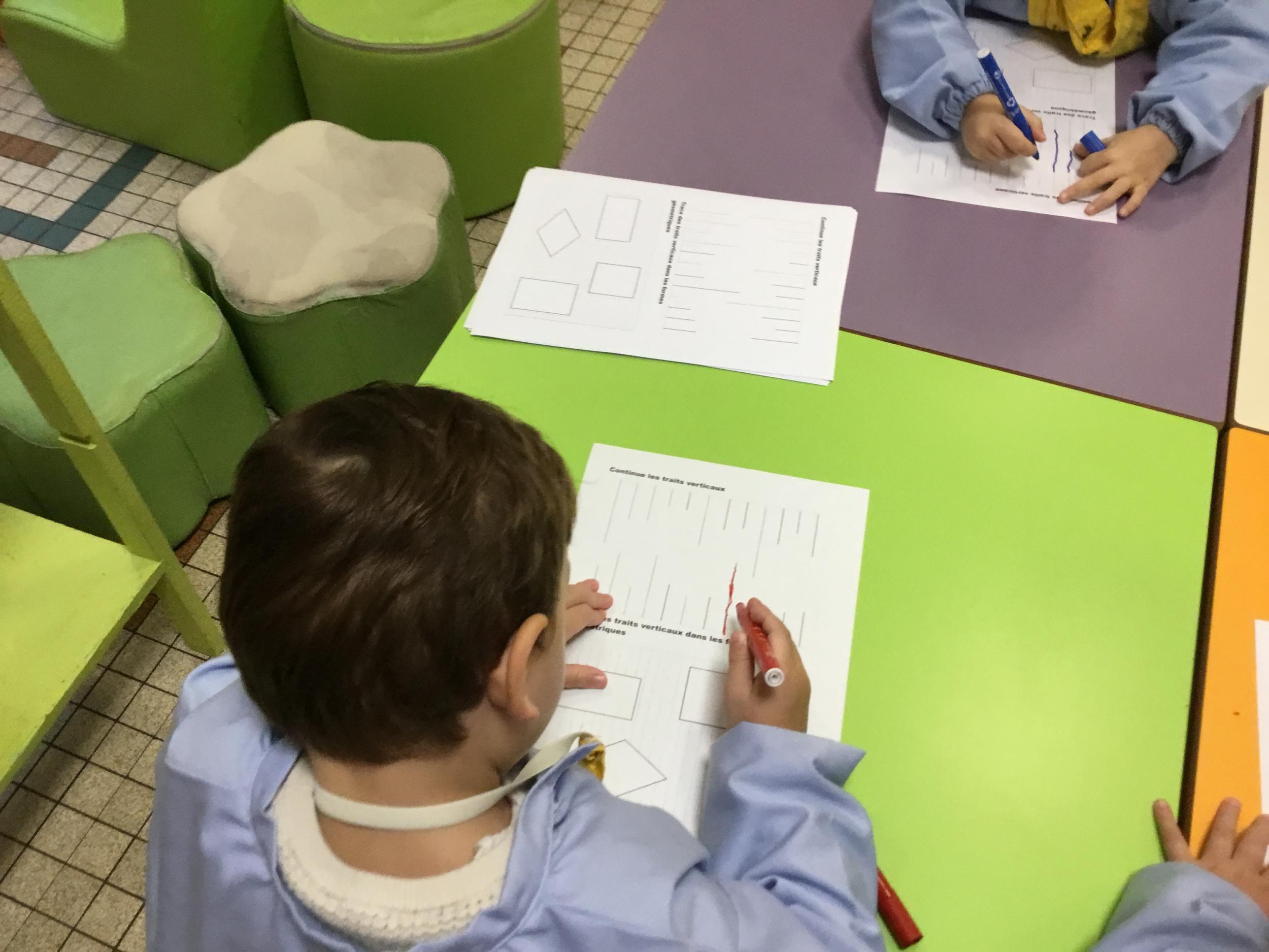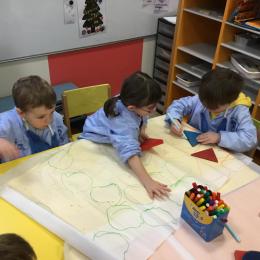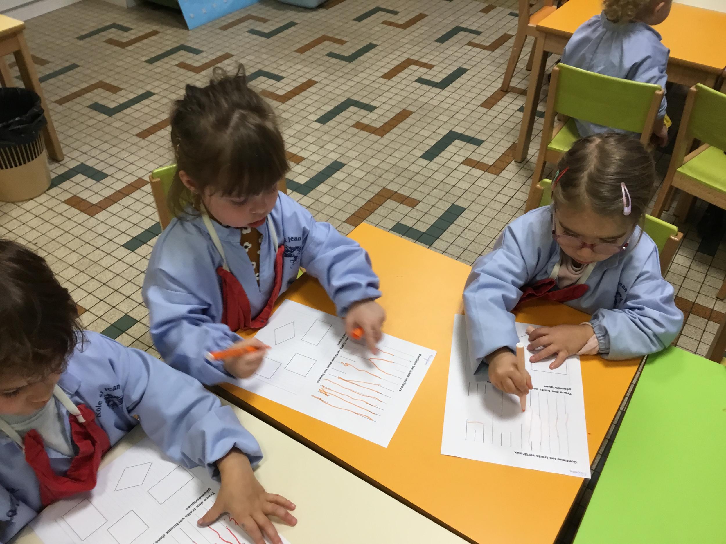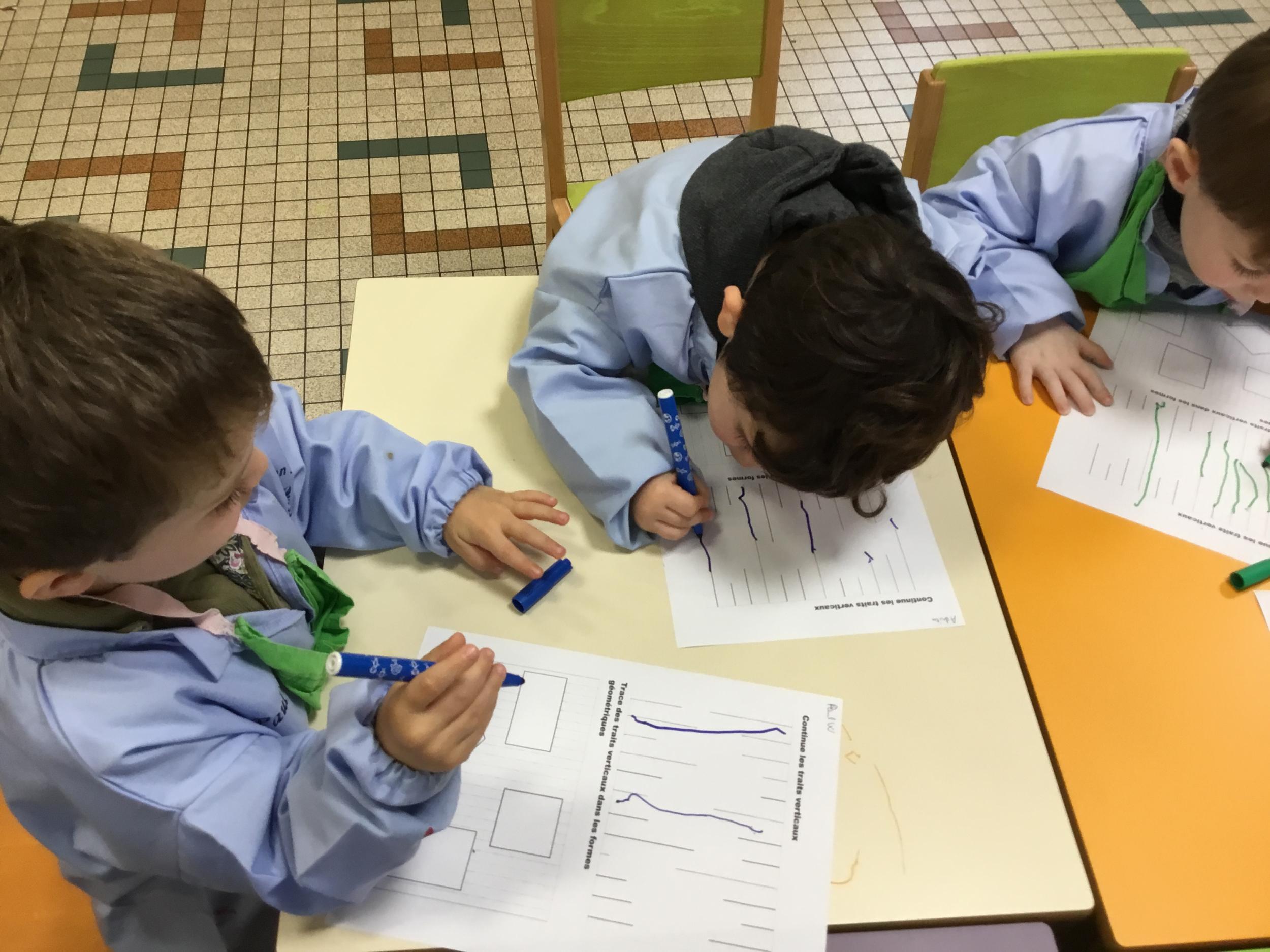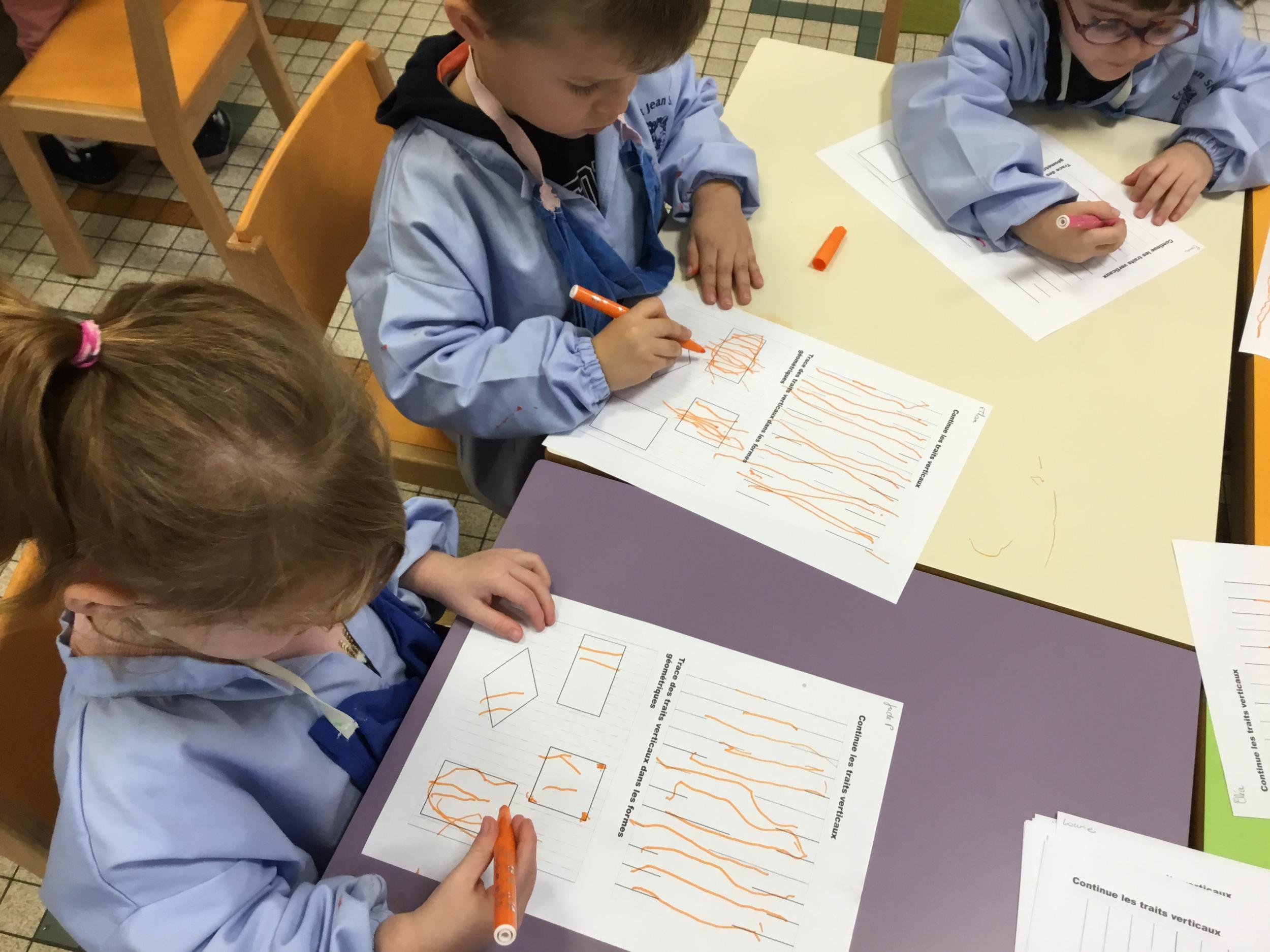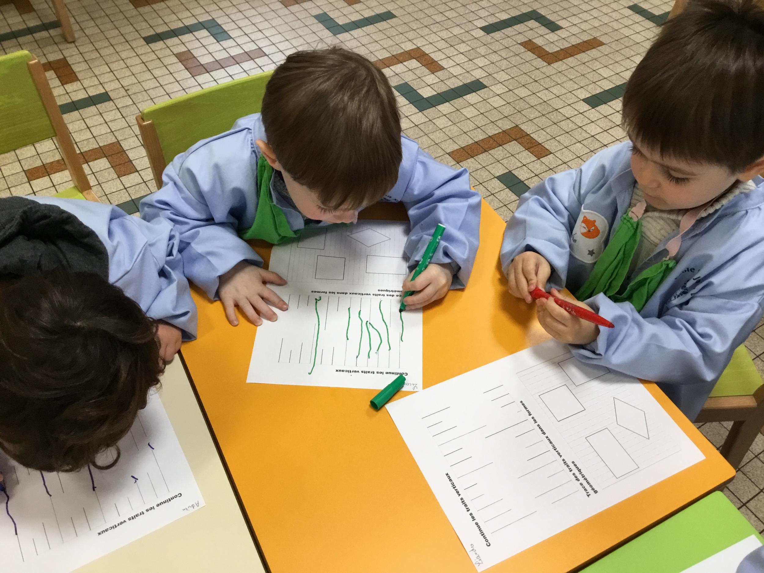 Cette semaine les élèves ont commencé leur bricolage de Noël, achevé leur travail autour du trait vertical et ont continué à travailler autour des formes géométriques.