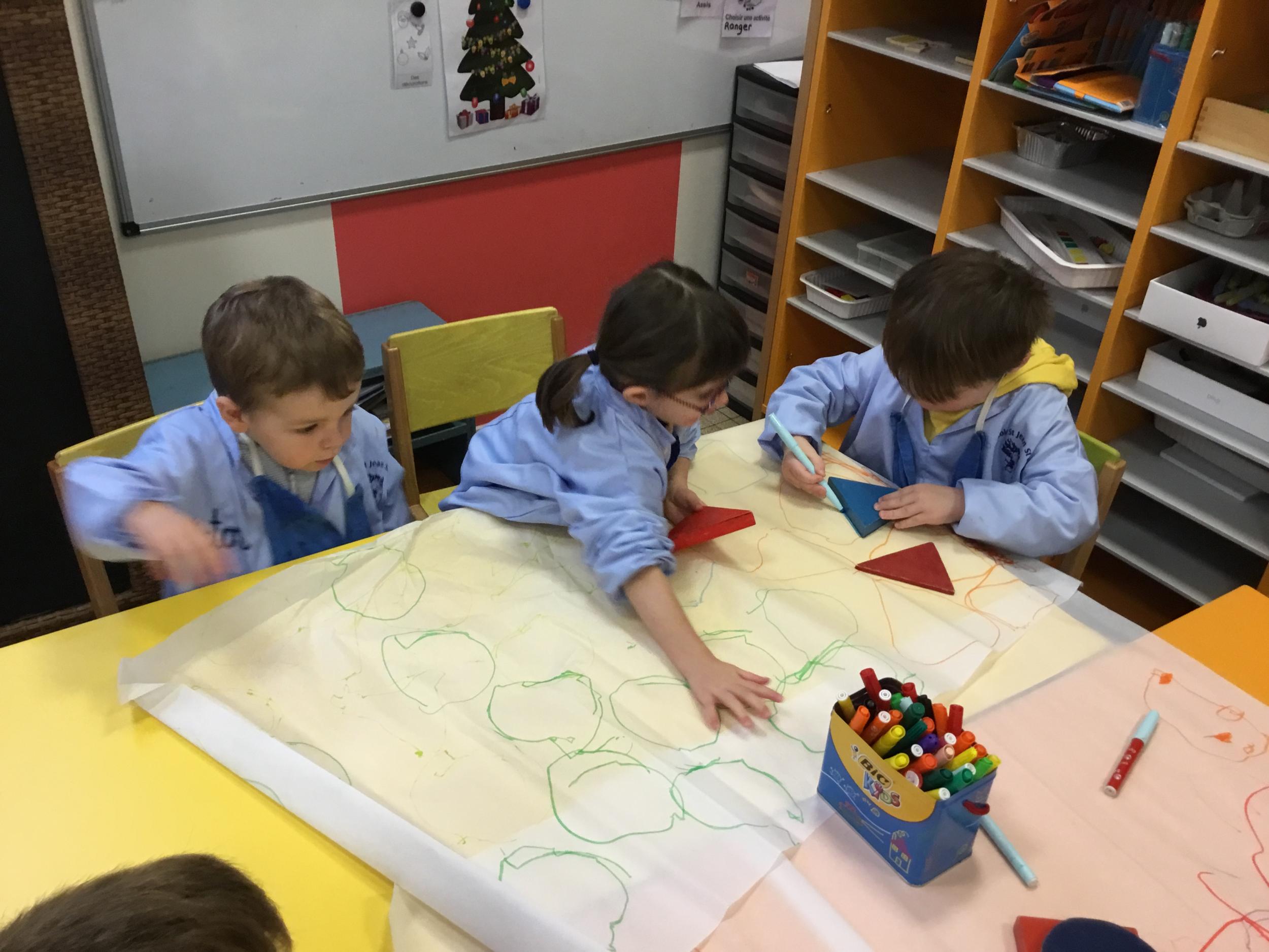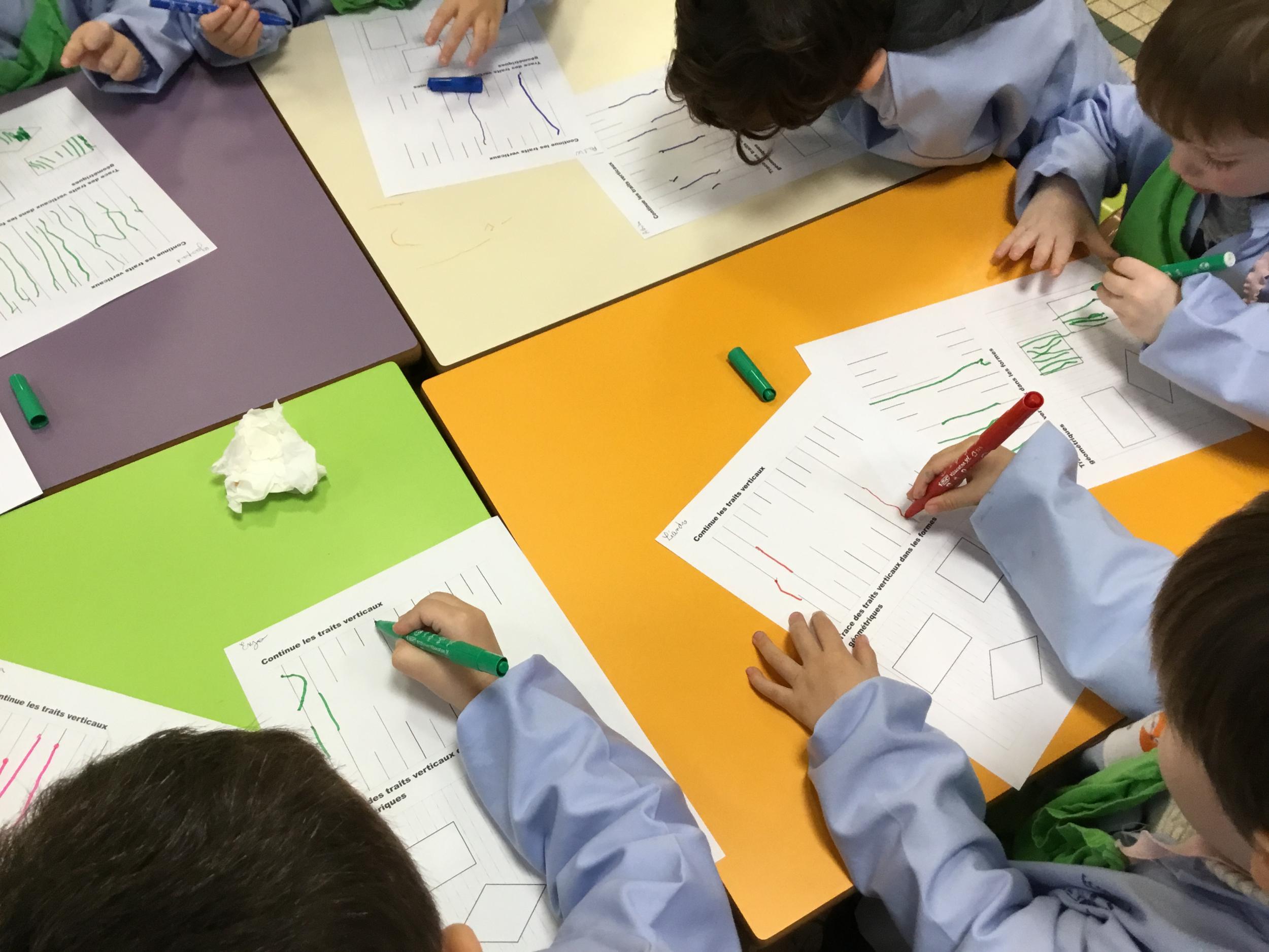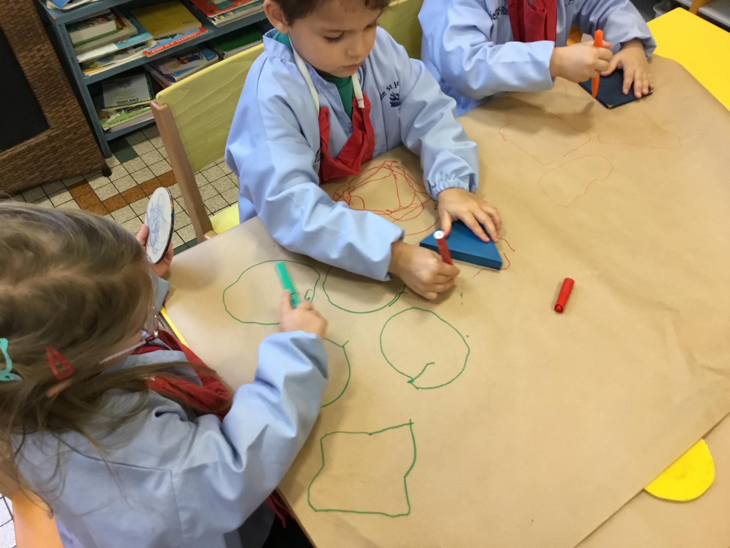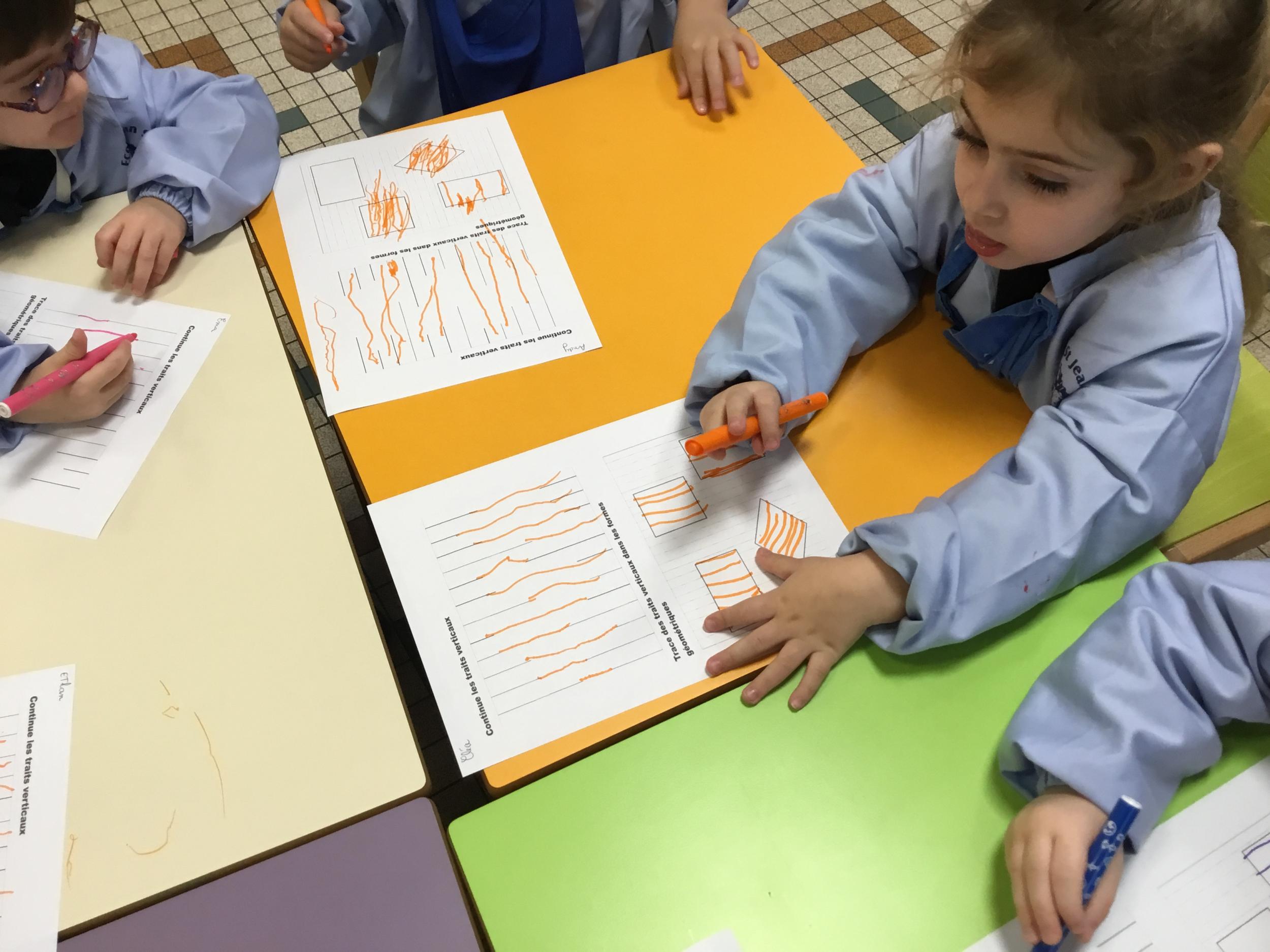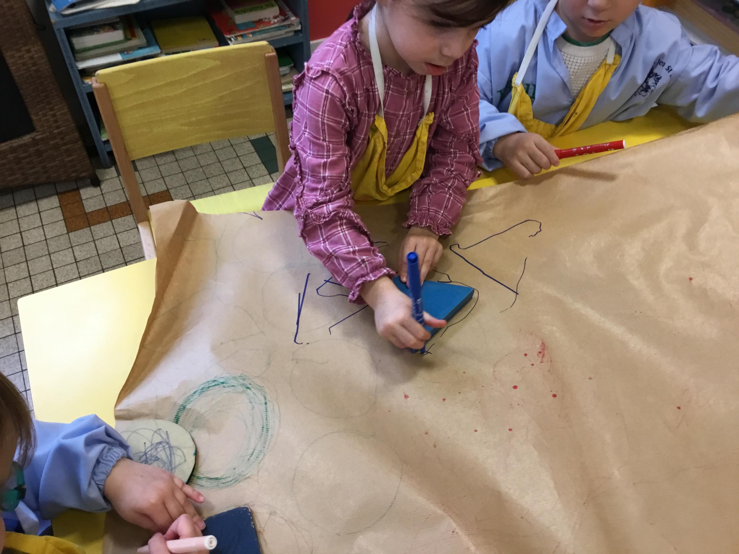 Cette semaine les élèves ont commencé leur bricolage de Noël, achevé leur travail autour du trait vertical et ont continué à travailler autour des formes géométriques.