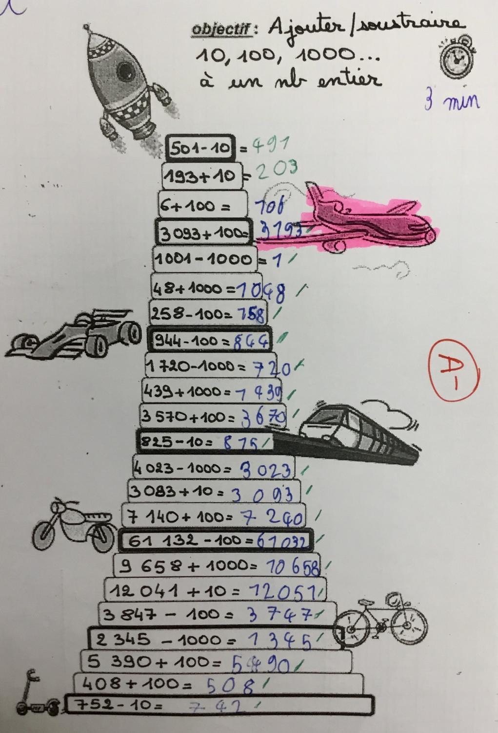 Nous travaillons les rituels de calcul mental tous les jours. Pour apprendre une nouvelle technique, la maîtresse donne des exemples, on prend le cahier de leçon, on s’entraîne tous ensemble sur l’ardoise. Le lendemain, on fait un exercice sur le cahier du jour. Parfois le mardi, nous nous mettons en cercle et nous faisons le furet : La première personne dit le nombre de départ, puis la deuxième personne calcule le nombre + 10, la troisième calcule + 10, ainsi de suite. Puis on fait l’évaluation, tous les quinze jours, c’est le calcul vitesse : ça porte sur quelque chose qu’on a révisé. Il y a plusieurs niveaux selon la vitesse (trottinette, vélo, moto, TGV, voiture de course, avion, fusée).