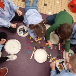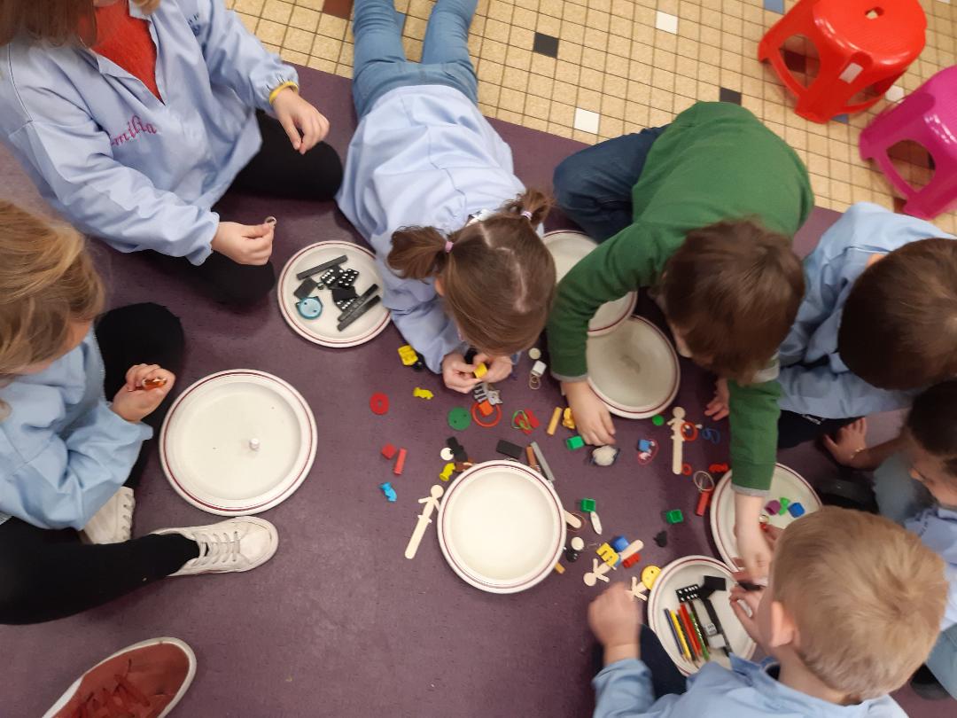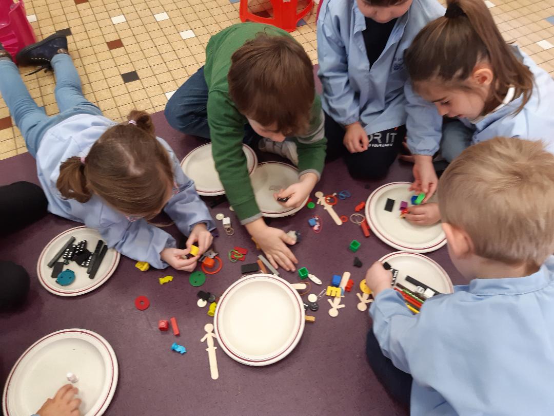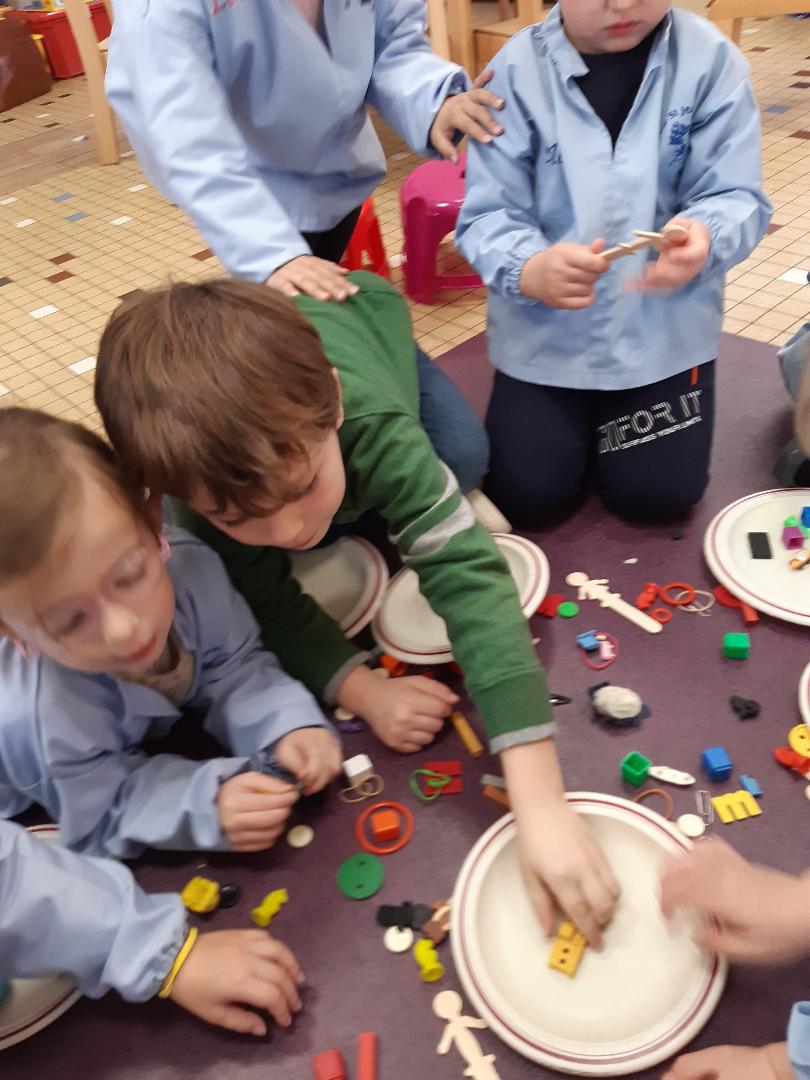 Des petits objets de toutes sortes étaient cachés dans une petite valise. Les élèves l'ont ouverte et , collectivement, ils devaient trier les objets qui se trouvaient à l'intèrieur par famille selon des critères qu'ils devaient définir. Exemple: tous les objets en forme de carré ensemble. Tous les objets représentant des animaux ensemble... Ainsi , ils devaient communiquer entre eux pour se mettre d'accord sur les critères de tri choisis. Le but de la séance était non seulement de catégoriser mais aussi de prendre conscience qu'un même objet peut appartenir à plusieurs familles : par exemple un animal jaune en porcelaine peut être soit rangé dans la famille des objets jaune, soit rangé dans la famille des objets en porcelaine ou bien dans la famille des animaux. Ils n'étaient d'ailleurs pas toujours d'accord !