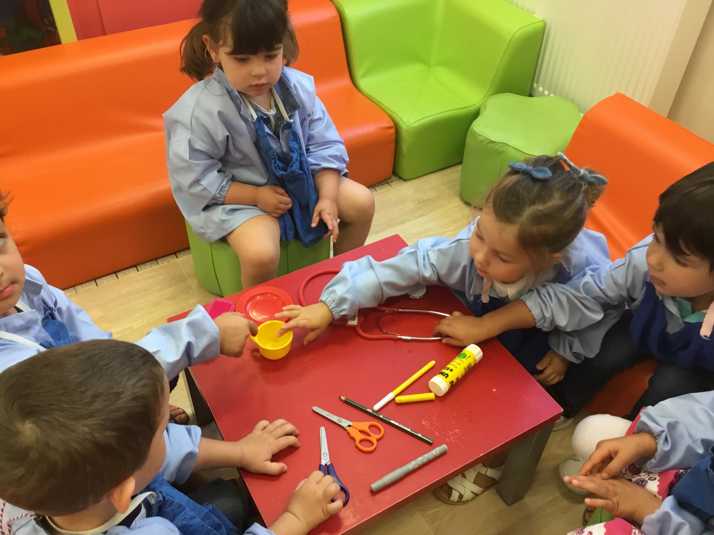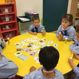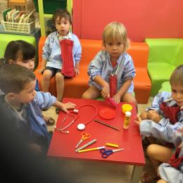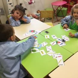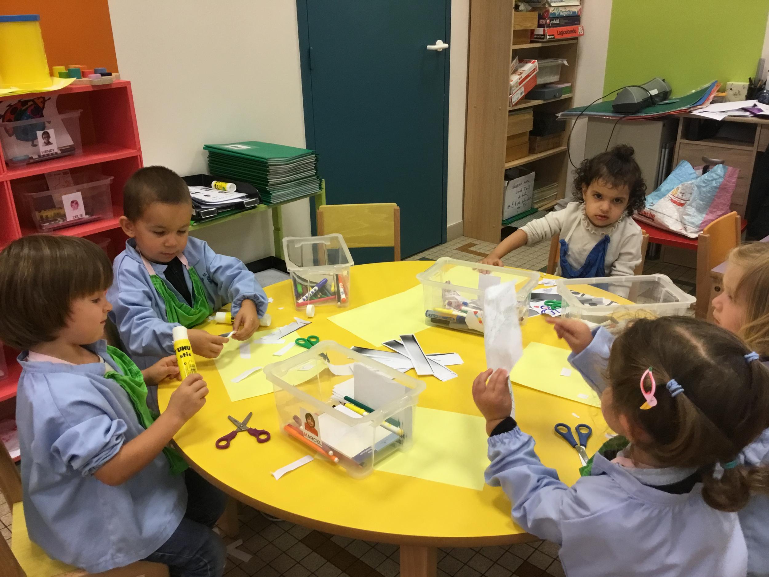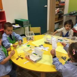 Dans un deuxième temps, les élèves ont choisi parmi des images diverses et variées les images représentant les outils de la classe, puis ils les ont collées dans le petit cartable que nous avions fabriqué la semaine dernière.