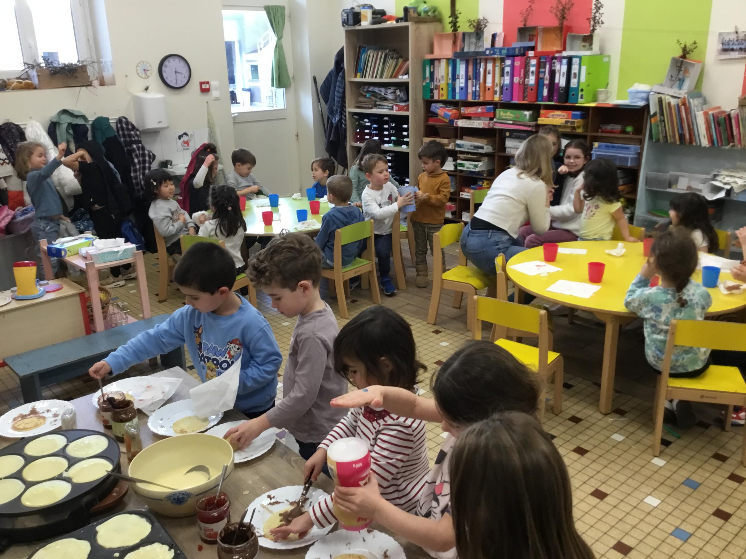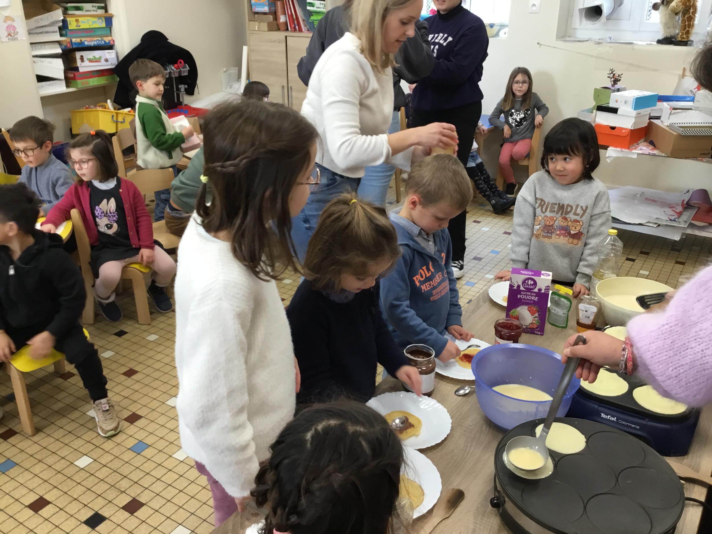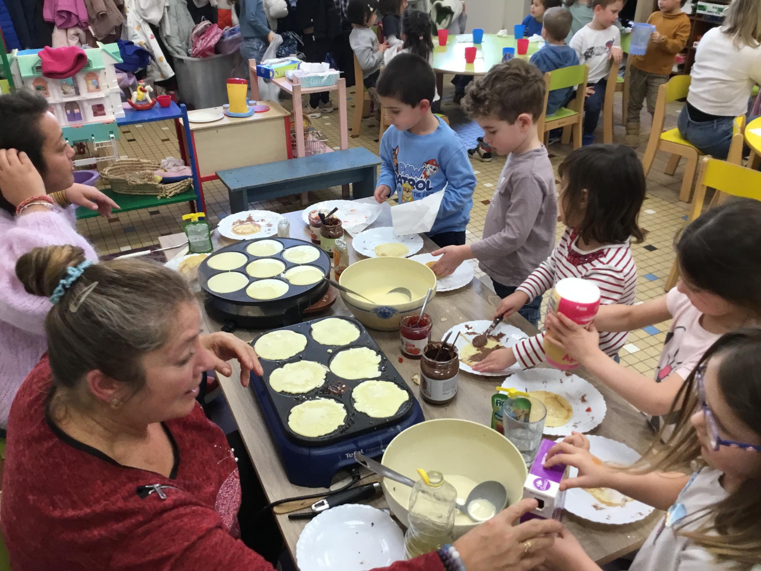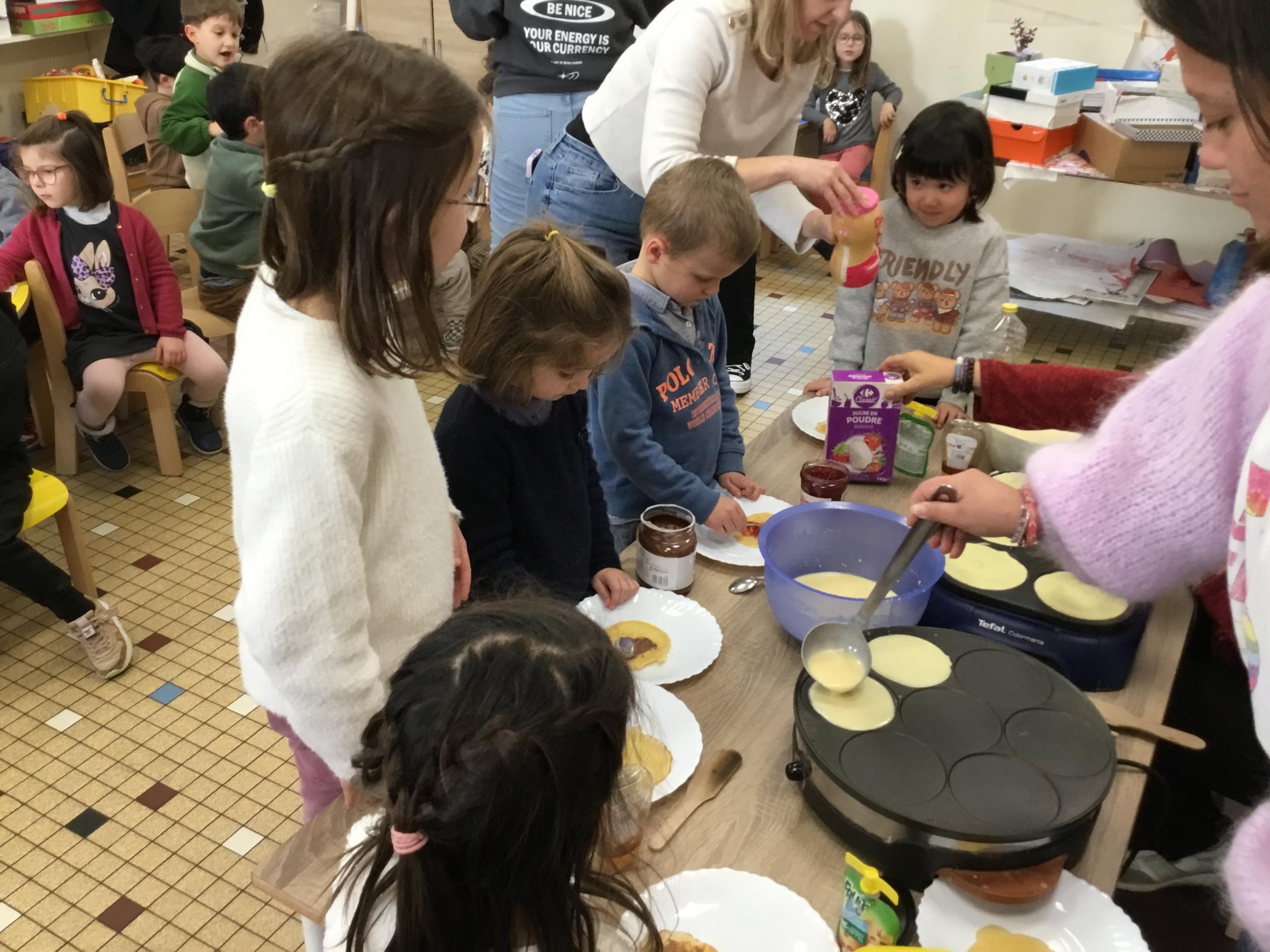 Petite et moyenne section 08/02/2025 Vendredi dernier, nous avons fêté la chandeleur. Au programme, préparation et apprentissages de la recette de la pâte à crêpes le matin et cuisson et dégustation d’après- midi. Nous nous sommes régalés, merci aux mamans et à Marion pour leur aide.