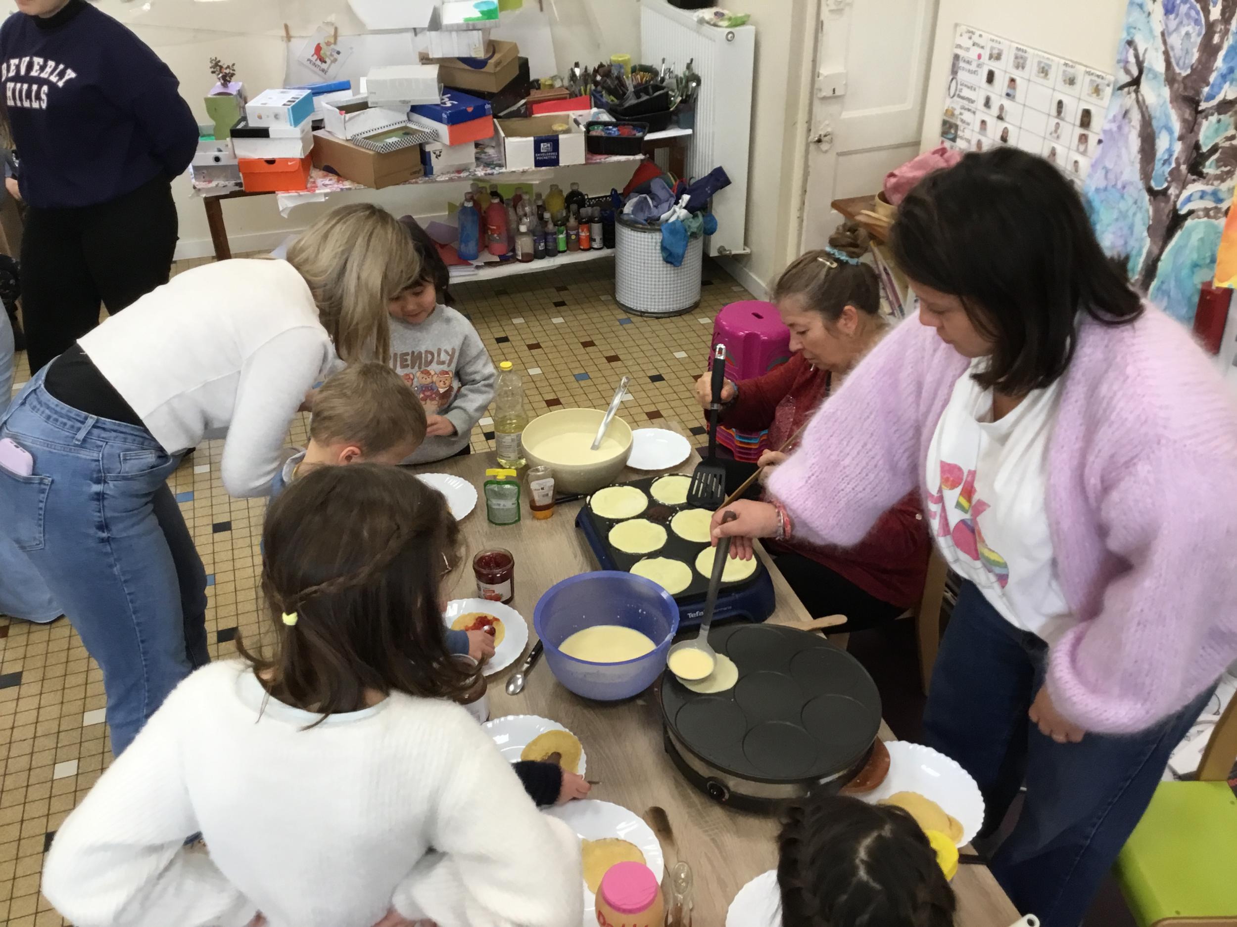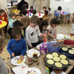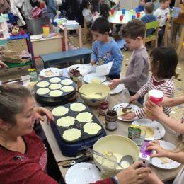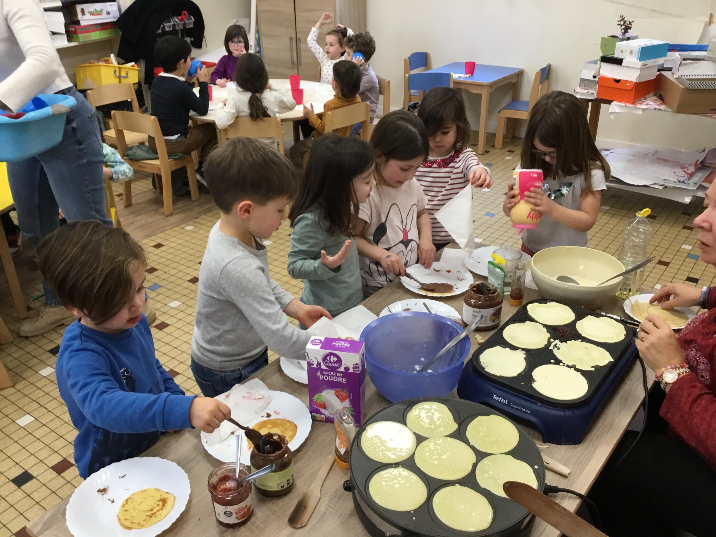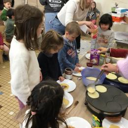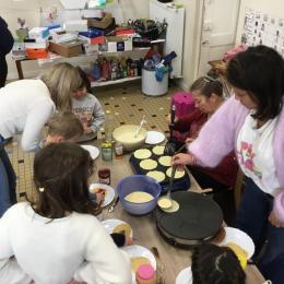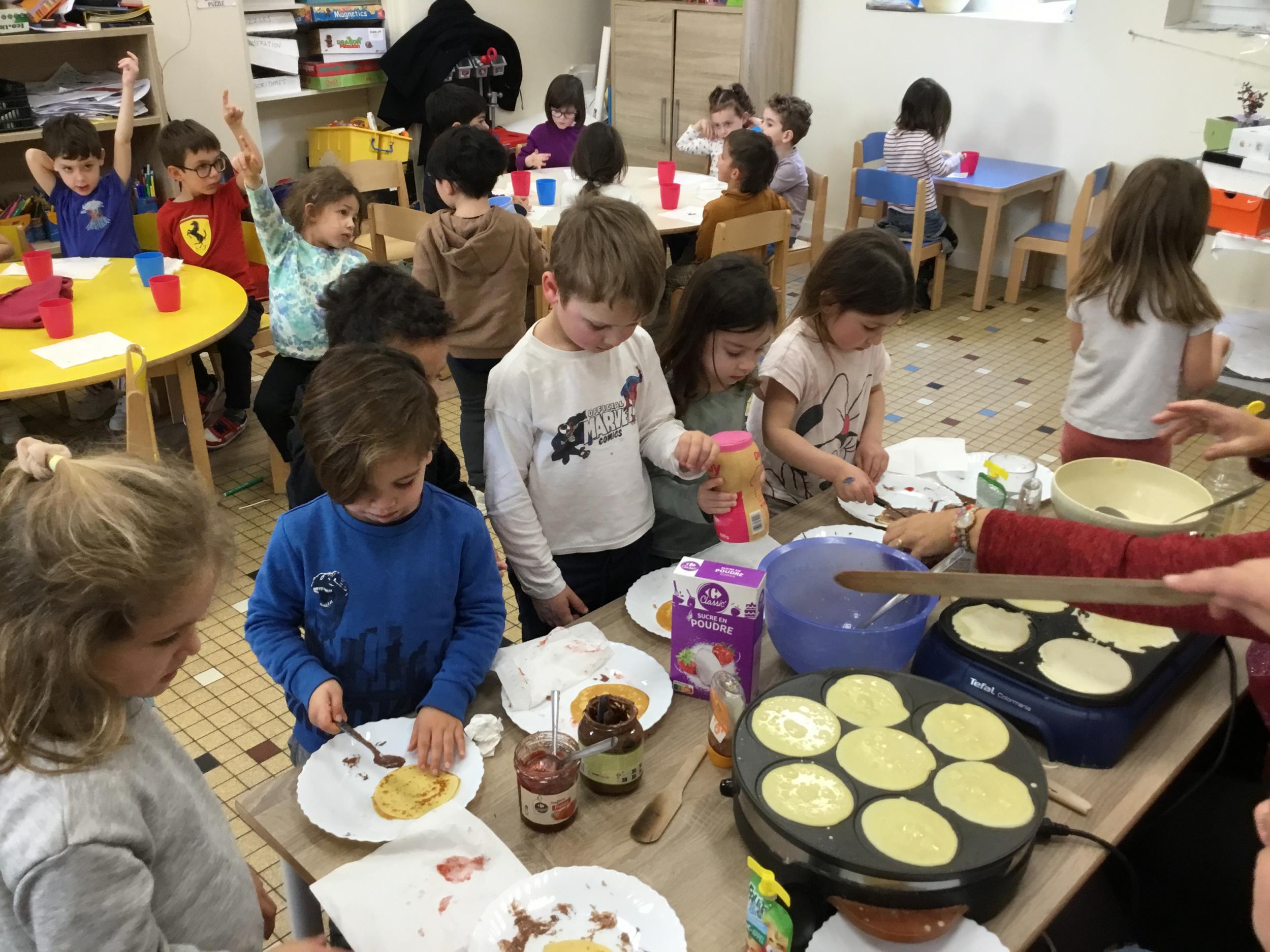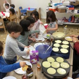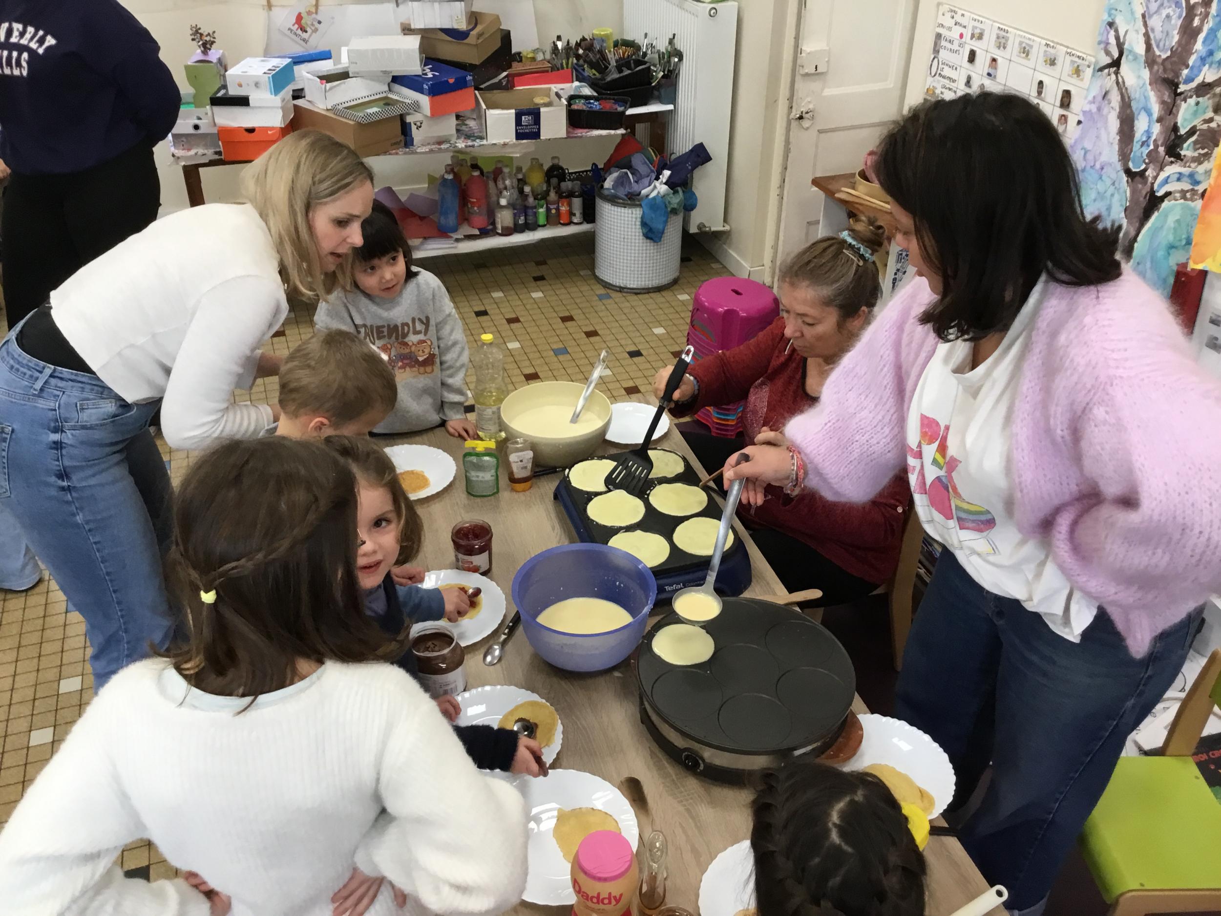 Petite et moyenne section 08/02/2025 Vendredi dernier, nous avons fêté la chandeleur. Au programme, préparation et apprentissages de la recette de la pâte à crêpes le matin et cuisson et dégustation d’après- midi. Nous nous sommes régalés, merci aux mamans et à Marion pour leur aide.