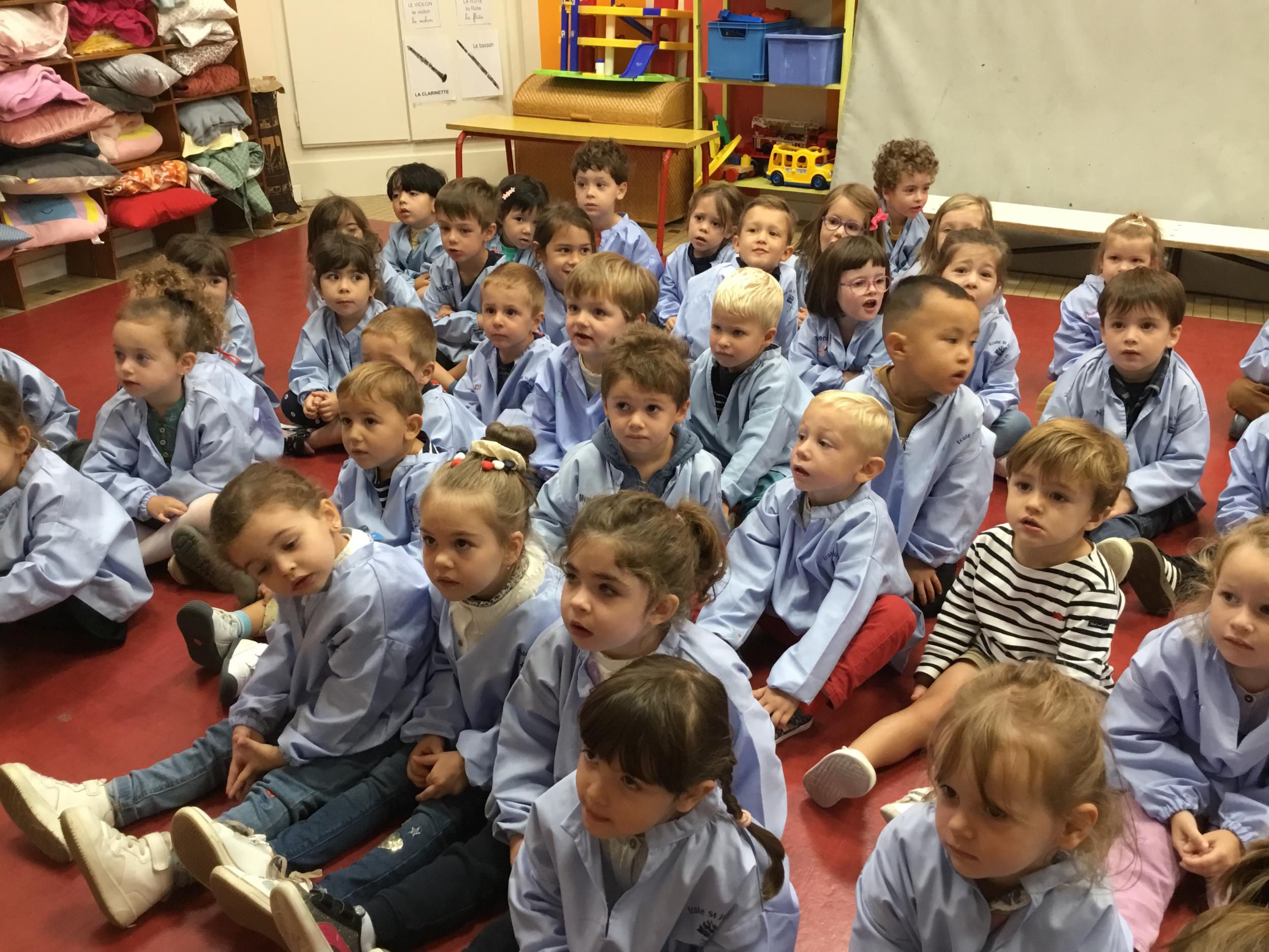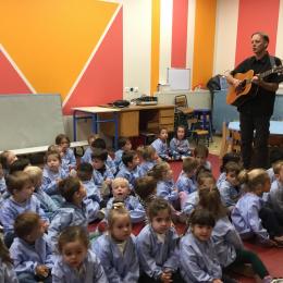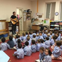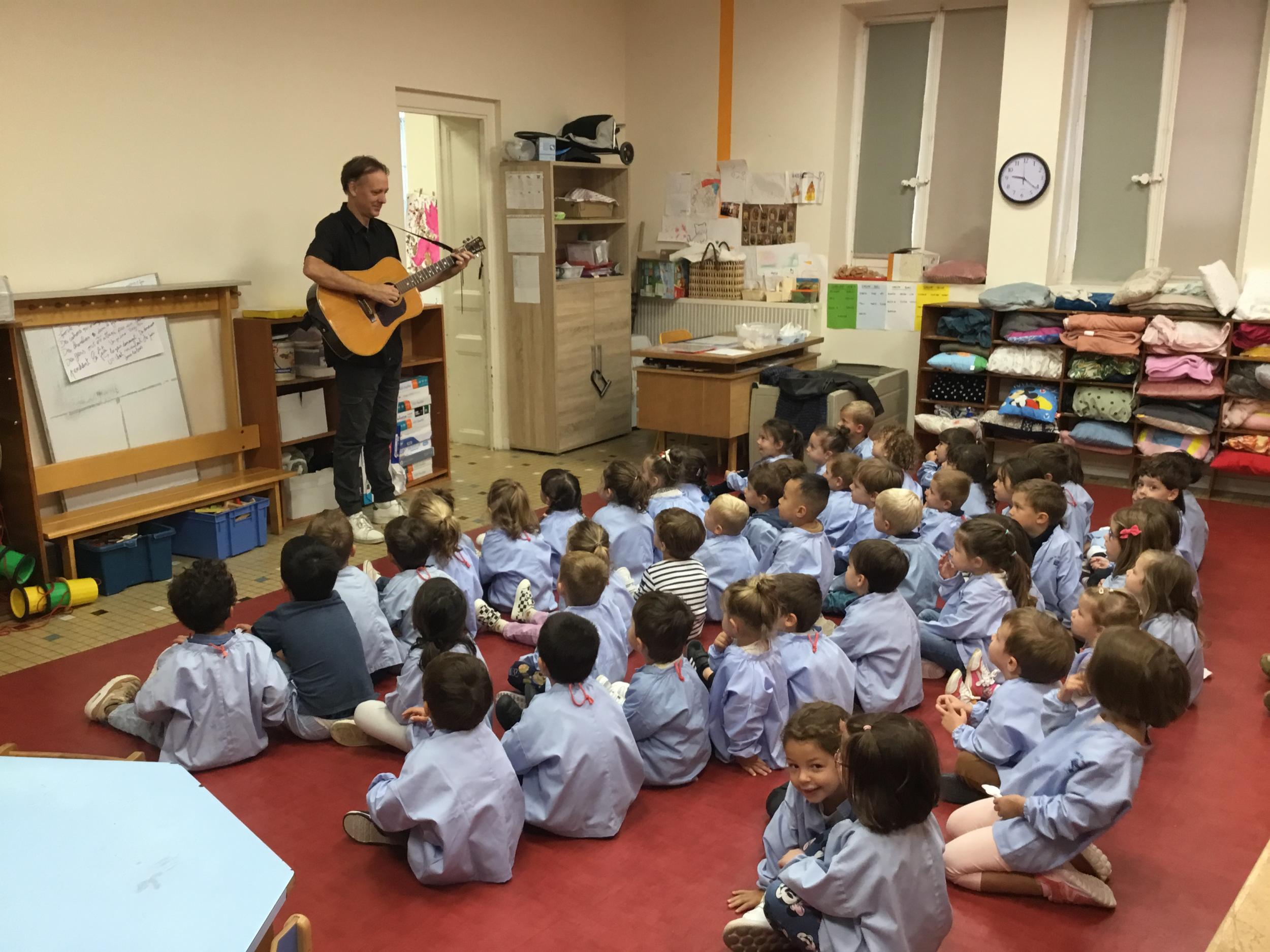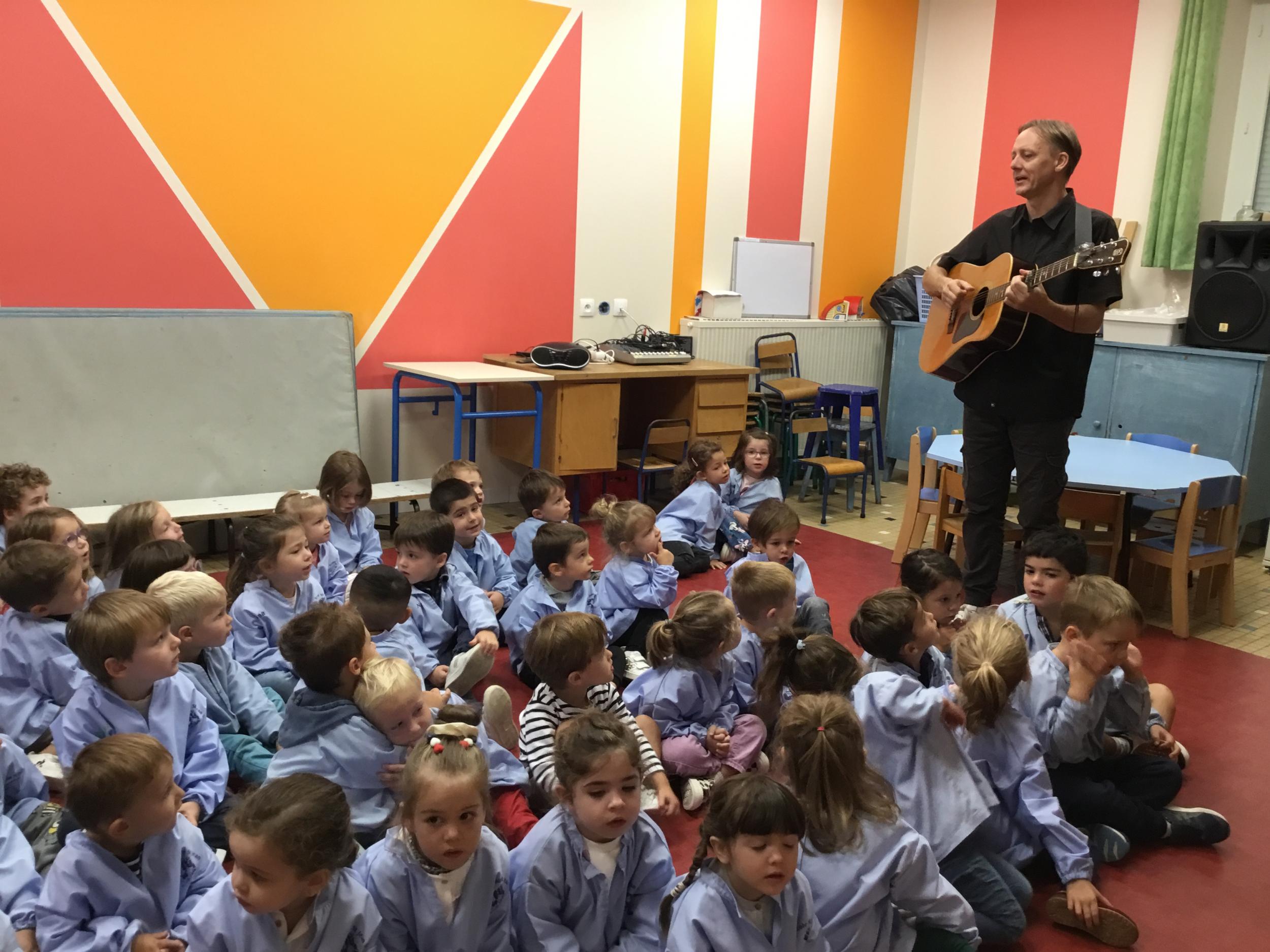 Petite et moyenne section 20/09/2024 Tous les vendredis , nous nous retrouverons pour chanter avec la classe des moyens. Les petits étaient ravis de découvrir la guitare du maître.